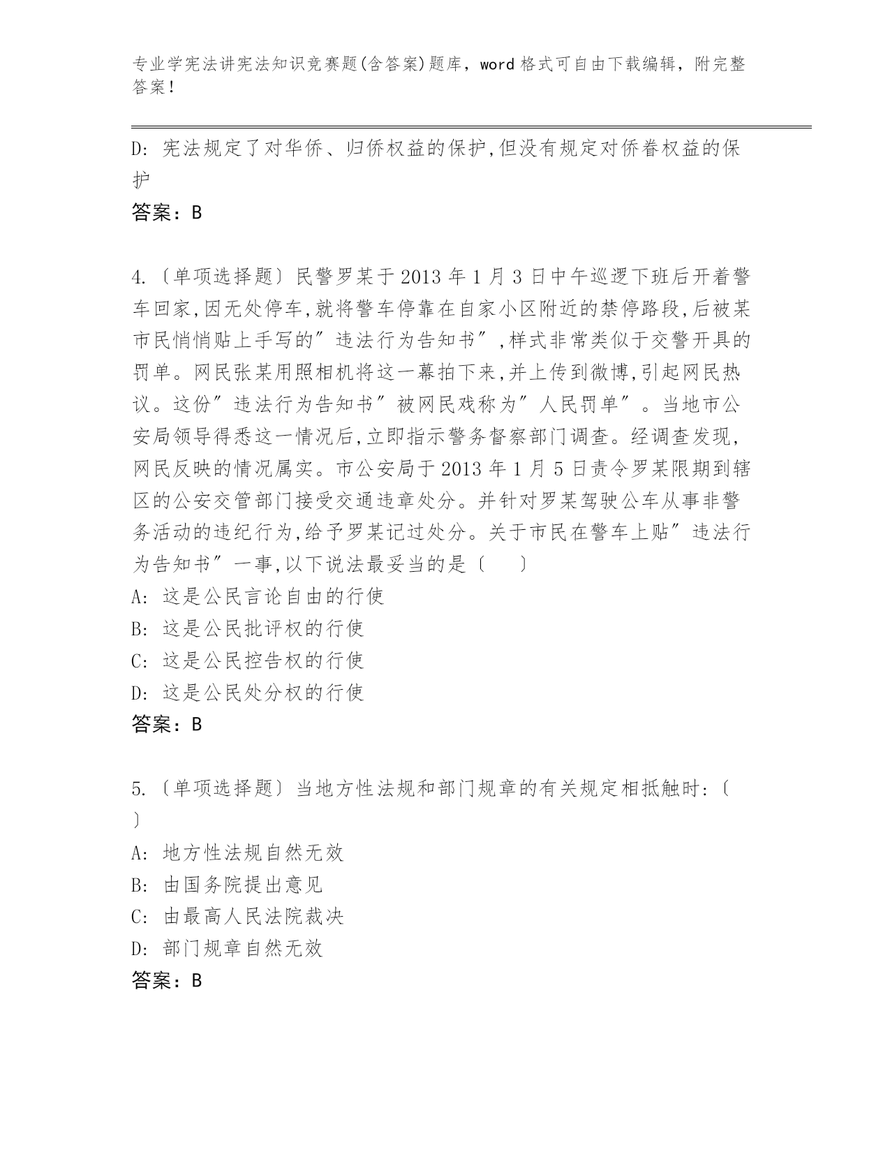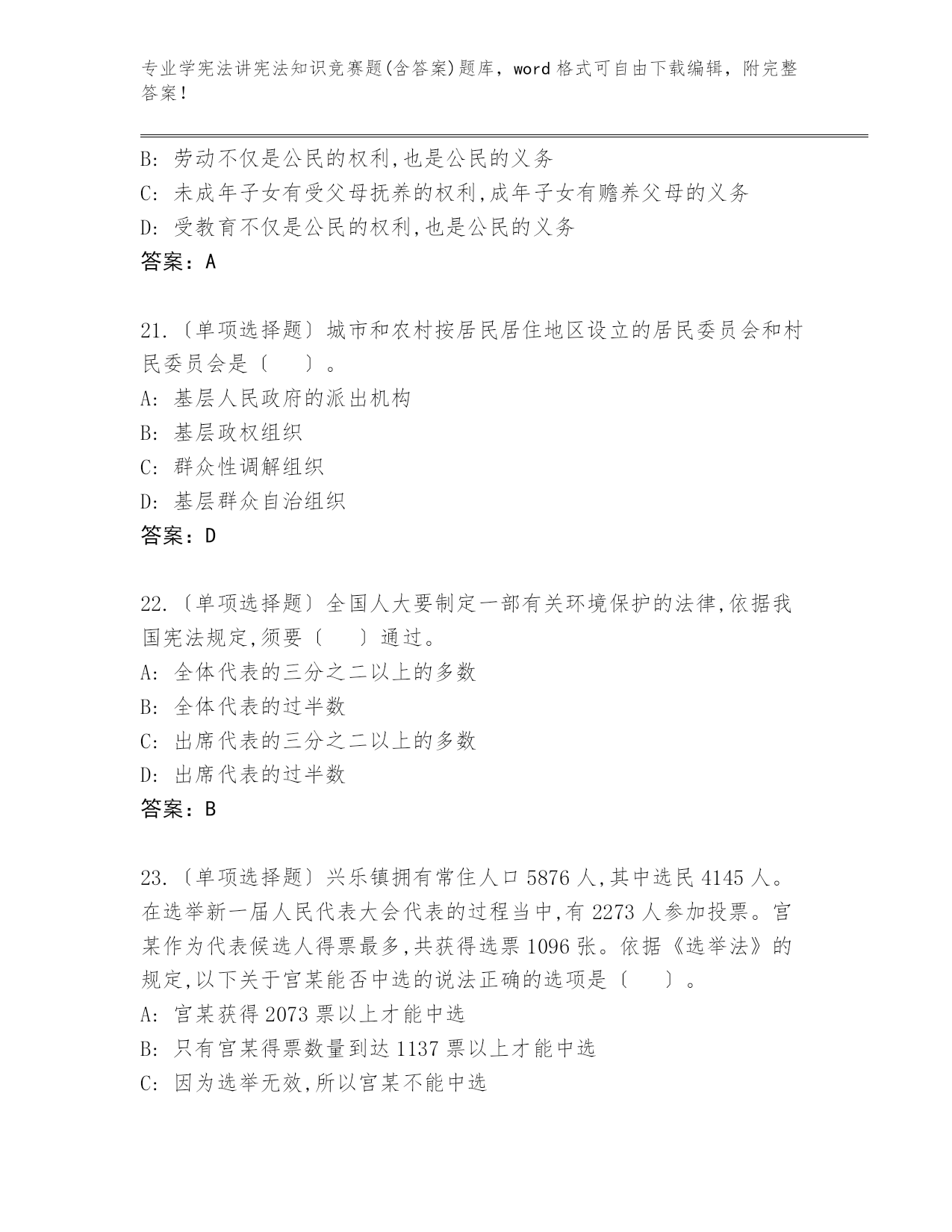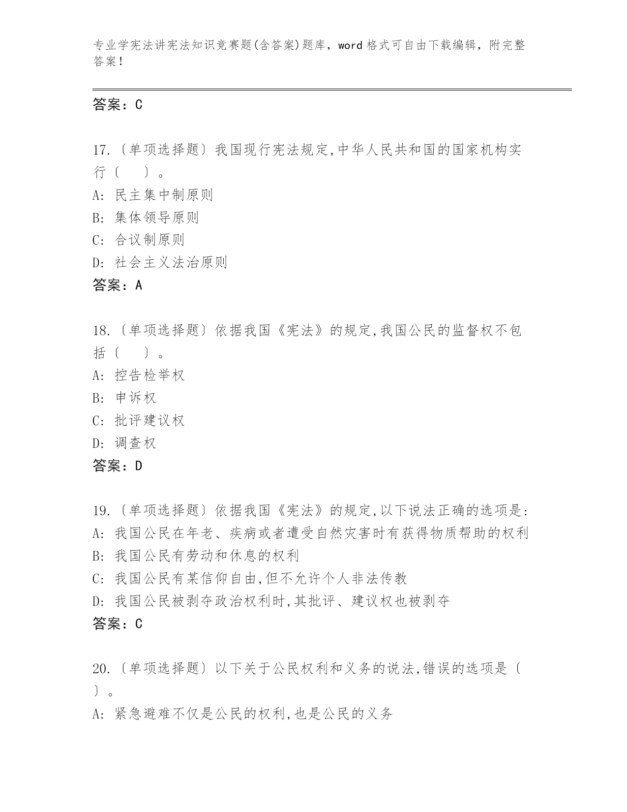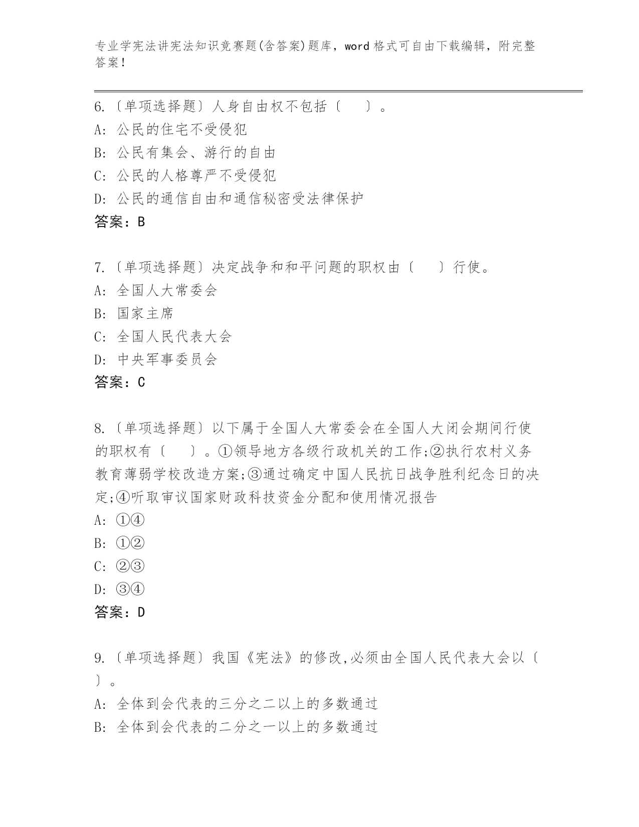 专业学宪法讲宪法知识竞赛题(含答案)题库,word格式可自由下载编辑,附完整答案!云南省石屏县整理学宪法讲宪法知识竞赛题(含答案)真题题库(各地真题)第I部分单选题(100题)1.〔单项选择题〕我国国务院各部、委的设立撤销或合并,其确定权在于〔〕。A:国家主席B:国务院总理C:国务院全体会议D:全国人民代表大会答案:D2.〔单项选择题〕我国负责监督宪法落地实施,认定违宪责任的机关是〔〕。A:全国人民代表大会B:全国人民代表大会常务委员会C:中国共产党中央委员会D:全国人民代表大会法律委员会答案:B3.〔单项选择题〕依据我国宪法的规定,以下有关公民基本权利的表述中,正确的选项是〔〕。A:—切公民都有选举权和被选举权B:公民合法财产的所有权和私有财产的继承权规定在宪法〞总纲〞局部C:宪法对建立劳动者休息和休养的设施未加以规定D:宪法规定了对华侨、归侨权益的保护,但没有规定对侨眷权益的保护答案:B4.〔单项选择题〕民警罗某于2013年1月3日中午巡逻下班后开着警车回家,因无处停车,就将警车停靠在自家小区附近的禁停路段,后被某市民悄悄贴上手写的〞违法行为告知书〞,样式非常类似于交警开具的罚单。网民张某用照相机将这一幕拍下来,并上传到微博,引起网民热议。这份〞违法行为告知书〞被网民戏称为〞人民罚单〞。当地市公安局领导得悉这一情况后,立即指示警务督察部门调查。经调查发现,网民反映的情况属实。市公安局于2013年1月5日责令罗某限期到辖区的公安交管部门接受交通违章处分。并针对罗某驾驶公车从事非警务活动的违纪行为,给予罗某记过处分。关于市民在警车上贴〞违法行为告知书〞一事,以下说法最妥当的是〔〕A:这是公民言论自由的行使B:这是公民批评权的行使C:这是公民控告权的行使D:这是公民处分权的行使答案:B5.〔单项选择题〕当地方性法规和部门规章的有关规定相抵触时:〔〕A:地方性法规自然无效B:由国务院提出意见C:由最高人民法院裁决D:部门规章自然无效答案:B6.〔单项选择题〕人身自由权不包括〔〕。A:公民的住宅不受侵犯B:公民有集会、游行的自由C:公民的人格尊严不受侵犯D:公民的通信自由和通信秘密受法律保护答案:B7.〔单项选择题〕决定战争和和平问题的职权由〔〕行使。A:全国人大常委会B:国家主席C:全国人民代表大会D:中央军事委员会答案:C8.〔单项选择题〕以下属于全国人大常委会在全国人大闭会期间行使的职权有〔〕。①领导地方各级行政机关的工作;②执行农村义务教育薄弱学校改造方案;③通过确定中国人民抗日战争胜利纪念日的决定;④听取审议国家财政科技资金分配和使用情况报告A:①④B:①②C:②③D:③④答案:D9.〔单项选择题〕我国《宪法》的修改,必须由全国人民代表大会以〔〕。A:全体到会代表的三分之二以上的多数通过B:全体到会代表的二分之一以上的多数通过C:全体代表的二分之一以上的多数通过D:全体代表的三分之二以上的多数通过答案:D10.〔单项选择题〕依据宪法规定,有权修改宪法的国家机关是〔〕。A:全国政协B:全国人大常委会C:国务院D:全国人大答案:D11.〔单项选择题.〔〕是社会主义民主政治的本质和核心要求,是社会主义政治文明建设的根本出发点和归宿。A:保障和改善民生B:社会主义核心价值体系C:民主集中制D:人民当家做主答案:D12.〔单项选择题〕在我国,乡、民族乡、镇的人民政府和村民委员会、居民委员会的关系是〔〕。A:领导和被领导B:委托和被委托C:指导和被指导D:监督和被监督答案:C13.〔单项选择题〕以下哪一项不属于宪法赋予公民的基本权利?〔〕A:环境权B:受教育权C:出版自由D:平等权答案:A14.〔单项选择题〕1949年中国人民政治协商会议通过的〔〕成为中国人民的大宪章,它在一个时期内起着临时宪法的作用。A:《中国人民政治协商会议组织法》B:《中国人民政治协商会议共同纲领》C:《中华人民共和国中央人民政府组织法》D:《中华人民共和国临时宪法》答案:B15.〔单项选择题〕我国宪法规定,公布法律的权利属于〔〕。A:全国人民代表大会常务委员会B:国家主席C:全国人民代表大会D:国务院答案:B16.〔单项选择题〕公民在法律面前一律平等是指〔〕。A:立法上平等B:守法平等C:法的适用上的平等D:司法上平等答案:C17.〔单项选择题〕我国现行宪法规定,中华人民共和国的国家机构实行〔〕。A:民主集中制原则B:集体领导原则C:合议制原则D:社会主义法治原则答案:A18.〔单项选择题〕依据我国《宪法》的