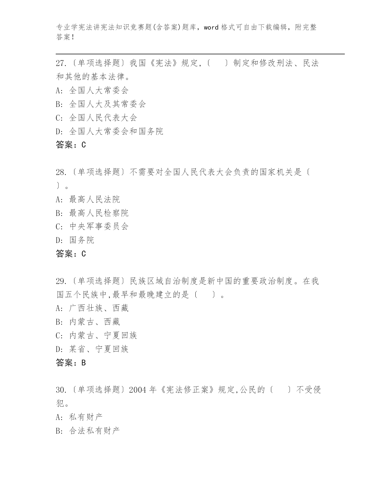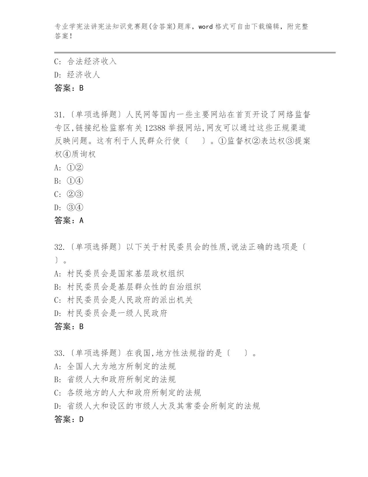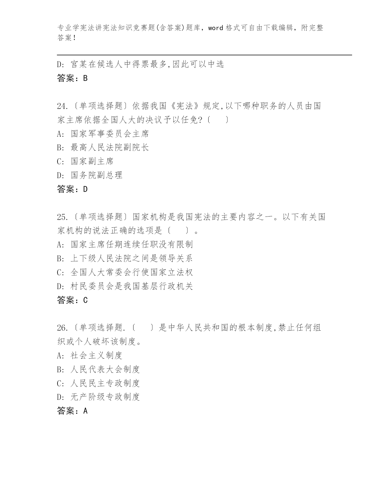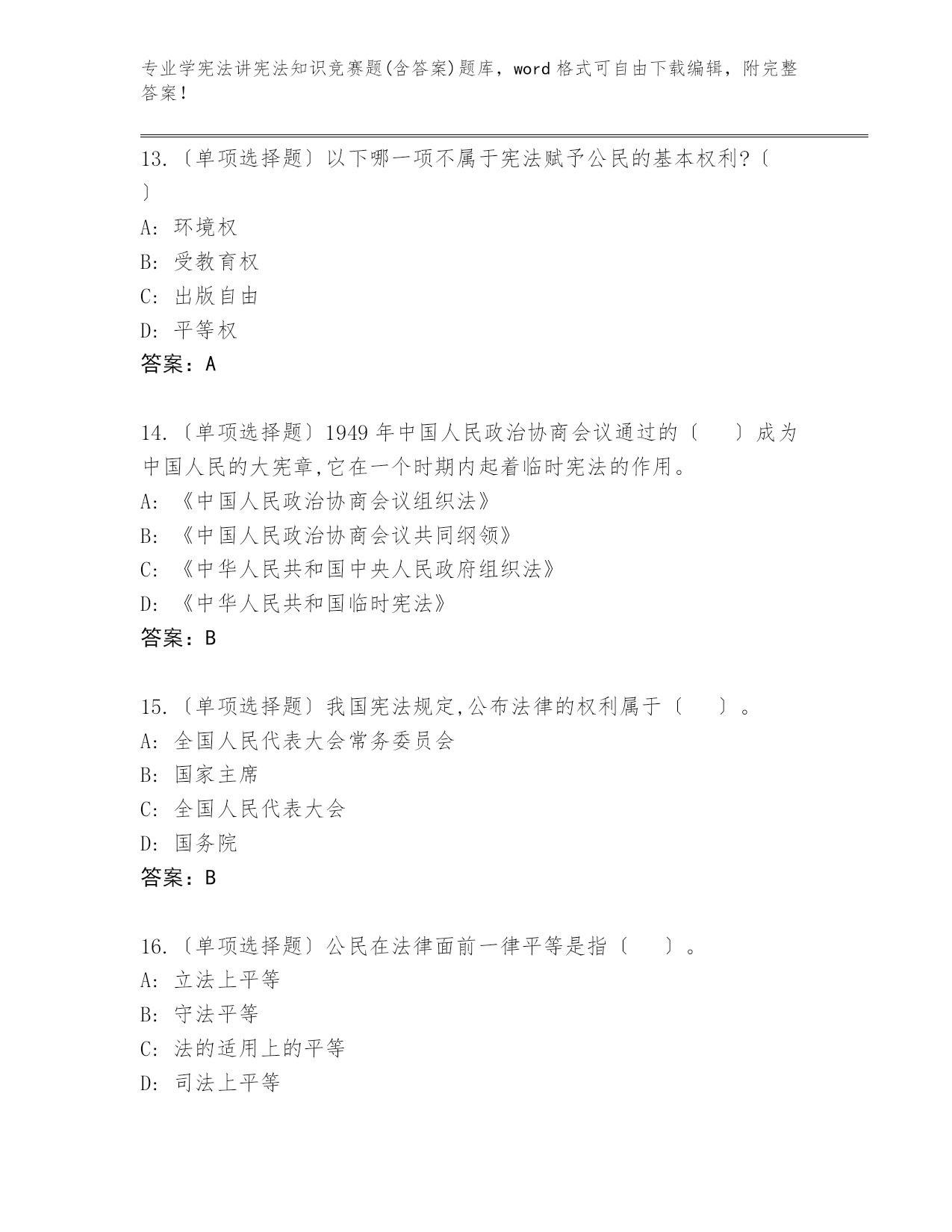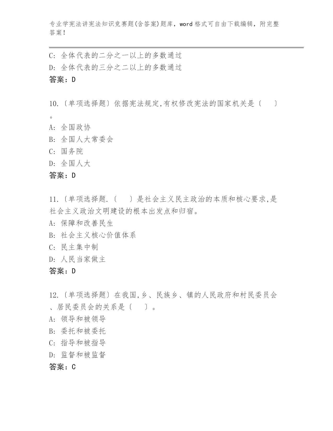 专业学宪法讲宪法知识竞赛题(含答案)题库,word格式可自由下载编辑,附完整答案!云南省石屏县整理学宪法讲宪法知识竞赛题(含答案)真题题库(各地真题)第I部分单选题(100题)1.〔单项选择题〕我国国务院各部、委的设立撤销或合并,其确定权在于〔〕。A:国家主席B:国务院总理C:国务院全体会议D:全国人民代表大会答案:D2.〔单项选择题〕我国负责监督宪法落地实施,认定违宪责任的机关是〔〕。A:全国人民代表大会B:全国人民代表大会常务委员会C:中国共产党中央委员会D:全国人民代表大会法律委员会答案:B3.〔单项选择题〕依据我国宪法的规定,以下有关公民基本权利的表述中,正确的选项是〔〕。A:—切公民都有选举权和被选举权B:公民合法财产的所有权和私有财产的继承权规定在宪法〞总纲〞局部C:宪法对建立劳动者休息和休养的设施未加以规定D:宪法规定了对华侨、归侨权益的保护,但没有规定对侨眷权益的保护答案:B4.〔单项选择题〕民警罗某于2013年1月3日中午巡逻下班后开着警车回家,因无处停车,就将警车停靠在自家小区附近的禁停路段,后被某市民悄悄贴上手写的〞违法行为告知书〞,样式非常类似于交警开具的罚单。网民张某用照相机将这一幕拍下来,并上传到微博,引起网民热议。这份〞违法行为告知书〞被网民戏称为〞人民罚单〞。当地市公安局领导得悉这一情况后,立即指示警务督察部门调查。经调查发现,网民反映的情况属实。市公安局于2013年1月5日责令罗某限期到辖区的公安交管部门接受交通违章处分。并针对罗某驾驶公车从事非警务活动的违纪行为,给予罗某记过处分。关于市民在警车上贴〞违法行为告知书〞一事,以下说法最妥当的是〔〕A:这是公民言论自由的行使B:这是公民批评权的行使C:这是公民控告权的行使D:这是公民处分权的行使答案:B5.〔单项选择题〕当地方性法规和部门规章的有关规定相抵触时:〔〕A:地方性法规自然无效B:由国务院提出意见C:由最高人民法院裁决D:部门规章自然无效答案:B6.〔单项选择题〕人身自由权不包括〔〕。A:公民的住宅不受侵犯B:公民有集会、游行的自由C:公民的人格尊严不受侵犯D:公民的通信自由和通信秘密受法律保护答案:B7.〔单项选择题〕决定战争和和平问题的职权由〔〕行使。A:全国人大常委会B:国家主席C:全国人民代表大会D:中央军事委员会答案:C8.〔单项选择题〕以下属于全国人大常委会在全国人大闭会期间行使的职权有〔〕。①领导地方各级行政机关的工作;②执行农村义务教育薄弱学校改造方案;③通过确定中国人民抗日战争胜利纪念日的决定;④听取审议国家财政科技资金分配和使用情况报告A:①④B:①②C:②③D:③④答案:D9.〔单项选择题〕我国《宪法》的修改,必须由全国人民代表大会以〔〕。A:全体到会代表的三分之二以上的多数通过B:全体到会代表的二分之一以上的多数通过C:全体代表的二分之一以上的多数通过D:全体代表的三分之二以上的多数通过答案:D10.〔单项选择题〕依据宪法规定,有权修改宪法的国家机关是〔〕。A:全国政协B:全国人大常委会C:国务院D:全国人大答案:D11.〔单项选择题.〔〕是社会主义民主政治的本质和核心要求,是社会主义政治文明建设的根本出发点和归宿。A:保障和改善民生B:社会主义核心价值体系C:民主集中制D:人民当家做主答案:D12.〔单项选择题〕在我国,乡、民族乡、镇的人民政府和村民委员会、居民委员会的关系是〔〕。A:领导和被领导B:委托和被委托C:指导和被指导D:监督和被监督答案:C13.〔单项选择题〕以下哪一项不属于宪法赋予公民的基本权利?〔〕A:环境权B:受教育权C:出版自由D:平等权答案:A14.〔单项选择题〕1949年中国人民政治协商会议通过的〔〕成为中国人民的大宪章,它在一个时期内起着临时宪法的作用。A:《中国人民政治协商会议组织法》B:《中国人民政治协商会议共同纲领》C:《中华人民共和国中央人民政府组织法》D:《中华人民共和国临时宪法》答案:B15.〔单项选择题〕我国宪法规定,公布法律的权利属于〔〕。A:全国人民代表大会常务委员会B:国家主席C:全国人民代表大会D:国务院答案:B16.〔单项选择题〕公民在法律面前一律平等是指〔〕。A:立法上平等B:守法平等C:法的适用上的平等D:司法上平等答案:C17.〔单项选择题〕我国现行宪法规定,中华人民共和国的国家机构实行〔〕。A:民主集中制原则B:集体领导原则C:合议制原则D:社会主义法治原则答案:A18.〔单项选择题〕依据我国《宪法》的