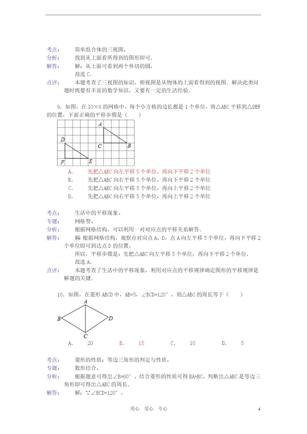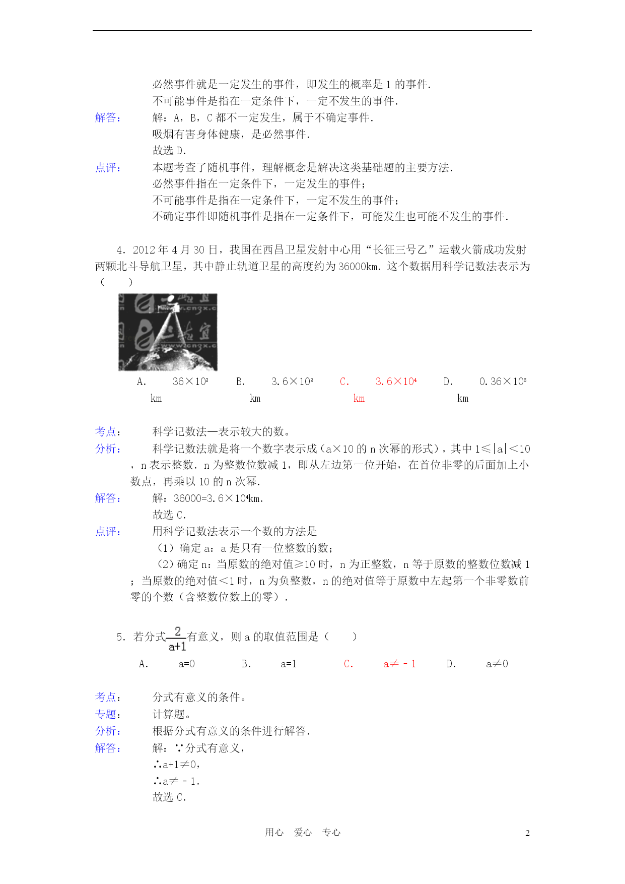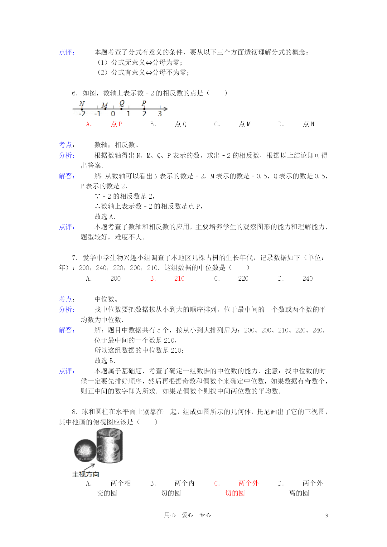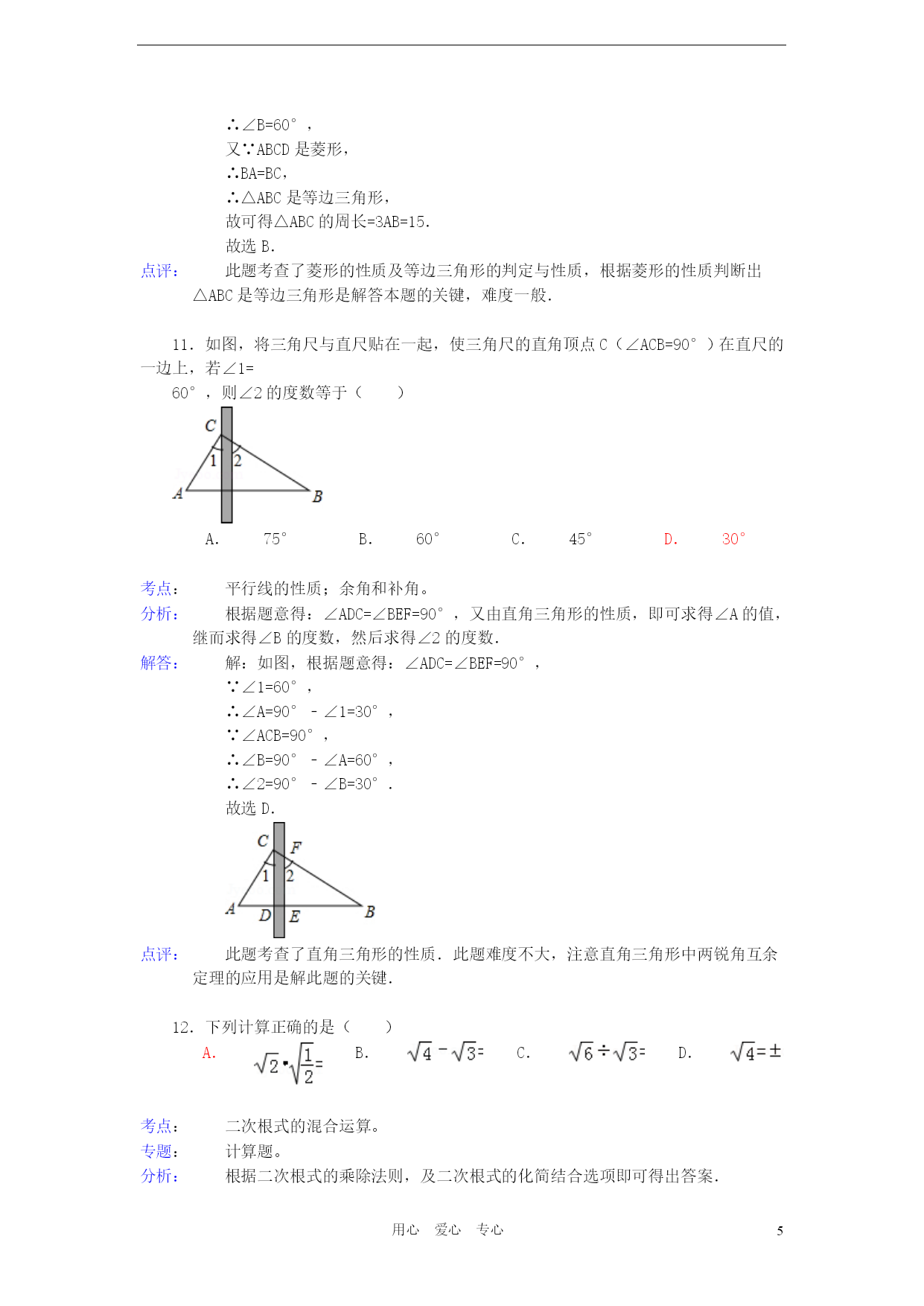 PAGEPAGE18用心爱心专心2012年湖北省宜昌市中考数学试卷参考答案与试题解析一、选择题(本题共15个小题,每小题3分,计45分)1.根据《国家中长期教育改革和发展规划纲要》,教育经费投入应占当年GDP的4%.若设2012年GDP的总值为n亿元,则2012年教育经费投入可表示为()亿元.A.4%nB.(1+4%)nC.(1﹣4%)nD.4%+n考点:列代数式。分析:根据2012年GDP的总值为n亿元,教育经费投入应占当年GDP的4%,即可得出2012年教育经费投入.解答:解:因为2012年GDP的总值为n亿元,教育经费投入应占当年GDP的4%,所以2012年教育经费投入可表示为4%n亿元.故选A.点评:此题主要考查了列代数式,解此题的关键是根据已知条件找出数量关系,列出代数式.2.在以下永洁环保、绿色食品、节能、绿色环保四个标志中,是轴对称图形是()A.B.C.D.考点:轴对称图形。分析:据轴对称图形的概念求解.如果一个图形沿着一条直线对折后两部分完全重合,这样的图形叫做轴对称图形,这条直线叫做对称轴.解答:解:A、不是轴对称图形,不符合题意;B、是轴对称图形,符合题意;C、不是轴对称图形,不符合题意;D、不是轴对称图形,不符合题意.故选B.点评:本题主要考查轴对称图形的知识点.确定轴对称图形的关键是寻找对称轴,图形两部分折叠后可重合.3.下列事件中是确定事件的是()A.篮球运动员身高都在2米以上B.弟弟的体重一定比哥哥的轻C.今年教师节一定是晴天D.吸烟有害身体健康考点:随机事件。分析:确定事件包括必然事件和不可能事件.必然事件就是一定发生的事件,即发生的概率是1的事件.不可能事件是指在一定条件下,一定不发生的事件.解答:解:A,B,C都不一定发生,属于不确定事件.吸烟有害身体健康,是必然事件.故选D.点评:本题考查了随机事件,理解概念是解决这类基础题的主要方法.必然事件指在一定条件下,一定发生的事件;不可能事件是指在一定条件下,一定不发生的事件;不确定事件即随机事件是指在一定条件下,可能发生也可能不发生的事件.4.2012年4月30日,我国在西昌卫星发射中心用“长征三号乙”运载火箭成功发射两颗北斗导航卫星,其中静止轨道卫星的高度约为36000km.这个数据用科学记数法表示为()A.36×103kmB.3.6×103kmC.3.6×104kmD.0.36×105km考点:科学记数法—表示较大的数。分析:科学记数法就是将一个数字表示成(a×10的n次幂的形式),其中1≤|a|<10,n表示整数.n为整数位数减1,即从左边第一位开始,在首位非零的后面加上小数点,再乘以10的n次幂.解答:解:36000=3.6×104km.故选C.点评:用科学记数法表示一个数的方法是(1)确定a:a是只有一位整数的数;(2)确定n:当原数的绝对值≥10时,n为正整数,n等于原数的整数位数减1;当原数的绝对值<1时,n为负整数,n的绝对值等于原数中左起第一个非零数前零的个数(含整数位数上的零).5.若分式有意义,则a的取值范围是()A.a=0B.a=1C.a≠﹣1D.a≠0考点:分式有意义的条件。专题:计算题。分析:根据分式有意义的条件进行解答.解答:解:∵分式有意义,∴a+1≠0,∴a≠﹣1.故选C.点评:本题考查了分式有意义的条件,要从以下三个方面透彻理解分式的概念:(1)分式无意义⇔分母为零;(2)分式有意义⇔分母不为零;6.如图,数轴上表示数﹣2的相反数的点是()A.点PB.点QC.点MD.点N考点:数轴;相反数。分析:根据数轴得出N、M、Q、P表示的数,求出﹣2的相反数,根据以上结论即可得出答案.解答:解:从数轴可以看出N表示的数是﹣2,M表示的数是﹣0.5,Q表示的数是0.5,P表示的数是2,∵﹣2的相反数是2,∴数轴上表示数﹣2的相反数是点P,故选A.点评:本题考查了数轴和相反数的应用,主要培养学生的观察图形的能力和理解能力,题型较好,难度不大.7.爱华中学生物兴趣小组调查了本地区几棵古树的生长年代,记录数据如下(单位:年):200,240,220,200,210.这组数据的中位数是()A.200B.210C.220D.240考点:中位数。分析:找中位数要把数据按从小到大的顺序排列,位于最中间的一个数或两个数的平均数为中位数.解答:解:题目中数据共有5个,按从小到大排列后为:200、200、210、220、240,位于最中间的一个数是210,所以这组数据的中位数是210;故选B.点评:本题属于基础题,考查了确定一组数据的中位数的能力.注意:找中位数的时候一定要先排好顺序,然后再根据奇数和偶数个