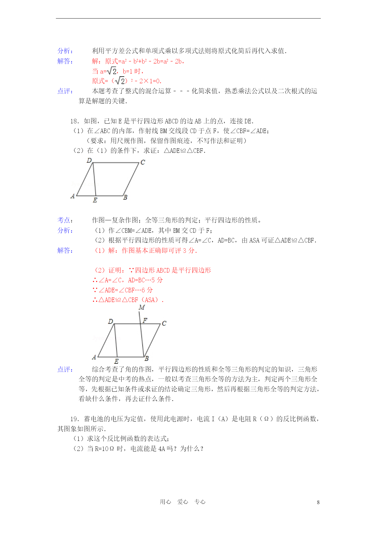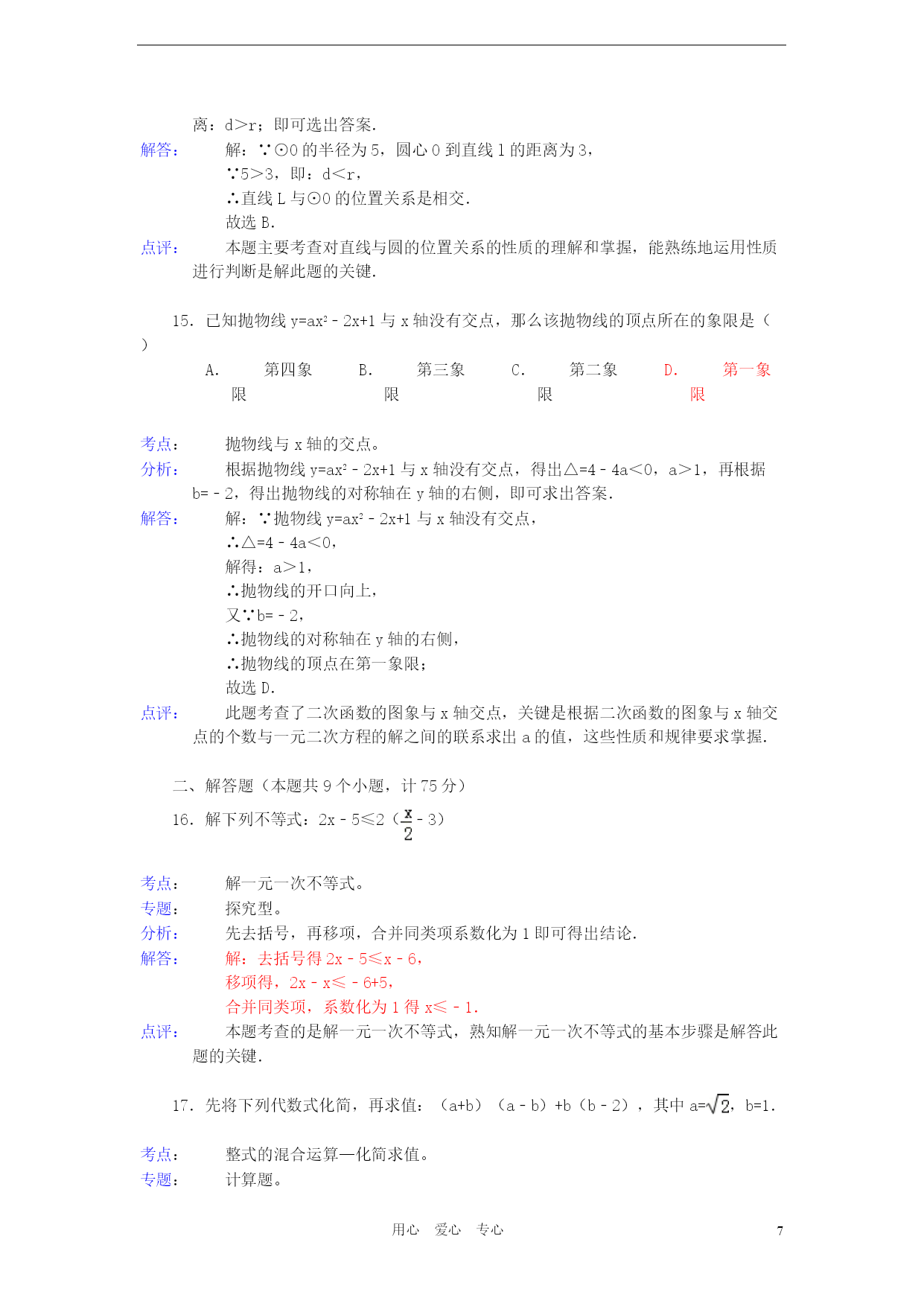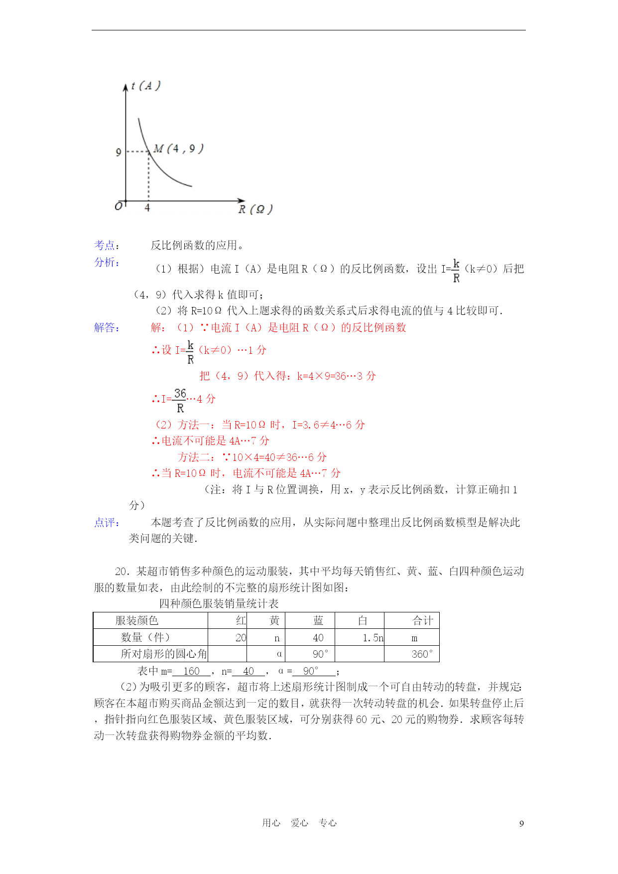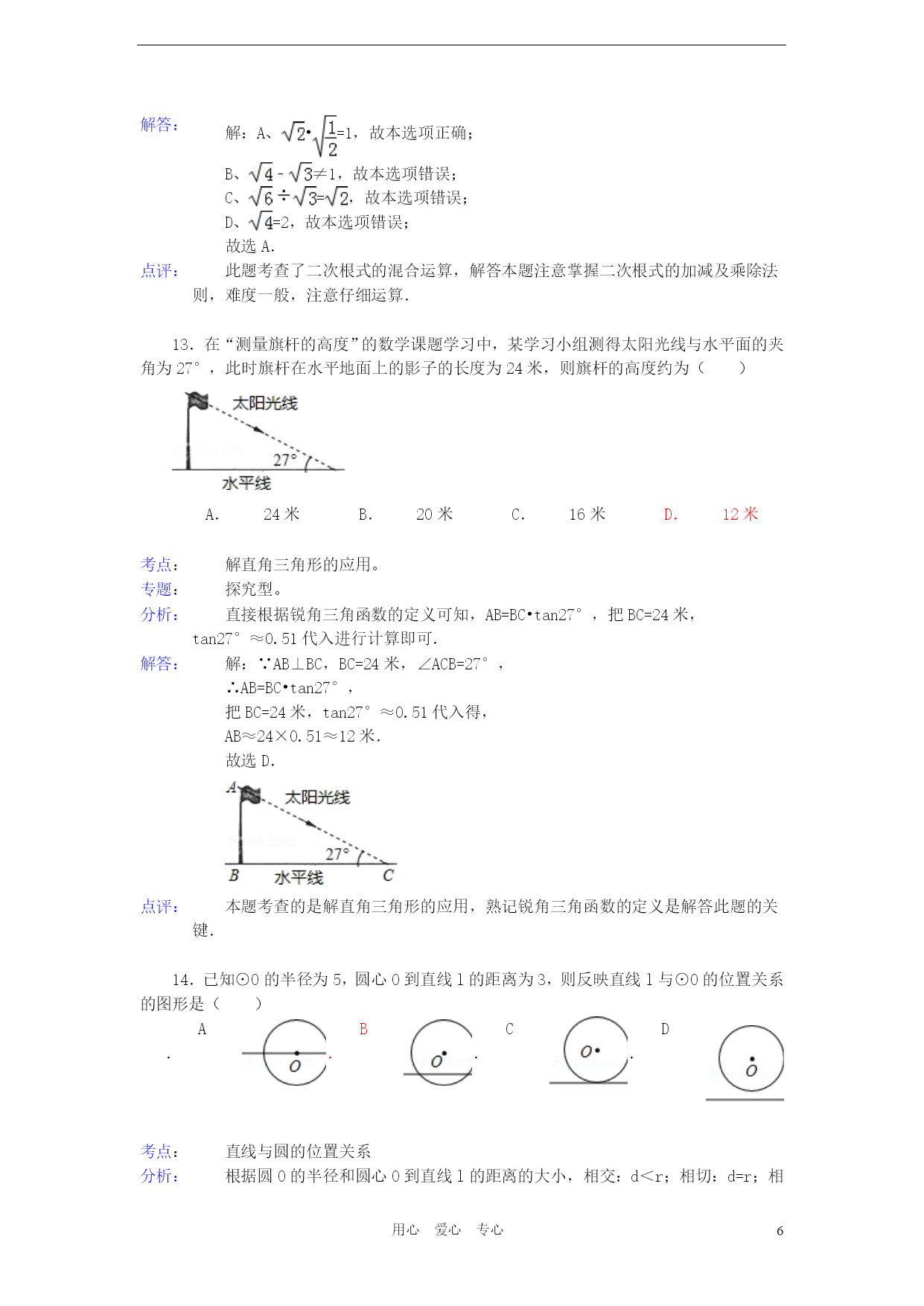 PAGEPAGE18用心爱心专心2012年湖北省宜昌市中考数学试卷参考答案与试题解析一、选择题(本题共15个小题,每小题3分,计45分)1.根据《国家中长期教育改革和发展规划纲要》,教育经费投入应占当年GDP的4%.若设2012年GDP的总值为n亿元,则2012年教育经费投入可表示为()亿元.A.4%nB.(1+4%)nC.(1﹣4%)nD.4%+n考点:列代数式。分析:根据2012年GDP的总值为n亿元,教育经费投入应占当年GDP的4%,即可得出2012年教育经费投入.解答:解:因为2012年GDP的总值为n亿元,教育经费投入应占当年GDP的4%,所以2012年教育经费投入可表示为4%n亿元.故选A.点评:此题主要考查了列代数式,解此题的关键是根据已知条件找出数量关系,列出代数式.2.在以下永洁环保、绿色食品、节能、绿色环保四个标志中,是轴对称图形是()A.B.C.D.考点:轴对称图形。分析:据轴对称图形的概念求解.如果一个图形沿着一条直线对折后两部分完全重合,这样的图形叫做轴对称图形,这条直线叫做对称轴.解答:解:A、不是轴对称图形,不符合题意;B、是轴对称图形,符合题意;C、不是轴对称图形,不符合题意;D、不是轴对称图形,不符合题意.故选B.点评:本题主要考查轴对称图形的知识点.确定轴对称图形的关键是寻找对称轴,图形两部分折叠后可重合.3.下列事件中是确定事件的是()A.篮球运动员身高都在2米以上B.弟弟的体重一定比哥哥的轻C.今年教师节一定是晴天D.吸烟有害身体健康考点:随机事件。分析:确定事件包括必然事件和不可能事件.必然事件就是一定发生的事件,即发生的概率是1的事件.不可能事件是指在一定条件下,一定不发生的事件.解答:解:A,B,C都不一定发生,属于不确定事件.吸烟有害身体健康,是必然事件.故选D.点评:本题考查了随机事件,理解概念是解决这类基础题的主要方法.必然事件指在一定条件下,一定发生的事件;不可能事件是指在一定条件下,一定不发生的事件;不确定事件即随机事件是指在一定条件下,可能发生也可能不发生的事件.4.2012年4月30日,我国在西昌卫星发射中心用“长征三号乙”运载火箭成功发射两颗北斗导航卫星,其中静止轨道卫星的高度约为36000km.这个数据用科学记数法表示为()A.36×103kmB.3.6×103kmC.3.6×104kmD.0.36×105km考点:科学记数法—表示较大的数。分析:科学记数法就是将一个数字表示成(a×10的n次幂的形式),其中1≤|a|<10,n表示整数.n为整数位数减1,即从左边第一位开始,在首位非零的后面加上小数点,再乘以10的n次幂.解答:解:36000=3.6×104km.故选C.点评:用科学记数法表示一个数的方法是(1)确定a:a是只有一位整数的数;(2)确定n:当原数的绝对值≥10时,n为正整数,n等于原数的整数位数减1;当原数的绝对值<1时,n为负整数,n的绝对值等于原数中左起第一个非零数前零的个数(含整数位数上的零).5.若分式有意义,则a的取值范围是()A.a=0B.a=1C.a≠﹣1D.a≠0考点:分式有意义的条件。专题:计算题。分析:根据分式有意义的条件进行解答.解答:解:∵分式有意义,∴a+1≠0,∴a≠﹣1.故选C.点评:本题考查了分式有意义的条件,要从以下三个方面透彻理解分式的概念:(1)分式无意义⇔分母为零;(2)分式有意义⇔分母不为零;6.如图,数轴上表示数﹣2的相反数的点是()A.点PB.点QC.点MD.点N考点:数轴;相反数。分析:根据数轴得出N、M、Q、P表示的数,求出﹣2的相反数,根据以上结论即可得出答案.解答:解:从数轴可以看出N表示的数是﹣2,M表示的数是﹣0.5,Q表示的数是0.5,P表示的数是2,∵﹣2的相反数是2,∴数轴上表示数﹣2的相反数是点P,故选A.点评:本题考查了数轴和相反数的应用,主要培养学生的观察图形的能力和理解能力,题型较好,难度不大.7.爱华中学生物兴趣小组调查了本地区几棵古树的生长年代,记录数据如下(单位:年):200,240,220,200,210.这组数据的中位数是()A.200B.210C.220D.240考点:中位数。分析:找中位数要把数据按从小到大的顺序排列,位于最中间的一个数或两个数的平均数为中位数.解答:解:题目中数据共有5个,按从小到大排列后为:200、200、210、220、240,位于最中间的一个数是210,所以这组数据的中位数是210;故选B.点评:本题属于基础题,考查了确定一组数据的中位数的能力.注意:找中位数的时候一定要先排好顺序,然后再根据奇数和偶数个