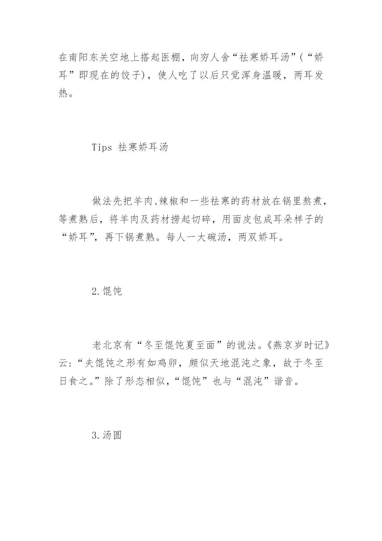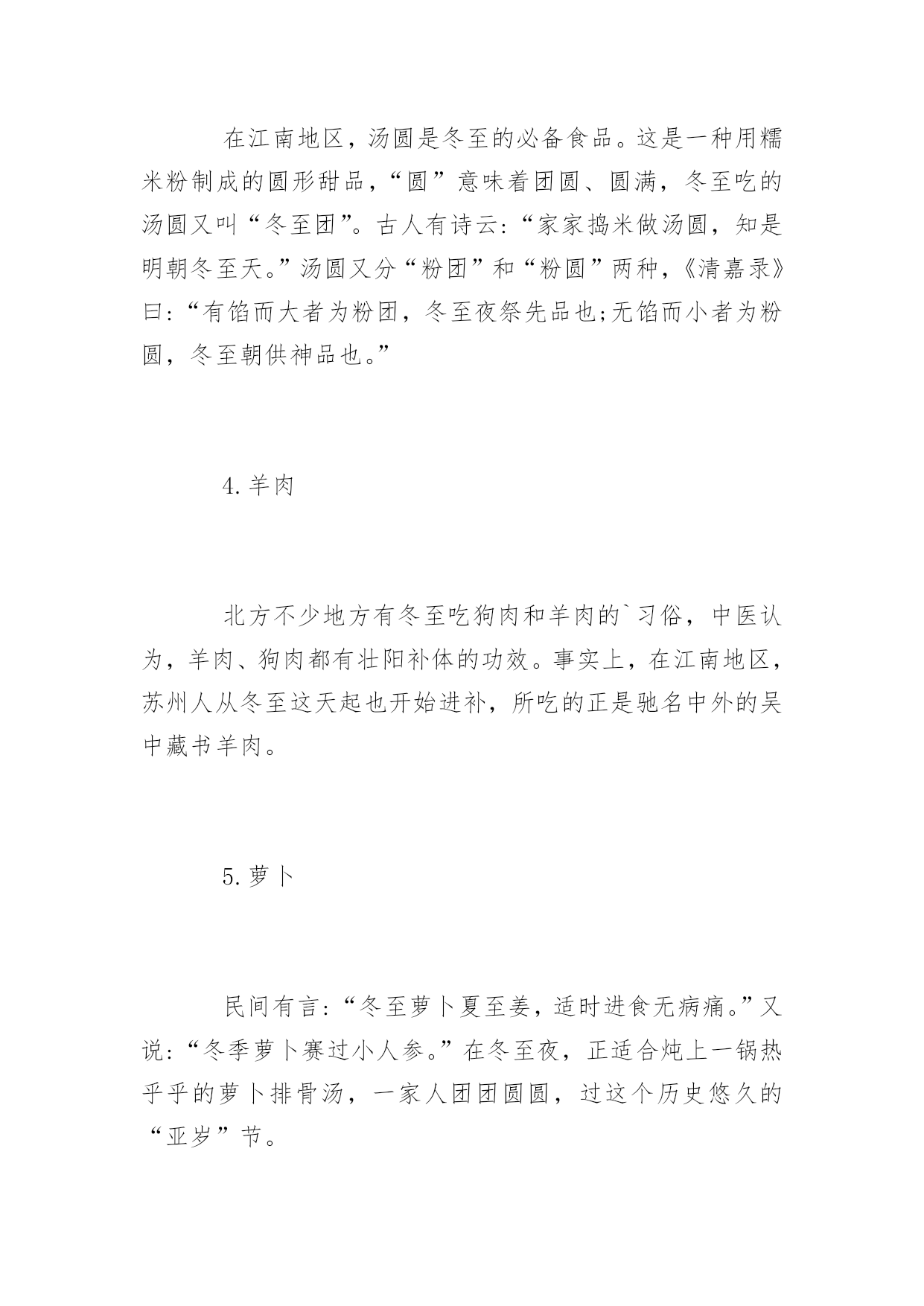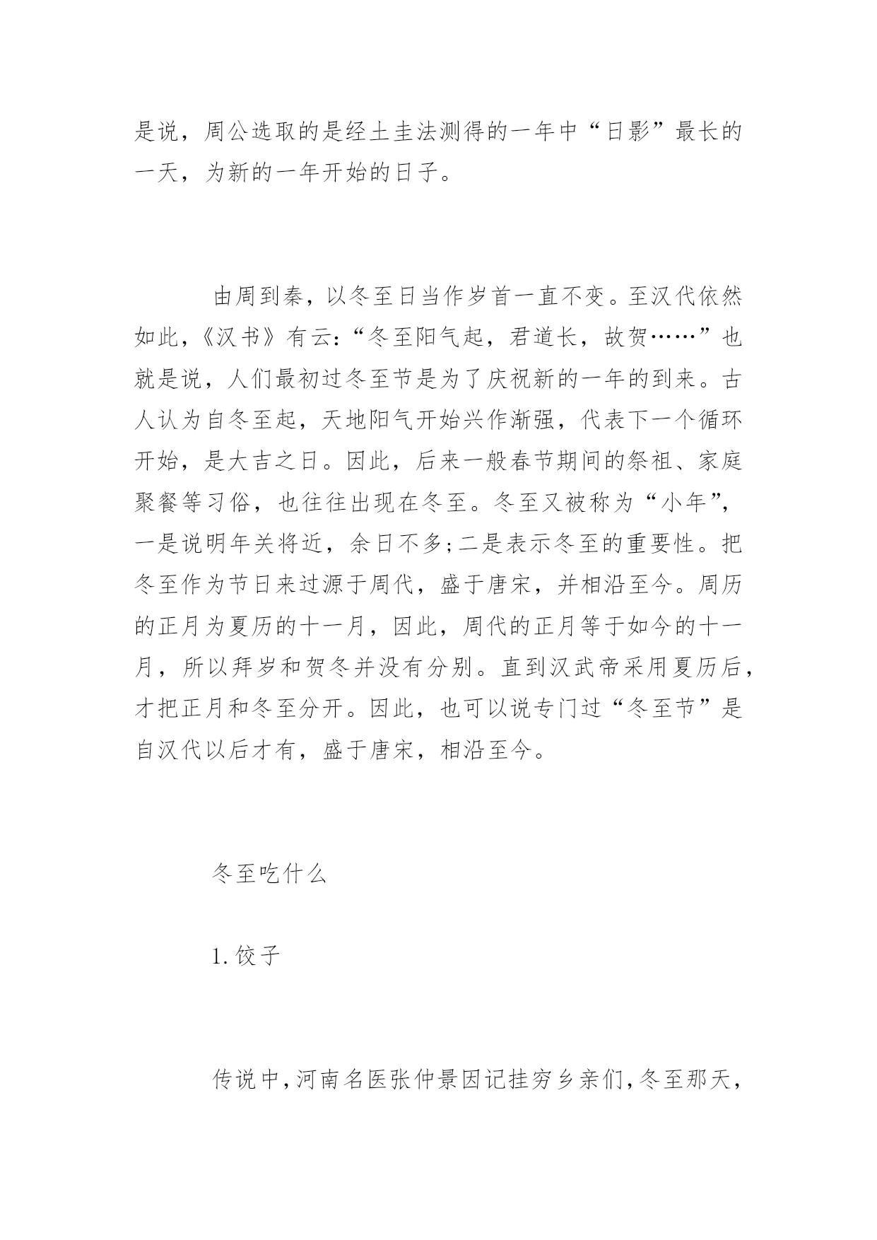 冬至的相关资料简介2016冬至的相关资料简介导语:俗话说“冬至大如年”,冬至是二十四节气中最早制订出的一个,是中国农历中一个重要的节气,冬至俗称“冬节”、“长至节”、“亚岁”等。下面小编就给大家介绍一下冬至的相关知识。2016冬至时间:2016年12月21日农历十一月廿三星期三冬至的来源冬至是24节气中最早被制订的一个,然而多数人并不知道,冬至的起源居然是来自于一次国家层面的都城规划。早在3000多年前,周公始用土圭法测影,在洛邑测得天下之中的位置,定此为土中,这在当时有着政治意义的举动,却成了影响后世几千年的节日之一。周公到洛阳,用土圭法测得洛阳所处的地方即为“天下之中”,然后开始占卜国家社稷的吉地。《尚书·洛诰》记载:周公“朝至于洛师”,对洛阳周边的几个地方做了考察,最后确定涧水东、瀍水西、瀍水东皆“惟洛食”(都是兴建宗庙社稷的好地方)[3]。周公通过“土圭测景”选定洛邑基址的史实,被载入了古代典籍,也被后人奉为封邦建国的.成法。“土圭测景”的目的是找出“土中”(中国的中心)。这种方法的要义是“树八尺之表,夏至日,景长尺有五寸;冬至日,景长一丈三尺五寸”(即竖起高为8尺的标杆,在夏至日观测,中午的日影是1.5尺,冬至日中午的日影是13.5尺),“测土深,正日影,求地中,验四时”。用这种方法测到的就是“土中”洛阳、“洛邑”的理论位置。依周公测影所定的天下之中,周人详细规划了灭商后的第一座国家都城,《逸周书·作雒》载:“乃作大邑成周于土中,……南系于洛水,北因于邙山,以为天下之大凑。”[4]。“定天保,依天室”,国家社稷(都城、宗庙)完成之后,周公在成周明堂制礼作乐,详细制订了国家礼仪制度,据记载,周代以冬十一月为正月,以冬至为岁首过新年,也就是说,周公选取的是经土圭法测得的一年中“日影”最长的一天,为新的一年开始的日子。由周到秦,以冬至日当作岁首一直不变。至汉代依然如此,《汉书》有云:“冬至阳气起,君道长,故贺……”也就是说,人们最初过冬至节是为了庆祝新的一年的到来。古人认为自冬至起,天地阳气开始兴作渐强,代表下一个循环开始,是大吉之日。因此,后来一般春节期间的祭祖、家庭聚餐等习俗,也往往出现在冬至。冬至又被称为“小年”,一是说明年关将近,余日不多;二是表示冬至的重要性。把冬至作为节日来过源于周代,盛于唐宋,并相沿至今。周历的正月为夏历的十一月,因此,周代的正月等于如今的十一月,所以拜岁和贺冬并没有分别。直到汉武帝采用夏历后,才把正月和冬至分开。因此,也可以说专门过“冬至节”是自汉代以后才有,盛于唐宋,相沿至今。冬至吃什么1.饺子传说中,河南名医张仲景因记挂穷乡亲们,冬至那天,在南阳东关空地上搭起医棚,向穷人舍“祛寒娇耳汤”(“娇耳”即现在的饺子),使人吃了以后只觉浑身温暖,两耳发热。Tips祛寒娇耳汤做法先把羊肉、辣椒和一些祛寒的药材放在锅里熬煮,等煮熟后,将羊肉及药材捞起切碎,用面皮包成耳朵样子的“娇耳”,再下锅煮熟。每人一大碗汤,两双娇耳。2.馄饨老北京有“冬至馄饨夏至面”的说法。《燕京岁时记》云:“夫馄饨之形有如鸡卵,颇似天地混沌之象,故于冬至日食之。”除了形态相似,“馄饨”也与“混沌”谐音。3.汤圆在江南地区,汤圆是冬至的必备食品。这是一种用糯米粉制成的圆形甜品,“圆”意味着团圆、圆满,冬至吃的汤圆又叫“冬至团”。古人有诗云:“家家捣米做汤圆,知是明朝冬至天。”汤圆又分“粉团”和“粉圆”两种,《清嘉录》曰:“有馅而大者为粉团,冬至夜祭先品也;无馅而小者为粉圆,冬至朝供神品也。”4.羊肉北方不少地方有冬至吃狗肉和羊肉的`习俗,中医认为,羊肉、狗肉都有壮阳补体的功效。事实上,在江南地区,苏州人从冬至这天起也开始进补,所吃的正是驰名中外的吴中藏书羊肉。5.萝卜民间有言:“冬至萝卜夏至姜,适时进食无病痛。”又说:“冬季萝卜赛过小人参。”在冬至夜,正适合炖上一锅热乎乎的萝卜排骨汤,一家人团团圆圆,过这个历史悠久的“亚岁”节。宜于冬季进补的食物不少,大致可分为平补、温补、滋补三大类。一般说来,温补宜用热性食物,用于气虚;滋补宜用寒性食物,用于血虚;无气虚血虚则宜用平性食物,是谓平补。◆平补猪肉及其肝、肾、肺等,蛋类、母鸡、鸭、豆腐等,芹菜、萝卜、桂圆、蘑菇类,蜂蜜、蜂乳等。◇滋补甲鱼、鲫鱼、淡菜、海带、海蜇、梨、橘、苹果、香蕉、百合、芝麻、绿豆、赤豆、豌豆、黄花菜、银耳、燕窝等。◆温补羊肉、牛肉及二者的内脏,狗肉,公鸡,鹅,海参,乌贼,鹿肉,大枣、核桃、扁豆,薯芋类,葱、蒜、韭、姜,蚕豆,小麦粉,酒类等。除了注意食物的选用外,还须注意烹制技法:滋补食品,宜清炖、清蒸或煨汤,口味清淡;温补食品,宜红烧或酱卤,口味浓重;平补食品,可二法兼用,口味则以平和为主。冬至如何养生?