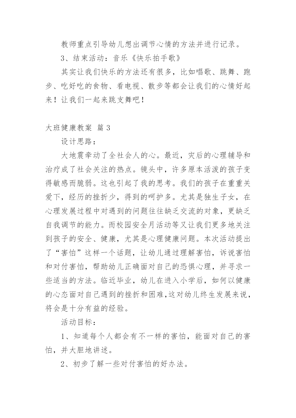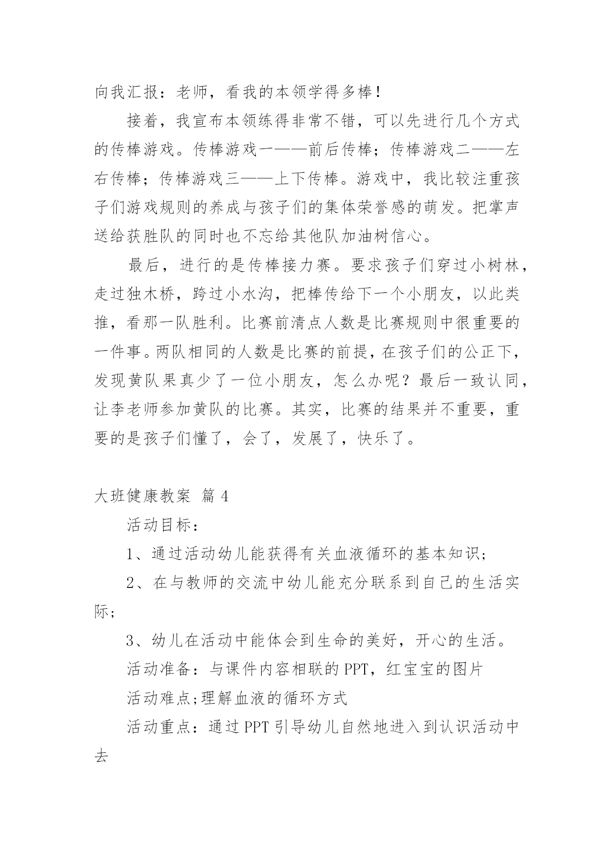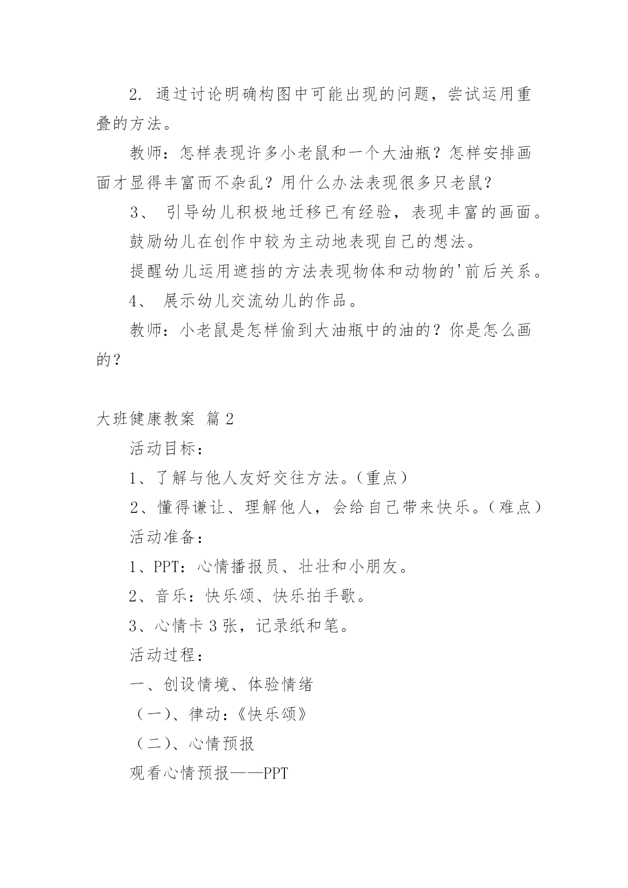 大班健康教案大班健康教案范文集合六篇作为一名默默奉献的教育工作者,时常会需要准备好教案,借助教案可以让教学工作更科学化。教案应该怎么写呢?以下是小编帮大家整理的大班健康教案6篇,仅供参考,希望能够帮助到大家。大班健康教案篇1目标:1.迁移已有经验进行充分的想象,并能够大胆表现自己的设想。2.尝试运用遮挡的方法处理较为复杂的画面。3.体验解决问题后的成就感和快乐。准备:纸和记号笔。过程:1.设置问题情景,充分引导幼儿想象。教师:小老鼠肚子饿了,想找东西吃。忽然它闻到了一股油的香味。它来到近处一看,哇!好大的一个油瓶呀!小老鼠想,我怎么才能喝到这香喷喷的油呢?请你们帮小老鼠想个办法,可以借助什么工具呢?什么办法最好?怎样做又快又好?2.通过讨论明确构图中可能出现的问题,尝试运用重叠的方法。教师:怎样表现许多小老鼠和一个大油瓶?怎样安排画面才显得丰富而不杂乱?用什么办法表现很多只老鼠?3、引导幼儿积极地迁移已有经验,表现丰富的画面。鼓励幼儿在创作中较为主动地表现自己的想法。提醒幼儿运用遮挡的方法表现物体和动物的'前后关系。4、展示幼儿交流幼儿的作品。教师:小老鼠是怎样偷到大油瓶中的油的?你是怎么画的?大班健康教案篇2活动目标:1、了解与他人友好交往方法。(重点)2、懂得谦让、理解他人,会给自己带来快乐。(难点)活动准备:1、PPT:心情播报员、壮壮和小朋友。2、音乐:快乐颂、快乐拍手歌。3、心情卡3张,记录纸和笔。活动过程:一、创设情境、体验情绪(一)、律动:《快乐颂》(二)、心情预报观看心情预报——PPT(三)、猜一猜心情不好的原因提问:晴天代表什么样的心情?阴天代表什么样的心情?猜一猜壮壮为什么会心情不好?重点引导幼儿根据自己的已有经验讲述心情不好的原因。(四)、观看——PPT《壮壮和小朋友》,了解壮壮阴天心情的原因1、提问:壮壮为什么心情不好?小朋友为什么都不理他了?2、帮助壮壮想想办法,他应该怎样做才能让小朋友重新喜欢他?3、我们帮助壮壮解决了问题,看看壮壮现在的心情是怎样?(播放PPT心情预报员)4、讨论:生活中你游戏的时侯,如果你想玩别人的玩具,应该怎么办?5、教师小结:大家一起玩的时候要学会谦让、等待、协商、合作,这样别人才会喜欢和你做朋友,朋友多了你才会更快乐。二、寻找快乐的'办法,并体验快乐。1、师:这里有3位小朋友,他们的心情是怎样的?心情为什么是阴天呢?他们遇到了什么事情?2、分组讨论并记录调节心情的方法。(站排头、想看同一本书、别人说我画的画不好看)教师重点引导幼儿想出调节心情的方法并进行记录。3、结束活动:音乐《快乐拍手歌》其实让我们快乐的方法还有很多,比如唱歌、跳舞、跑步、吃好吃的食物、看电视、散步等都会让我们的心情好起来!让我们一起来跳支舞吧!大班健康教案篇3设计思路:大地震牵动了全社会人的心。最近,灾后的心理辅导和治疗成了社会关注的热点。镜头中,许多原本活泼的孩子变得敏感而脆弱。这也引起了我的思考。我们的孩子在重重关爱下,经历的挫折少,得到的呵护多。尤其是独生子女,在心理发展过程中对遇到的问题往往缺乏交流的对象,更缺乏自我调节的能力。而校园安全月活动等又让我们更多地关注到孩子的安全、健康,尤其是心理健康问题。本次活动提出了“害怕”这样一个话题,让幼儿通过理解害怕,诉说害怕和对付害怕,帮助幼儿正确面对自己的恐惧心理,并寻求一些适当的方法。临近毕业,幼儿在进入小学后,如何以健康的心态面对自己遇到的挫折和困难,这对幼儿终生发展来说,将会是十分有益的经验。活动目标:1、知道每个人都会有不一样的害怕,能面对自己的害怕,并大胆地讲述。2、初步了解一些对付害怕的好办法。活动准备:PPT、大张的纸、各色花瓣若干活动过程:1、看看议议:(理解人的害怕是有原因的)放PPT:这是一位来自四川灾区的小朋友,很长时间以来,都没有人听见她说过话。重点提问:周围人说她是个小哑巴,你觉得呢?(听一听她的心里话:诉说自己的害怕。)她为什么不说话?她在害怕什么?小结:每个人在经历了一些事情之后,都会产生一些害怕的想法。2、大胆诉说:(能勇敢地说出自己心里的害怕)过渡语:每个人的经历不同,就会有不一样的害怕。重点提问:你有害怕的事情吗?你最害怕的`是什么?为什么?(教师即时以简笔画记录幼儿不同的害怕。)小结:有的人害怕特别的东西,有的人害怕特别的事情。今天,我们把心里N个害怕说了出来。3、交流讨论:(初步了解一些对付害怕的简单方法)过渡语:想不想把这些可恶的害怕对付掉?(恭喜你们,要知道,你们已经把自己心里的害怕说了出来,这就是对付害怕的第一个好办法。)重点提问:对于这么多不一样的害怕,你还有什么好办法吗?(教师根据幼儿回答逐一提升,并用一片花瓣表示一种办法:有些害怕,随着你慢慢长大,就会慢慢消失;有些害怕……)小结:相信你们的好办法