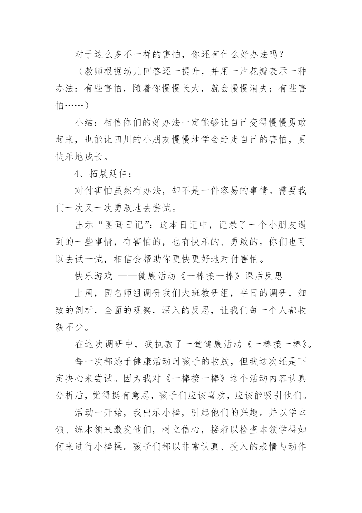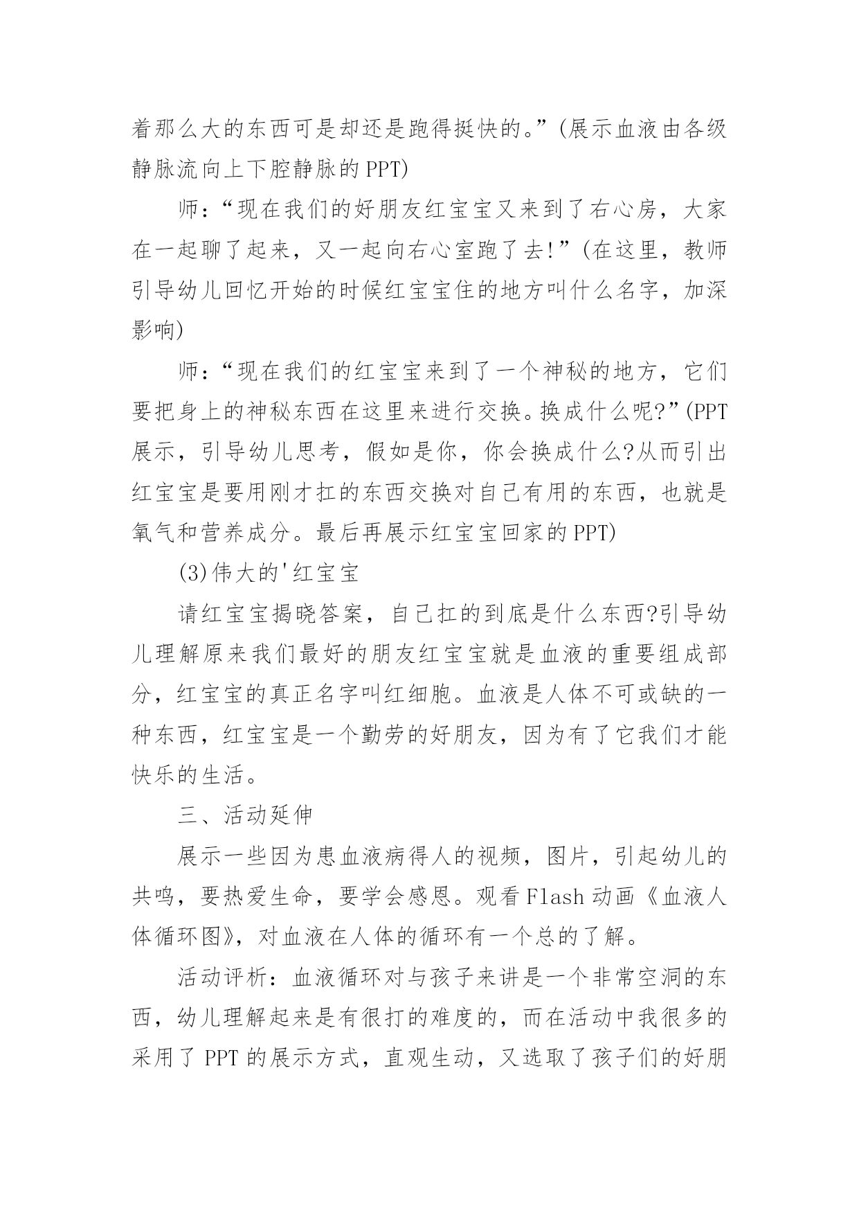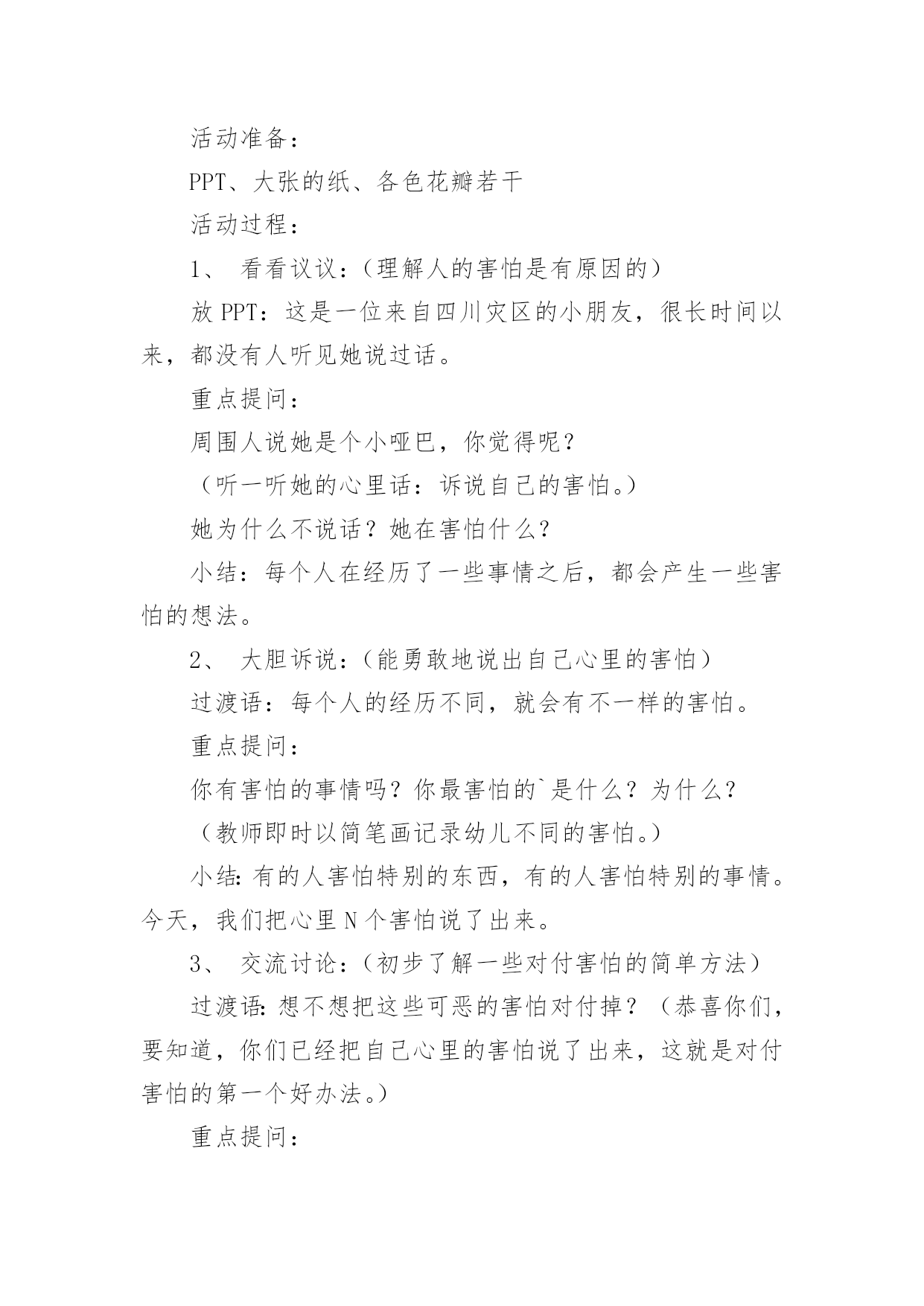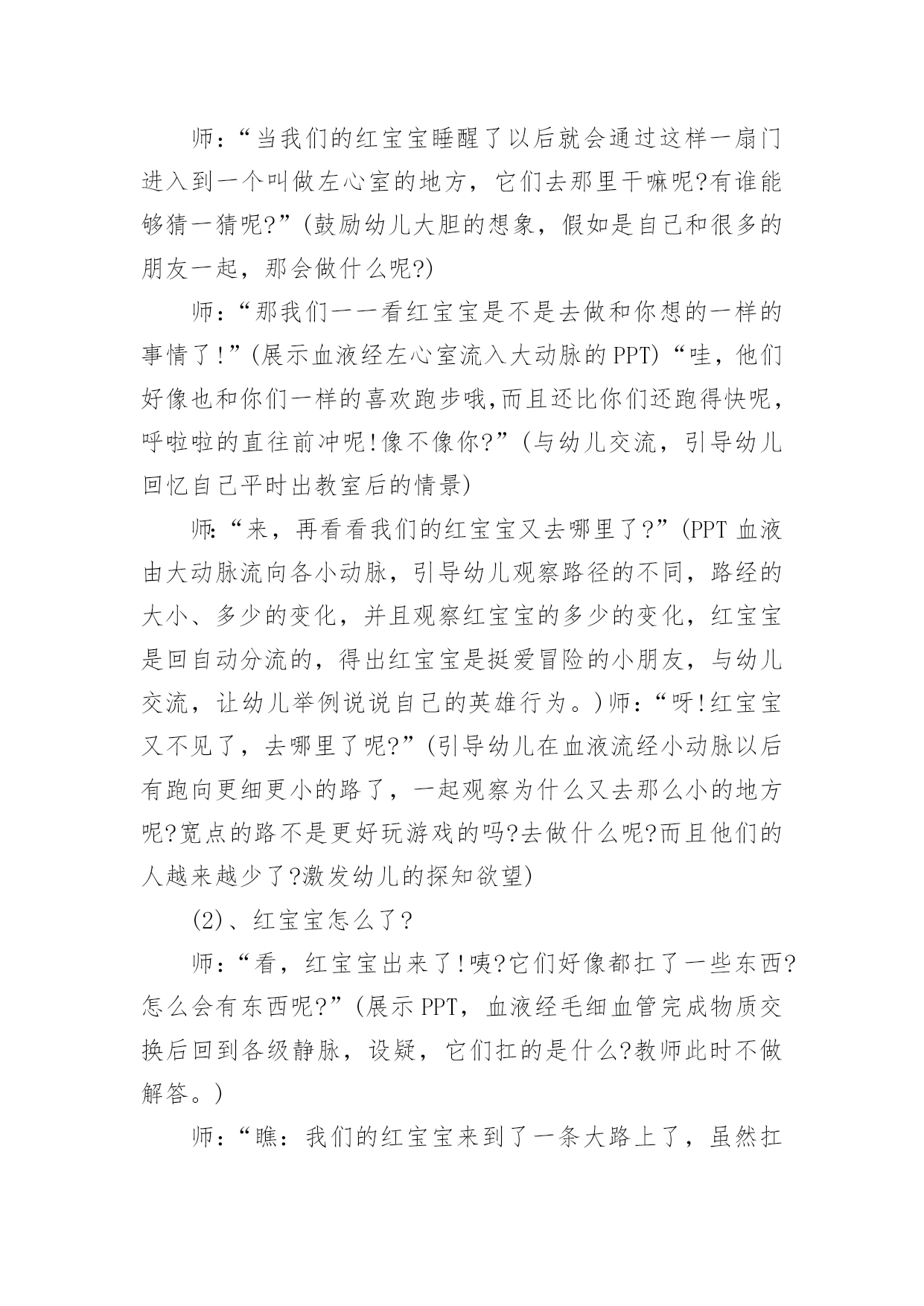 大班健康教案大班健康教案范文集合六篇作为一名默默奉献的教育工作者,时常会需要准备好教案,借助教案可以让教学工作更科学化。教案应该怎么写呢?以下是小编帮大家整理的大班健康教案6篇,仅供参考,希望能够帮助到大家。大班健康教案篇1目标:1.迁移已有经验进行充分的想象,并能够大胆表现自己的设想。2.尝试运用遮挡的方法处理较为复杂的画面。3.体验解决问题后的成就感和快乐。准备:纸和记号笔。过程:1.设置问题情景,充分引导幼儿想象。教师:小老鼠肚子饿了,想找东西吃。忽然它闻到了一股油的香味。它来到近处一看,哇!好大的一个油瓶呀!小老鼠想,我怎么才能喝到这香喷喷的油呢?请你们帮小老鼠想个办法,可以借助什么工具呢?什么办法最好?怎样做又快又好?2.通过讨论明确构图中可能出现的问题,尝试运用重叠的方法。教师:怎样表现许多小老鼠和一个大油瓶?怎样安排画面才显得丰富而不杂乱?用什么办法表现很多只老鼠?3、引导幼儿积极地迁移已有经验,表现丰富的画面。鼓励幼儿在创作中较为主动地表现自己的想法。提醒幼儿运用遮挡的方法表现物体和动物的'前后关系。4、展示幼儿交流幼儿的作品。教师:小老鼠是怎样偷到大油瓶中的油的?你是怎么画的?大班健康教案篇2活动目标:1、了解与他人友好交往方法。(重点)2、懂得谦让、理解他人,会给自己带来快乐。(难点)活动准备:1、PPT:心情播报员、壮壮和小朋友。2、音乐:快乐颂、快乐拍手歌。3、心情卡3张,记录纸和笔。活动过程:一、创设情境、体验情绪(一)、律动:《快乐颂》(二)、心情预报观看心情预报——PPT(三)、猜一猜心情不好的原因提问:晴天代表什么样的心情?阴天代表什么样的心情?猜一猜壮壮为什么会心情不好?重点引导幼儿根据自己的已有经验讲述心情不好的原因。(四)、观看——PPT《壮壮和小朋友》,了解壮壮阴天心情的原因1、提问:壮壮为什么心情不好?小朋友为什么都不理他了?2、帮助壮壮想想办法,他应该怎样做才能让小朋友重新喜欢他?3、我们帮助壮壮解决了问题,看看壮壮现在的心情是怎样?(播放PPT心情预报员)4、讨论:生活中你游戏的时侯,如果你想玩别人的玩具,应该怎么办?5、教师小结:大家一起玩的时候要学会谦让、等待、协商、合作,这样别人才会喜欢和你做朋友,朋友多了你才会更快乐。二、寻找快乐的'办法,并体验快乐。1、师:这里有3位小朋友,他们的心情是怎样的?心情为什么是阴天呢?他们遇到了什么事情?2、分组讨论并记录调节心情的方法。(站排头、想看同一本书、别人说我画的画不好看)教师重点引导幼儿想出调节心情的方法并进行记录。3、结束活动:音乐《快乐拍手歌》其实让我们快乐的方法还有很多,比如唱歌、跳舞、跑步、吃好吃的食物、看电视、散步等都会让我们的心情好起来!让我们一起来跳支舞吧!大班健康教案篇3设计思路:大地震牵动了全社会人的心。最近,灾后的心理辅导和治疗成了社会关注的热点。镜头中,许多原本活泼的孩子变得敏感而脆弱。这也引起了我的思考。我们的孩子在重重关爱下,经历的挫折少,得到的呵护多。尤其是独生子女,在心理发展过程中对遇到的问题往往缺乏交流的对象,更缺乏自我调节的能力。而校园安全月活动等又让我们更多地关注到孩子的安全、健康,尤其是心理健康问题。本次活动提出了“害怕”这样一个话题,让幼儿通过理解害怕,诉说害怕和对付害怕,帮助幼儿正确面对自己的恐惧心理,并寻求一些适当的方法。临近毕业,幼儿在进入小学后,如何以健康的心态面对自己遇到的挫折和困难,这对幼儿终生发展来说,将会是十分有益的经验。活动目标:1、知道每个人都会有不一样的害怕,能面对自己的害怕,并大胆地讲述。2、初步了解一些对付害怕的好办法。活动准备:PPT、大张的纸、各色花瓣若干活动过程:1、看看议议:(理解人的害怕是有原因的)放PPT:这是一位来自四川灾区的小朋友,很长时间以来,都没有人听见她说过话。重点提问:周围人说她是个小哑巴,你觉得呢?(听一听她的心里话:诉说自己的害怕。)她为什么不说话?她在害怕什么?小结:每个人在经历了一些事情之后,都会产生一些害怕的想法。2、大胆诉说:(能勇敢地说出自己心里的害怕)过渡语:每个人的经历不同,就会有不一样的害怕。重点提问:你有害怕的事情吗?你最害怕的`是什么?为什么?(教师即时以简笔画记录幼儿不同的害怕。)小结:有的人害怕特别的东西,有的人害怕特别的事情。今天,我们把心里N个害怕说了出来。3、交流讨论:(初步了解一些对付害怕的简单方法)过渡语:想不想把这些可恶的害怕对付掉?(恭喜你们,要知道,你们已经把自己心里的害怕说了出来,这就是对付害怕的第一个好办法。)重点提问:对于这么多不一样的害怕,你还有什么好办法吗?(教师根据幼儿回答逐一提升,并用一片花瓣表示一种办法:有些害怕,随着你慢慢长大,就会慢慢消失;有些害怕……)小结:相信你们的好办法