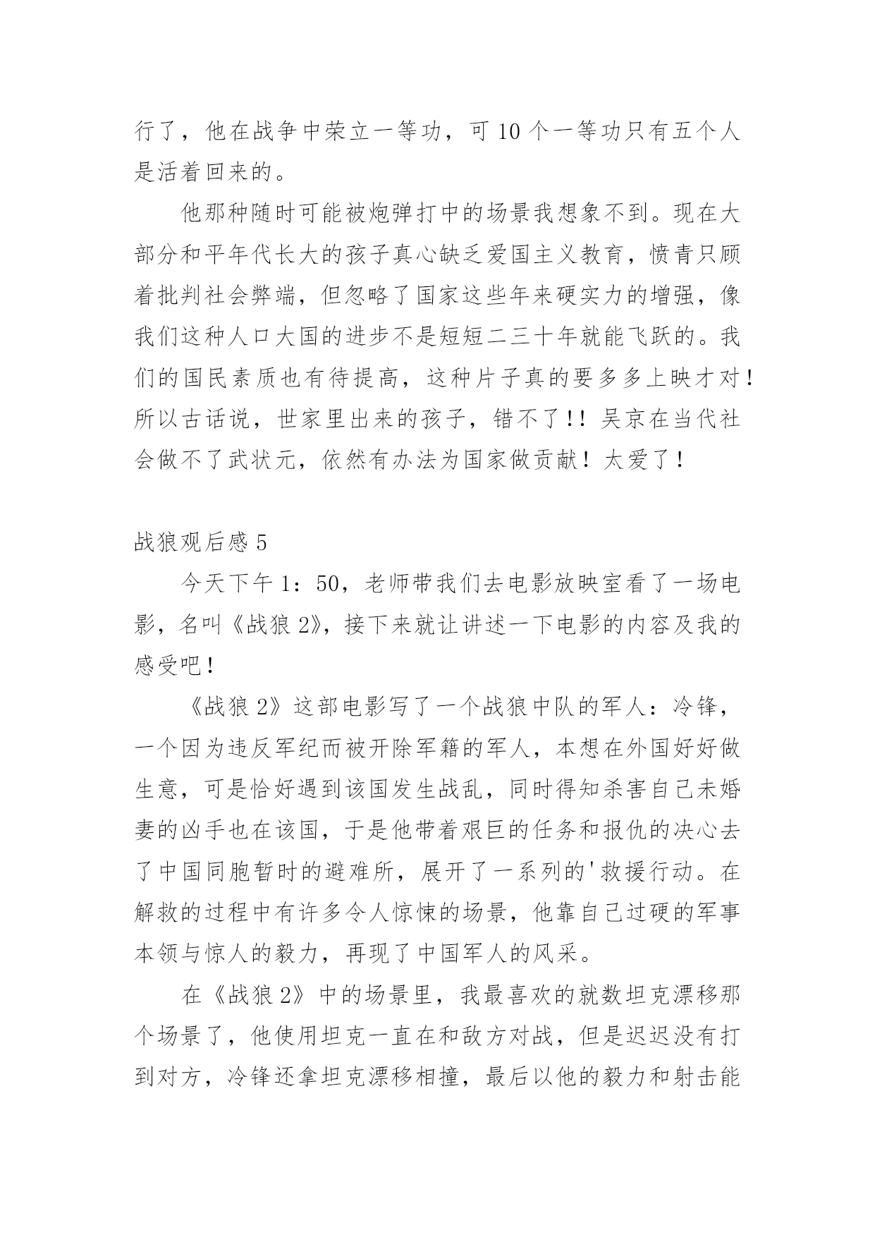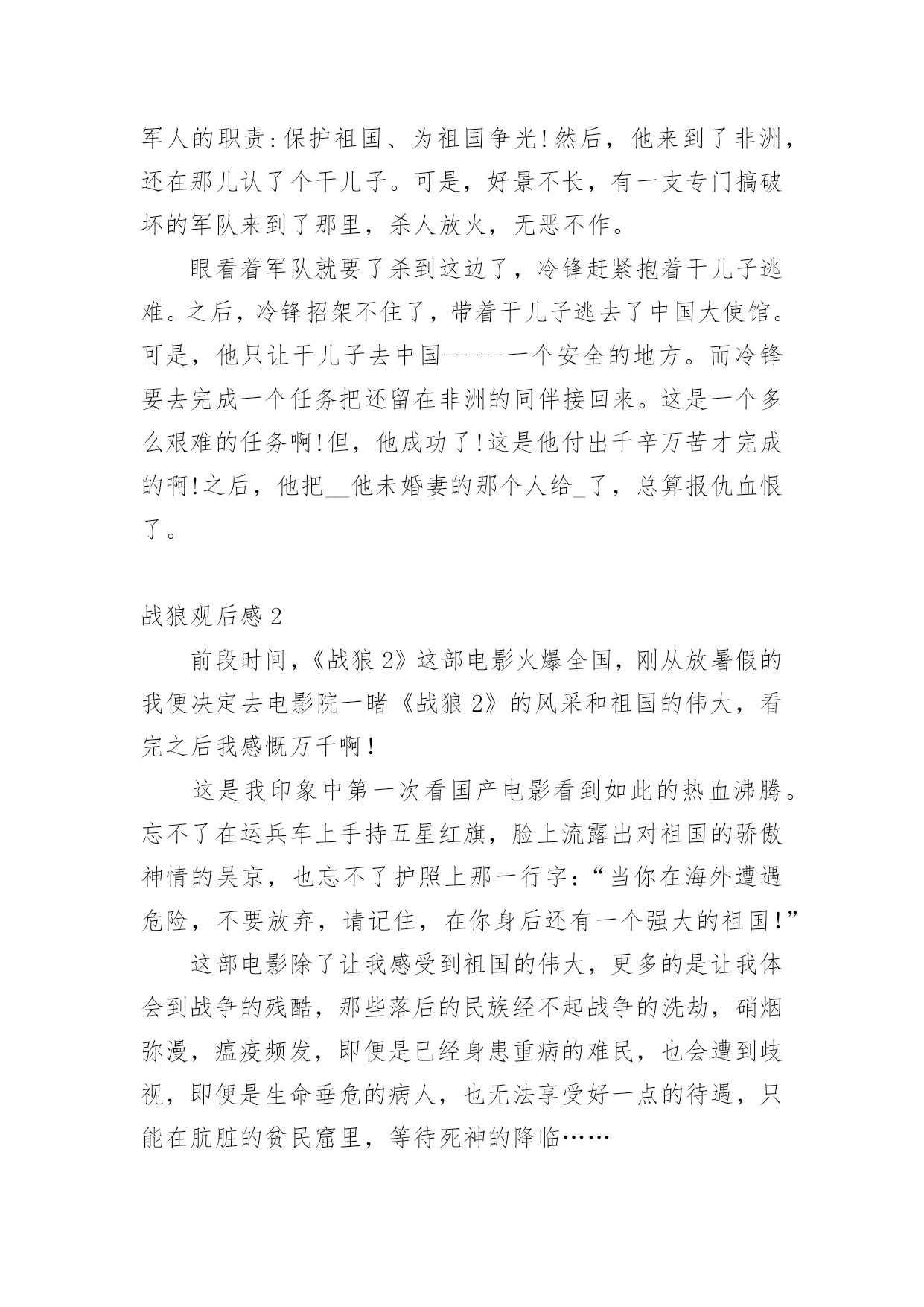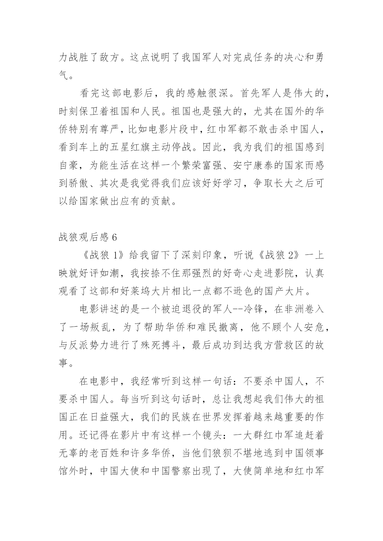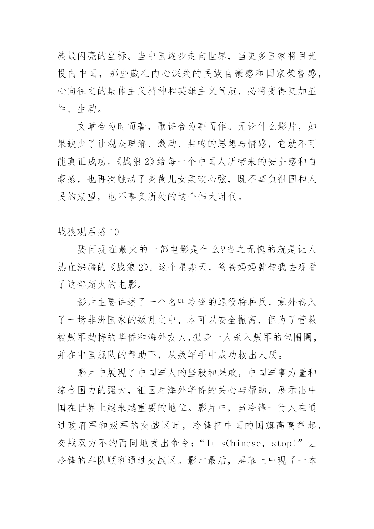 战狼观后感战狼观后感通用15篇认真看完一部作品以后,相信大家有很多值得分享的东西吧,这时候最关键的观后感不能忘了。那么你真的懂得怎么写观后感吗?以下是小编为大家收集的战狼观后感,供大家参考借鉴,希望可以帮助到有需要的朋友。战狼观后感1又是一个阳光明媚的星期六,我被妈妈硬拖着来到了电影院,说什么要让我感受一下那些爱国主义者的艰辛,还要我学一下他们。我的心是叫那个不愿意啊!可妈妈就是妈妈,没等我说完就把我拽进了《战狼2》的电影场。我不情愿地坐下,开始观看起这部光听名字就够可怕了的电影。什……什么我之前的想法错了!看完了这场电影,我惊讶极了,在心里狠狠打击了一开始的想法。开始对这部电影产生了敬佩之情。这是怎样了听我慢慢道来吧!这部电影讲述了主人公冷锋为报仇雪恨和一位军人、一个国家的尊严而引起一波波战争,还勇往直前、毫不畏惧、全力以赴,最终,不仅仅取得了人民的信任、取得了胜利,还如愿以偿的报仇雪恨了,但自我却受了重伤。这样一个感人的故事。首先,他因为杀人脱下了军服。但他还是坚守着一个做军人的职责:保护祖国、为祖国争光!然后,他来到了非洲,还在那儿认了个干儿子。可是,好景不长,有一支专门搞破坏的军队来到了那里,杀人放火,无恶不作。眼看着军队就要了杀到这边了,冷锋赶紧抱着干儿子逃难。之后,冷锋招架不住了,带着干儿子逃去了中国大使馆。可是,他只让干儿子去中国-----一个安全的地方。而冷锋要去完成一个任务把还留在非洲的同伴接回来。这是一个多么艰难的任务啊!但,他成功了!这是他付出千辛万苦才完成的啊!之后,他把__他未婚妻的那个人给_了,总算报仇血恨了。战狼观后感2前段时间,《战狼2》这部电影火爆全国,刚从放暑假的我便决定去电影院一睹《战狼2》的风采和祖国的伟大,看完之后我感慨万千啊!这是我印象中第一次看国产电影看到如此的热血沸腾。忘不了在运兵车上手持五星红旗,脸上流露出对祖国的骄傲神情的吴京,也忘不了护照上那一行字:“当你在海外遭遇危险,不要放弃,请记住,在你身后还有一个强大的祖国!”这部电影除了让我感受到祖国的伟大,更多的是让我体会到战争的残酷,那些落后的民族经不起战争的洗劫,硝烟弥漫,瘟疫频发,即便是已经身患重病的难民,也会遭到歧视,即便是生命垂危的病人,也无法享受好一点的待遇,只能在肮脏的贫民窟里,等待死神的降临……温馨的亲情始终盖不住战争的影子,上一秒的嬉戏打闹,可能在下一刻就会化为泡影,生灵涂炭。曾经的幸福家园可能顷刻间就会灰飞烟灭,妻离子散。炽热的爱情始终挡不住战争的冷酷,一对甜蜜的爱人被拆散,可能,永远也无法再见面。战争很残酷,生活在和平年代的我们更应该珍惜现在的美好生活,也许那些处于战争中的国家里的无辜平民,盼望一世也盼不来我们这样美好的生活了。《战狼2》的确是一部非常优秀的电影,电影为我们展现了祖国的伟大和战争的残酷,值得一看哦!战狼观后感3我骄傲,我是中国人今天在电视上看了一部电影,叫《战狼2》。看了之后受益匪浅,让我为自己是中国人而感到自豪。接下来,我给大家介绍一下这部电影。这部电影讲述了一个叫冷锋的解放军战士的故事,他也是这部电影的主人公。冷峰想为心爱的女人龙啸云报仇,于是放弃了当兵的梦想,脱下了自己喜欢的军装。冷峰来到非洲,却没有想到非洲被红楼袭击,但冷峰并不害怕。而是带着一些中国人来到中国大使馆,才得以逃脱。但是,为了给陈医生和学院的47名中国同胞写一篇医学作文,他们不得不完成自己的任务,于是回到战场上做支援工作。这部电影的高潮令人恐惧。在生命的生命危在旦夕的紧要关头,中国军队来了!所有人都得救了。《战狼2》向我展示了冷锋的爱国精神和永不放弃的勇气。他的精神让我值得学习。我永远忘不了这句话:一天狼勇士,一辈子狼勇士!为了国家,为了人民,狼是最后一个坚持的!所有中华人民共和国公民一定要记住:当你在海外遇到危险时,不要放弃。请记住,你的身后有一个强大的祖国。我骄傲,我是中国人!战狼观后感4到现在都睡不着一直想着这个片子战狼真的是很多年没见过的很棒的片子。本来只是觉得老公会喜欢这种武打片才去看的,没想到会这么好!剧情紧凑不拖沓,一直在进行中,基本没有浪费时间在儿女私情上。我最喜欢的就是没有像美国大片里把拯救全人类为己任一样把拯救中国人民基因作为重点,而是让男主无意发现敌人身份而抓住敌人。没有能拯救人类的英雄,只需要踏踏实实把自己的任务做好的人!作为军人可以同归于尽般的去守卫国家每一寸领土,即使那里没有人烟也没人会去,但只要在国境线内,就无人可以侵犯!真的好爱这个主题,比那些抗日剧战争片强太多了!也许因为我爸爸是一名上过战场的老兵,我弟弟现在也在军校读书,之后也回去到部队的缘故,我们家人从小就对军人有着感情。我看过我爸的一份报告演讲,短短两页纸哭的都不行了,他在战争中荣立一等功,可10个一等功只有五个人是活着回来的。