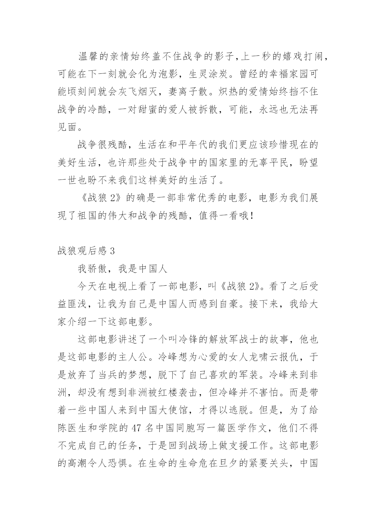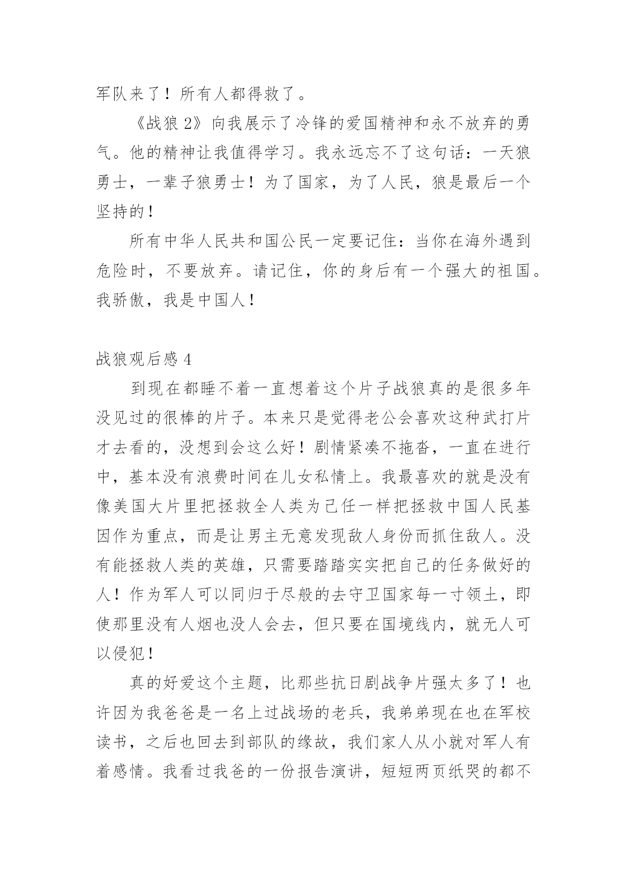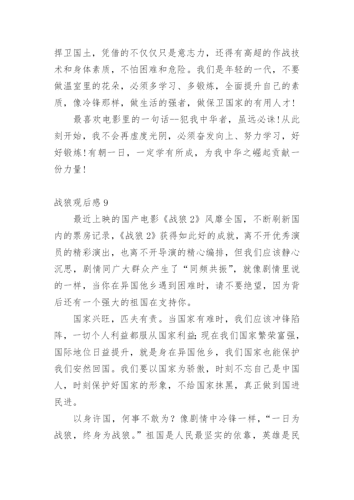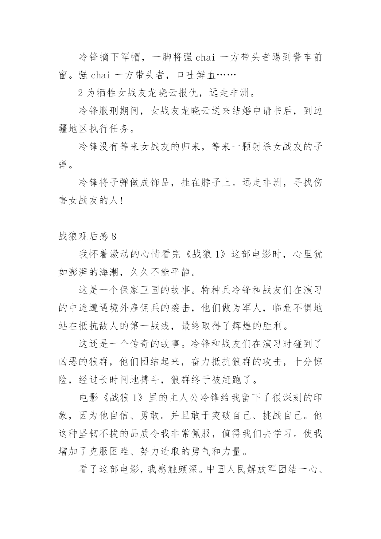 战狼观后感战狼观后感通用15篇认真看完一部作品以后,相信大家有很多值得分享的东西吧,这时候最关键的观后感不能忘了。那么你真的懂得怎么写观后感吗?以下是小编为大家收集的战狼观后感,供大家参考借鉴,希望可以帮助到有需要的朋友。战狼观后感1又是一个阳光明媚的星期六,我被妈妈硬拖着来到了电影院,说什么要让我感受一下那些爱国主义者的艰辛,还要我学一下他们。我的心是叫那个不愿意啊!可妈妈就是妈妈,没等我说完就把我拽进了《战狼2》的电影场。我不情愿地坐下,开始观看起这部光听名字就够可怕了的电影。什……什么我之前的想法错了!看完了这场电影,我惊讶极了,在心里狠狠打击了一开始的想法。开始对这部电影产生了敬佩之情。这是怎样了听我慢慢道来吧!这部电影讲述了主人公冷锋为报仇雪恨和一位军人、一个国家的尊严而引起一波波战争,还勇往直前、毫不畏惧、全力以赴,最终,不仅仅取得了人民的信任、取得了胜利,还如愿以偿的报仇雪恨了,但自我却受了重伤。这样一个感人的故事。首先,他因为杀人脱下了军服。但他还是坚守着一个做军人的职责:保护祖国、为祖国争光!然后,他来到了非洲,还在那儿认了个干儿子。可是,好景不长,有一支专门搞破坏的军队来到了那里,杀人放火,无恶不作。眼看着军队就要了杀到这边了,冷锋赶紧抱着干儿子逃难。之后,冷锋招架不住了,带着干儿子逃去了中国大使馆。可是,他只让干儿子去中国-----一个安全的地方。而冷锋要去完成一个任务把还留在非洲的同伴接回来。这是一个多么艰难的任务啊!但,他成功了!这是他付出千辛万苦才完成的啊!之后,他把__他未婚妻的那个人给_了,总算报仇血恨了。战狼观后感2前段时间,《战狼2》这部电影火爆全国,刚从放暑假的我便决定去电影院一睹《战狼2》的风采和祖国的伟大,看完之后我感慨万千啊!这是我印象中第一次看国产电影看到如此的热血沸腾。忘不了在运兵车上手持五星红旗,脸上流露出对祖国的骄傲神情的吴京,也忘不了护照上那一行字:“当你在海外遭遇危险,不要放弃,请记住,在你身后还有一个强大的祖国!”这部电影除了让我感受到祖国的伟大,更多的是让我体会到战争的残酷,那些落后的民族经不起战争的洗劫,硝烟弥漫,瘟疫频发,即便是已经身患重病的难民,也会遭到歧视,即便是生命垂危的病人,也无法享受好一点的待遇,只能在肮脏的贫民窟里,等待死神的降临……温馨的亲情始终盖不住战争的影子,上一秒的嬉戏打闹,可能在下一刻就会化为泡影,生灵涂炭。曾经的幸福家园可能顷刻间就会灰飞烟灭,妻离子散。炽热的爱情始终挡不住战争的冷酷,一对甜蜜的爱人被拆散,可能,永远也无法再见面。战争很残酷,生活在和平年代的我们更应该珍惜现在的美好生活,也许那些处于战争中的国家里的无辜平民,盼望一世也盼不来我们这样美好的生活了。《战狼2》的确是一部非常优秀的电影,电影为我们展现了祖国的伟大和战争的残酷,值得一看哦!战狼观后感3我骄傲,我是中国人今天在电视上看了一部电影,叫《战狼2》。看了之后受益匪浅,让我为自己是中国人而感到自豪。接下来,我给大家介绍一下这部电影。这部电影讲述了一个叫冷锋的解放军战士的故事,他也是这部电影的主人公。冷峰想为心爱的女人龙啸云报仇,于是放弃了当兵的梦想,脱下了自己喜欢的军装。冷峰来到非洲,却没有想到非洲被红楼袭击,但冷峰并不害怕。而是带着一些中国人来到中国大使馆,才得以逃脱。但是,为了给陈医生和学院的47名中国同胞写一篇医学作文,他们不得不完成自己的任务,于是回到战场上做支援工作。这部电影的高潮令人恐惧。在生命的生命危在旦夕的紧要关头,中国军队来了!所有人都得救了。《战狼2》向我展示了冷锋的爱国精神和永不放弃的勇气。他的精神让我值得学习。我永远忘不了这句话:一天狼勇士,一辈子狼勇士!为了国家,为了人民,狼是最后一个坚持的!所有中华人民共和国公民一定要记住:当你在海外遇到危险时,不要放弃。请记住,你的身后有一个强大的祖国。我骄傲,我是中国人!战狼观后感4到现在都睡不着一直想着这个片子战狼真的是很多年没见过的很棒的片子。本来只是觉得老公会喜欢这种武打片才去看的,没想到会这么好!剧情紧凑不拖沓,一直在进行中,基本没有浪费时间在儿女私情上。我最喜欢的就是没有像美国大片里把拯救全人类为己任一样把拯救中国人民基因作为重点,而是让男主无意发现敌人身份而抓住敌人。没有能拯救人类的英雄,只需要踏踏实实把自己的任务做好的人!作为军人可以同归于尽般的去守卫国家每一寸领土,即使那里没有人烟也没人会去,但只要在国境线内,就无人可以侵犯!真的好爱这个主题,比那些抗日剧战争片强太多了!也许因为我爸爸是一名上过战场的老兵,我弟弟现在也在军校读书,之后也回去到部队的缘故,我们家人从小就对军人有着感情。我看过我爸的一份报告演讲,短短两页纸哭的都不行了,他在战争中荣立一等功,可10个一等功只有五个人是活着回来的。