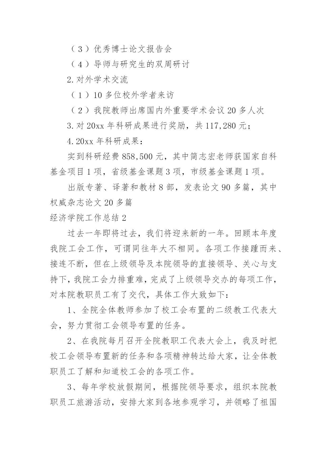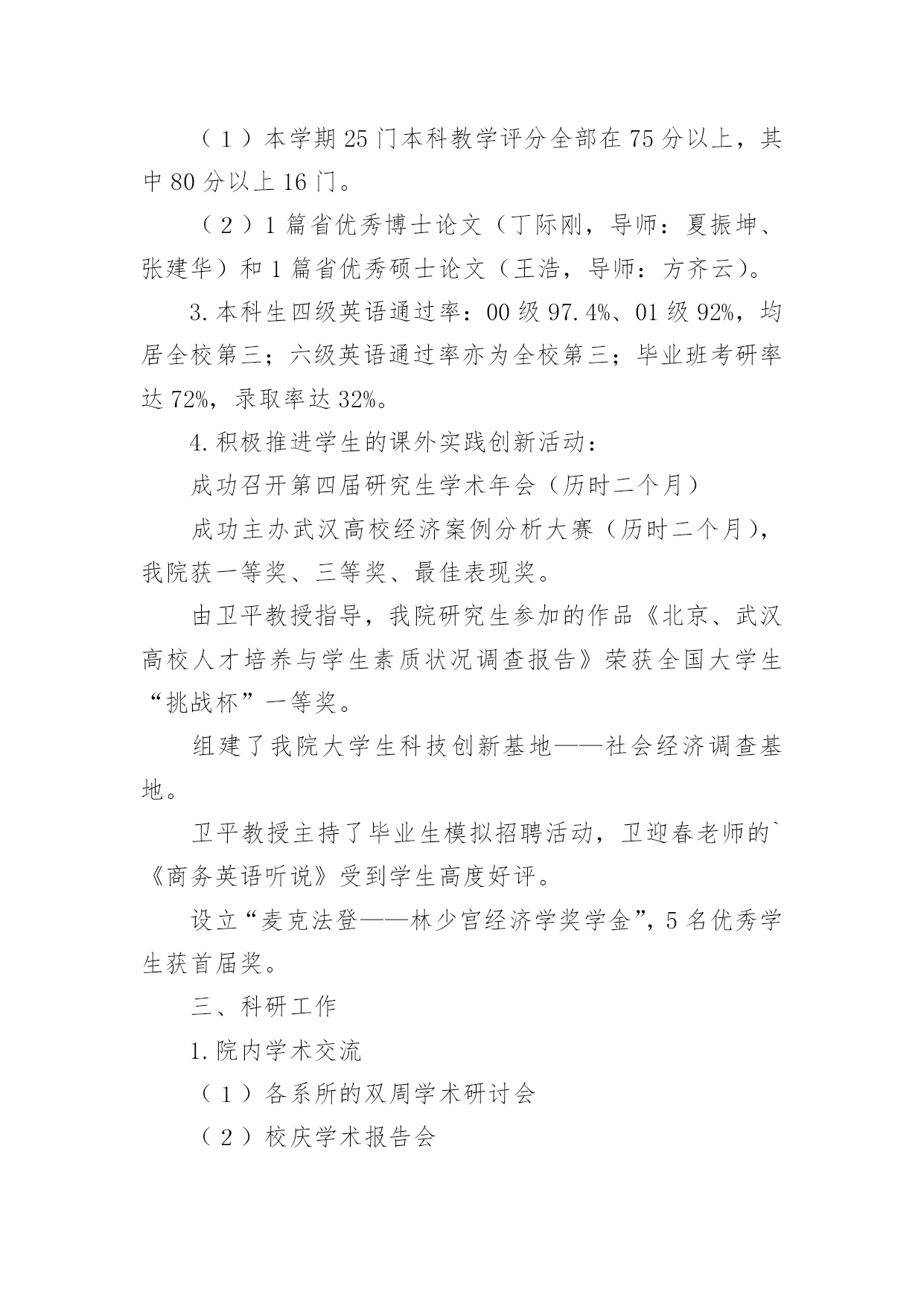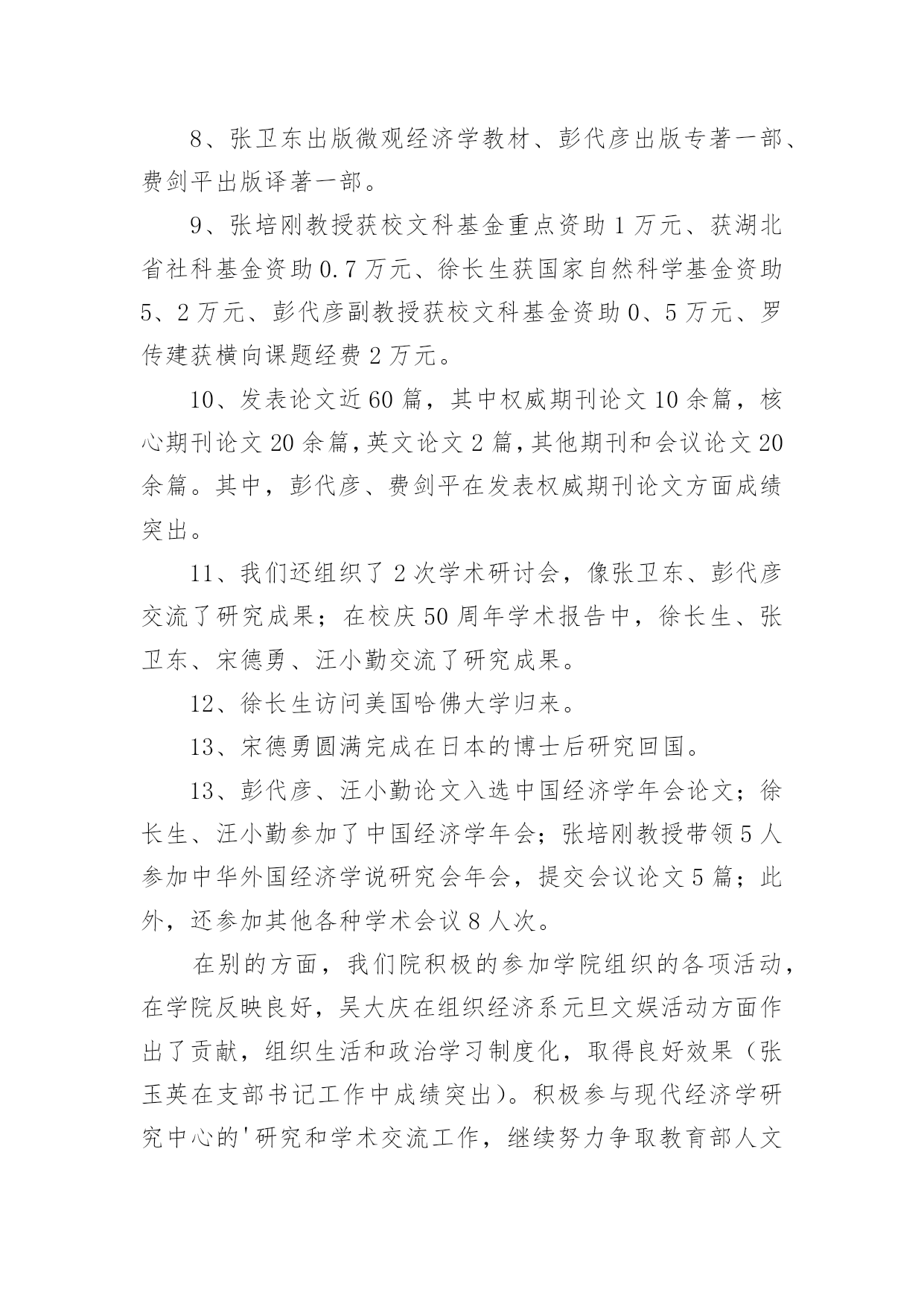 经济学院工作总结经济学院工作总结总结是对某一特定时间段内的学习和工作生活等表现情况加以回顾和分析的一种书面材料,它能使我们及时找出错误并改正,不妨让我们认真地完成总结吧。但是总结有什么要求呢?以下是小编帮大家整理的经济学院工作总结,欢迎大家借鉴与参考,希望对大家有所帮助。经济学院工作总结1一、学科建设1.数量经济学博士点申报成功2.理论经济学博士后流动站申报成功3.西方经济学被评为省重点学科4.增设世界经济硕士点和金融工程本科专业5.“现代经济学研究中心”申报教育部人文社科重点研究基地6.制订了《经济学院发展规划及实施措施》(20xx-2005年)二、教学工作1.修订完善了本科教学计划和课程体系,通过招聘增补了部分课程的任课教师。2.本科教学质量和研究生论文质量明显提高。(1)本学期25门本科教学评分全部在75分以上,其中80分以上16门。(2)1篇省优秀博士论文(丁际刚,导师:夏振坤、张建华)和1篇省优秀硕士论文(王浩,导师:方齐云)。3.本科生四级英语通过率:00级97.4%、01级92%,均居全校第三;六级英语通过率亦为全校第三;毕业班考研率达72%,录取率达32%。4.积极推进学生的课外实践创新活动:成功召开第四届研究生学术年会(历时二个月)成功主办武汉高校经济案例分析大赛(历时二个月),我院获一等奖、三等奖、最佳表现奖。由卫平教授指导,我院研究生参加的作品《北京、武汉高校人才培养与学生素质状况调查报告》荣获全国大学生“挑战杯”一等奖。组建了我院大学生科技创新基地——社会经济调查基地。卫平教授主持了毕业生模拟招聘活动,卫迎春老师的`《商务英语听说》受到学生高度好评。设立“麦克法登——林少宫经济学奖学金”,5名优秀学生获首届奖。三、科研工作1.院内学术交流(1)各系所的双周学术研讨会(2)校庆学术报告会(3)优秀博士论文报告会(4)导师与研究生的双周研讨2.对外学术交流(1)10多位校外学者来访(2)我院教师出席国内外重要学术会议20多人次3.对20xx年科研成果进行奖励,共117,280元;4.20xx年科研成果:实到科研经费858,500元,其中简志宏老师获国家自科基金项目1项,省级基金课题3项,市级基金课题1项。出版专著、译著和教材8部,发表论文90多篇,其中权威杂志论文20多篇经济学院工作总结2过去一年即将过去,我们将迎来新的一年。回顾本年度我院工会工作,可谓同往年大不相同。各项工作接踵而来、接连不断,但在上级领导及本院领导的直接领导、关心与支持下,我院工会力排重难,完成了上级领导交办的每项工作,对本院教职员工有了交代,具体工作大致如下:1、全院全体教师参加了校工会布置的二级教工代表大会,努力贯彻工会领导布置的任务。2、在我院每月召开全院教职工代表大会上,我及时把校工会领导布置新的任务和各项精神转达给大家,让全体教职员工了解和知道校工会的各项工作。3、每年学校放假期间,根据院领导要求,组织本院教职员工旅游活动,安排大家到各地参观学习,并领略了祖国的大好风光。4、在安排好学院工作后,积极并认真参加了校工会安排的各类学习班及活动。5、今年春节、重阳节、教师节按照校工会的精神,主动和院领导一起上门访问退休教师,向前辈们介绍本院的各项工作,介绍校各项重大改革措施,问寒问暖,给他们关怀,让他们知道学校的每一项工作成绩都是少不了这些前辈的'一份功绩的。到了年底,我们又邀请了每位退休教师参加院新年联欢会,为了把联欢会搞得更隆重、气氛更活跃,我院工会在这方面作了大量前期准备工作。6、根据校工会布置的任务,组织并安排了教职工参与校级各方面的先进评选。7、不论是院里的在编教职工还是离退休的老教师,只要家庭生活有困难或者生病住院,我院工会都能做到了如指掌,关心备至。并根据实际情况给与经济上慰问,让广大教职工充分感受到工会无微不至的关怀。8、从思想上、工作上、生活上关心青年教师,热心帮助他们解决困难,组织他们参加工会活动,关心集体。9、尽管学院教学繁重,但为了配合校工会工作,积极安排青年教师参加写工会论文及师德二三事感想。以上是我院工会这一年里主要的工作。由于工会工作的复杂、繁琐,因此有些工作还未完全做到最好,今后为了学院的工会工作,我们会更加努力。同时,也希望校工会及院领导给与更大的关心、支持。经济学院工作总结320xx年6月,上海XX大学经济学院培训中心对外培训工作比5月份呈上升趋势,共举办了来自全国各地机关单位、银行金融机构委托的短期培训班8期。下旬,培训工作尤为繁忙,21日至30日就成功举办了5个培训班,培训领导干部近三百名。中心根据委托单位培训目的以及教学资源,为各个培训班量身安排课程。为同时做好多个培训班工作,培训中心提前谋划,组织多名专家精心设计制定培训方案,把每一个班的食、宿、学等所有细节都做好安排,并派出多位资深班