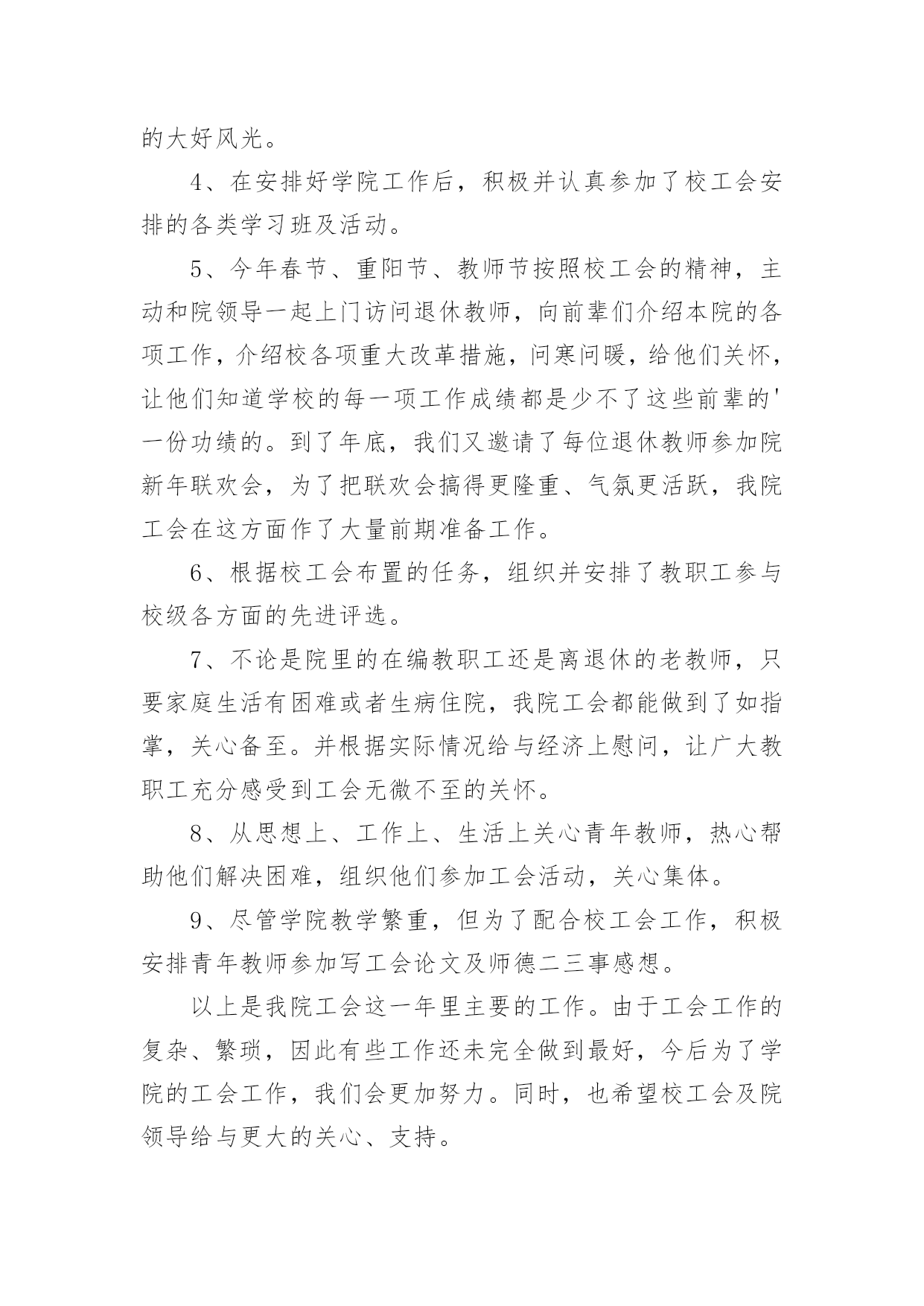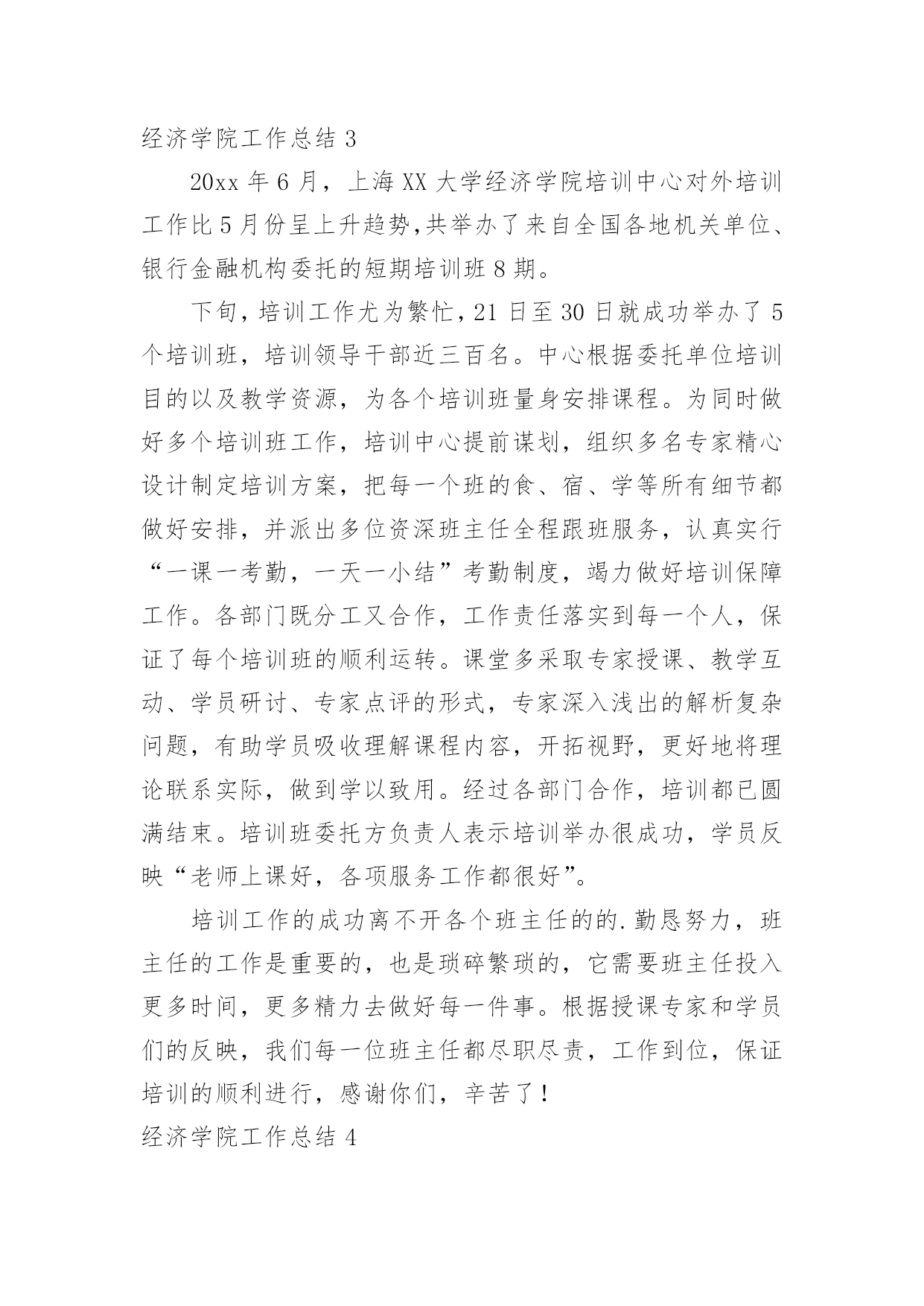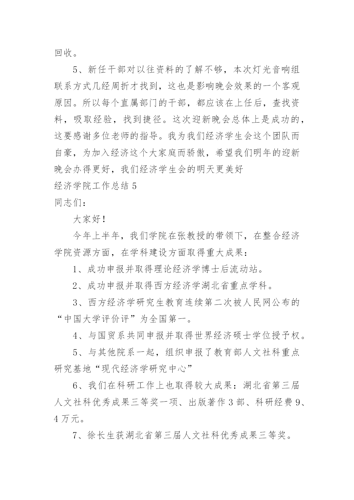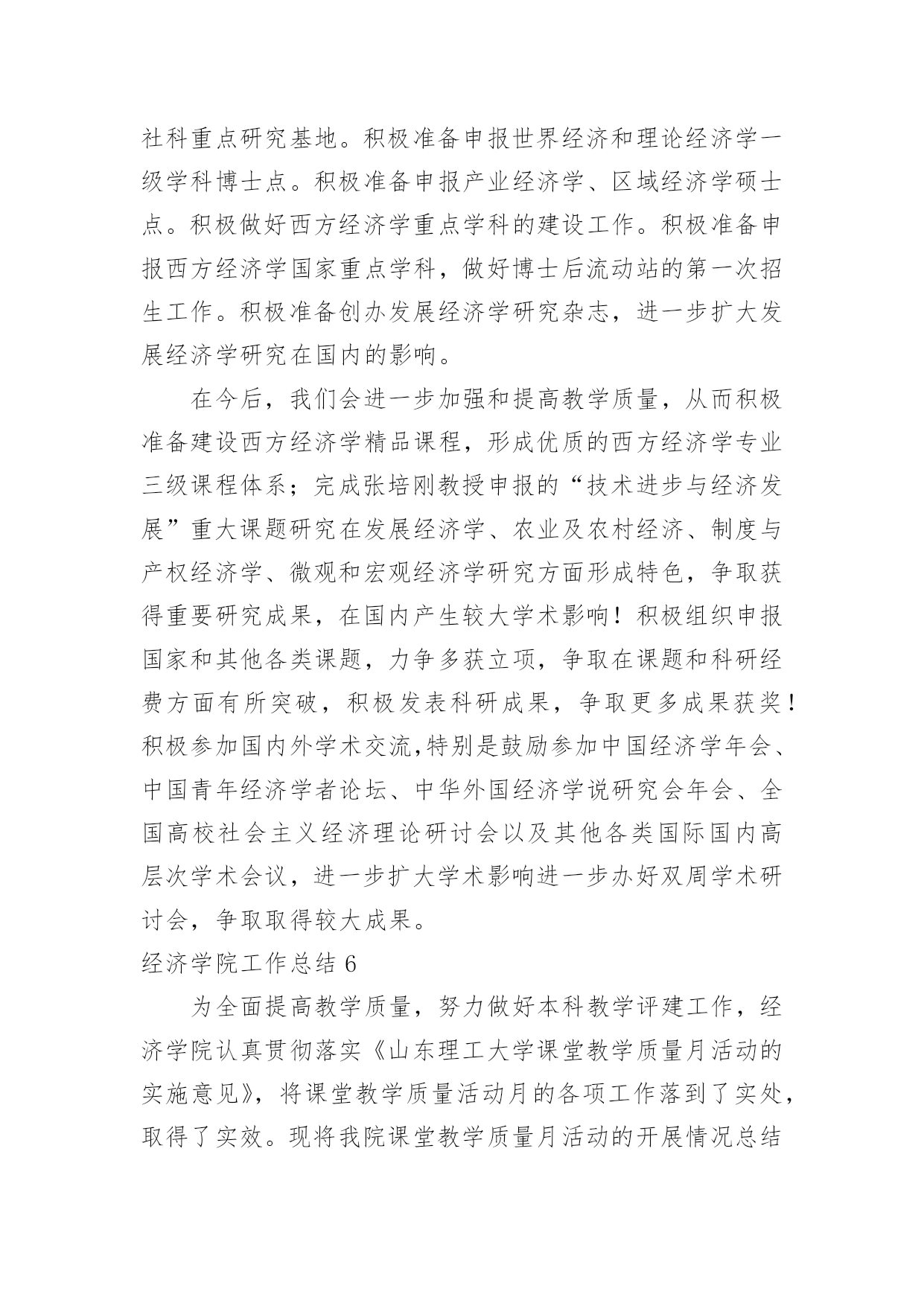 经济学院工作总结经济学院工作总结总结是对某一特定时间段内的学习和工作生活等表现情况加以回顾和分析的一种书面材料,它能使我们及时找出错误并改正,不妨让我们认真地完成总结吧。但是总结有什么要求呢?以下是小编帮大家整理的经济学院工作总结,欢迎大家借鉴与参考,希望对大家有所帮助。经济学院工作总结1一、学科建设1.数量经济学博士点申报成功2.理论经济学博士后流动站申报成功3.西方经济学被评为省重点学科4.增设世界经济硕士点和金融工程本科专业5.“现代经济学研究中心”申报教育部人文社科重点研究基地6.制订了《经济学院发展规划及实施措施》(20xx-2005年)二、教学工作1.修订完善了本科教学计划和课程体系,通过招聘增补了部分课程的任课教师。2.本科教学质量和研究生论文质量明显提高。(1)本学期25门本科教学评分全部在75分以上,其中80分以上16门。(2)1篇省优秀博士论文(丁际刚,导师:夏振坤、张建华)和1篇省优秀硕士论文(王浩,导师:方齐云)。3.本科生四级英语通过率:00级97.4%、01级92%,均居全校第三;六级英语通过率亦为全校第三;毕业班考研率达72%,录取率达32%。4.积极推进学生的课外实践创新活动:成功召开第四届研究生学术年会(历时二个月)成功主办武汉高校经济案例分析大赛(历时二个月),我院获一等奖、三等奖、最佳表现奖。由卫平教授指导,我院研究生参加的作品《北京、武汉高校人才培养与学生素质状况调查报告》荣获全国大学生“挑战杯”一等奖。组建了我院大学生科技创新基地——社会经济调查基地。卫平教授主持了毕业生模拟招聘活动,卫迎春老师的`《商务英语听说》受到学生高度好评。设立“麦克法登——林少宫经济学奖学金”,5名优秀学生获首届奖。三、科研工作1.院内学术交流(1)各系所的双周学术研讨会(2)校庆学术报告会(3)优秀博士论文报告会(4)导师与研究生的双周研讨2.对外学术交流(1)10多位校外学者来访(2)我院教师出席国内外重要学术会议20多人次3.对20xx年科研成果进行奖励,共117,280元;4.20xx年科研成果:实到科研经费858,500元,其中简志宏老师获国家自科基金项目1项,省级基金课题3项,市级基金课题1项。出版专著、译著和教材8部,发表论文90多篇,其中权威杂志论文20多篇经济学院工作总结2过去一年即将过去,我们将迎来新的一年。回顾本年度我院工会工作,可谓同往年大不相同。各项工作接踵而来、接连不断,但在上级领导及本院领导的直接领导、关心与支持下,我院工会力排重难,完成了上级领导交办的每项工作,对本院教职员工有了交代,具体工作大致如下:1、全院全体教师参加了校工会布置的二级教工代表大会,努力贯彻工会领导布置的任务。2、在我院每月召开全院教职工代表大会上,我及时把校工会领导布置新的任务和各项精神转达给大家,让全体教职员工了解和知道校工会的各项工作。3、每年学校放假期间,根据院领导要求,组织本院教职员工旅游活动,安排大家到各地参观学习,并领略了祖国的大好风光。4、在安排好学院工作后,积极并认真参加了校工会安排的各类学习班及活动。5、今年春节、重阳节、教师节按照校工会的精神,主动和院领导一起上门访问退休教师,向前辈们介绍本院的各项工作,介绍校各项重大改革措施,问寒问暖,给他们关怀,让他们知道学校的每一项工作成绩都是少不了这些前辈的'一份功绩的。到了年底,我们又邀请了每位退休教师参加院新年联欢会,为了把联欢会搞得更隆重、气氛更活跃,我院工会在这方面作了大量前期准备工作。6、根据校工会布置的任务,组织并安排了教职工参与校级各方面的先进评选。7、不论是院里的在编教职工还是离退休的老教师,只要家庭生活有困难或者生病住院,我院工会都能做到了如指掌,关心备至。并根据实际情况给与经济上慰问,让广大教职工充分感受到工会无微不至的关怀。8、从思想上、工作上、生活上关心青年教师,热心帮助他们解决困难,组织他们参加工会活动,关心集体。9、尽管学院教学繁重,但为了配合校工会工作,积极安排青年教师参加写工会论文及师德二三事感想。以上是我院工会这一年里主要的工作。由于工会工作的复杂、繁琐,因此有些工作还未完全做到最好,今后为了学院的工会工作,我们会更加努力。同时,也希望校工会及院领导给与更大的关心、支持。经济学院工作总结320xx年6月,上海XX大学经济学院培训中心对外培训工作比5月份呈上升趋势,共举办了来自全国各地机关单位、银行金融机构委托的短期培训班8期。下旬,培训工作尤为繁忙,21日至30日就成功举办了5个培训班,培训领导干部近三百名。中心根据委托单位培训目的以及教学资源,为各个培训班量身安排课程。为同时做好多个培训班工作,培训中心提前谋划,组织多名专家精心设计制定培训方案,把每一个班的食、宿、学等所有细节都做好安排,并派出多位资深班