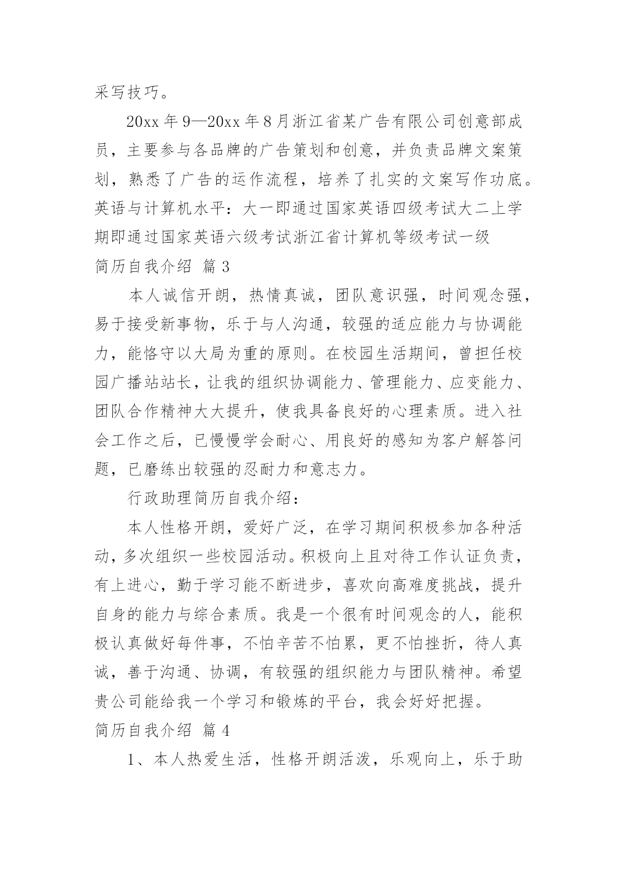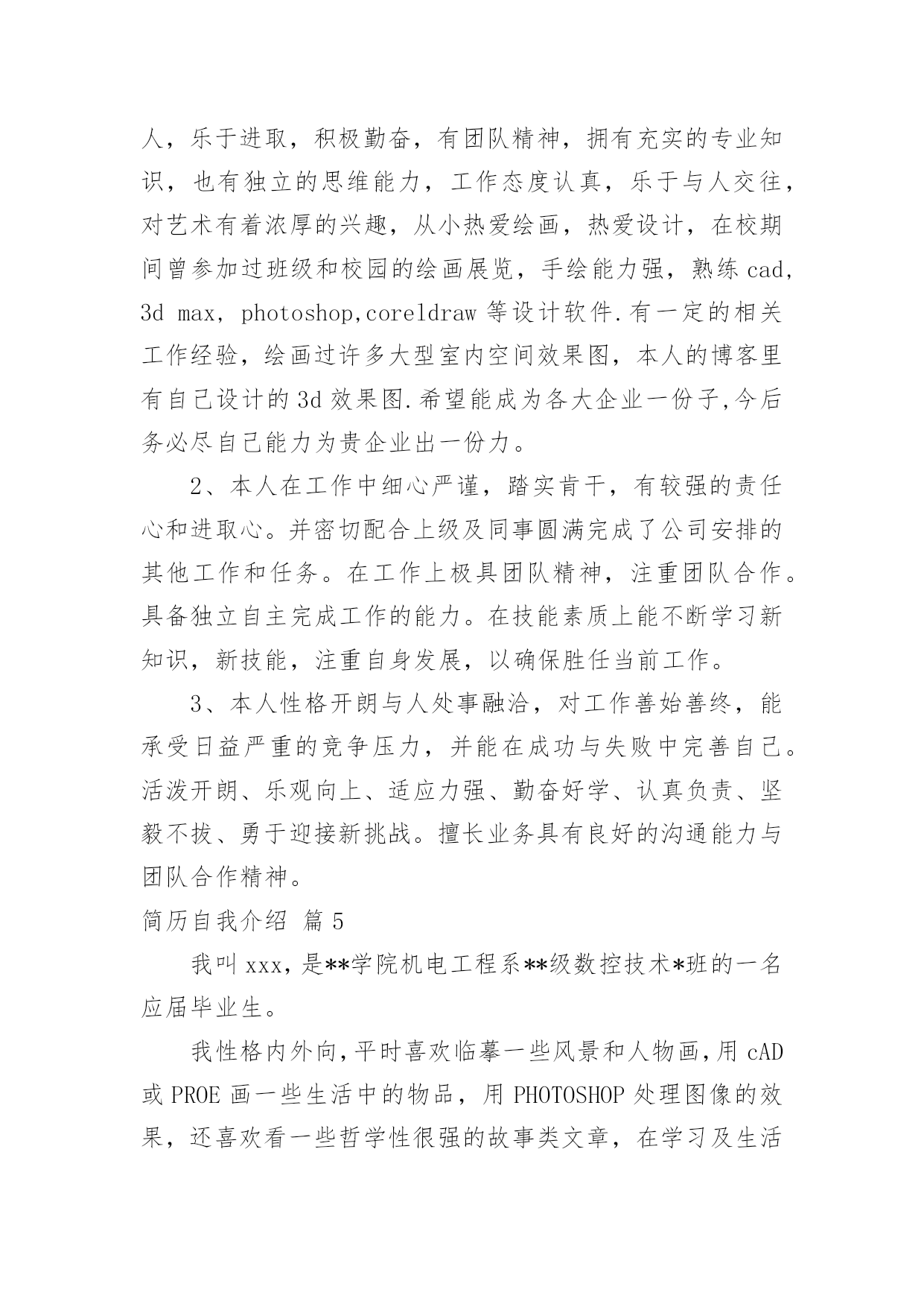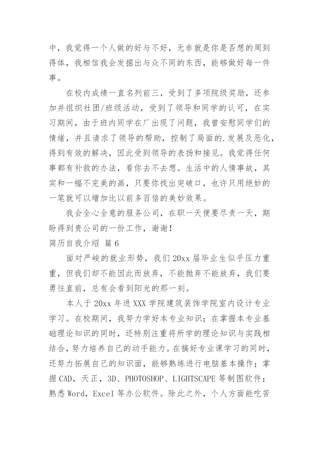 简历自我介绍关于简历自我介绍模板集锦6篇光阴如水,我们又将打开新的篇章,寻求新的工作机会,该为自己写一份简历了哦。那么优秀的简历都是怎么写的呢?以下是小编收集整理的简历自我介绍6篇,欢迎阅读与收藏。简历自我介绍篇1热情随和,活波开朗,具有进取精神和团队精神,有较强的动手能力。良好协调沟通能力,适应力强,反应快、积极、灵活,爱创新!提高自己,适应工作的需要。所以本人希望找一份与自身知识结构相关的工作,具有一定的社会交往能力,具有优秀的组织和协调能力。在学习中,本人注重理论与实践的结合,己具备了相当的实践操作能力。熟练操作计算机办公软件。很强的事业心和责任感使本人能够面对任何困难和挑战。简历自我介绍篇2姓名:王某某专业:广告学专业本科申请专业:公关关系专员工作经历:20xx年9月至今浙江省某著名传媒公司,担任采编部记者,主要采写该公司节目制作的报道,所写的文章被新浪等各大网站转载,通过实践,掌握了一定的新闻采写技巧。20xx年9—20xx年8月浙江省某广告有限公司创意部成员,主要参与各品牌的广告策划和创意,并负责品牌文案策划,熟悉了广告的运作流程,培养了扎实的文案写作功底。英语与计算机水平:大一即通过国家英语四级考试大二上学期即通过国家英语六级考试浙江省计算机等级考试一级简历自我介绍篇3本人诚信开朗,热情真诚,团队意识强,时间观念强,易于接受新事物,乐于与人沟通,较强的适应能力与协调能力,能恪守以大局为重的原则。在校园生活期间,曾担任校园广播站站长,让我的组织协调能力、管理能力、应变能力、团队合作精神大大提升,使我具备良好的心理素质。进入社会工作之后,已慢慢学会耐心、用良好的感知为客户解答问题,已磨练出较强的忍耐力和意志力。行政助理简历自我介绍:本人性格开朗,爱好广泛,在学习期间积极参加各种活动,多次组织一些校园活动。积极向上且对待工作认证负责,有上进心,勤于学习能不断进步,喜欢向高难度挑战,提升自身的能力与综合素质。我是一个很有时间观念的人,能积极认真做好每件事,不怕辛苦不怕累,更不怕挫折,待人真诚,善于沟通、协调,有较强的组织能力与团队精神。希望贵公司能给我一个学习和锻炼的平台,我会好好把握。简历自我介绍篇41、本人热爱生活,性格开朗活泼,乐观向上,乐于助人,乐于进取,积极勤奋,有团队精神,拥有充实的专业知识,也有独立的思维能力,工作态度认真,乐于与人交往,对艺术有着浓厚的兴趣,从小热爱绘画,热爱设计,在校期间曾参加过班级和校园的绘画展览,手绘能力强,熟练cad,3dmax,photoshop,coreldraw等设计软件.有一定的相关工作经验,绘画过许多大型室内空间效果图,本人的博客里有自己设计的3d效果图.希望能成为各大企业一份子,今后务必尽自己能力为贵企业出一份力。2、本人在工作中细心严谨,踏实肯干,有较强的责任心和进取心。并密切配合上级及同事圆满完成了公司安排的其他工作和任务。在工作上极具团队精神,注重团队合作。具备独立自主完成工作的能力。在技能素质上能不断学习新知识,新技能,注重自身发展,以确保胜任当前工作。3、本人性格开朗与人处事融洽,对工作善始善终,能承受日益严重的竞争压力,并能在成功与失败中完善自己。活泼开朗、乐观向上、适应力强、勤奋好学、认真负责、坚毅不拔、勇于迎接新挑战。擅长业务具有良好的沟通能力与团队合作精神。简历自我介绍篇5我叫xxx,是**学院机电工程系**级数控技术*班的一名应届毕业生。我性格内外向,平时喜欢临摹一些风景和人物画,用cAD或PROE画一些生活中的物品,用PHOTOSHOP处理图像的效果,还喜欢看一些哲学性很强的故事类文章,在学习及生活中,我觉得一个人做的好与不好,无非就是你是否想的周到得体,我相信我会发掘出与众不同的东西,能够做好每一件事。在校内成绩一直名列前三,受到了多项院级奖励,还参加并组织社团/班级活动,受到了领导和同学的认可,在实习期间,由于班内同学在厂出现了问题,我曾安慰同学们的情绪,并且请求了领导的帮助,控制了局面的.发展及恶化,得到有效的解决,因此受到领导的表扬和接见。我觉得任何事都有补救的办法,看你去不去想。生活中的人情事故,其实和一幅不完美的画,只要你找出突破口,也许只用绝妙的一笔就可以增加比以前多百倍的美妙效果。我会全心全意的服务公司,在职一天便要尽责一天,期盼得到贵公司的一份工作,谢谢!简历自我介绍篇6面对严峻的就业形势,我们20xx届毕业生似乎压力重重,但我们却不能因此而放弃,不能抛弃不能放弃,我们要勇往直前,总有会看到阳光的那一刻。本人于20xx年进XXX学院建筑装饰学院室内设计专业学习。在校期间,我努力学好本专业知识;在掌握本专业基础理论知识的同时,还特别注重将所学的理论知识与实践相结合,努力培养自己的动手能力。在搞好专业课学习的同时,还努力拓展自己的