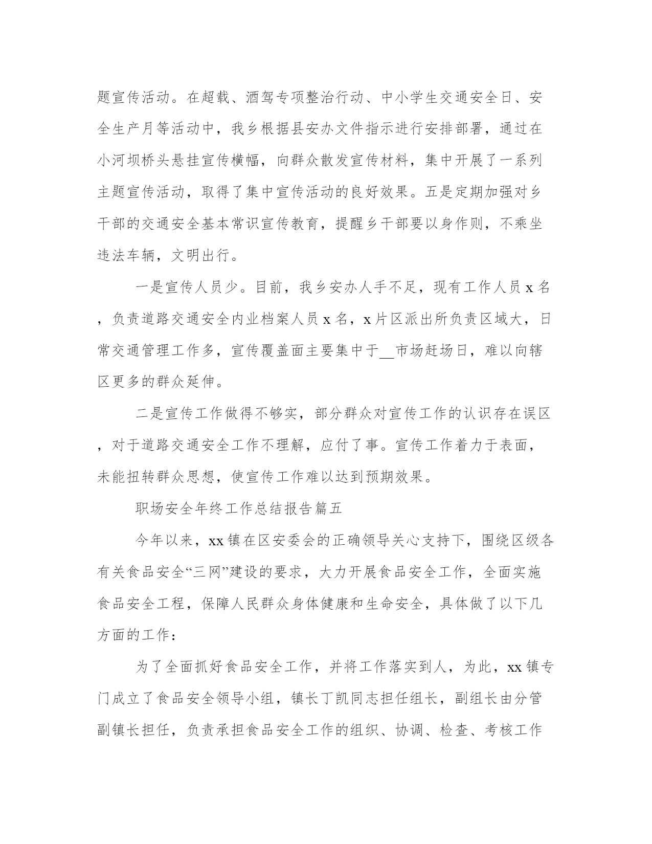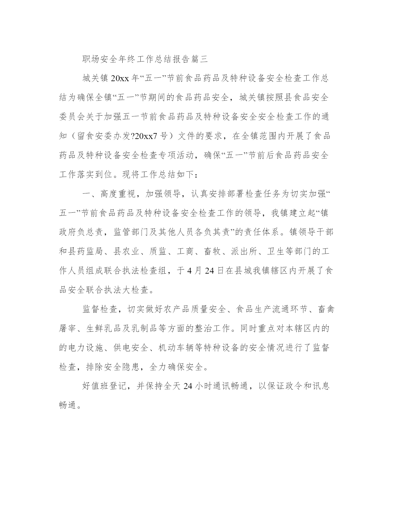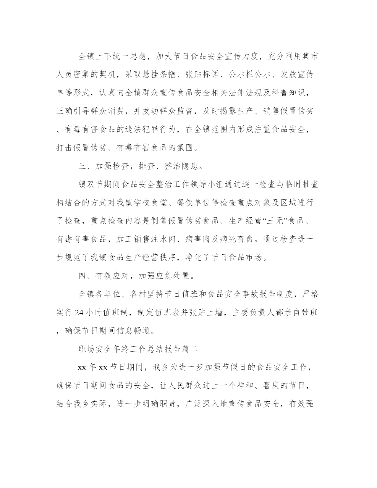 职场安全年终工作总结报告(热门18篇)报告的特点是客观、准确、专业,需要经过调研和分析,以及专业知识的支撑。写报告时,要注重布局和排版,使报告整体具有美观和可读性。这些范文是经过精心挑选和整理的,具有一定的参考和学习价值。职场安全年终工作总结报告篇一为切实做好中秋节、国庆节期间食品安全工作,有效预防和控制食品安全事故发生,为党的十八大召开营造良好的社会环境,安溪镇党委政府认真贯彻落实食安文件精神,结合实际,在全镇范围内认真开展食品安全工作整治工作,让全镇广大人民群众度过一个欢乐、祥和、安全的节日。现将我镇20xx年“中秋”、“国庆”安全专项整治工作总结如下:一、高度重视,加强组织领导。安溪镇党委、政府高度重视食品安全工作,将此项工作作为当前工作的重中之重来抓,及时召开党政班子会议,成立了以镇长为组长,分管领导为副组长,各相关单位负责人、各村支部书记、村主任、村卫生室主任为成员的小组,分析制定并下发了安溪镇中秋、国庆两节期间食品安全整治工作实施方案,使全镇食品安全整治工作有序展开。二、加强宣传,形成安全氛围。全镇上下统一思想,加大节日食品安全宣传力度,充分利用集市人员密集的契机,采取悬挂条幅、张贴标语、公示栏公示、发放宣传单等形式,认真向全镇群众宣传食品安全相关法律法规及科普知识,正确引导群众消费,并发动群众监督,及时揭露生产、销售假冒伪劣、有毒有害食品的违法犯罪行为,在全镇范围内形成注重食品安全,打击假冒伪劣、有毒有害食品的氛围。三、加强检查,排查、整治隐患。镇双节期间食品安全整治工作领导小组通过逐一检查与临时抽查相结合的方式对我镇学校食堂、餐饮单位等检查重点对象及区域进行了检查,重点检查内容是制售假冒伪劣食品、生产经营“三无”食品、有毒有害食品,加工销售注水肉、病害肉及病死畜禽。通过检查进一步规范了我镇食品生产经营秩序,净化了节日食品市场。四、有效应对,加强应急处置。全镇各单位、各村坚持节日值班和食品安全事故报告制度,严格实行24小时值班制,制定值班表并张贴上墙,主要负责人都亲自带班,确保节日期间信息畅通。职场安全年终工作总结报告篇二xx年xx节日期间,我乡为进一步加强节假日的食品安全工作,确保节日期间食品的安全,让人民群众过上一个祥和、喜庆的节日,结合我乡实际,进一步明确职责,广泛深入地宣传食品安全,有效强化了食品生产经营者的卫生法制意识,现将我乡xx年xx节日食品安全工作总结如下:我乡人民政府根据xx食安委办【xx】1号文件精神,结合我乡实际,详细制定了xx节日期间的食品安全工作计划和工作内容,以广泛宣传和各村农村家宴为主的监测、监督,为保证我乡无食物中毒的发生。并成立了以xx为组长、分管领导xx、乡卫生院院长xx副组长、社事办主任xx、派出所所长xx等单位为成员的领导小组,同时,乡人民政府同各村、农家乐业主、副食店、餐馆签订了xx节日期间的食品安全责任书,要求业主必须购入台帐,登记清楚。按照“乡人民政府统一领导、各方联合行动”的工作格局,对存在的问题予以整治,及时消除食品安全隐患,积极配合做好预防和控制食物中毒的各项准备工作,严格责任追究制,对因监督检查不到位而导致的重大食物事故,要依法追究该单位和当事人的责任。加强对超市、副食店和各种交易会的监管,开展对糖果糕点、肉制品、乳制品,儿童食品等品种的专项检查,加强对小摊点、小卖店经销食品的监管,防止“三无”、过期霉变、有毒有害食品进入流通领域。加强对饭馆、各类食堂、农家乐、宗教场所食品的监管,加强对大宗食品采购索证、储存安全卫生、人员健康的管理,加强对群体性聚餐的监督管理和指导,防止了群体性的事物中毒事故的.发生。为加强节日期间值班坚守制度和食品安全事件应急准备,我乡特制定食品安全应急方案。落实应急措施,强化节日期间的值班制度,保证24小时值班,确保信息畅通,及时联络沟通,严格实行重大食品安全事故报告制度。此次检查督查虽取得了一定成绩,但我们应该清醒地看到工作中仍然存在一些问题:1、普遍存在安全责任意识不强,“重效益、轻安全”的现象还依然存在。2、安全责任制的落实有待进一步加强,安全责任制度、安全操作规程只停留在口头上,真正未落到实处。针对以上存在的问题,我乡通知有关负责人,要求及时改正和整改,力求做到万无一失,确保安全生产。总之,通过这次xx节日期间食品安全检查督查,一是进一步提高了本系统干部职工对安全生产的重要性和必要性的认识,确保了xx节日期间我乡村民进一步树立了以安全促生产、以生产促发展的经营理念,营造了干部、群众人人关心安全生产的思想氛围,为促进安全生产、经营状况的稳定和好转及构建社会主义和谐社会提供了精神动力、思想保证和舆论支持。二是安全生产工作只有起点,没有终点,我们将在县委、政府的正确领导和各有关业务部门的指
