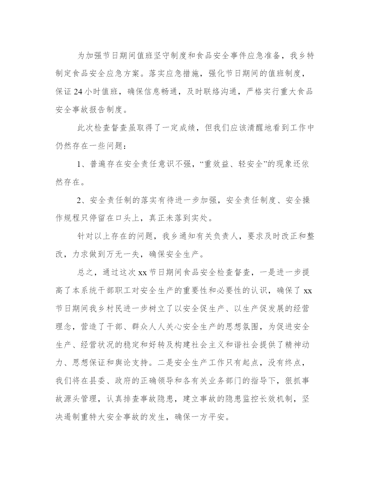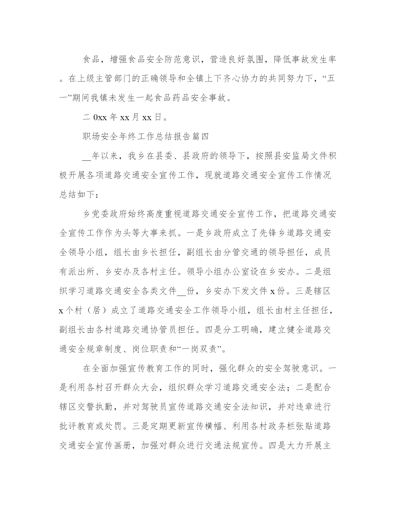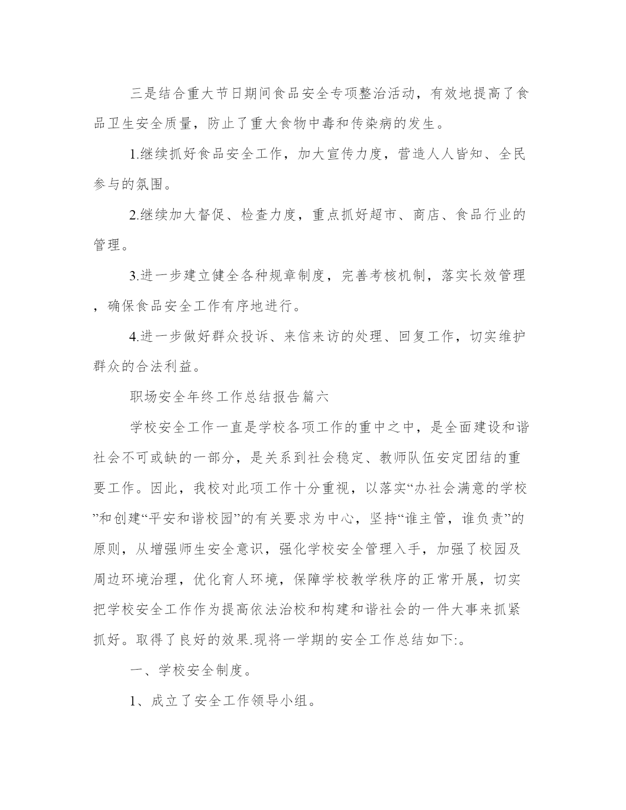 职场安全年终工作总结报告(热门18篇)报告的特点是客观、准确、专业,需要经过调研和分析,以及专业知识的支撑。写报告时,要注重布局和排版,使报告整体具有美观和可读性。这些范文是经过精心挑选和整理的,具有一定的参考和学习价值。职场安全年终工作总结报告篇一为切实做好中秋节、国庆节期间食品安全工作,有效预防和控制食品安全事故发生,为党的十八大召开营造良好的社会环境,安溪镇党委政府认真贯彻落实食安文件精神,结合实际,在全镇范围内认真开展食品安全工作整治工作,让全镇广大人民群众度过一个欢乐、祥和、安全的节日。现将我镇20xx年“中秋”、“国庆”安全专项整治工作总结如下:一、高度重视,加强组织领导。安溪镇党委、政府高度重视食品安全工作,将此项工作作为当前工作的重中之重来抓,及时召开党政班子会议,成立了以镇长为组长,分管领导为副组长,各相关单位负责人、各村支部书记、村主任、村卫生室主任为成员的小组,分析制定并下发了安溪镇中秋、国庆两节期间食品安全整治工作实施方案,使全镇食品安全整治工作有序展开。二、加强宣传,形成安全氛围。全镇上下统一思想,加大节日食品安全宣传力度,充分利用集市人员密集的契机,采取悬挂条幅、张贴标语、公示栏公示、发放宣传单等形式,认真向全镇群众宣传食品安全相关法律法规及科普知识,正确引导群众消费,并发动群众监督,及时揭露生产、销售假冒伪劣、有毒有害食品的违法犯罪行为,在全镇范围内形成注重食品安全,打击假冒伪劣、有毒有害食品的氛围。三、加强检查,排查、整治隐患。镇双节期间食品安全整治工作领导小组通过逐一检查与临时抽查相结合的方式对我镇学校食堂、餐饮单位等检查重点对象及区域进行了检查,重点检查内容是制售假冒伪劣食品、生产经营“三无”食品、有毒有害食品,加工销售注水肉、病害肉及病死畜禽。通过检查进一步规范了我镇食品生产经营秩序,净化了节日食品市场。四、有效应对,加强应急处置。全镇各单位、各村坚持节日值班和食品安全事故报告制度,严格实行24小时值班制,制定值班表并张贴上墙,主要负责人都亲自带班,确保节日期间信息畅通。职场安全年终工作总结报告篇二xx年xx节日期间,我乡为进一步加强节假日的食品安全工作,确保节日期间食品的安全,让人民群众过上一个祥和、喜庆的节日,结合我乡实际,进一步明确职责,广泛深入地宣传食品安全,有效强化了食品生产经营者的卫生法制意识,现将我乡xx年xx节日食品安全工作总结如下:我乡人民政府根据xx食安委办【xx】1号文件精神,结合我乡实际,详细制定了xx节日期间的食品安全工作计划和工作内容,以广泛宣传和各村农村家宴为主的监测、监督,为保证我乡无食物中毒的发生。并成立了以xx为组长、分管领导xx、乡卫生院院长xx副组长、社事办主任xx、派出所所长xx等单位为成员的领导小组,同时,乡人民政府同各村、农家乐业主、副食店、餐馆签订了xx节日期间的食品安全责任书,要求业主必须购入台帐,登记清楚。按照“乡人民政府统一领导、各方联合行动”的工作格局,对存在的问题予以整治,及时消除食品安全隐患,积极配合做好预防和控制食物中毒的各项准备工作,严格责任追究制,对因监督检查不到位而导致的重大食物事故,要依法追究该单位和当事人的责任。加强对超市、副食店和各种交易会的监管,开展对糖果糕点、肉制品、乳制品,儿童食品等品种的专项检查,加强对小摊点、小卖店经销食品的监管,防止“三无”、过期霉变、有毒有害食品进入流通领域。加强对饭馆、各类食堂、农家乐、宗教场所食品的监管,加强对大宗食品采购索证、储存安全卫生、人员健康的管理,加强对群体性聚餐的监督管理和指导,防止了群体性的事物中毒事故的.发生。为加强节日期间值班坚守制度和食品安全事件应急准备,我乡特制定食品安全应急方案。落实应急措施,强化节日期间的值班制度,保证24小时值班,确保信息畅通,及时联络沟通,严格实行重大食品安全事故报告制度。此次检查督查虽取得了一定成绩,但我们应该清醒地看到工作中仍然存在一些问题:1、普遍存在安全责任意识不强,“重效益、轻安全”的现象还依然存在。2、安全责任制的落实有待进一步加强,安全责任制度、安全操作规程只停留在口头上,真正未落到实处。针对以上存在的问题,我乡通知有关负责人,要求及时改正和整改,力求做到万无一失,确保安全生产。总之,通过这次xx节日期间食品安全检查督查,一是进一步提高了本系统干部职工对安全生产的重要性和必要性的认识,确保了xx节日期间我乡村民进一步树立了以安全促生产、以生产促发展的经营理念,营造了干部、群众人人关心安全生产的思想氛围,为促进安全生产、经营状况的稳定和好转及构建社会主义和谐社会提供了精神动力、思想保证和舆论支持。二是安全生产工作只有起点,没有终点,我们将在县委、政府的正确领导和各有关业务部门的指