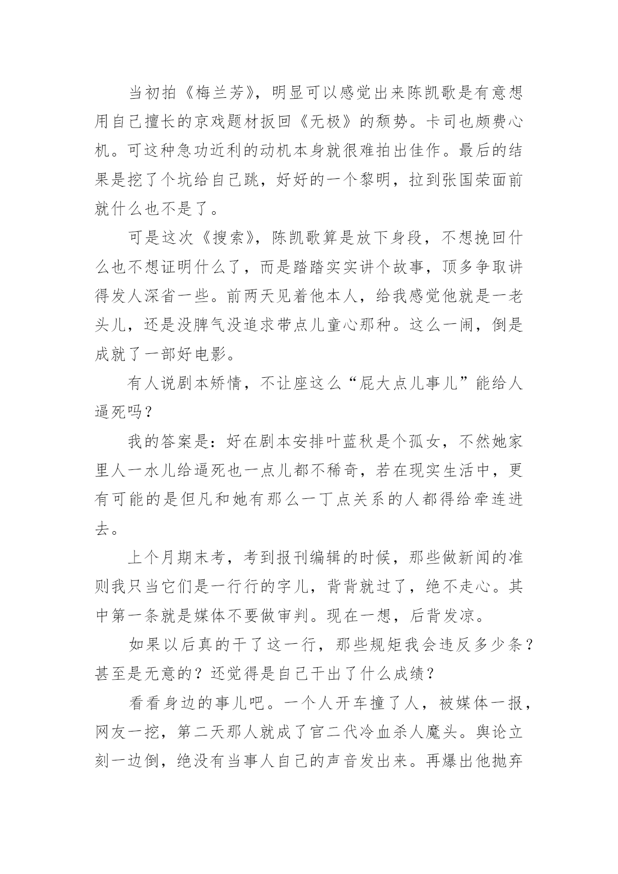 电影搜索观后感电影搜索观后感(通用12篇)当看完一部影视作品后,相信大家一定领会了不少东西,让我们好好写份观后感,把你的收获感想写下来吧。为了让您不再为写观后感头疼,以下是小编收集整理的电影搜索观后感(通用12篇),欢迎阅读与收藏。电影搜索观后感篇1看完早场的《搜索》,坐在回家的公车上,一路在翻豆瓣上的短评。“给三星以上的都是狗。”有一条儿是这么写的。为什么要拍这样一部片?这就是一个答案。似乎陈凯歌一出新作,在离上映还很远的时候就有一个站得很高的声音会被无数人附和:《霸王别姬》耗尽了他一辈子的才华,他早就江郎才尽了,又一烂片无疑。如果非要这么比的话,那恐怕不仅陈凯歌自己的作品,之后的华语电影就没有好片。李碧华扎实毒辣的故事,陈凯歌的文人情怀,触犯“禁忌”的题材,踏实做戏的制作团队,张国荣绝代风华的演技和京戏的'神秘与美,少了一样都成就不了这部电影。现在又有几个影片有能力囊括这些要素?所以看客们到底在刻薄些什么?有必要是部电影就和《霸》比较吗?我看完《搜索》,觉得这部片很真诚,非常好看。五颗星。当初拍《梅兰芳》,明显可以感觉出来陈凯歌是有意想用自己擅长的京戏题材扳回《无极》的颓势。卡司也颇费心机。可这种急功近利的动机本身就很难拍出佳作。最后的结果是挖了个坑给自己跳,好好的一个黎明,拉到张国荣面前就什么也不是了。可是这次《搜索》,陈凯歌算是放下身段,不想挽回什么也不想证明什么了,而是踏踏实实讲个故事,顶多争取讲得发人深省一些。前两天见着他本人,给我感觉他就是一老头儿,还是没脾气没追求带点儿童心那种。这么一闹,倒是成就了一部好电影。有人说剧本矫情,不让座这么“屁大点儿事儿”能给人逼死吗?我的答案是:好在剧本安排叶蓝秋是个孤女,不然她家里人一水儿给逼死也一点儿都不稀奇,若在现实生活中,更有可能的是但凡和她有那么一丁点关系的人都得给牵连进去。上个月期末考,考到报刊编辑的时候,那些做新闻的准则我只当它们是一行行的字儿,背背就过了,绝不走心。其中第一条就是媒体不要做审判。现在一想,后背发凉。如果以后真的干了这一行,那些规矩我会违反多少条?甚至是无意的?还觉得是自己干出了什么成绩?看看身边的事儿吧。一个人开车撞了人,被媒体一报,网友一挖,第二天那人就成了官二代冷血杀人魔头。舆论立刻一边倒,绝没有当事人自己的声音发出来。再爆出他抛弃过那么几个女朋友,上学时候打过小抄儿做过弊,和人干过架,开车违过章,能引起全民大讨伐就再好不过了。这人被判刑之后,恐怕只能留下一双永远抬不起头的父母四处与人下跪磕头认错,从前的朋友也要一律和他划清界限;很多年前爆发的艳照门,在媒体和网民的集体努力下,让陈冠希现在还背负着各种骂名,被人追杀,不敢接戏,网友仍然以辱骂他为乐(我也是其中一员……而且还不能保证以后不做这样的事儿了)。这就是比电影可怕一千一万倍的事实。所以电影的结局也算是温柔的吗?叶蓝秋临死之际,拉着杨守诚来到一片芦苇地看日出。我觉得大概是这样——站在人一样高的芦苇地里头,吹着风,终于没有质问和谩骂。于是在那么一瞬间里,谁也就不能再伤害谁。对于一个爱生活的人来说,会有很多爱好,例如电影电影搜索观后感篇2故事以叶蓝秋在公交车上不让座为线索,影片运用网络信息传播为主线,描述了每一位牵扯到的人物的不同命运。看了一大半,没觉得有什么亮点,情节平铺展开,但我心里一直在等待那个叶蓝秋病情告发的桥段,那是故事的高潮,但,影片没有把这个感人的桥段放大,以至于我只是小小地感动了一下。有人和我解释,这不是一部感情片,所以不会把这一桥段过多渲染。但作为观众,我还是希望在叶蓝秋告知杨守诚病情时,能够拍得更煽情、更感人,而叶蓝秋与杨守诚的感情铺垫应该更丰富一点。对于最后莫小渝离开沈流舒这一情节觉得不合理,有点做作,是多此一举。沈流舒的扮演者王学圻演得非常出色,把一个商场上的富豪演绎得恰如其分,姚晨把角色演得很到位,让我看到了陈若兮的强势、偏执到最后的无奈。而一直期待的'高圆圆与赵又廷演得不算太失望,但是没看出来这影片的故事能把他们感动成现实中的一对。陈红演技真不怎么样,而且她的容颜不禁让我感叹:岁月真是一把杀猪刀呀,相比之下,高圆圆真的好美哦。因为我喜欢现代剧,所以很多时尚元素还是很吸引眼球,演员的衣服、办公室的布置、人物的语言、汽车等都堪称精致、都很现代!虽然影片没有轰轰烈烈的场面,也没有让我泪流满面,但感触还是很深:第一,在这个快餐式的信息时代,我们该怎么看待网上的信息?现在的人们都不愿意用自己的脑子判断真伪,一旦看到网上的信息多会确信是真的,而且大多数人都会用一种非常负面的态度判断某一事件,比如说:人们不会想一下,叶蓝秋为什么不让座?也许她有隐情?莫小渝一个电话就能让所有的人相信叶蓝秋是一个小三。第二,网络时代的发展,阻碍了人与人之间面对面的交流。陈若兮以一则短消息认定杨守诚