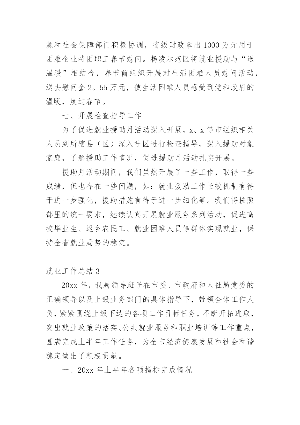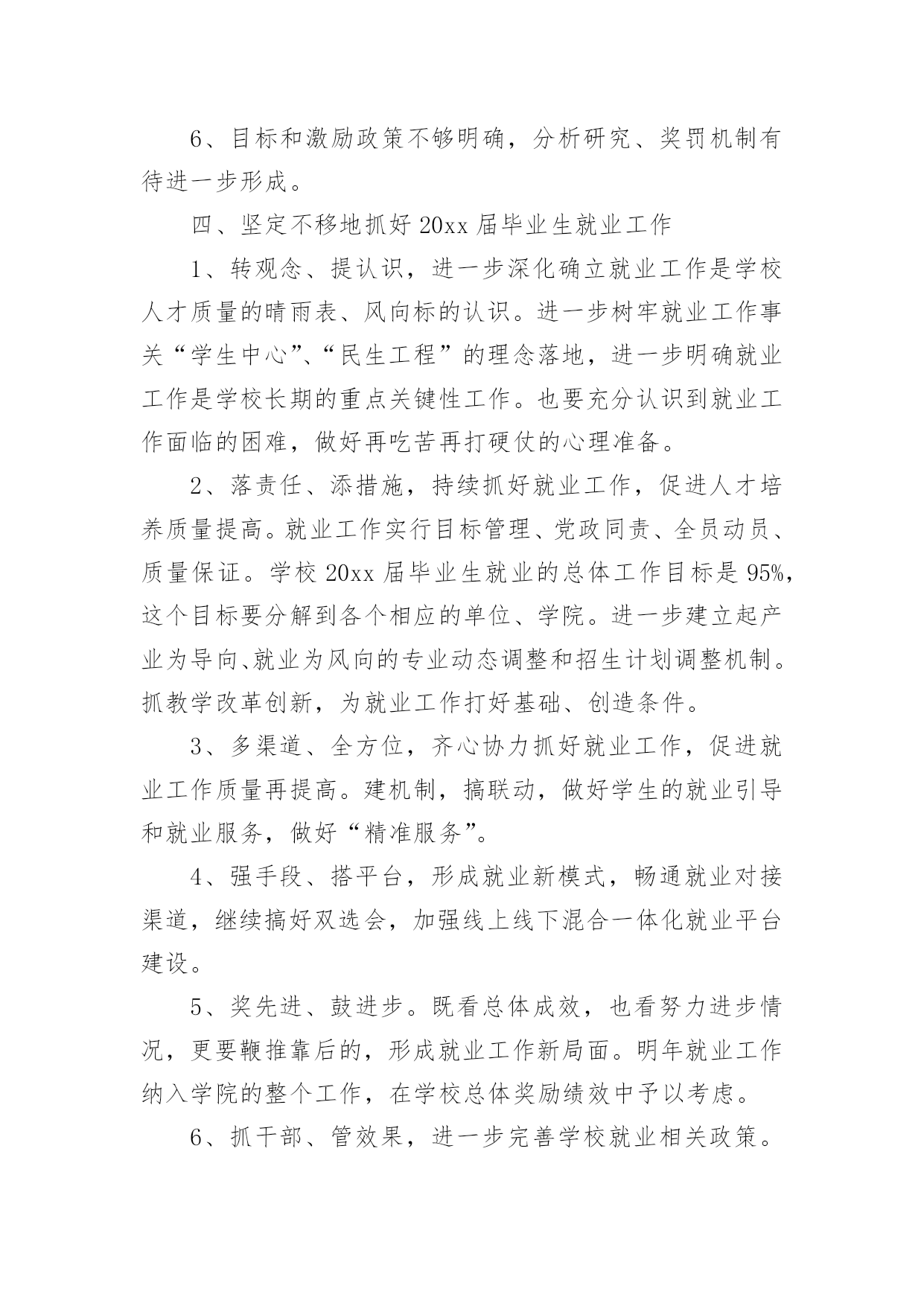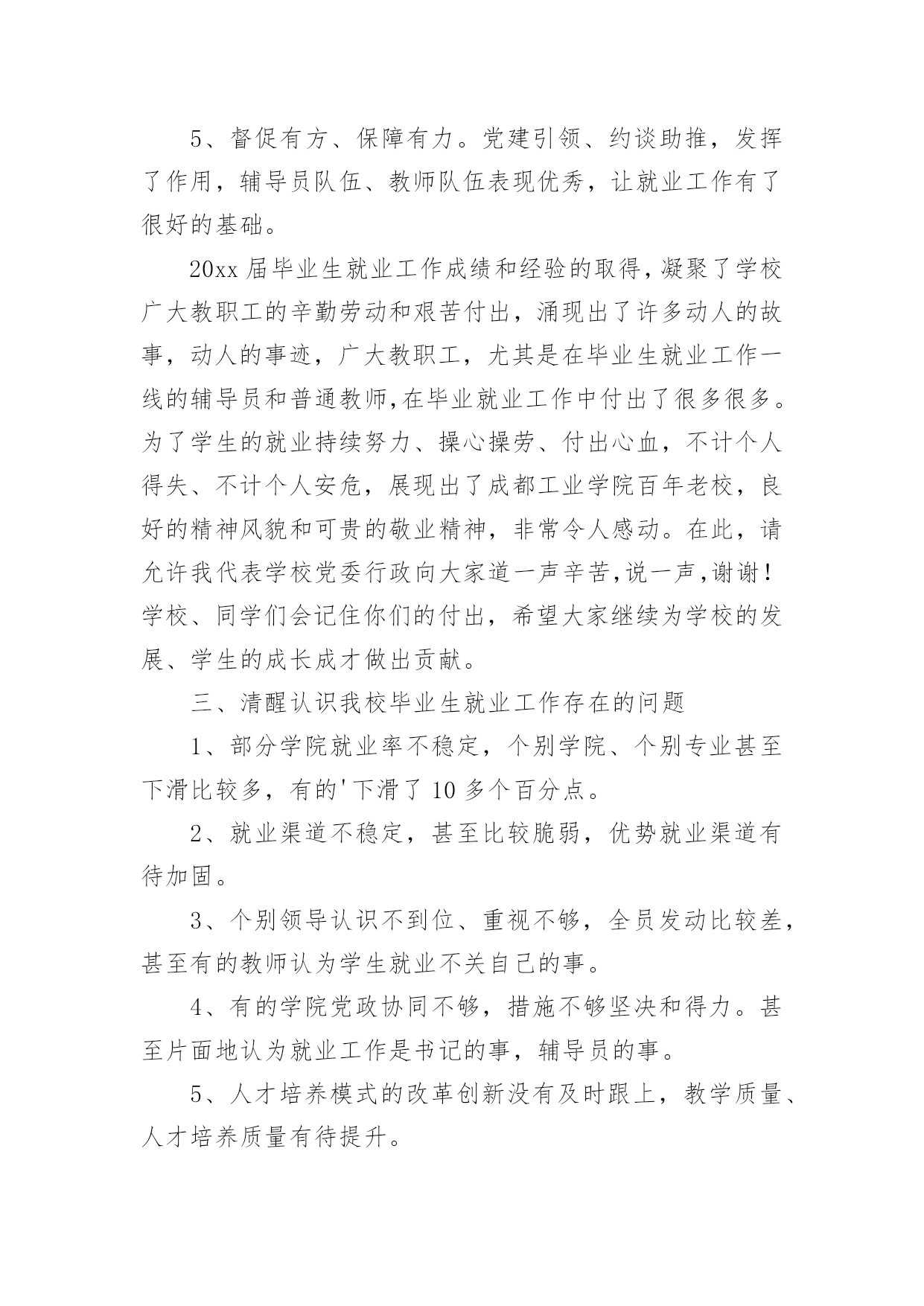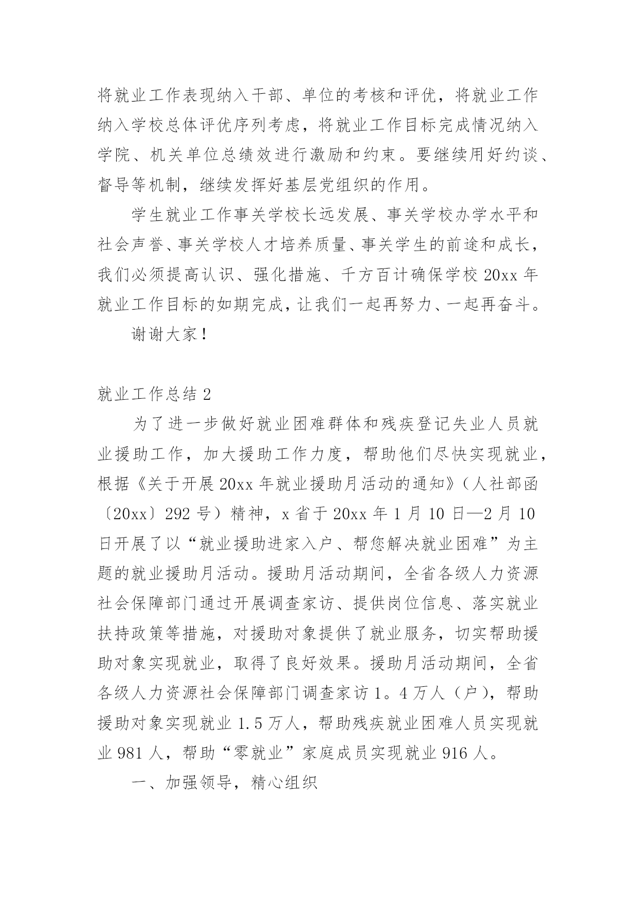 就业工作总结总结是在某一特定时间段对学习和工作生活或其完成情况,包括取得的成绩、存在的问题及得到的经验和教训加以回顾和分析的书面材料,写总结有利于我们学习和工作能力的提高,不妨让我们认真地完成总结吧。你所见过的总结应该是什么样的?以下是小编收集整理的就业工作总结,欢迎阅读,希望大家能够喜欢。就业工作总结1老师们:大家下午好!今天,我们在这里召开20xx届毕业生就业工作会,其目的就是要肯定、总结20xx届毕业生就业工作,研讨20xx届毕业生就业工作。刚才,学生处对20xx年的毕业生就业工作进行了系统、全面的总结,相关学院和部门作了很好的交流发言,有思路、有做法、有体会、有经验,听后很受启发,可谓是“八仙过海、各显神通、精彩纷呈”。下面,我讲几点意见。一、充分肯定我校20xx届毕业生就业工作取得的成绩1、全校总体就业率保持全省领先,继续保持较高的水平。今年就业工作是在疫情防控的特殊情况下进行的,同时毕业生人数明显增加,全国就业压力持续加大,给我们带来了巨大的困难和挑战,经过大家的共同努力,本科就业率仍然取得了93。18%的好成绩,自动化、电子工程等2个学院整体就业率达到95%以上,在有毕业生的24个本科专业中,有11个达到94%以上,5个专业超过95%。这些成绩的取得实属不易、难能可贵。2、部分学院、部分专业就业率上升明显,呈现出良好的发展势头。尤其是电子工程学院,从约谈时的比较靠后最终成了全校第一,取得显著进步。3、就业渠道进一步拓展,就业质量有所提升。学生就业的专业对口率有所提升,就业与专业的相关度增加,考研升学学生人数和比例上升,尤其是在疫情防控的倒逼下,线上线下混合就业工作模式呈现新的喜人气象。二、认真总结我校毕业生就业工作的具体经验和做法1、认识到位,高度重视。进一步统一了思想认识,充分认识到就业是学校、学院的重要关键性工作,认识到做好就业工作的重要性和紧迫性;2、党政同心、齐抓共推。认真落实了就业“党政一把手”工程,党政领导亲自抓、负总责,共同推进学院的就业工作;3、全员动员、多措并举。就业工作实现了全员参与,全程服务。学校和学院都采取了多样化的措施,保障了就业工作的效果;4、责任落实、专兼助有效。就业工作切实落实了具体的专职人员,全体辅导员、专业课老师兼职就业工作,职能部门提供助力,形成了良好的就业工作态势;5、督促有方、保障有力。党建引领、约谈助推,发挥了作用,辅导员队伍、教师队伍表现优秀,让就业工作有了很好的基础。20xx届毕业生就业工作成绩和经验的取得,凝聚了学校广大教职工的辛勤劳动和艰苦付出,涌现出了许多动人的故事,动人的事迹,广大教职工,尤其是在毕业生就业工作一线的辅导员和普通教师,在毕业就业工作中付出了很多很多。为了学生的就业持续努力、操心操劳、付出心血,不计个人得失、不计个人安危,展现出了成都工业学院百年老校,良好的精神风貌和可贵的敬业精神,非常令人感动。在此,请允许我代表学校党委行政向大家道一声辛苦,说一声,谢谢!学校、同学们会记住你们的付出,希望大家继续为学校的发展、学生的成长成才做出贡献。三、清醒认识我校毕业生就业工作存在的问题1、部分学院就业率不稳定,个别学院、个别专业甚至下滑比较多,有的'下滑了10多个百分点。2、就业渠道不稳定,甚至比较脆弱,优势就业渠道有待加固。3、个别领导认识不到位、重视不够,全员发动比较差,甚至有的教师认为学生就业不关自己的事。4、有的学院党政协同不够,措施不够坚决和得力。甚至片面地认为就业工作是书记的事,辅导员的事。5、人才培养模式的改革创新没有及时跟上,教学质量、人才培养质量有待提升。6、目标和激励政策不够明确,分析研究、奖罚机制有待进一步形成。四、坚定不移地抓好20xx届毕业生就业工作1、转观念、提认识,进一步深化确立就业工作是学校人才质量的晴雨表、风向标的认识。进一步树牢就业工作事关“学生中心”、“民生工程”的理念落地,进一步明确就业工作是学校长期的重点关键性工作。也要充分认识到就业工作面临的困难,做好再吃苦再打硬仗的心理准备。2、落责任、添措施,持续抓好就业工作,促进人才培养质量提高。就业工作实行目标管理、党政同责、全员动员、质量保证。学校20xx届毕业生就业的总体工作目标是95%,这个目标要分解到各个相应的单位、学院。进一步建立起产业为导向、就业为风向的专业动态调整和招生计划调整机制。抓教学改革创新,为就业工作打好基础、创造条件。3、多渠道、全方位,齐心协力抓好就业工作,促进就业工作质量再提高。建机制,搞联动,做好学生的就业引导和就业服务,做好“精准服务”。4、强手段、搭平台,形成就业新模式,畅通就业对接渠道,继续搞好双选会,加强线上线下混合一体化就业平台建设。5、奖先进、鼓进步。既看总体成效,也看努力进步情况,更要鞭推靠后的,形成就业工作新局面。明年就