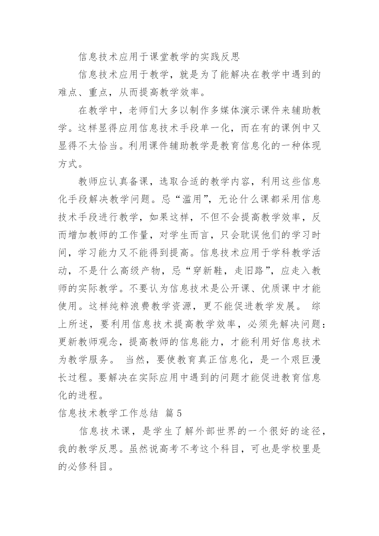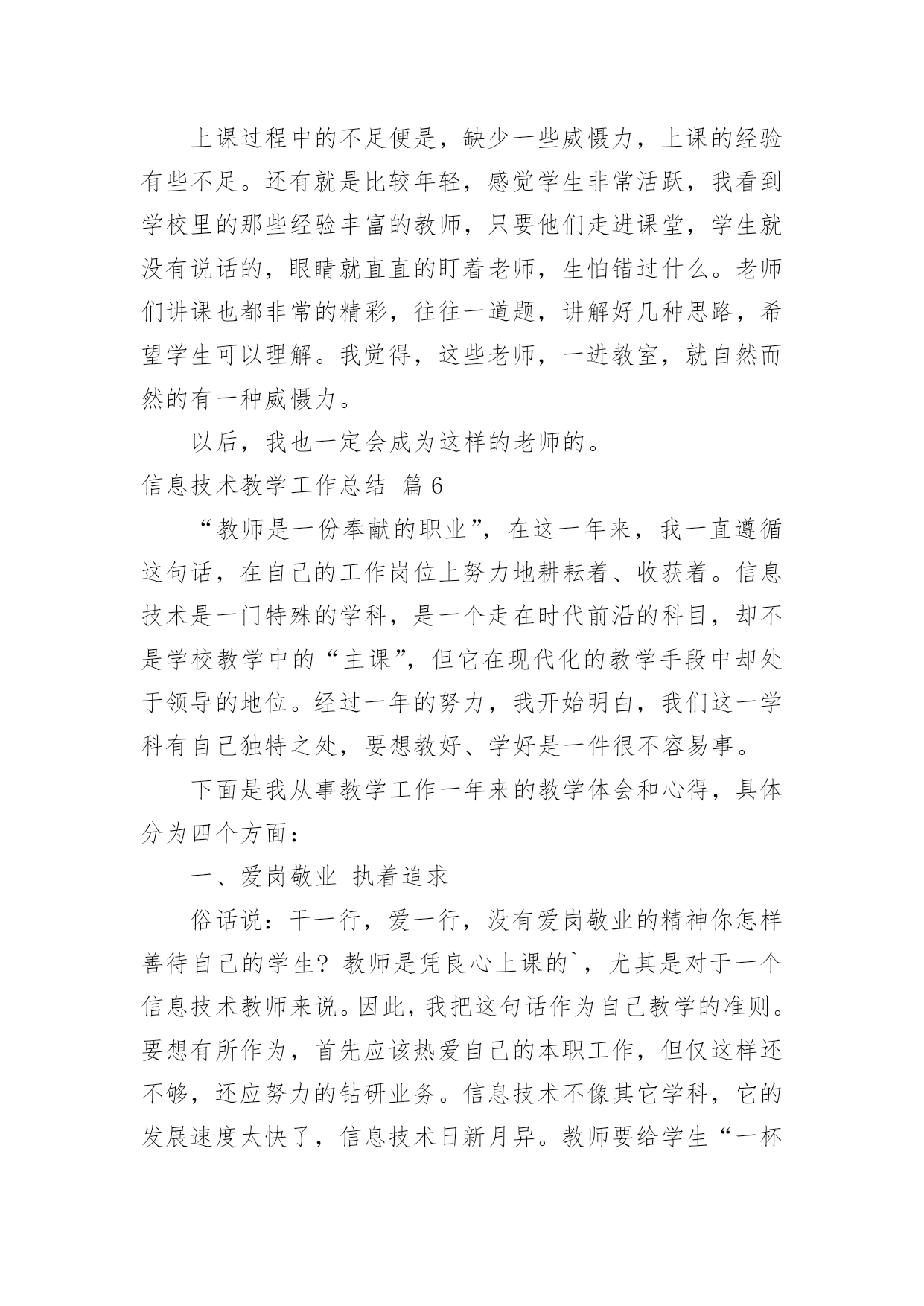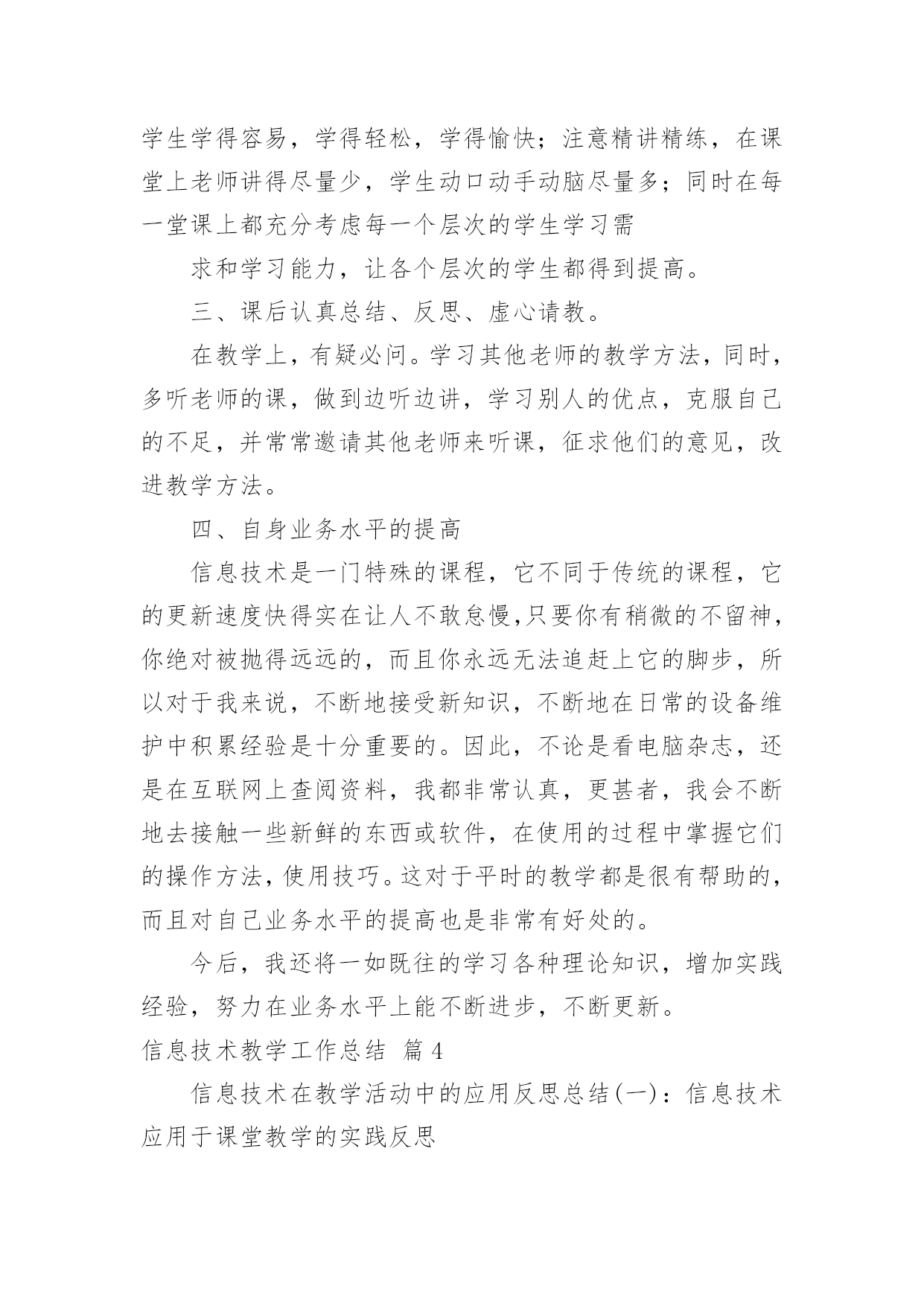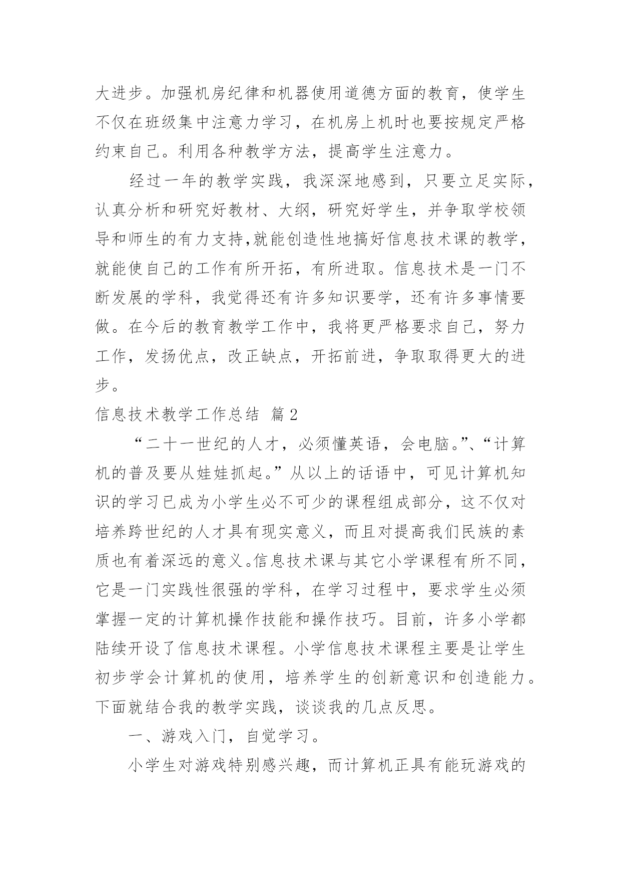 信息技术教学工作总结信息技术教学工作总结锦集十篇总结就是对一个时期的学习、工作或其完成情况进行一次全面系统的回顾和分析的书面材料,它能够给人努力工作的动力,不如立即行动起来写一份总结吧。那么总结应该包括什么内容呢?下面是小编为大家整理的信息技术教学工作总结10篇,欢迎阅读与收藏。信息技术教学工作总结篇1XXXXX-XXXX学年第二学期即将结束,回顾这一学期,我所从事的四、五、六三个年级十二个班级的信息技术教学工作,基本上来说是比较顺利地完成任务。这在这学期的教学工作中,我围绕努力培养学生信息素养这个中心目标,着重抓了提高学生获取、处理信息能力的工作。现总结如下:一、教学方面本学期首先结合上学期的工作及教材课标制定了详细的教学计划,每天课前认真钻研教材教法,认真学习《小学学信息技术课程指导纲要》,力求吃透教材,找准重点、难点,克服教学中的随意性。上课时,结合学生的身心发展情况,采取合理的教学方法,利用各种活动来开展课程,寓教于乐,达到良好的效果。课下我能积极反思,并在个人教育博客上记录教学得失,找准自己的优缺点,以便在今后的教学中加以改进。二、个人教学业务水平学习方面:本学期,学校仍继续开展“师徒结对”与“沙龙课-课堂评比活动”,在指导老师-万敏老师的认真指导下我钻研教法,积极备课,以四年级下册《图片插入更精彩》一课参加评比获得二等奖的成绩,这既是对我自身所取得的成绩的肯定,也和师傅的悉心指导是分不开的。课后我认真反思和万老师的点评,积极撰写教学反思,为今后的课堂教学提供经验。同时,我还参加了“瑶海区信息技术教师说课比赛”,虽然没有取得很好的成绩,却也通过比赛得到了锻炼。另外,我仍然坚持听课来提高自身的教学素养,这学期,我们学校承办了瑶海区“语文教学课堂评比活动”,这是非常好的学习机会,虽说和我所交科目不是同一学科,但从中能领悟到优秀的教师在课堂的驾驭能力,处理突发状况的应变能力。一学期,我听了二十多节课,收获颇大,逐步掌握了一些驾驭课堂的技巧。听完课之后,将优秀教师们的很多优点和长处记录下来,并慢慢学会应用到我的课堂教学当中去。三、本人今后的努力方向:信息技术作为一门不断发展的学科,其作用不断加强,作为一名信息技术教师要不断学习,加强自身基本功的训练,我利用课余时间阅读教学专著,学习新的教育知识,请教师傅,不断提高自身的教育业务水平,为自己的课堂增添新的活力。同时还要注重对学生能力的培养。对差生多些关心,多点爱心,再多一些耐心,使他们在对计算机的认识上有更大进步。加强机房纪律和机器使用道德方面的教育,使学生不仅在班级集中注意力学习,在机房上机时也要按规定严格约束自己。利用各种教学方法,提高学生注意力。经过一年的教学实践,我深深地感到,只要立足实际,认真分析和研究好教材、大纲,研究好学生,并争取学校领导和师生的有力支持,就能创造性地搞好信息技术课的教学,就能使自己的工作有所开拓,有所进取。信息技术是一门不断发展的学科,我觉得还有许多知识要学,还有许多事情要做。在今后的教育教学工作中,我将更严格要求自己,努力工作,发扬优点,改正缺点,开拓前进,争取取得更大的进步。信息技术教学工作总结篇2“二十一世纪的人才,必须懂英语,会电脑。”、“计算机的普及要从娃娃抓起。”从以上的话语中,可见计算机知识的学习已成为小学生必不可少的课程组成部分,这不仅对培养跨世纪的人才具有现实意义,而且对提高我们民族的素质也有着深远的意义。信息技术课与其它小学课程有所不同,它是一门实践性很强的学科,在学习过程中,要求学生必须掌握一定的计算机操作技能和操作技巧。目前,许多小学都陆续开设了信息技术课程。小学信息技术课程主要是让学生初步学会计算机的使用,培养学生的创新意识和创造能力。下面就结合我的教学实践,谈谈我的几点反思。一、游戏入门,自觉学习。小学生对游戏特别感兴趣,而计算机正具有能玩游戏的特点。根据这一特点,可以把计算机新课的学习寓于游戏之中,激发学生学习的兴趣,在学生浓厚的兴趣中学习新知识,掌握新技能。例如学习指法是非常枯燥的,如果教师一开始直接讲解手指的摆放要求和指法要点,学生不但学的很累,而且很不愿学,更加不能强迫其练习了。我在教学中就采取游戏引入的方法,先让学生玩《金山打字》,比赛谁的成绩好或者与老师比赛。学生在“打老鼠”等游戏的实践中发现,要取得好成绩就必须练习好指法。于是就有人提出如何能够打得又对又快。在这种情况下,老师再讲解指法练习,学生学得就很认真。经过一段时间的练习后,学生们再玩这个游戏时就感到轻松自如了。这样,既保持了学生学习计算机的热情,还可以促使学生自觉去学习计算机知识。二、直观教学,加深记忆。在教学中可以充分利用计算机的固有特征,采用形象、直观的教学方法,帮助学生加深对计算机知识的理解和记忆。在信息技术课的教学中应根据其特点,针对一