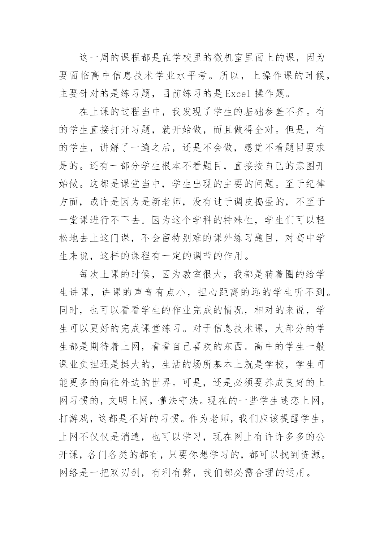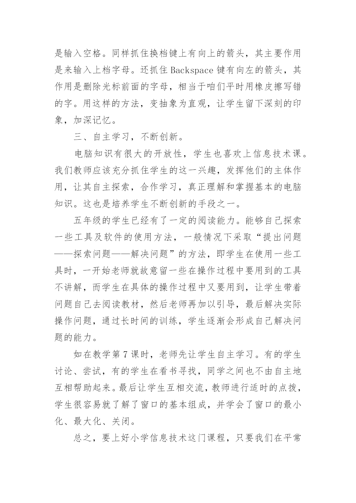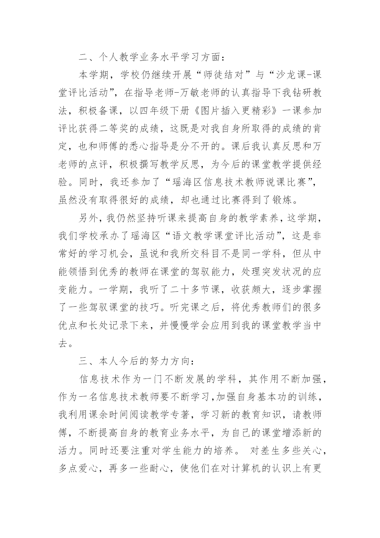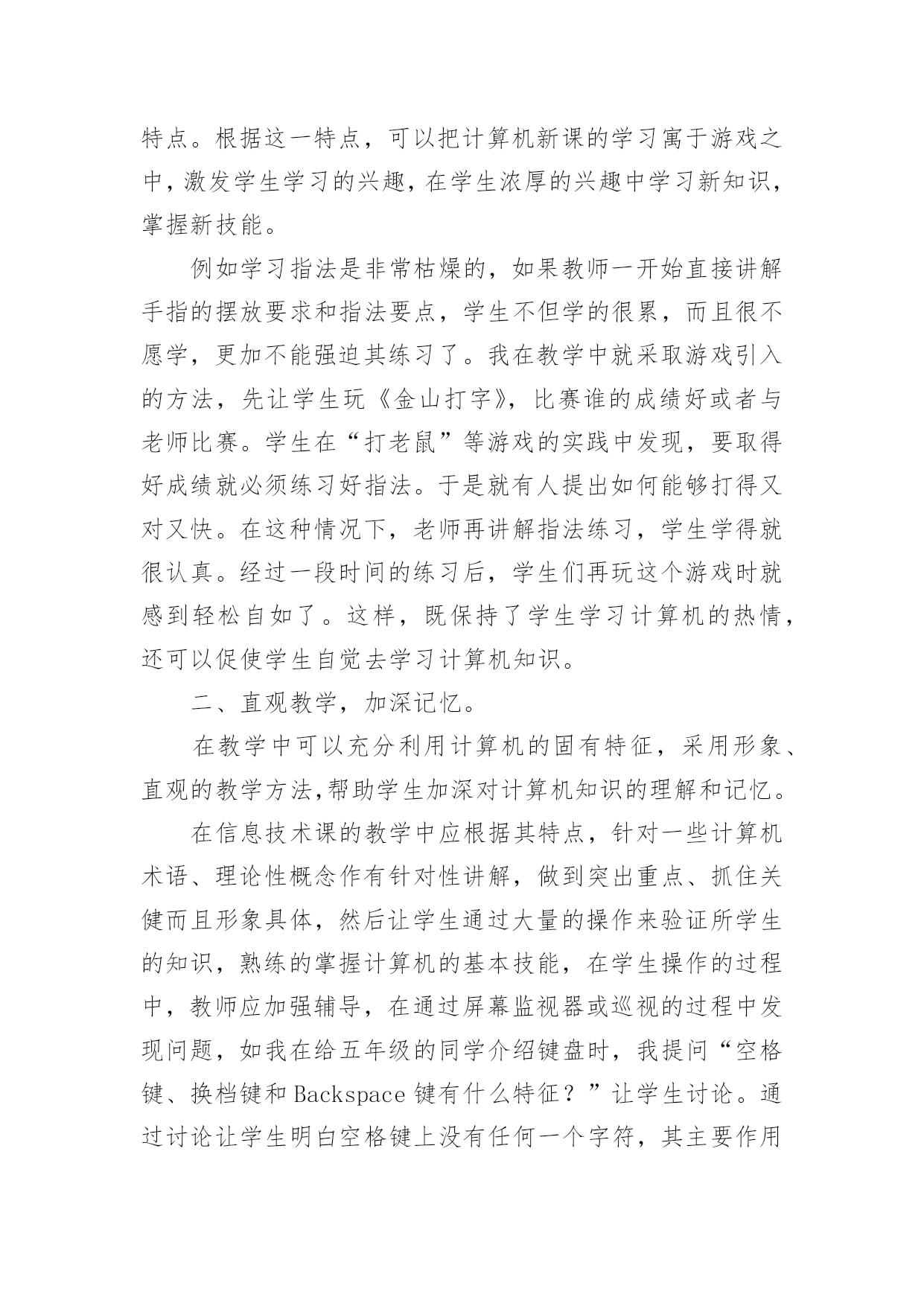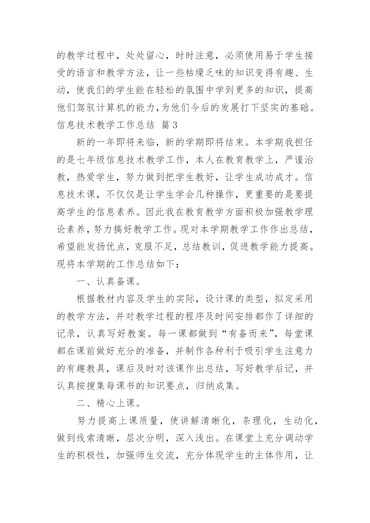 信息技术教学工作总结信息技术教学工作总结锦集十篇总结就是对一个时期的学习、工作或其完成情况进行一次全面系统的回顾和分析的书面材料,它能够给人努力工作的动力,不如立即行动起来写一份总结吧。那么总结应该包括什么内容呢?下面是小编为大家整理的信息技术教学工作总结10篇,欢迎阅读与收藏。信息技术教学工作总结篇1XXXXX-XXXX学年第二学期即将结束,回顾这一学期,我所从事的四、五、六三个年级十二个班级的信息技术教学工作,基本上来说是比较顺利地完成任务。这在这学期的教学工作中,我围绕努力培养学生信息素养这个中心目标,着重抓了提高学生获取、处理信息能力的工作。现总结如下:一、教学方面本学期首先结合上学期的工作及教材课标制定了详细的教学计划,每天课前认真钻研教材教法,认真学习《小学学信息技术课程指导纲要》,力求吃透教材,找准重点、难点,克服教学中的随意性。上课时,结合学生的身心发展情况,采取合理的教学方法,利用各种活动来开展课程,寓教于乐,达到良好的效果。课下我能积极反思,并在个人教育博客上记录教学得失,找准自己的优缺点,以便在今后的教学中加以改进。二、个人教学业务水平学习方面:本学期,学校仍继续开展“师徒结对”与“沙龙课-课堂评比活动”,在指导老师-万敏老师的认真指导下我钻研教法,积极备课,以四年级下册《图片插入更精彩》一课参加评比获得二等奖的成绩,这既是对我自身所取得的成绩的肯定,也和师傅的悉心指导是分不开的。课后我认真反思和万老师的点评,积极撰写教学反思,为今后的课堂教学提供经验。同时,我还参加了“瑶海区信息技术教师说课比赛”,虽然没有取得很好的成绩,却也通过比赛得到了锻炼。另外,我仍然坚持听课来提高自身的教学素养,这学期,我们学校承办了瑶海区“语文教学课堂评比活动”,这是非常好的学习机会,虽说和我所交科目不是同一学科,但从中能领悟到优秀的教师在课堂的驾驭能力,处理突发状况的应变能力。一学期,我听了二十多节课,收获颇大,逐步掌握了一些驾驭课堂的技巧。听完课之后,将优秀教师们的很多优点和长处记录下来,并慢慢学会应用到我的课堂教学当中去。三、本人今后的努力方向:信息技术作为一门不断发展的学科,其作用不断加强,作为一名信息技术教师要不断学习,加强自身基本功的训练,我利用课余时间阅读教学专著,学习新的教育知识,请教师傅,不断提高自身的教育业务水平,为自己的课堂增添新的活力。同时还要注重对学生能力的培养。对差生多些关心,多点爱心,再多一些耐心,使他们在对计算机的认识上有更大进步。加强机房纪律和机器使用道德方面的教育,使学生不仅在班级集中注意力学习,在机房上机时也要按规定严格约束自己。利用各种教学方法,提高学生注意力。经过一年的教学实践,我深深地感到,只要立足实际,认真分析和研究好教材、大纲,研究好学生,并争取学校领导和师生的有力支持,就能创造性地搞好信息技术课的教学,就能使自己的工作有所开拓,有所进取。信息技术是一门不断发展的学科,我觉得还有许多知识要学,还有许多事情要做。在今后的教育教学工作中,我将更严格要求自己,努力工作,发扬优点,改正缺点,开拓前进,争取取得更大的进步。信息技术教学工作总结篇2“二十一世纪的人才,必须懂英语,会电脑。”、“计算机的普及要从娃娃抓起。”从以上的话语中,可见计算机知识的学习已成为小学生必不可少的课程组成部分,这不仅对培养跨世纪的人才具有现实意义,而且对提高我们民族的素质也有着深远的意义。信息技术课与其它小学课程有所不同,它是一门实践性很强的学科,在学习过程中,要求学生必须掌握一定的计算机操作技能和操作技巧。目前,许多小学都陆续开设了信息技术课程。小学信息技术课程主要是让学生初步学会计算机的使用,培养学生的创新意识和创造能力。下面就结合我的教学实践,谈谈我的几点反思。一、游戏入门,自觉学习。小学生对游戏特别感兴趣,而计算机正具有能玩游戏的特点。根据这一特点,可以把计算机新课的学习寓于游戏之中,激发学生学习的兴趣,在学生浓厚的兴趣中学习新知识,掌握新技能。例如学习指法是非常枯燥的,如果教师一开始直接讲解手指的摆放要求和指法要点,学生不但学的很累,而且很不愿学,更加不能强迫其练习了。我在教学中就采取游戏引入的方法,先让学生玩《金山打字》,比赛谁的成绩好或者与老师比赛。学生在“打老鼠”等游戏的实践中发现,要取得好成绩就必须练习好指法。于是就有人提出如何能够打得又对又快。在这种情况下,老师再讲解指法练习,学生学得就很认真。经过一段时间的练习后,学生们再玩这个游戏时就感到轻松自如了。这样,既保持了学生学习计算机的热情,还可以促使学生自觉去学习计算机知识。二、直观教学,加深记忆。在教学中可以充分利用计算机的固有特征,采用形象、直观的教学方法,帮助学生加深对计算机知识的理解和记忆。在信息技术课的教学中应根据其特点,针对一