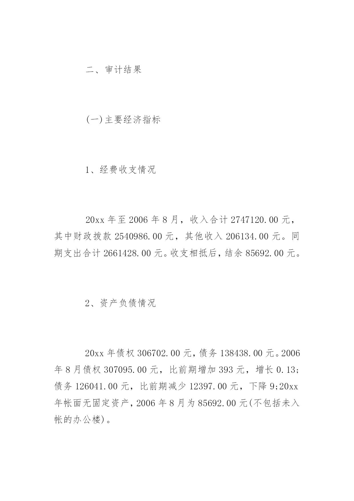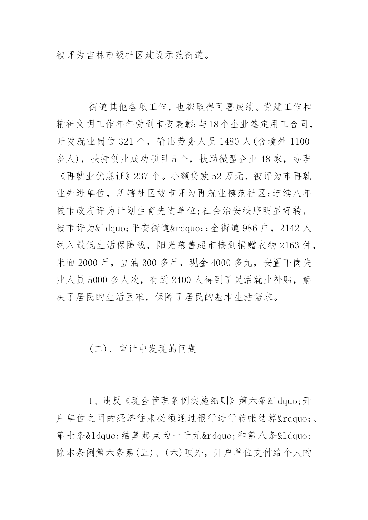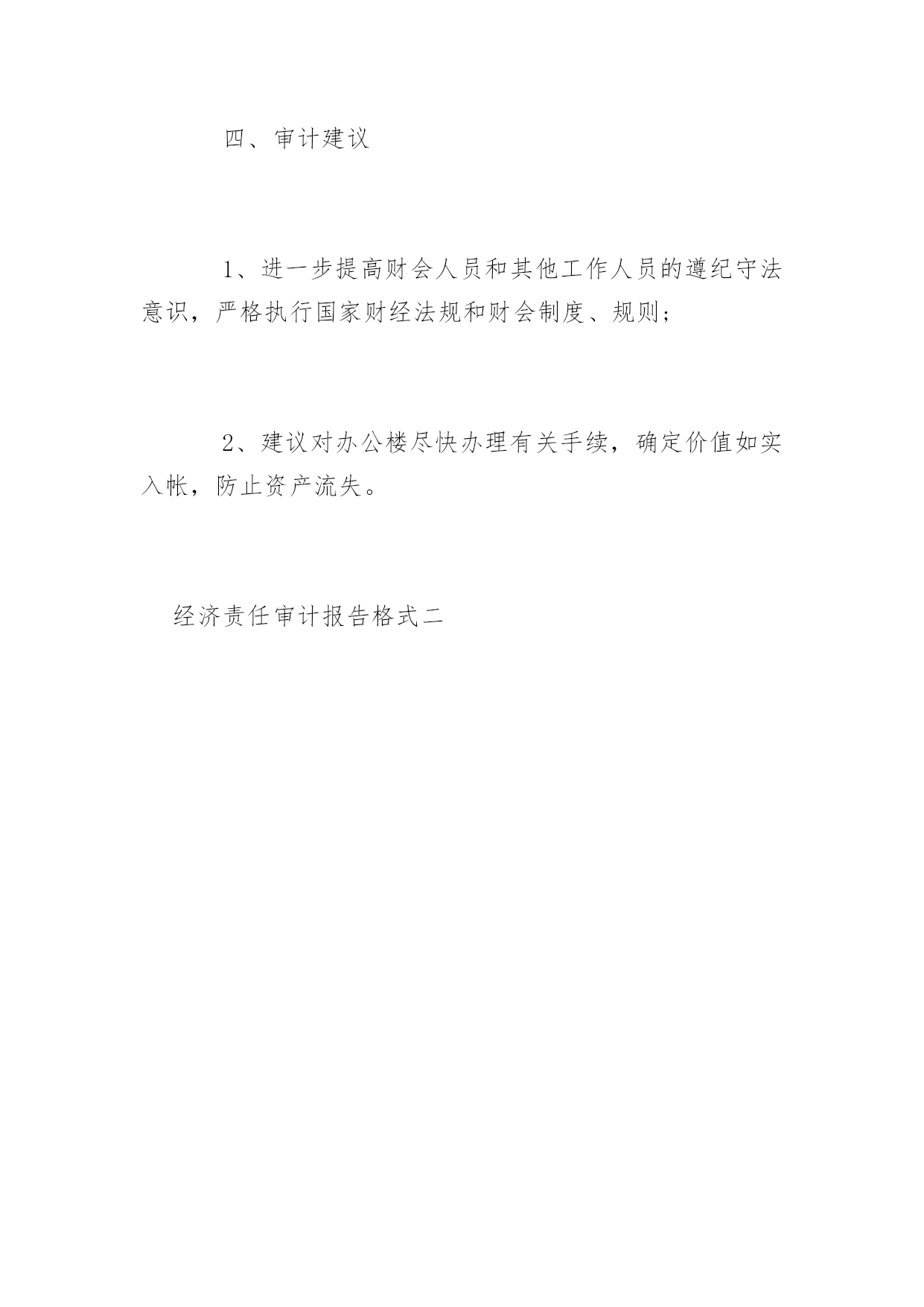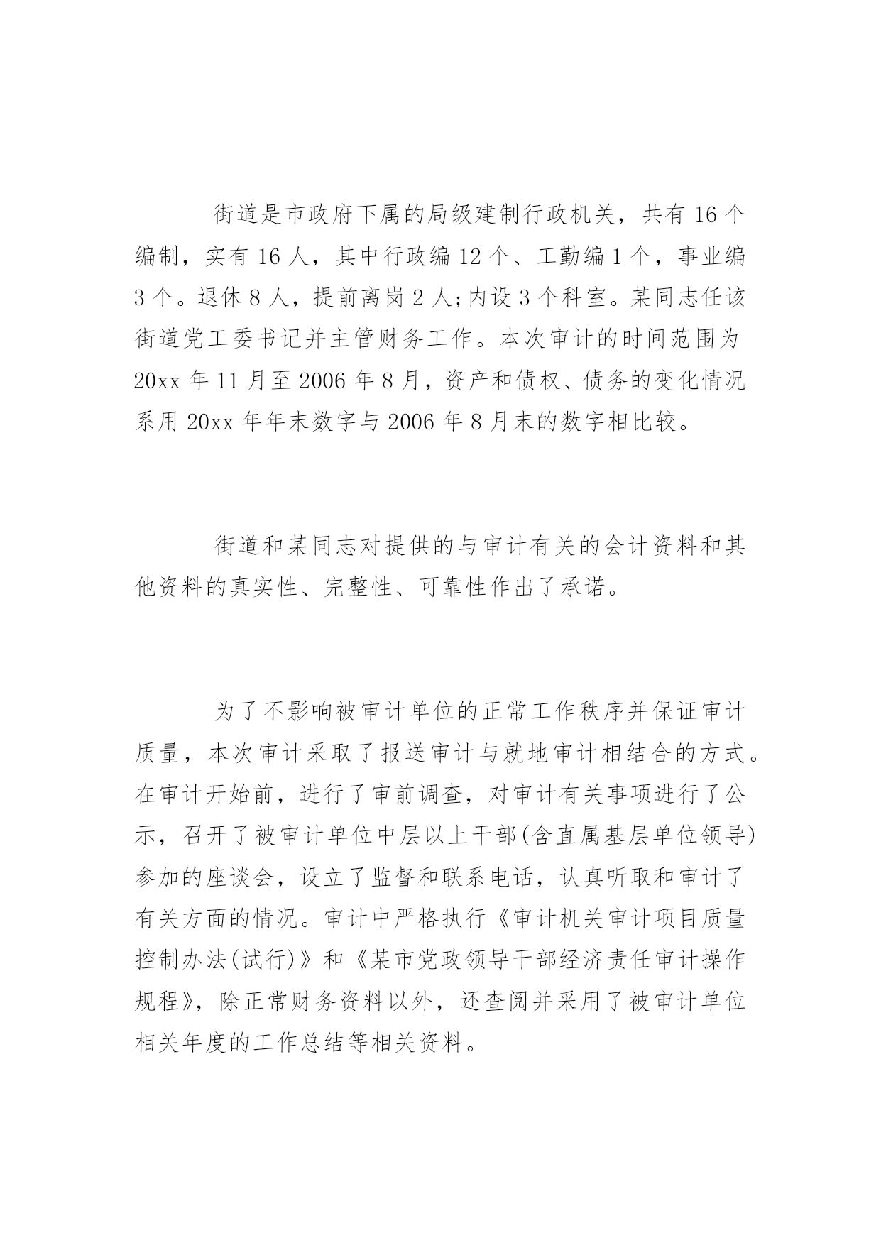 经济责任审计报告格式经济责任审计报告格式我国独立审计准则在吸收和借鉴国际审计准则、美国一般公认审计准则的基础上,规定了一个较为合理、较为科学、较为严谨的审计报告内容。下面的是小编分享的与经济责任审计报告格式有关的文章,欢迎继续访问应届毕业生公文网!经济责任审计报告格式一按照市委组织部的委托和我局今年的审计计划,依据市纪委、市委组织部和市审计局联合下发的《关于对全市乡局级领导干部经济责任审计的实施意见》的有关规定,我局派出审计组,于20xx年10月9日至10月19日对街道党工委书记某同志的任期经济责任进行了审计。审计工作得到某同志和街道领导及有关同志的积极配合,工作进展顺利,现将审计结果报告如下:一、基本情况街道是市政府下属的局级建制行政机关,共有16个编制,实有16人,其中行政编12个、工勤编1个,事业编3个。退休8人,提前离岗2人;内设3个科室。某同志任该街道党工委书记并主管财务工作。本次审计的时间范围为20xx年11月至2006年8月,资产和债权、债务的变化情况系用20xx年年末数字与2006年8月末的数字相比较。街道和某同志对提供的与审计有关的会计资料和其他资料的真实性、完整性、可靠性作出了承诺。为了不影响被审计单位的正常工作秩序并保证审计质量,本次审计采取了报送审计与就地审计相结合的方式。在审计开始前,进行了审前调查,对审计有关事项进行了公示,召开了被审计单位中层以上干部(含直属基层单位领导)参加的座谈会,设立了监督和联系电话,认真听取和审计了有关方面的情况。审计中严格执行《审计机关审计项目质量控制办法(试行)》和《某市党政领导干部经济责任审计操作规程》,除正常财务资料以外,还查阅并采用了被审计单位相关年度的工作总结等相关资料。二、审计结果(一)主要经济指标1、经费收支情况20xx年至2006年8月,收入合计2747120.00元,其中财政拨款2540986.00元,其他收入206134.00元。同期支出合计2661428.00元。收支相抵后,结余85692.00元。2、资产负债情况20xx年债权306702.00元,债务138438.00元。2006年8月债权307095.00元,比前期增加393元,增长0.13;债务126041.00元,比前期减少12397.00元,下降9;20xx年帐面无固定资产,2006年8月为85692.00元(不包括未入帐的办公楼)。3、主要工作完成情况20xx年以来,该街道每年的招商引资任务均为500万元,连年超额完成任务,其中20xx年超额50,2004年超额12,2005年超额33。三年来投资19.2万元,对街道所辖的46条大小巷路全部实现了硬覆盖,其中渣油路8条,水泥路3条,红砖路35条,彻底解决了辖区“行路难”的问题。并且通过种植标准花香路活动、卫生检查评比活动、冬季清雪等工作,保证了辖区的畅通、净化、美化,连年被市里评为城市管理先进单位。在市政府的帮助下投资40多万元,完成了两个社区办公用房和庭院的建设;投资10多万元,为社区配置了微机、打印机、扫描仪等现代化办公设备;投资4万多元,在两个社区都建起了图书室,配置了桌椅、书报等;投资20多万元,在两个社区建起了健身活动室。以上设施的建设和配置,拓展了社区服务范围,强化了社区功能,繁荣了社会文化,受到群众的拥护和欢迎,也得到上级领导机关的肯定。2005年被评为吉林市级社区建设示范街道。街道其他各项工作,也都取得可喜成绩。党建工作和精神文明工作年年受到市委表彰;与18个企业签定用工合同,开发就业岗位321个,输出劳务人员1480人(含境外1100多人),扶持创业成功项目5个,扶助微型企业48家,办理《再就业优惠证》237个。小额贷款52万元,被评为市再就业先进单位,所辖社区被市评为再就业模范社区;连续八年被市政府评为计划生育先进单位;社会治安秩序明显好转,被市评为“平安街道”;全街道986户,2142人纳入最低生活保障线,阳光慈善超市接到捐赠衣物2163件,米面2000斤,豆油300多斤,现金4000多元,安置下岗失业人员5000多人次,有近2400人得到了灵活就业补贴,解决了居民的生活困难,保障了居民的基本生活需求。(二)、审计中发现的问题1、违反《现金管理条例实施细则》第六条“开户单位之间的经济往来必须通过银行进行转帐结算”、第七条“结算起点为一千元”和第八条“除本条例第六条第(五)、(六)项外,开户单位支付给个人的'款项中,支付现金不得超过一千元”的规定,20xx年12月至2006年8月超出规定限额累计150666.29元。对此问题,责令对有关工作人员加强教育,防