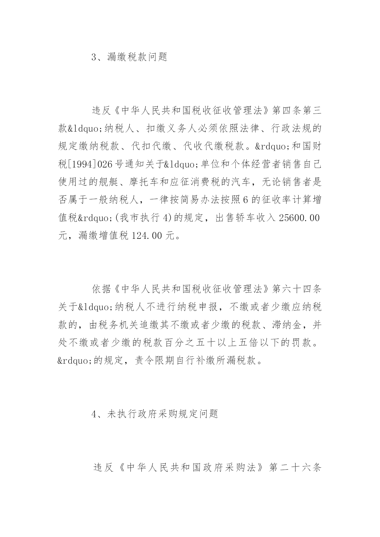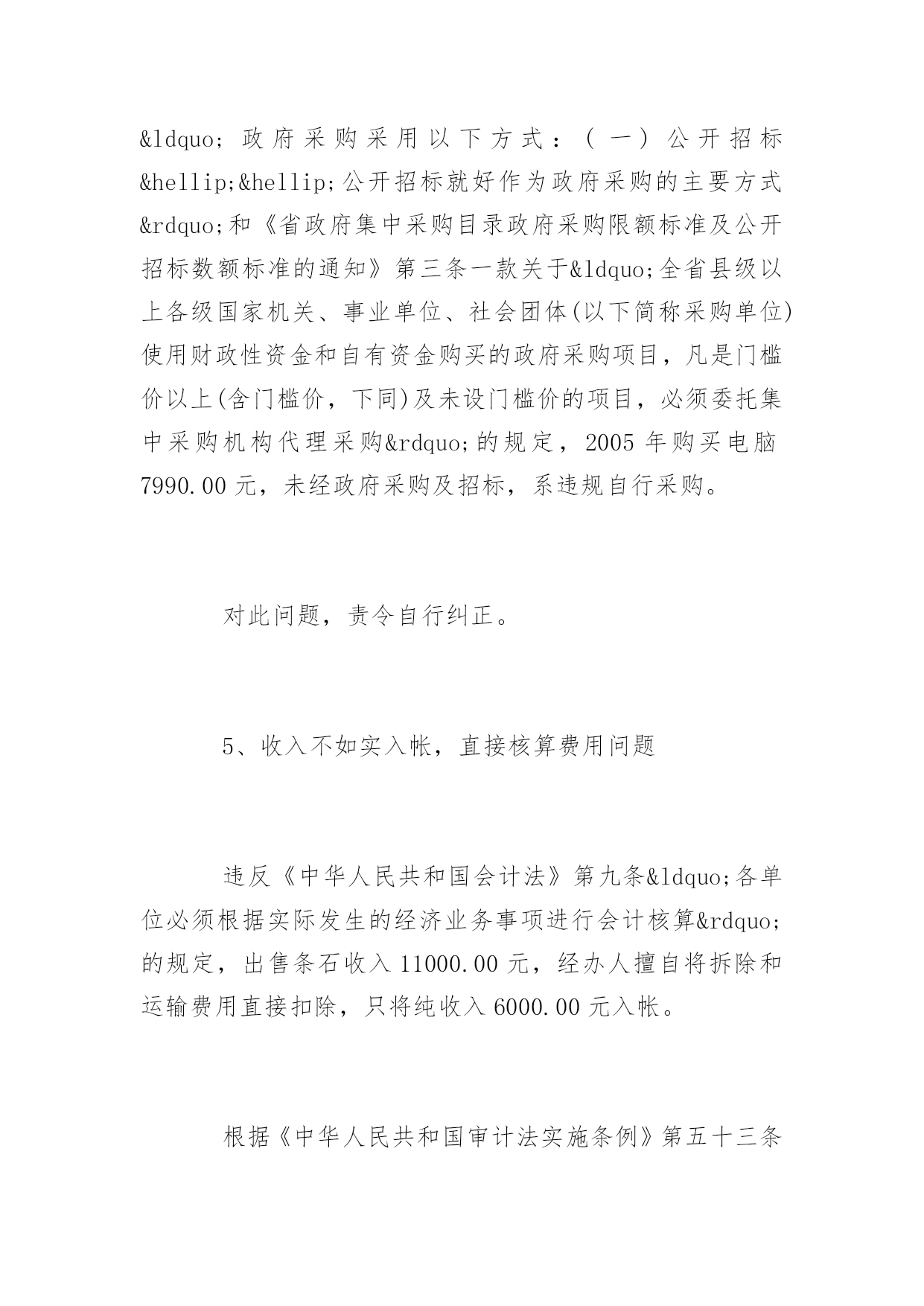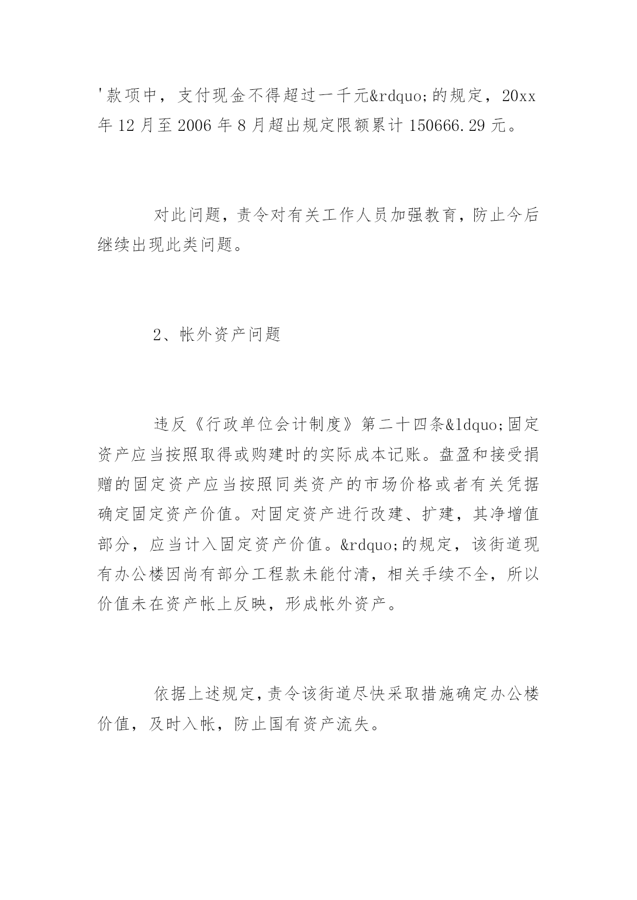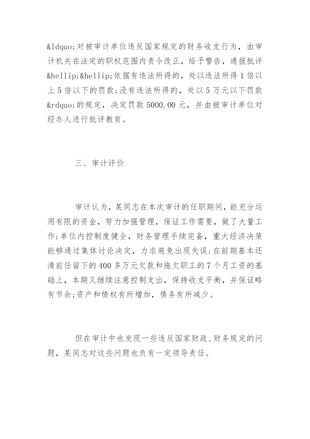 经济责任审计报告格式经济责任审计报告格式我国独立审计准则在吸收和借鉴国际审计准则、美国一般公认审计准则的基础上,规定了一个较为合理、较为科学、较为严谨的审计报告内容。下面的是小编分享的与经济责任审计报告格式有关的文章,欢迎继续访问应届毕业生公文网!经济责任审计报告格式一按照市委组织部的委托和我局今年的审计计划,依据市纪委、市委组织部和市审计局联合下发的《关于对全市乡局级领导干部经济责任审计的实施意见》的有关规定,我局派出审计组,于20xx年10月9日至10月19日对街道党工委书记某同志的任期经济责任进行了审计。审计工作得到某同志和街道领导及有关同志的积极配合,工作进展顺利,现将审计结果报告如下:一、基本情况街道是市政府下属的局级建制行政机关,共有16个编制,实有16人,其中行政编12个、工勤编1个,事业编3个。退休8人,提前离岗2人;内设3个科室。某同志任该街道党工委书记并主管财务工作。本次审计的时间范围为20xx年11月至2006年8月,资产和债权、债务的变化情况系用20xx年年末数字与2006年8月末的数字相比较。街道和某同志对提供的与审计有关的会计资料和其他资料的真实性、完整性、可靠性作出了承诺。为了不影响被审计单位的正常工作秩序并保证审计质量,本次审计采取了报送审计与就地审计相结合的方式。在审计开始前,进行了审前调查,对审计有关事项进行了公示,召开了被审计单位中层以上干部(含直属基层单位领导)参加的座谈会,设立了监督和联系电话,认真听取和审计了有关方面的情况。审计中严格执行《审计机关审计项目质量控制办法(试行)》和《某市党政领导干部经济责任审计操作规程》,除正常财务资料以外,还查阅并采用了被审计单位相关年度的工作总结等相关资料。二、审计结果(一)主要经济指标1、经费收支情况20xx年至2006年8月,收入合计2747120.00元,其中财政拨款2540986.00元,其他收入206134.00元。同期支出合计2661428.00元。收支相抵后,结余85692.00元。2、资产负债情况20xx年债权306702.00元,债务138438.00元。2006年8月债权307095.00元,比前期增加393元,增长0.13;债务126041.00元,比前期减少12397.00元,下降9;20xx年帐面无固定资产,2006年8月为85692.00元(不包括未入帐的办公楼)。3、主要工作完成情况20xx年以来,该街道每年的招商引资任务均为500万元,连年超额完成任务,其中20xx年超额50,2004年超额12,2005年超额33。三年来投资19.2万元,对街道所辖的46条大小巷路全部实现了硬覆盖,其中渣油路8条,水泥路3条,红砖路35条,彻底解决了辖区“行路难”的问题。并且通过种植标准花香路活动、卫生检查评比活动、冬季清雪等工作,保证了辖区的畅通、净化、美化,连年被市里评为城市管理先进单位。在市政府的帮助下投资40多万元,完成了两个社区办公用房和庭院的建设;投资10多万元,为社区配置了微机、打印机、扫描仪等现代化办公设备;投资4万多元,在两个社区都建起了图书室,配置了桌椅、书报等;投资20多万元,在两个社区建起了健身活动室。以上设施的建设和配置,拓展了社区服务范围,强化了社区功能,繁荣了社会文化,受到群众的拥护和欢迎,也得到上级领导机关的肯定。2005年被评为吉林市级社区建设示范街道。街道其他各项工作,也都取得可喜成绩。党建工作和精神文明工作年年受到市委表彰;与18个企业签定用工合同,开发就业岗位321个,输出劳务人员1480人(含境外1100多人),扶持创业成功项目5个,扶助微型企业48家,办理《再就业优惠证》237个。小额贷款52万元,被评为市再就业先进单位,所辖社区被市评为再就业模范社区;连续八年被市政府评为计划生育先进单位;社会治安秩序明显好转,被市评为“平安街道”;全街道986户,2142人纳入最低生活保障线,阳光慈善超市接到捐赠衣物2163件,米面2000斤,豆油300多斤,现金4000多元,安置下岗失业人员5000多人次,有近2400人得到了灵活就业补贴,解决了居民的生活困难,保障了居民的基本生活需求。(二)、审计中发现的问题1、违反《现金管理条例实施细则》第六条“开户单位之间的经济往来必须通过银行进行转帐结算”、第七条“结算起点为一千元”和第八条“除本条例第六条第(五)、(六)项外,开户单位支付给个人的'款项中,支付现金不得超过一千元”的规定,20xx年12月至2006年8月超出规定限额累计150666.29元。对此问题,责令对有关工作人员加强教育,防