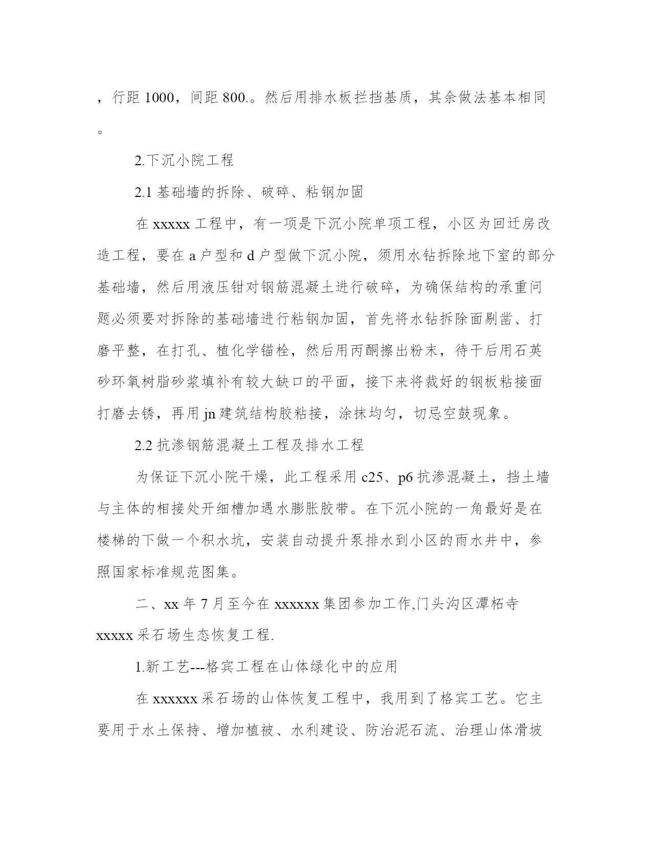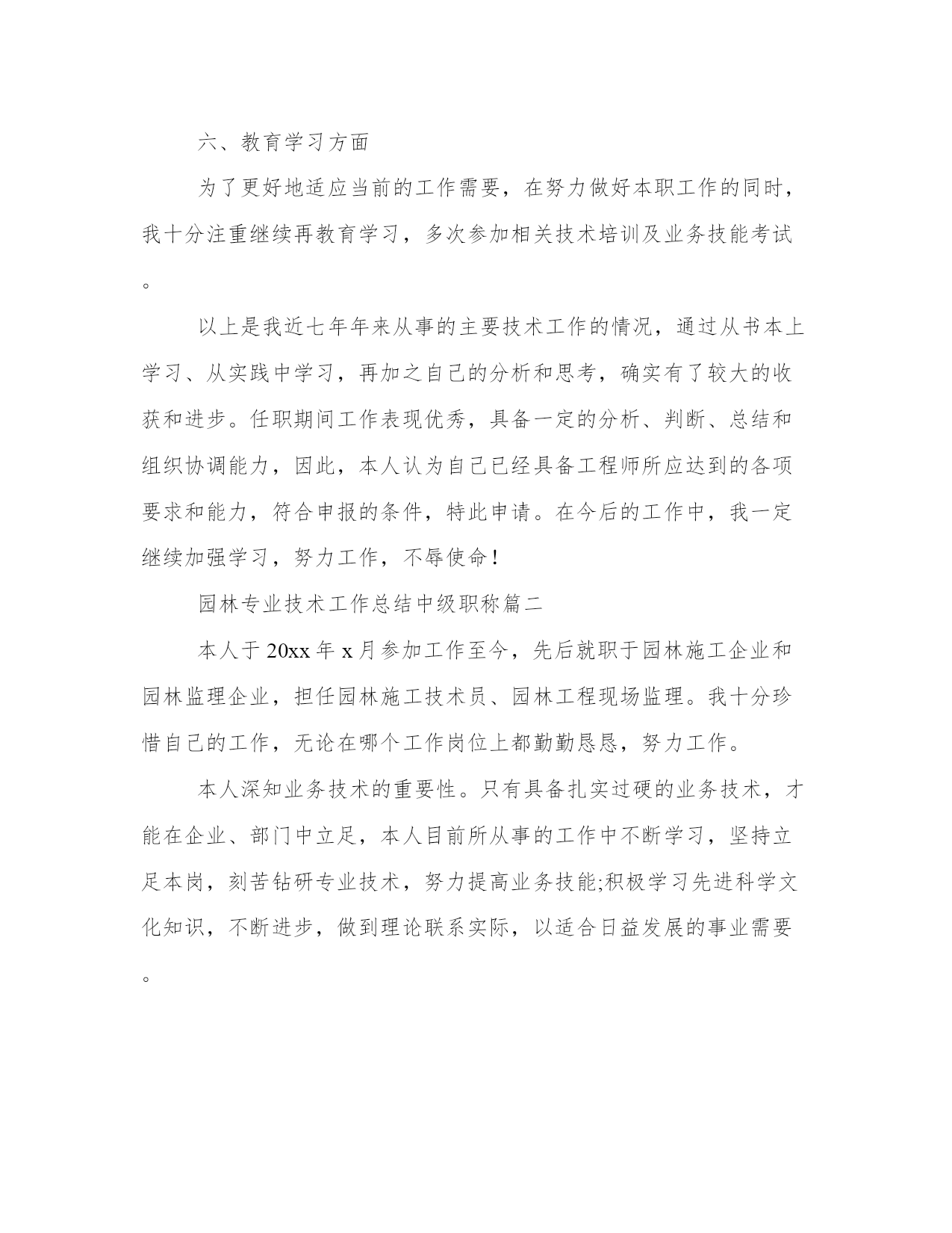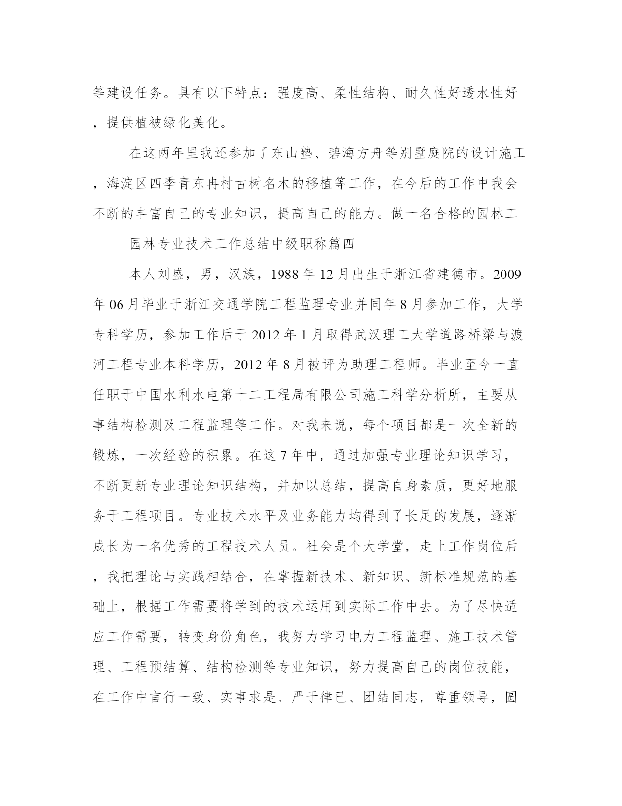 精选园林专业技术工作总结中级职称(通用15篇)一份好的总结应该包含实际情况的描述、分析和反思,以及对未来改进和提升的规划。总结时可以结合图表和数据,使得总结更加具体有效。以下是对过去一段时间内的工作总结,供大家参考借鉴。园林专业技术工作总结中级职称篇一本人xxx,女,汉族,1988年7月出生于哈尔滨市。2011年7月毕业于黑龙江哈尔滨师范大学对外汉语英语专业并同年8月参加工作,大学专科学历,2012年取得助理工程师资格证书。在工作的六年时间里,在各位领导和同事的支持和帮助下,获得了丰富的学习机会,得到了宽阔的锻炼平台,自己的工作技能、学习能力、沟通协调能力、个人综合素质等各方面都得到一定程度的锻炼和提高。毕业后一直任职于项目部内业技术员一职,主要工程内页的书写录入等工作,2017年调入公司办公室。对我来说,每个项目都是一次全新的锻炼,一次经验的积累。在这六年中,通过加强专业理论知识学习,不断更新专业理论知识结构,并加以总结,提高自身素质,更好地服务于工程项目。专业技术水平及业务能力均得到了长足的发展,下面就我本人这六年来的工作总结如下:一、思想水平方面在工作中,实事求是,有强烈的工作事业心,敢于负责、勇于创新。为人忠诚老实,尊敬领导、团结同志、生活俭朴、廉洁奉公。在工作、学习和生活中,始终按照党员的标准严格要求自己,不断加强自身修养,服从公司安排,工作任劳任怨,从不计较个人得失。在自己六年的内页技术员和办公室职员的工作经历中,我也曾面临过各种选择,也遇到过难题,但我最终都义无反顾地选择了建筑行业,并作为我的终身职业。二、组织协调方面在实际工作中,我能够运用科学的立场、观点和方法去分析、分析、解决问题。注重与同事们的团结协作,与同事们相处融洽,工作认真主动,按时按量的完成本职工作。尊重客观事实,服从领导、科学规范,全力配合好各个项目的工作。三、学识水平方面至参加工作以来,我一贯重视自己的专业技术知识的学习,认真系统地学习掌握了本专业的专业知识,并了解学习了相关专业的有关专业知识及现代科学管理知识,加强了与本专业有关的现行技术标准、技术规程、安全规程等规章制度及国家有关的法律、法规的学习了解。关注国内外施工、设计科研的技术水平、市场信息和发展趋势,关心国内、国际经济形势、政治经济政策,关注建筑工程法规对本企业的影响以及建筑以后的走向。努力学习当前的新技术、新工艺,积极主动收集有关的工程结构检测、设计、施工、监理等方面技术资料。以高标准的要求严格要求自已,努力争取成为一名优秀的全面的专业技术人才。四、工作能力方面能熟练掌握本专业的程序、工作内容和公司工作标准,并按此开展工作。在开展工作时以规范为准则,从实际出发,灵活处理。在实际工作中能拓展专业知识,胜任本专业工作,能分析和较好地解决本专业业务问题;认真按公司要求开展工作,并配合公司各部门的管理、检查等工作;维护公司利益,以公司大局为重。办公室工作方面:主要负责印信的管理工作,公司志、年鉴的编纂工作,以及大型会议的筹备工作等,能够完成领导交给的各项工作任务,具备较强的分析问题和解决问题能力。不断吸取新知识、新技术、新工艺的前提下,勇于技术创新,并不断总结成功经验。五、工作业绩方面自2011年参加工作以来,我立足本职,开拓进取,扎实工作。主要工作业绩如下:2011年至2012年,在龙捷市政公司第三项目部哈阿长江路打通工程a6合同段任内业技术员。2012年至2014年,在龙捷市政公司第三项目部嵩山路改造工程任内业技术员。2013年至2014年,在龙捷市政公司第三项目部哈双道路维修工程任内业技术员。2014、2015年在龙捷市政公司第三项目部密兴高速a6合同段任内业技术员。2015、2016年在龙捷市政公司第三项目部北富高速公路a12合同段任内业技术员。2017年至今,在龙捷市政公司机关办公室任职。工作中认真负责,能够完成领导交给的各项工作任务。六、教育学习方面为了更好地适应当前的工作需要,在努力做好本职工作的同时,我十分注重继续再教育学习,多次参加相关技术培训及业务技能考试。以上是我近七年年来从事的主要技术工作的情况,通过从书本上学习、从实践中学习,再加之自己的分析和思考,确实有了较大的收获和进步。任职期间工作表现优秀,具备一定的分析、判断、总结和组织协调能力,因此,本人认为自己已经具备工程师所应达到的各项要求和能力,符合申报的条件,特此申请。在今后的工作中,我一定继续加强学习,努力工作,不辱使命!园林专业技术工作总结中级职称篇二本人于20xx年x月参加工作至今,先后就职于园林施工企业和园林监理企业,担任园林施工技术员、园林工程现场监理。我十分珍惜自己的工作,无论在哪个工作岗位上都勤勤恳恳,努力工作。本人深知业务技术的重要性。只有具备扎实过硬的