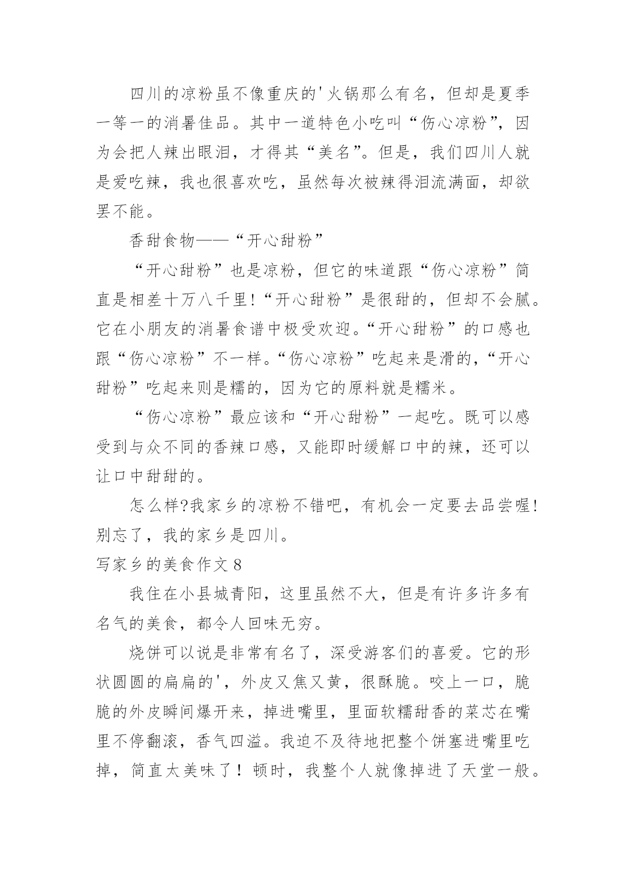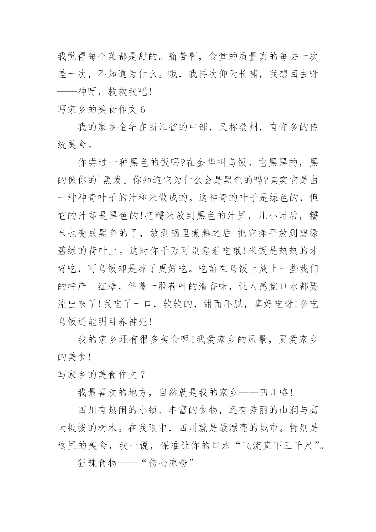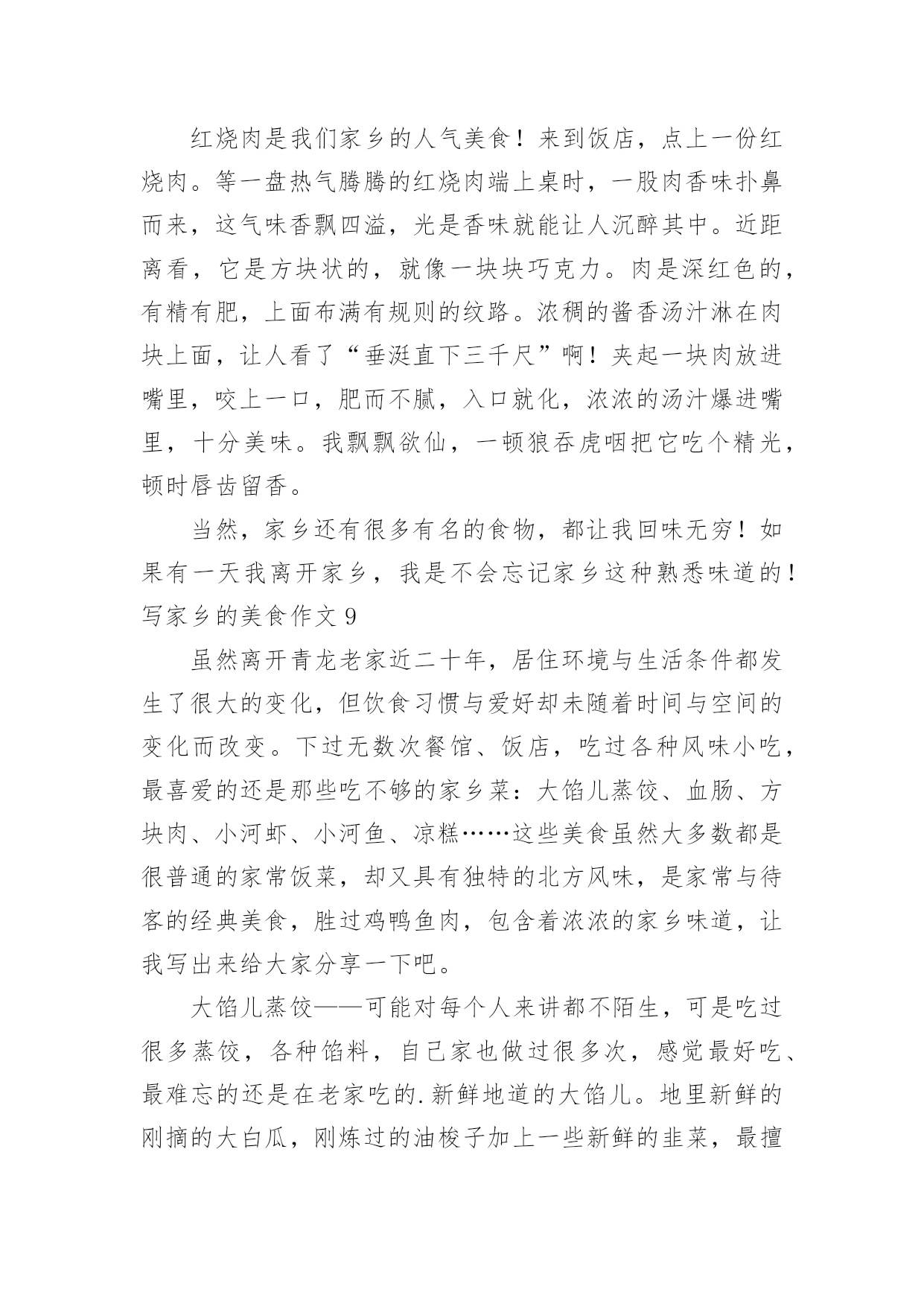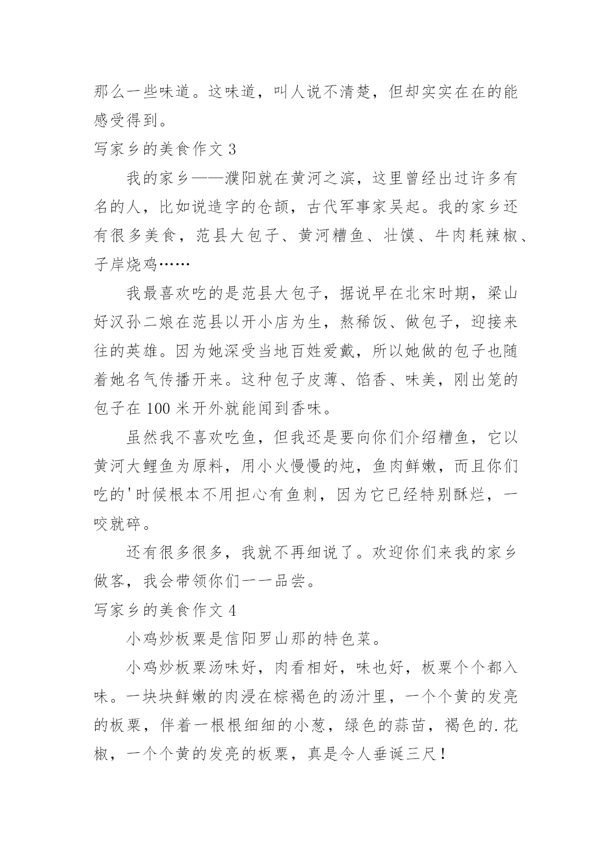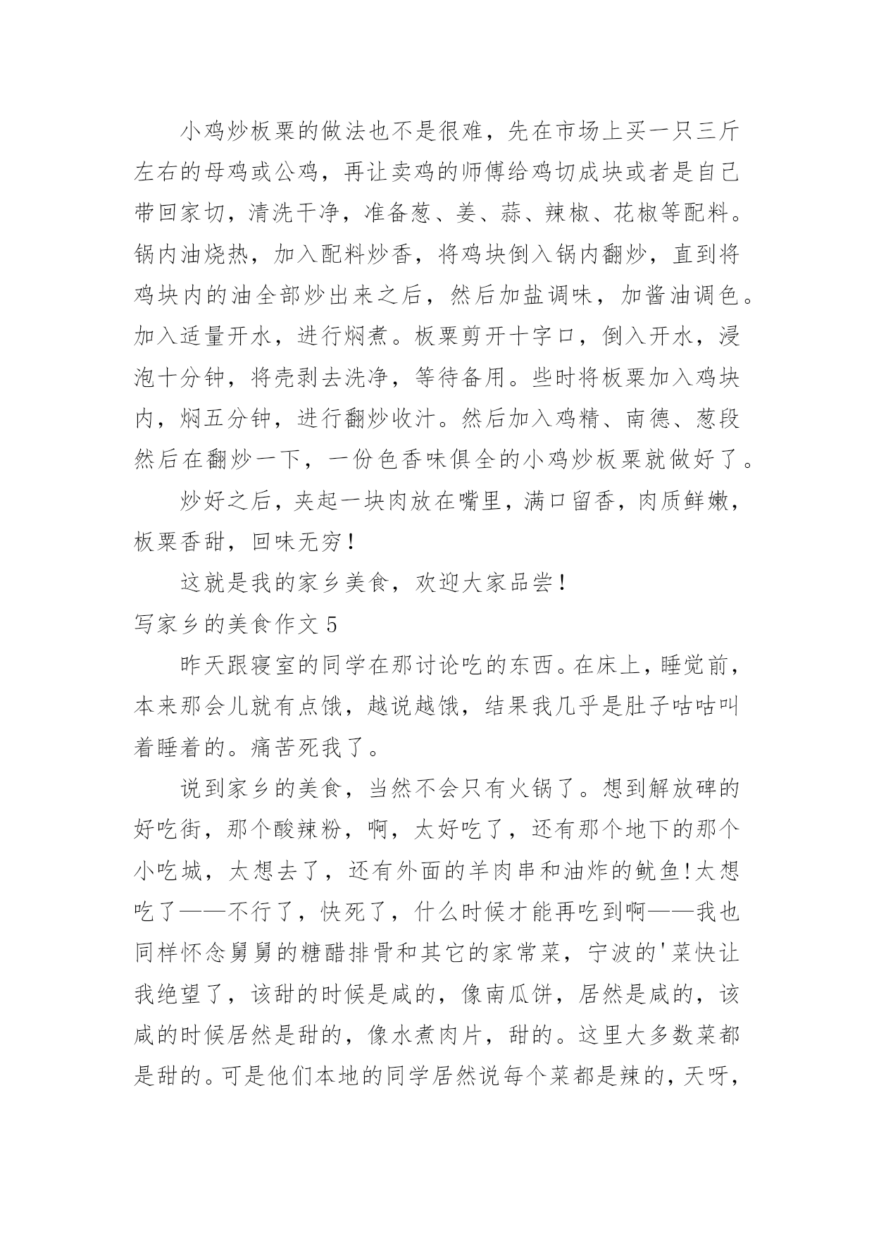 写家乡的美食作文写家乡的美食作文在学习、工作乃至生活中,大家总少不了接触作文吧,借助作文人们可以反映客观事物、表达思想感情、传递知识信息。那么一般作文是怎么写的呢?下面是小编为大家整理的写家乡的美食作文,希望能够帮助到大家。写家乡的美食作文1我特别爱吃,尤其爱吃小吃,至今最令我怀念的是泡菜,四川泡菜。其实四川的美食多的很,誉满全国的有担担面,夫妻肺片,麻辣烫,赖汤圆,凉面,凉粉,豆花。可我最喜欢的就是泡菜。四川的泡菜和其他地方的咸菜有所不同,他制作的过程非常讲究,特别需要干净,不能有一点的油性。菜要洗干净,手要消毒,就连筷子,碗碟都必须用开水烫过,总之,过程非常繁琐。我爸爸曾经拜四川人为师也没学到精髓,做了几次都没有成功,但我又特别爱吃这口,无奈之下,只好要别人家做好的。妈妈的同事王老师是个做泡菜的高手,是我的体育老师,乒乓球打的好。因为我嘴甜,夸奖她的.泡菜好吃,她一高兴就承诺以后我的泡菜她包了。泡菜泡好了,王老师就会在我家楼下喊我:张卫,拿泡菜了。我就会找一个最大的铝饭盒,一流小跑的去她家。王老师的泡江豆,泡萝卜皮是我最喜欢的。酸酸的,辣辣的,脆脆的。熬上一锅稠稠大米稀饭,从食堂买个馒头,再就上泡菜,那真是开胃极了。就照这个吃法,我能干掉2个大馒头。我小时候,还属于物资短缺的年代,吃什么都觉得香。虽然,现在条件好了,什么吃都能买到。可是,我还是怀念王老师的泡菜,童年的味道是永远都忘不了的。写家乡的美食作文2说起西府美食,我的第一印象就是肉夹馍了。我妈妈的故乡在西府要地宝鸡市,那里住着我亲爱的姥姥和姥爷,有我孩提时代的全部美好记忆,因为在正式上学之前,我都是在那你度过的。隔三差五,姥姥和姥爷都会带我去当地一家非常有特色的饭店令氏家外家吃饭,我最爱吃那里的肉夹馍了。每次去的时候都是姥爷先出发,我和姥姥随后出发。我一只手被姥姥牵着,一只手拿着我心爱的玩具,沿着马路东瞅瞅,西看看,晃晃悠悠地向饭店走去。因为你根本不用着急,这个饭店太受人欢迎了,必须要提前去排队占位才有可能买得上。当我和姥姥一到饭店,就会看到姥爷正笑眯眯地坐在一个桌子旁,面前摆着热气腾腾的饭菜,还有我最爱吃的肉夹馍。据说这里的肉夹馍已有5000年的历史了,相传是周武王为了方便将士们行军打仗特意发明的中式三明治。肉夹馍选料独特,馍外焦里酥,肉肥而不腻,味道真是杠杠滴。后来为了上学,我就来到西安的`爸爸妈妈身边,也就很少再能吃到那美味的肉夹馍了。虽说西安也有很多肉夹馍可买,甚至也有令氏家外家的分店,但这里的肉夹馍总是少那么一些味道。这味道,叫人说不清楚,但却实实在在的能感受得到。写家乡的美食作文3我的家乡——濮阳就在黄河之滨,这里曾经出过许多有名的人,比如说造字的仓颉,古代军事家吴起。我的家乡还有很多美食,范县大包子、黄河糟鱼、壮馍、牛肉耗辣椒、子岸烧鸡……我最喜欢吃的是范县大包子,据说早在北宋时期,梁山好汉孙二娘在范县以开小店为生,熬稀饭、做包子,迎接来往的英雄。因为她深受当地百姓爱戴,所以她做的包子也随着她名气传播开来。这种包子皮薄、馅香、味美,刚出笼的包子在100米开外就能闻到香味。虽然我不喜欢吃鱼,但我还是要向你们介绍糟鱼,它以黄河大鲤鱼为原料,用小火慢慢的炖,鱼肉鲜嫩,而且你们吃的'时候根本不用担心有鱼刺,因为它已经特别酥烂,一咬就碎。还有很多很多,我就不再细说了。欢迎你们来我的家乡做客,我会带领你们一一品尝。写家乡的美食作文4小鸡炒板粟是信阳罗山那的特色菜。小鸡炒板粟汤味好,肉看相好,味也好,板粟个个都入味。一块块鲜嫩的肉浸在棕褐色的汤汁里,一个个黄的发亮的板粟,伴着一根根细细的小葱,绿色的蒜苗,褐色的.花椒,一个个黄的发亮的板粟,真是令人垂诞三尺!小鸡炒板粟的做法也不是很难,先在市场上买一只三斤左右的母鸡或公鸡,再让卖鸡的师傅给鸡切成块或者是自己带回家切,清洗干净,准备葱、姜、蒜、辣椒、花椒等配料。锅内油烧热,加入配料炒香,将鸡块倒入锅内翻炒,直到将鸡块内的油全部炒出来之后,然后加盐调味,加酱油调色。加入适量开水,进行焖煮。板粟剪开十字口,倒入开水,浸泡十分钟,将壳剥去洗净,等待备用。些时将板粟加入鸡块内,焖五分钟,进行翻炒收汁。然后加入鸡精、南德、葱段然后在翻炒一下,一份色香味俱全的小鸡炒板粟就做好了。炒好之后,夹起一块肉放在嘴里,满口留香,肉质鲜嫩,板粟香甜,回味无穷!这就是我的家乡美食,欢迎大家品尝!写家乡的美食作文5昨天跟寝室的同学在那讨论吃的东西。在床上,睡觉前,本来那会儿就有点饿,越说越饿,结果我几乎是肚子咕咕叫着睡着的。痛苦死我了。说到家乡的美食,当然不会只有火锅了。想到解放碑的好吃街,那个酸辣粉,啊,太好吃了,还有那个地下的那个小吃城,太想去了,还有外面的羊肉串和油炸的鱿鱼!太想吃了——不行了,快死了,什么时候才能再吃到啊——我也同样怀