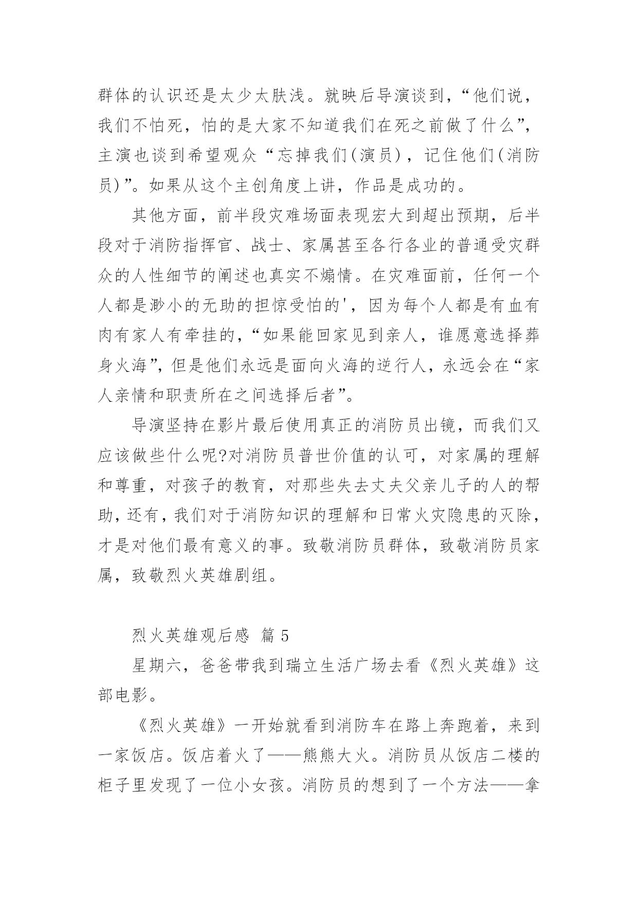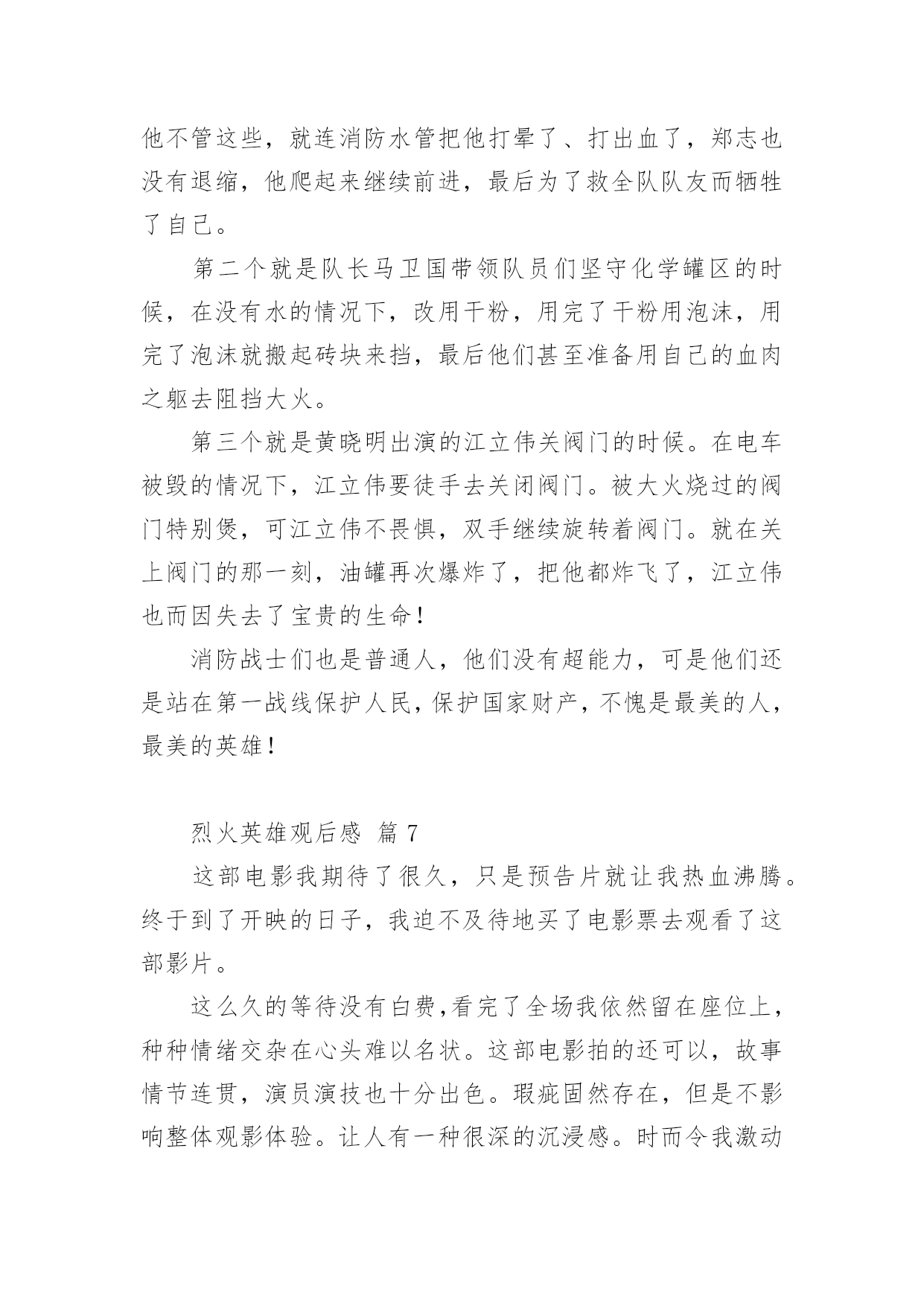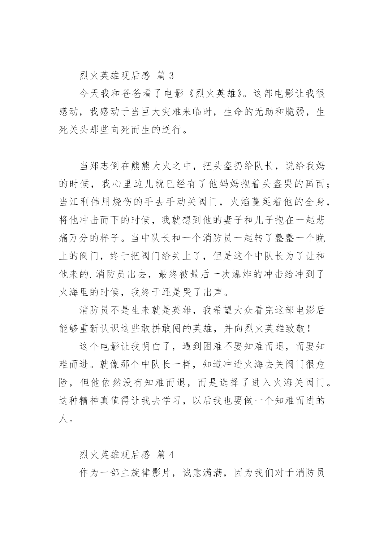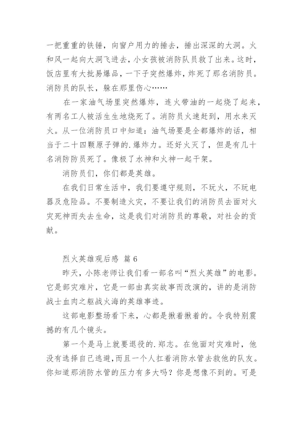 烈火英雄观后感烈火英雄观后感【经典】看完一部经典作品以后,这次观看让你心中有什么感想呢?这时候,最关键的观后感怎么能落下!那要怎么写好观后感呢?以下是小编为大家收集的烈火英雄观后感,仅供参考,希望能够帮助到大家。烈火英雄观后感篇1《烈火英雄》是中国电影史上第一次大规模聚焦消防员群体的影片,刚上映的短短几天就深受观众的喜爱。《烈火英雄》主要以大连“7·16”输油管道爆炸事故为背景,将当时场景进行了还原,详细写出了消防员在困难中临危不惧的'英勇形象。《烈火英雄》场滨海城市石油码头的管道爆炸,牵连了整个原油储存区,一座储油量高达10万立方米的储油罐已经爆炸并且泄露。泄露的原油随时可能引爆临近的油罐,火灾不断升级,爆炸接连发生,然而这还都不是最恐怖的,火场不远处伫立的危险化学物储藏区,像跃跃欲试的魔鬼等待着被点燃,刹那便能带走几百万人的生命。现在的时代需要英雄,他们一个个用血肉之躯与灾难抗争。所以,我们遇到事情一定要勇往直前,不能退缩。我们要勇敢向前冲,我们要做一身正气的好汉,不要当跪地求饶的懦夫。烈火英雄观后感篇2这星期星期六,妈妈带我看了一部电影,名叫《烈火英雄》,里面写了消防员救火的事件。电影刚开始,就说一家火锅着火了,里面却有一个小女孩被困在熊熊大火中,队长江立伟不管三七二十一直接冲了进去救小孩,不料突然一个大爆炸就把他撞飞了。后面就说因为外国故意搞我们中国的气油室,本来两个师傅在关闸门的时候,油浊突然出来,就引起了火灾,正在训练的消防员听到警报迅速往消防车上跑,正在陪儿子参加运动会的江立伟也迅速赶到,他们一起扑火了。而师傅突然说只要最大的气油室爆炸,那么就会影响到旁边的化学室爆炸。这个气味让人闻十几秒就会头晕,况且闻一分钟就只能等死了。而徐小斌老婆却说不止这样,还会更严重,说只要化学室爆炸,那么就相当于是二十四颗原子弹一起爆炸,到时候全市都要灰飞烟灭。最后两人牺牲。其中一个是为了救火而牺牲,另一个名叫徐小文的消防员因为远程水管的`清理,脚被垃圾给钩住了,溺水而牺牲。他们的牺牲真可惜。我们今后不能往海里乱扔垃圾了。消防员为人们造福,宁愿舍小家,为大家,他们不愿意在熊熊大火中看到一个人灰飞烟灭,消防员的坚精神值得我们所有人学习。我们也不能玩火,这样也能让消防员减少一些负担。烈火英雄观后感篇3今天我和爸爸看了电影《烈火英雄》。这部电影让我很感动,我感动于当巨大灾难来临时,生命的无助和脆弱,生死关头那些向死而生的逆行。当郑志倒在熊熊大火之中,把头盔扔给队长,说给我妈的时候,我心里边儿就已经有了他妈妈抱着头盔哭的画面;当江利伟用烧伤的手去手动关阀门,火焰蔓延着他的全身,将他冲击而下的时候,我就想到他的妻子和儿子抱在一起悲痛万分的样子。当中队长和一个消防员一起转了整整一个晚上的阀门,终于把阀门给关上了,但是这个中队长为了让和他来的.消防员出去,最终被最后一次爆炸的冲击给冲到了火海里的时候,我终于还是哭了出声。消防员不是生来就是英雄,我希望大众看完这部电影后能够重新认识这些敢拼敢闯的英雄,并向烈火英雄致敬!这个电影让我明白了,遇到困难不要知难而退,而要知难而进。就像那个中队长一样,知道冲进火海去关阀门很危险,但他依然没有知难而退,而是选择了进入火海关阀门。这种精神真值得让我去学习,以后我也要做一个知难而进的人。烈火英雄观后感篇4作为一部主旋律影片,诚意满满,因为我们对于消防员群体的认识还是太少太肤浅。就映后导演谈到,“他们说,我们不怕死,怕的是大家不知道我们在死之前做了什么”,主演也谈到希望观众“忘掉我们(演员),记住他们(消防员)”。如果从这个主创角度上讲,作品是成功的。其他方面,前半段灾难场面表现宏大到超出预期,后半段对于消防指挥官、战士、家属甚至各行各业的普通受灾群众的人性细节的阐述也真实不煽情。在灾难面前,任何一个人都是渺小的无助的担惊受怕的',因为每个人都是有血有肉有家人有牵挂的,“如果能回家见到亲人,谁愿意选择葬身火海”,但是他们永远是面向火海的逆行人,永远会在“家人亲情和职责所在之间选择后者”。导演坚持在影片最后使用真正的消防员出镜,而我们又应该做些什么呢?对消防员普世价值的认可,对家属的理解和尊重,对孩子的教育,对那些失去丈夫父亲儿子的人的帮助,还有,我们对于消防知识的理解和日常火灾隐患的灭除,才是对他们最有意义的事。致敬消防员群体,致敬消防员家属,致敬烈火英雄剧组。烈火英雄观后感篇5星期六,爸爸带我到瑞立生活广场去看《烈火英雄》这部电影。《烈火英雄》一开始就看到消防车在路上奔跑着,来到一家饭店。饭店着火了——熊熊大火。消防员从饭店二楼的柜子里发现了一位小女孩。消防员的想到了一个方法——拿一把重重的铁锤,向窗户用力的捶去,捶出深深的大洞。火和风一起向大洞飞进去,小女孩被消防队员救了出来。这时,饭店里有大批易爆品,一下子
