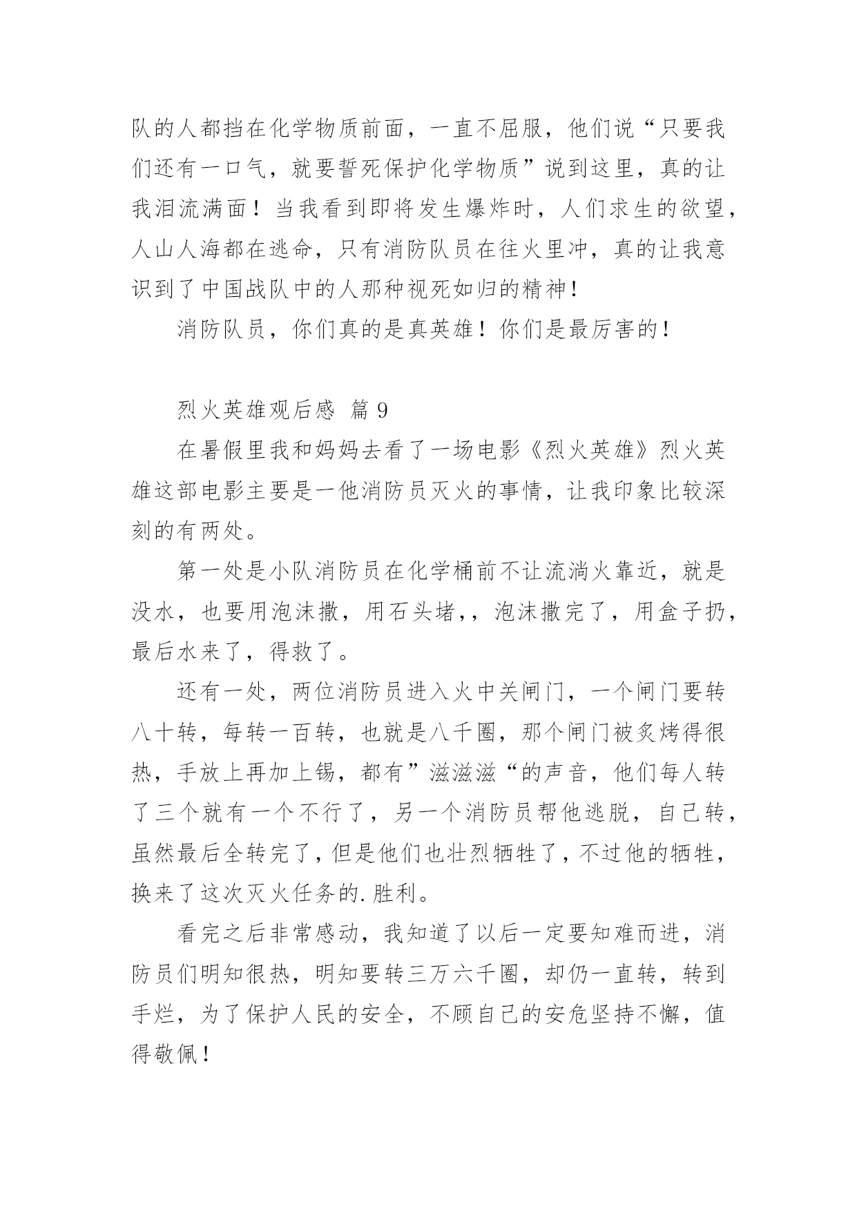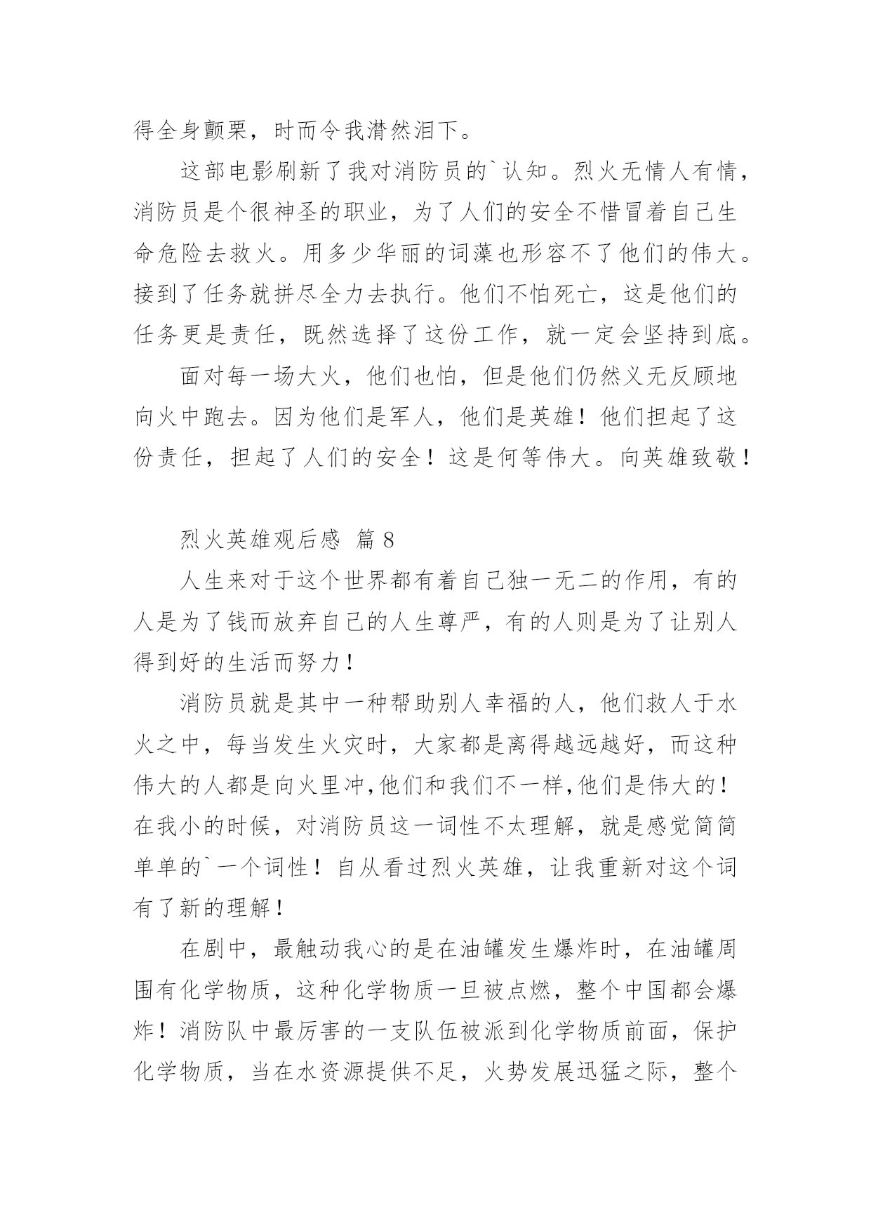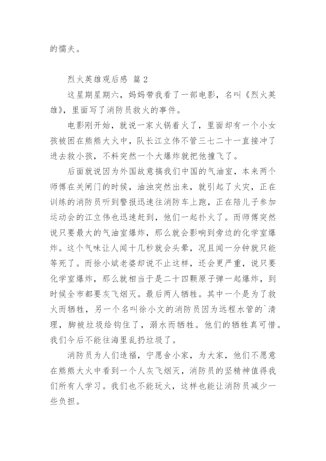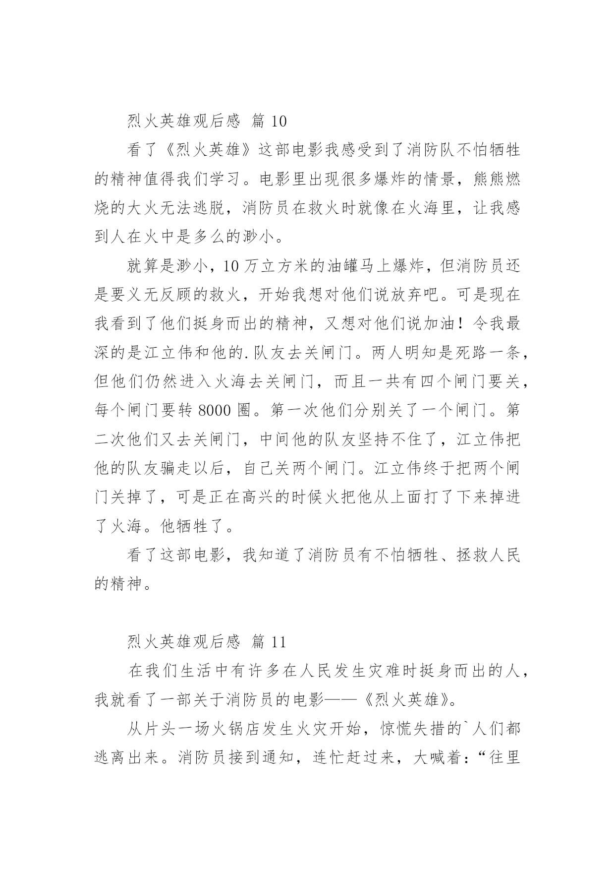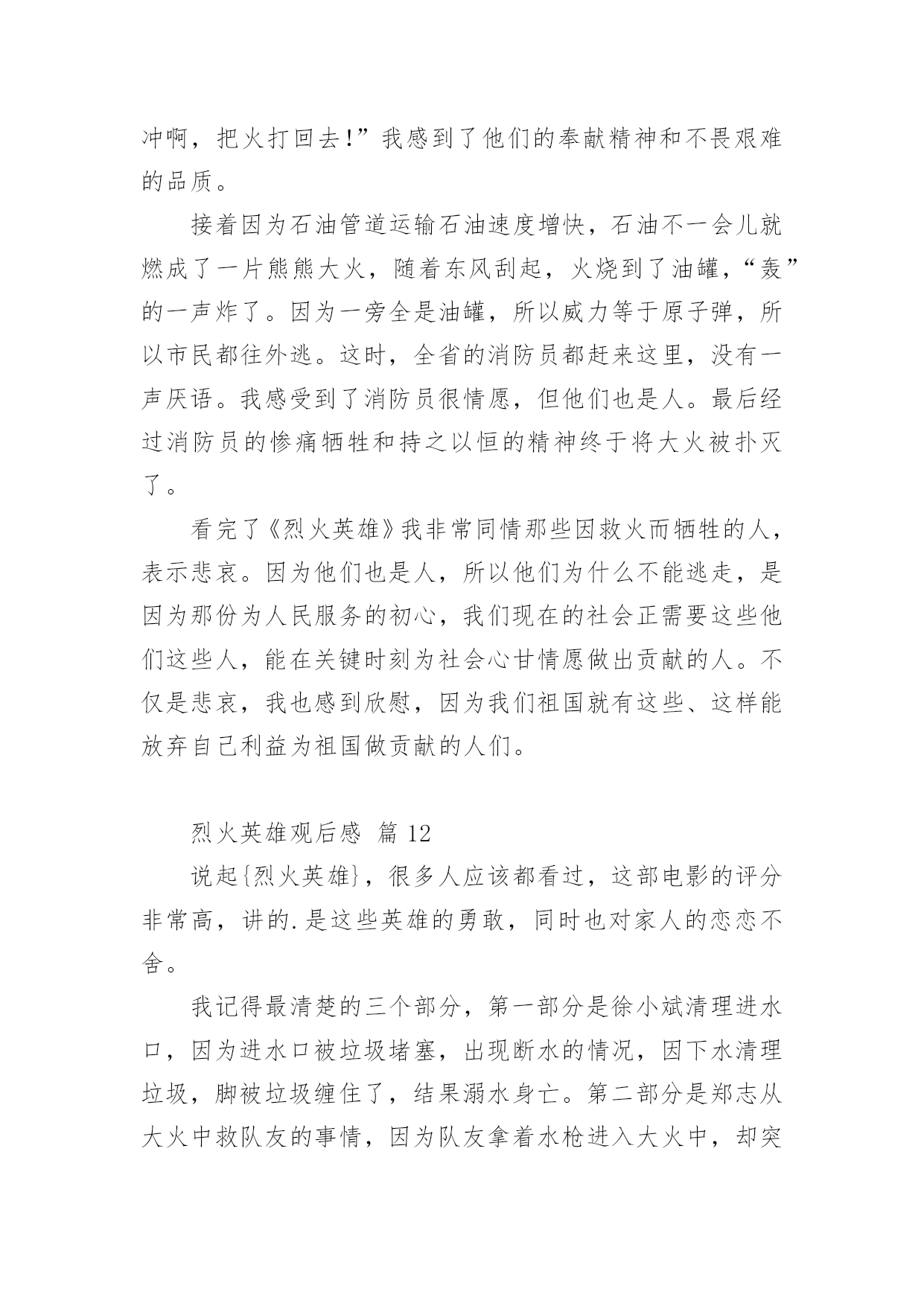 烈火英雄观后感烈火英雄观后感【经典】看完一部经典作品以后,这次观看让你心中有什么感想呢?这时候,最关键的观后感怎么能落下!那要怎么写好观后感呢?以下是小编为大家收集的烈火英雄观后感,仅供参考,希望能够帮助到大家。烈火英雄观后感篇1《烈火英雄》是中国电影史上第一次大规模聚焦消防员群体的影片,刚上映的短短几天就深受观众的喜爱。《烈火英雄》主要以大连“7·16”输油管道爆炸事故为背景,将当时场景进行了还原,详细写出了消防员在困难中临危不惧的'英勇形象。《烈火英雄》场滨海城市石油码头的管道爆炸,牵连了整个原油储存区,一座储油量高达10万立方米的储油罐已经爆炸并且泄露。泄露的原油随时可能引爆临近的油罐,火灾不断升级,爆炸接连发生,然而这还都不是最恐怖的,火场不远处伫立的危险化学物储藏区,像跃跃欲试的魔鬼等待着被点燃,刹那便能带走几百万人的生命。现在的时代需要英雄,他们一个个用血肉之躯与灾难抗争。所以,我们遇到事情一定要勇往直前,不能退缩。我们要勇敢向前冲,我们要做一身正气的好汉,不要当跪地求饶的懦夫。烈火英雄观后感篇2这星期星期六,妈妈带我看了一部电影,名叫《烈火英雄》,里面写了消防员救火的事件。电影刚开始,就说一家火锅着火了,里面却有一个小女孩被困在熊熊大火中,队长江立伟不管三七二十一直接冲了进去救小孩,不料突然一个大爆炸就把他撞飞了。后面就说因为外国故意搞我们中国的气油室,本来两个师傅在关闸门的时候,油浊突然出来,就引起了火灾,正在训练的消防员听到警报迅速往消防车上跑,正在陪儿子参加运动会的江立伟也迅速赶到,他们一起扑火了。而师傅突然说只要最大的气油室爆炸,那么就会影响到旁边的化学室爆炸。这个气味让人闻十几秒就会头晕,况且闻一分钟就只能等死了。而徐小斌老婆却说不止这样,还会更严重,说只要化学室爆炸,那么就相当于是二十四颗原子弹一起爆炸,到时候全市都要灰飞烟灭。最后两人牺牲。其中一个是为了救火而牺牲,另一个名叫徐小文的消防员因为远程水管的`清理,脚被垃圾给钩住了,溺水而牺牲。他们的牺牲真可惜。我们今后不能往海里乱扔垃圾了。消防员为人们造福,宁愿舍小家,为大家,他们不愿意在熊熊大火中看到一个人灰飞烟灭,消防员的坚精神值得我们所有人学习。我们也不能玩火,这样也能让消防员减少一些负担。烈火英雄观后感篇3今天我和爸爸看了电影《烈火英雄》。这部电影让我很感动,我感动于当巨大灾难来临时,生命的无助和脆弱,生死关头那些向死而生的逆行。当郑志倒在熊熊大火之中,把头盔扔给队长,说给我妈的时候,我心里边儿就已经有了他妈妈抱着头盔哭的画面;当江利伟用烧伤的手去手动关阀门,火焰蔓延着他的全身,将他冲击而下的时候,我就想到他的妻子和儿子抱在一起悲痛万分的样子。当中队长和一个消防员一起转了整整一个晚上的阀门,终于把阀门给关上了,但是这个中队长为了让和他来的.消防员出去,最终被最后一次爆炸的冲击给冲到了火海里的时候,我终于还是哭了出声。消防员不是生来就是英雄,我希望大众看完这部电影后能够重新认识这些敢拼敢闯的英雄,并向烈火英雄致敬!这个电影让我明白了,遇到困难不要知难而退,而要知难而进。就像那个中队长一样,知道冲进火海去关阀门很危险,但他依然没有知难而退,而是选择了进入火海关阀门。这种精神真值得让我去学习,以后我也要做一个知难而进的人。烈火英雄观后感篇4作为一部主旋律影片,诚意满满,因为我们对于消防员群体的认识还是太少太肤浅。就映后导演谈到,“他们说,我们不怕死,怕的是大家不知道我们在死之前做了什么”,主演也谈到希望观众“忘掉我们(演员),记住他们(消防员)”。如果从这个主创角度上讲,作品是成功的。其他方面,前半段灾难场面表现宏大到超出预期,后半段对于消防指挥官、战士、家属甚至各行各业的普通受灾群众的人性细节的阐述也真实不煽情。在灾难面前,任何一个人都是渺小的无助的担惊受怕的',因为每个人都是有血有肉有家人有牵挂的,“如果能回家见到亲人,谁愿意选择葬身火海”,但是他们永远是面向火海的逆行人,永远会在“家人亲情和职责所在之间选择后者”。导演坚持在影片最后使用真正的消防员出镜,而我们又应该做些什么呢?对消防员普世价值的认可,对家属的理解和尊重,对孩子的教育,对那些失去丈夫父亲儿子的人的帮助,还有,我们对于消防知识的理解和日常火灾隐患的灭除,才是对他们最有意义的事。致敬消防员群体,致敬消防员家属,致敬烈火英雄剧组。烈火英雄观后感篇5星期六,爸爸带我到瑞立生活广场去看《烈火英雄》这部电影。《烈火英雄》一开始就看到消防车在路上奔跑着,来到一家饭店。饭店着火了——熊熊大火。消防员从饭店二楼的柜子里发现了一位小女孩。消防员的想到了一个方法——拿一把重重的铁锤,向窗户用力的捶去,捶出深深的大洞。火和风一起向大洞飞进去,小女孩被消防队员救了出来。这时,饭店里有大批易爆品,一下子