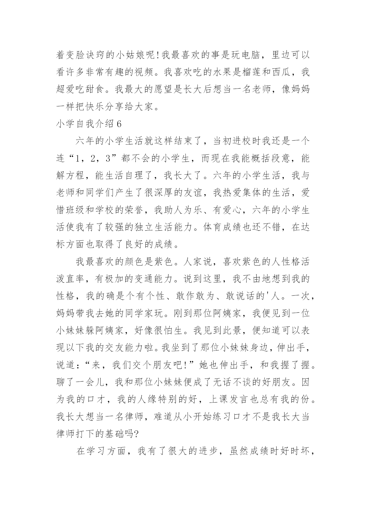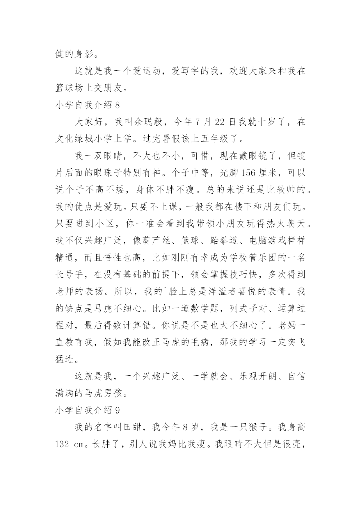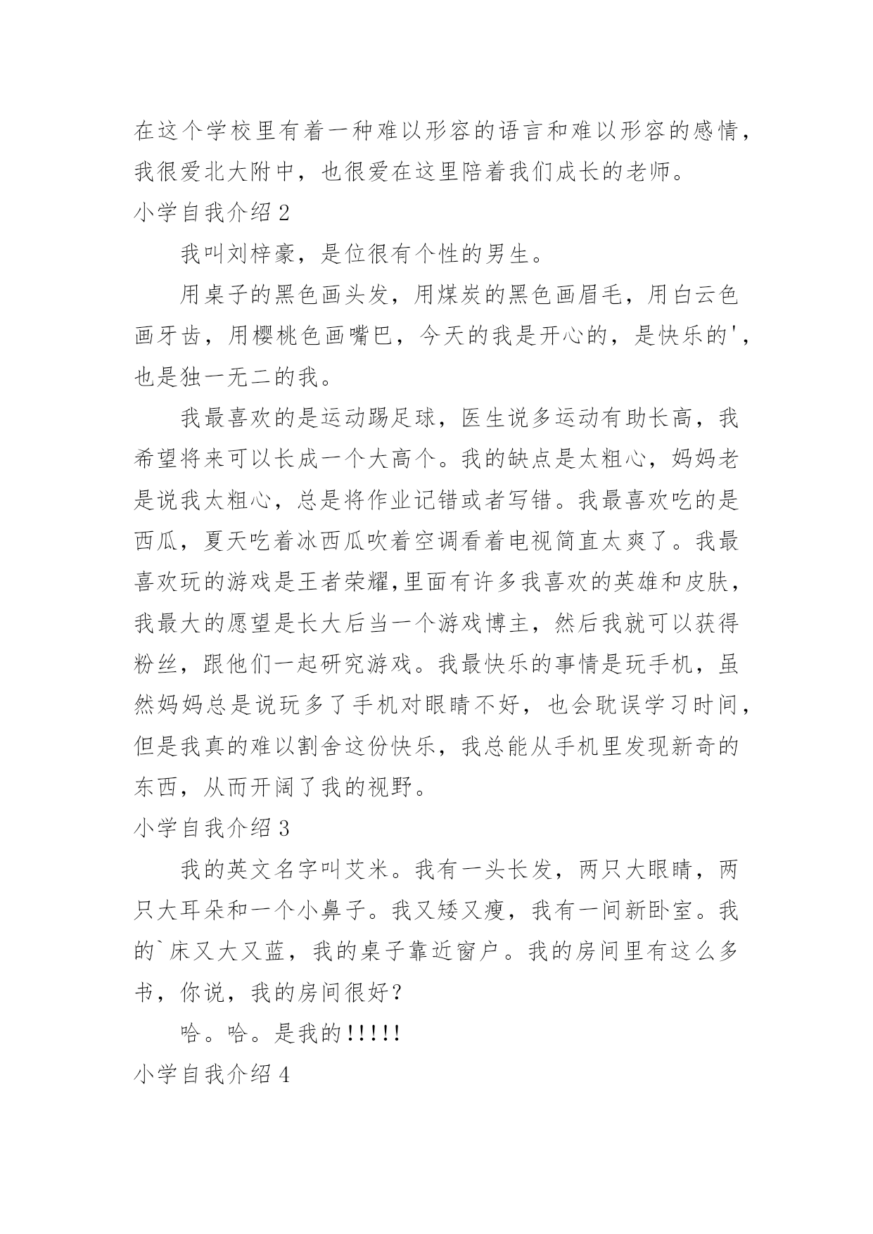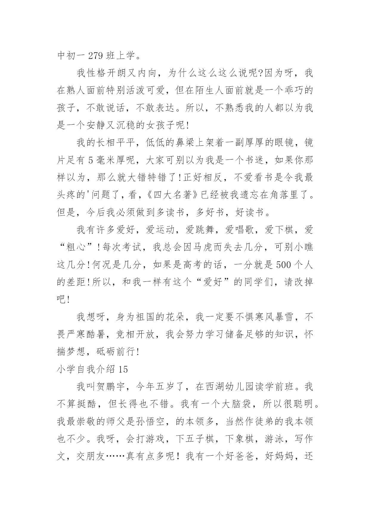 小学自我介绍小学自我介绍精选15篇当来到一个陌生的地方时,我们有必要对自己进行适当的介绍,自我介绍有助于自我宣传、自我展示。那么自我介绍要注意有什么内容呢?下面是小编精心整理的小学自我介绍,欢迎阅读,希望大家能够喜欢。小学自我介绍1我是六年一班的学生陈美玲。我在北大附中已经有六年了,在学校里的环境也比较好的。在学校里我有一个哥哥叫陈锦辉,比我大一岁。我呢。市一个外国来的`人,1196年4月1日出生的,大家一定觉得不可能。我是委内瑞拉人,说西班牙语。我的家乡在恩平。我在学校有一段故事就是:“一年级的时候我和哥哥还不会说中国话,我想妈妈的时候哥哥就和我一起想走出学校,但我们还是被我们的班主任赵老师给找到我们,晚上,上课时,赵老师没有给我们上课。赵老师把我们两个人抱起来让我们哭。那时,不仅我和哥哥哭了,赵老师也哭了,班上的同学也哭了。还好那时我遇见一个人,她妈妈和我们是同乡的,她把赵老师说的话跟我们两说。后来我就坚强起来了也在没有没有像走出学校了。从那时开始,我便和学校产生了一种无法形容的感情,妈妈不在光州的时候,我和哥哥就突然非常想回学校。”我在这个学校里有着一种难以形容的语言和难以形容的感情,我很爱北大附中,也很爱在这里陪着我们成长的老师。小学自我介绍2我叫刘梓豪,是位很有个性的男生。用桌子的黑色画头发,用煤炭的黑色画眉毛,用白云色画牙齿,用樱桃色画嘴巴,今天的我是开心的,是快乐的',也是独一无二的我。我最喜欢的是运动踢足球,医生说多运动有助长高,我希望将来可以长成一个大高个。我的缺点是太粗心,妈妈老是说我太粗心,总是将作业记错或者写错。我最喜欢吃的是西瓜,夏天吃着冰西瓜吹着空调看着电视简直太爽了。我最喜欢玩的游戏是王者荣耀,里面有许多我喜欢的英雄和皮肤,我最大的愿望是长大后当一个游戏博主,然后我就可以获得粉丝,跟他们一起研究游戏。我最快乐的事情是玩手机,虽然妈妈总是说玩多了手机对眼睛不好,也会耽误学习时间,但是我真的难以割舍这份快乐,我总能从手机里发现新奇的东西,从而开阔了我的视野。小学自我介绍3我的英文名字叫艾米。我有一头长发,两只大眼睛,两只大耳朵和一个小鼻子。我又矮又瘦,我有一间新卧室。我的`床又大又蓝,我的桌子靠近窗户。我的房间里有这么多书,你说,我的房间很好?哈。哈。是我的!!!!!小学自我介绍4我就是我,我是无人能替代的。尽管,我可能不是天上闪烁的明星,而只是平凡的细沙,只是沙砾,并不闪眼夺目,但我就是我。我不是太阳,我就不会学晚霞那样模仿它的灿烂。我会禁受风雨的磨砺后,绽放属于我自己的光芒。每天早晨,迎着早晨独有的清新。我出发了,我要证明我就是我,我不是别的`任何一个人,我就是一个平凡但不平庸的小小女生,我会哭我会笑,正因为我不完美,所以我才会去追求完美。我就是我。批改评语:这篇文章通过把“我”比喻为"明星"、”细沙“等,写出了”我就是我“的特点。但是文章举例不多,没有具体描写自己的与众不同,叙述不详尽完整,文章还有待加强!小学自我介绍5大家好,我叫xxx。蒹葭萋萋,白露未晞。晴晞两字都有天气晴好的意思,爸爸妈妈应该是希望我做个乐观开朗的孩子。我最喜欢的是妈妈,妈妈很辛苦,照顾生病的外公的同时还要接送我和妹妹上下学,我很心疼她;我最害怕的'人是爸爸,他总是板着脸,我可不敢随便惹他。我的缺点是易怒,朋友们说我总是一点小事就生气了,然后独坐一旁谁也不理,是个有脾气的姑娘。我的优点是很容易满足,吃到喜欢的食物我都能开心一整天,我可是掌握着变脸诀窍的小姑娘呢!我最喜欢的事是玩电脑,里边可以看许多非常有趣的视频。我喜欢吃的水果是榴莲和西瓜,我超爱吃甜食。我最大的愿望是长大后想当一名老师,像妈妈一样把快乐分享给大家。小学自我介绍6六年的小学生活就这样结束了,当初进校时我还是一个连“1,2,3”都不会的小学生,而现在我能概括段意,能解方程,能生活自理了,我长大了。六年的小学生活,我与老师和同学们产生了很深厚的友谊,我热爱集体的生活,爱惜班级和学校的荣誉,我助人为乐、有爱心,六年的小学生活使我有了较强的独立生活能力。体育成绩也还不错,在达标方面也取得了良好的成绩。我最喜欢的颜色是紫色。人家说,喜欢紫色的人性格活泼直率,有极加的变通能力。说到这里,我不由地想到我的性格,我的确是个有个性、敢作敢为、敢说话的'人。一次,妈妈带我去她的同学家玩。刚到那位阿姨家,我便见到一位小妹妹躲阿姨家,好像很怕生。我见到此景,便知道可以表现以下我的交友能力啦。我坐到了那位小妹妹身边,伸出手,说道:“来,我们交个朋友吧!”她也伸出手,和我握了握。聊了一会儿,我和那位小妹妹便成了无话不谈的好朋友。因为我的口才,我的人缘特别的好,上课发言也总有我的份。我长大想当一名律师,难道从小开始练习口才不是我长大当律师打下的基础吗?在学习方面,我有了很大的进步,虽