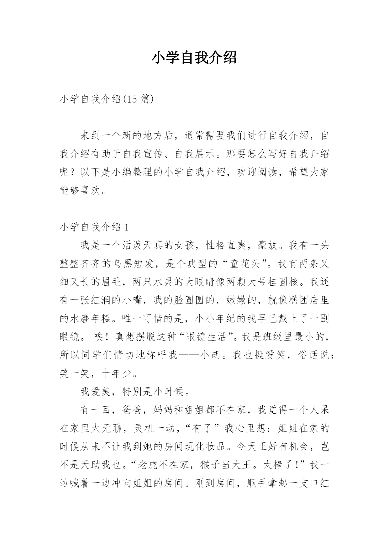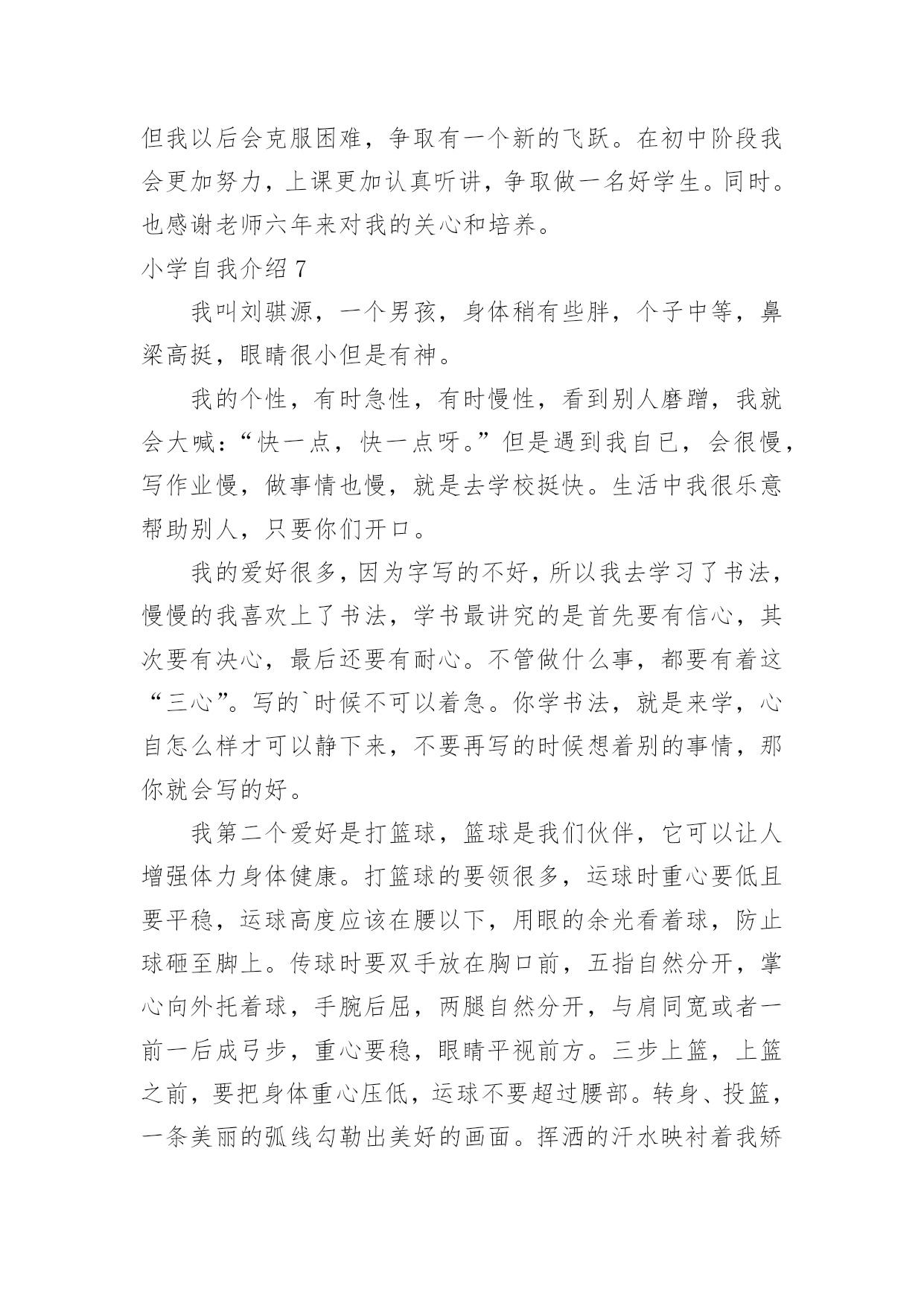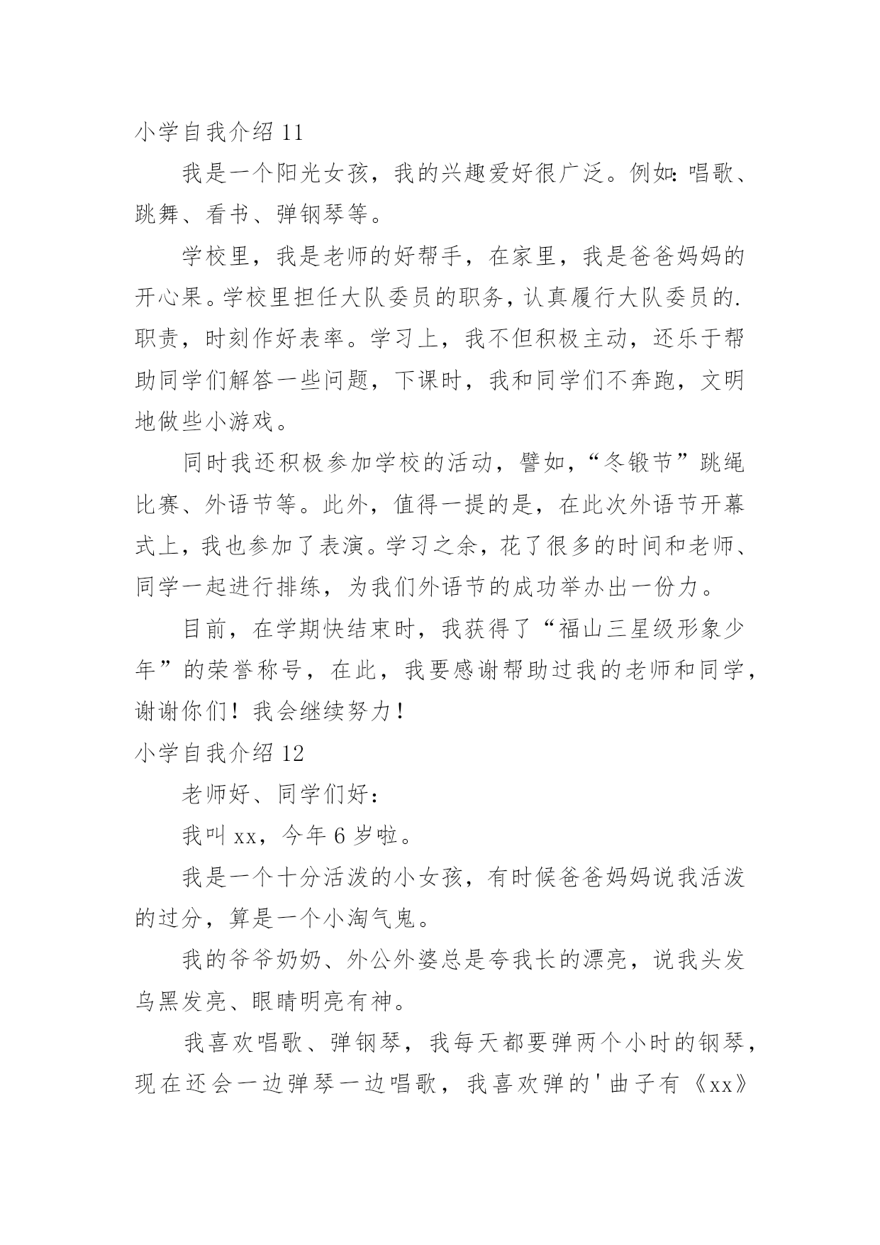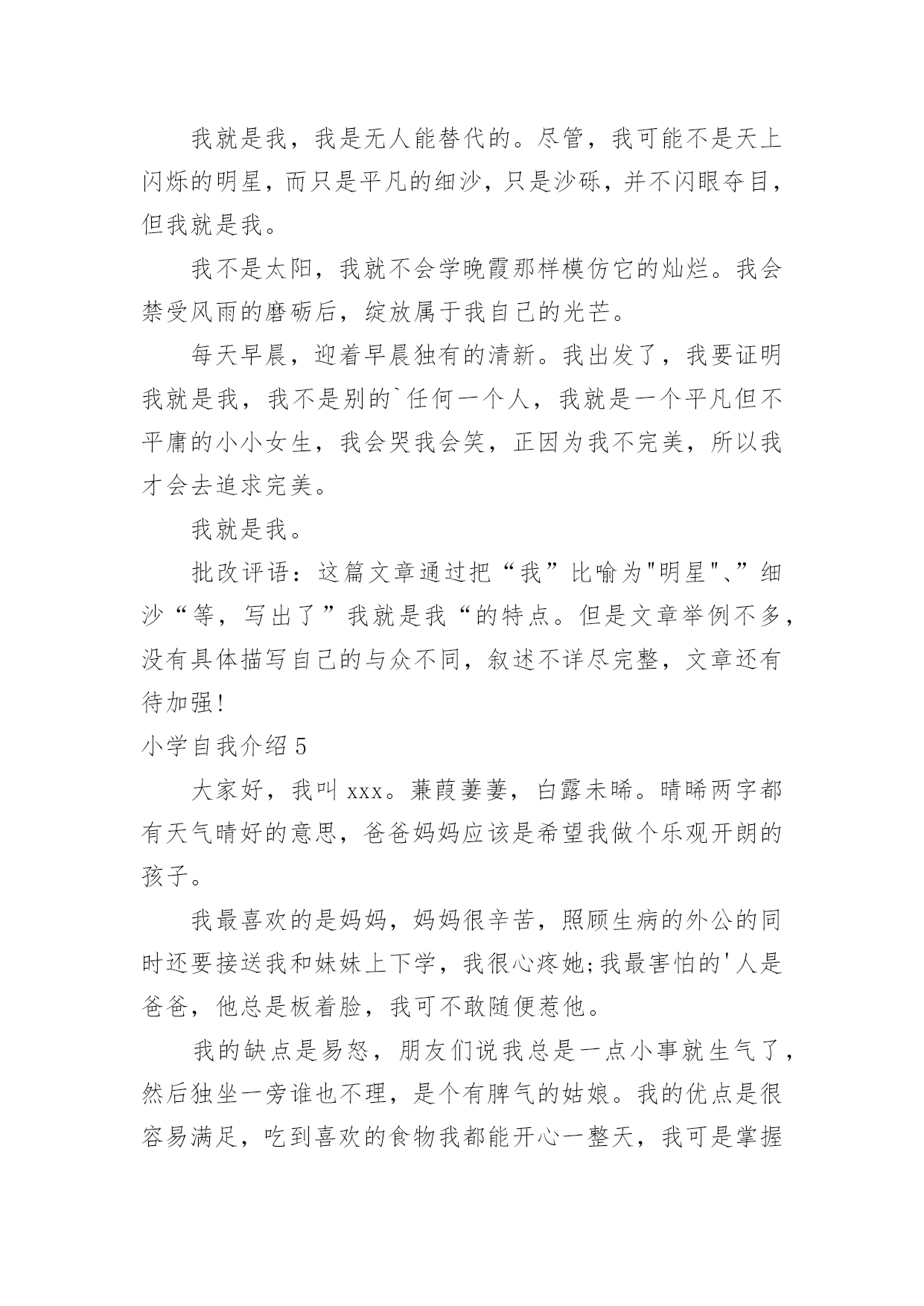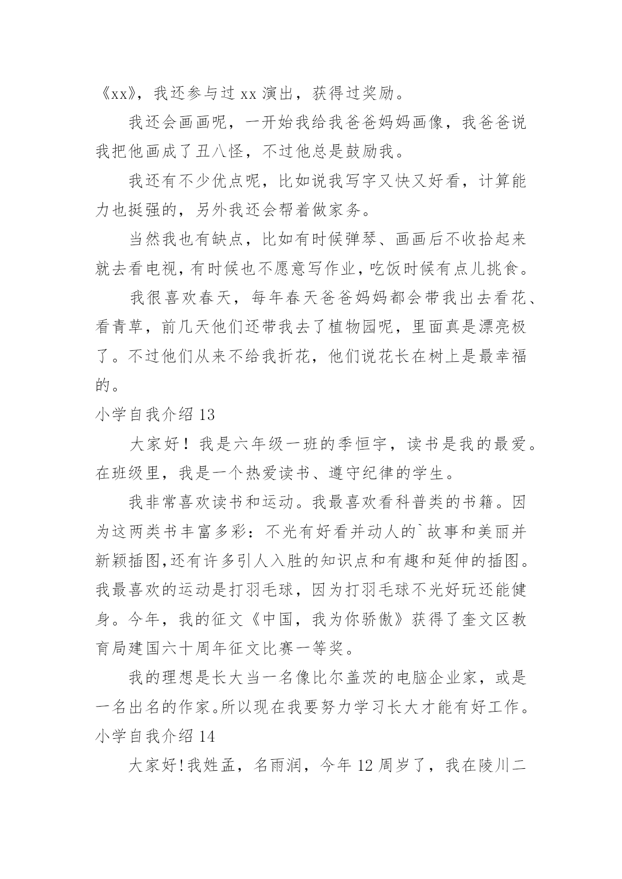 小学自我介绍小学自我介绍精选15篇当来到一个陌生的地方时,我们有必要对自己进行适当的介绍,自我介绍有助于自我宣传、自我展示。那么自我介绍要注意有什么内容呢?下面是小编精心整理的小学自我介绍,欢迎阅读,希望大家能够喜欢。小学自我介绍1我是六年一班的学生陈美玲。我在北大附中已经有六年了,在学校里的环境也比较好的。在学校里我有一个哥哥叫陈锦辉,比我大一岁。我呢。市一个外国来的`人,1196年4月1日出生的,大家一定觉得不可能。我是委内瑞拉人,说西班牙语。我的家乡在恩平。我在学校有一段故事就是:“一年级的时候我和哥哥还不会说中国话,我想妈妈的时候哥哥就和我一起想走出学校,但我们还是被我们的班主任赵老师给找到我们,晚上,上课时,赵老师没有给我们上课。赵老师把我们两个人抱起来让我们哭。那时,不仅我和哥哥哭了,赵老师也哭了,班上的同学也哭了。还好那时我遇见一个人,她妈妈和我们是同乡的,她把赵老师说的话跟我们两说。后来我就坚强起来了也在没有没有像走出学校了。从那时开始,我便和学校产生了一种无法形容的感情,妈妈不在光州的时候,我和哥哥就突然非常想回学校。”我在这个学校里有着一种难以形容的语言和难以形容的感情,我很爱北大附中,也很爱在这里陪着我们成长的老师。小学自我介绍2我叫刘梓豪,是位很有个性的男生。用桌子的黑色画头发,用煤炭的黑色画眉毛,用白云色画牙齿,用樱桃色画嘴巴,今天的我是开心的,是快乐的',也是独一无二的我。我最喜欢的是运动踢足球,医生说多运动有助长高,我希望将来可以长成一个大高个。我的缺点是太粗心,妈妈老是说我太粗心,总是将作业记错或者写错。我最喜欢吃的是西瓜,夏天吃着冰西瓜吹着空调看着电视简直太爽了。我最喜欢玩的游戏是王者荣耀,里面有许多我喜欢的英雄和皮肤,我最大的愿望是长大后当一个游戏博主,然后我就可以获得粉丝,跟他们一起研究游戏。我最快乐的事情是玩手机,虽然妈妈总是说玩多了手机对眼睛不好,也会耽误学习时间,但是我真的难以割舍这份快乐,我总能从手机里发现新奇的东西,从而开阔了我的视野。小学自我介绍3我的英文名字叫艾米。我有一头长发,两只大眼睛,两只大耳朵和一个小鼻子。我又矮又瘦,我有一间新卧室。我的`床又大又蓝,我的桌子靠近窗户。我的房间里有这么多书,你说,我的房间很好?哈。哈。是我的!!!!!小学自我介绍4我就是我,我是无人能替代的。尽管,我可能不是天上闪烁的明星,而只是平凡的细沙,只是沙砾,并不闪眼夺目,但我就是我。我不是太阳,我就不会学晚霞那样模仿它的灿烂。我会禁受风雨的磨砺后,绽放属于我自己的光芒。每天早晨,迎着早晨独有的清新。我出发了,我要证明我就是我,我不是别的`任何一个人,我就是一个平凡但不平庸的小小女生,我会哭我会笑,正因为我不完美,所以我才会去追求完美。我就是我。批改评语:这篇文章通过把“我”比喻为"明星"、”细沙“等,写出了”我就是我“的特点。但是文章举例不多,没有具体描写自己的与众不同,叙述不详尽完整,文章还有待加强!小学自我介绍5大家好,我叫xxx。蒹葭萋萋,白露未晞。晴晞两字都有天气晴好的意思,爸爸妈妈应该是希望我做个乐观开朗的孩子。我最喜欢的是妈妈,妈妈很辛苦,照顾生病的外公的同时还要接送我和妹妹上下学,我很心疼她;我最害怕的'人是爸爸,他总是板着脸,我可不敢随便惹他。我的缺点是易怒,朋友们说我总是一点小事就生气了,然后独坐一旁谁也不理,是个有脾气的姑娘。我的优点是很容易满足,吃到喜欢的食物我都能开心一整天,我可是掌握着变脸诀窍的小姑娘呢!我最喜欢的事是玩电脑,里边可以看许多非常有趣的视频。我喜欢吃的水果是榴莲和西瓜,我超爱吃甜食。我最大的愿望是长大后想当一名老师,像妈妈一样把快乐分享给大家。小学自我介绍6六年的小学生活就这样结束了,当初进校时我还是一个连“1,2,3”都不会的小学生,而现在我能概括段意,能解方程,能生活自理了,我长大了。六年的小学生活,我与老师和同学们产生了很深厚的友谊,我热爱集体的生活,爱惜班级和学校的荣誉,我助人为乐、有爱心,六年的小学生活使我有了较强的独立生活能力。体育成绩也还不错,在达标方面也取得了良好的成绩。我最喜欢的颜色是紫色。人家说,喜欢紫色的人性格活泼直率,有极加的变通能力。说到这里,我不由地想到我的性格,我的确是个有个性、敢作敢为、敢说话的'人。一次,妈妈带我去她的同学家玩。刚到那位阿姨家,我便见到一位小妹妹躲阿姨家,好像很怕生。我见到此景,便知道可以表现以下我的交友能力啦。我坐到了那位小妹妹身边,伸出手,说道:“来,我们交个朋友吧!”她也伸出手,和我握了握。聊了一会儿,我和那位小妹妹便成了无话不谈的好朋友。因为我的口才,我的人缘特别的好,上课发言也总有我的份。我长大想当一名律师,难道从小开始练习口才不是我长大当律师打下的基础吗?在学习方面,我有了很大的进步,虽