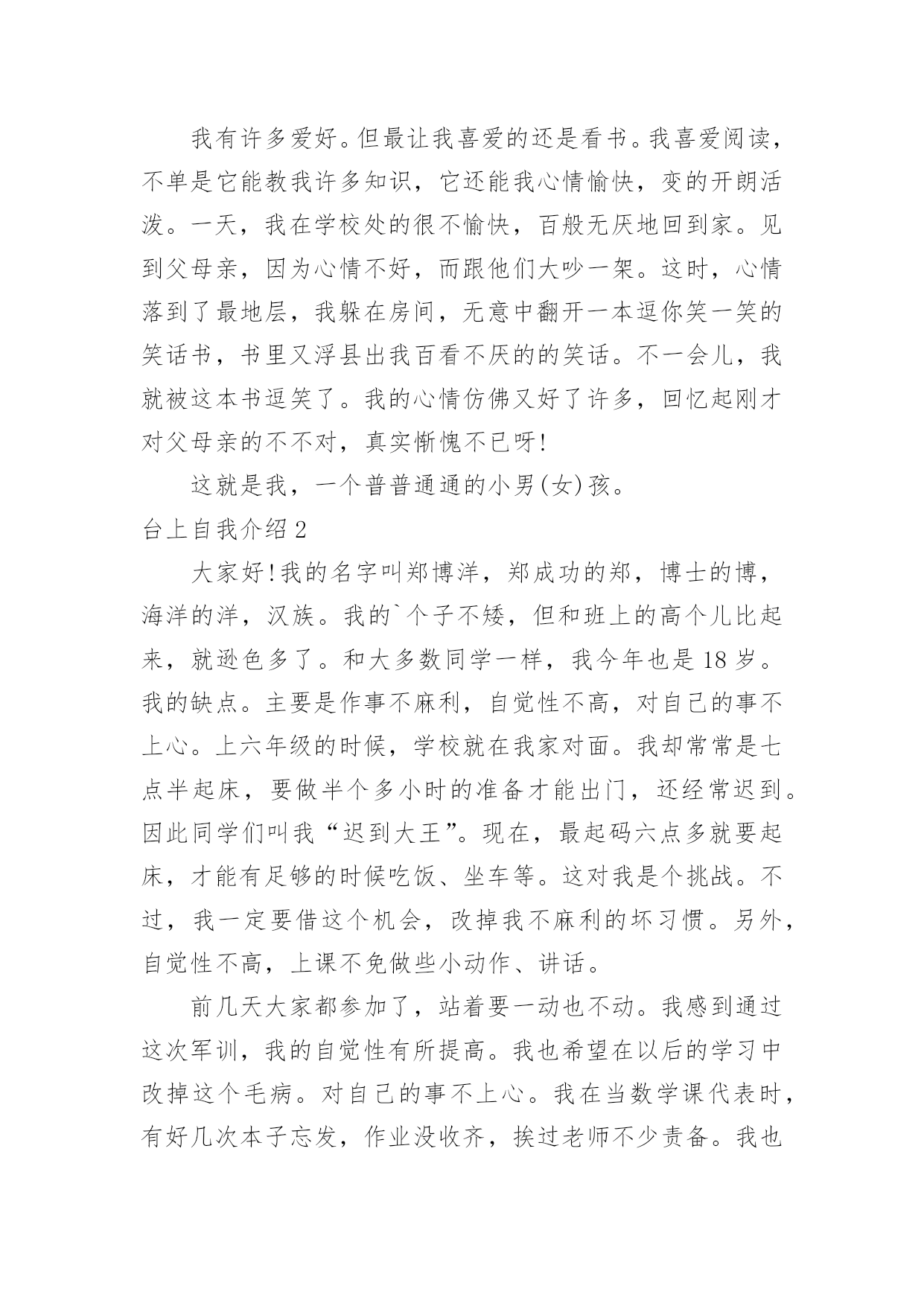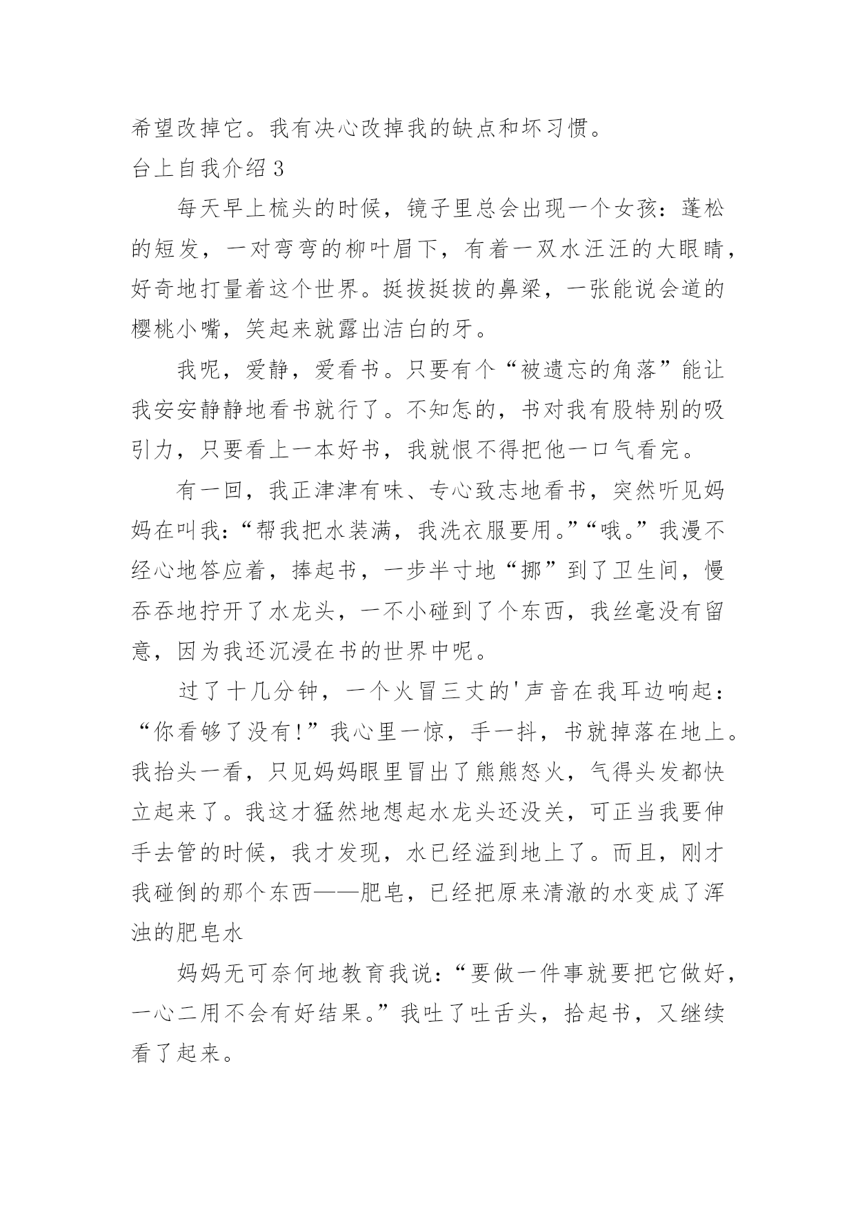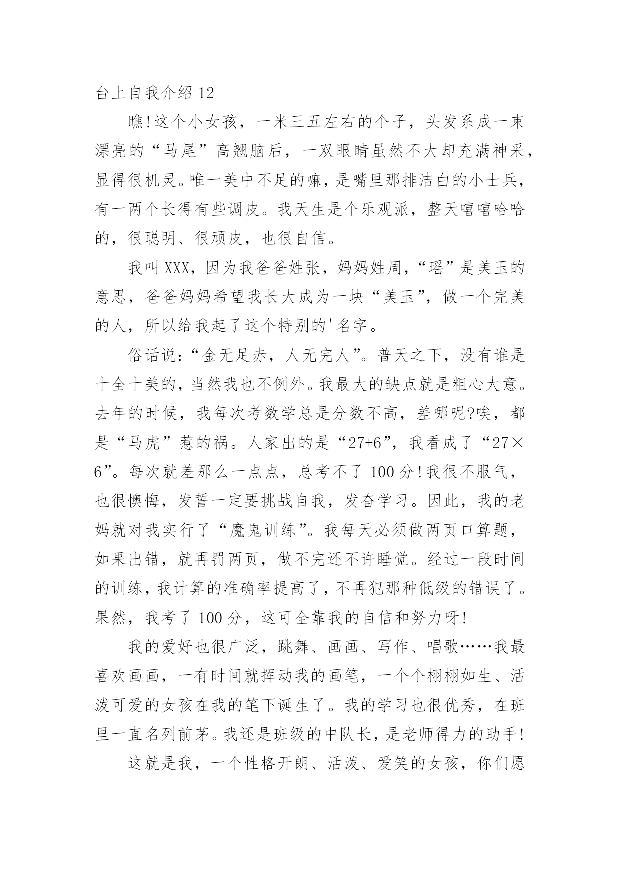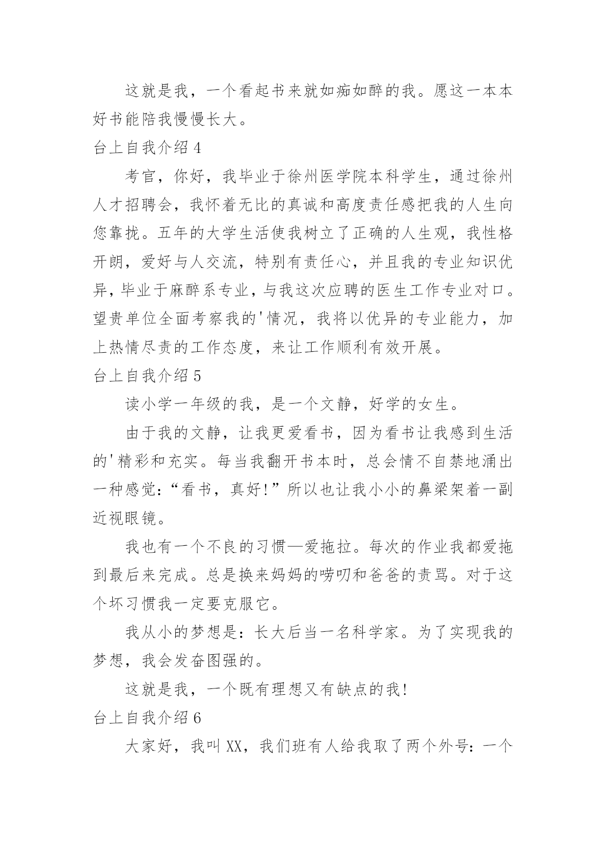 台上自我介绍台上自我介绍当我们在一个陌生场合中,通常需要用到自我介绍,自我介绍是人与人进行沟通的出发点。写自我介绍时总是没有新意?以下是小编整理的台上自我介绍,欢迎大家借鉴与参考,希望对大家有所帮助。台上自我介绍1亲爱的同学们:我叫××,今年××岁。我想大家一定还不太熟悉我吧!那我就做个自我介绍吧!我最喜欢的颜色是紫色。人家说,喜欢紫色的人性格活泼直率,有极加的变通能力。说到这里,我不由地想到我的性格,我的确是个有个性、敢作敢为、敢说话的人。一次,妈妈带我去她的同学家玩。刚到那位阿姨家,我便见到一位小妹妹躲阿姨家,好像很怕生。我见到此景,便知道可以表现以下我的`交友能力啦。我坐到了那位小妹妹身边,伸出手,说道:“来,我们交个朋友吧!”她也伸出手,和我握了握。聊了一会儿,我和那位小妹妹便成了无话不谈的好朋友。因为我的口才,我的人缘特别的好,上课发言也总有我的份。我长大想当一名律师,难道从小开始练习口才不是我长大当律师打下的基础吗?我有许多爱好。但最让我喜爱的还是看书。我喜爱阅读,不单是它能教我许多知识,它还能我心情愉快,变的开朗活泼。一天,我在学校处的很不愉快,百般无厌地回到家。见到父母亲,因为心情不好,而跟他们大吵一架。这时,心情落到了最地层,我躲在房间,无意中翻开一本逗你笑一笑的笑话书,书里又浮县出我百看不厌的的笑话。不一会儿,我就被这本书逗笑了。我的心情仿佛又好了许多,回忆起刚才对父母亲的不不对,真实惭愧不已呀!这就是我,一个普普通通的小男(女)孩。台上自我介绍2大家好!我的名字叫郑博洋,郑成功的郑,博士的博,海洋的洋,汉族。我的`个子不矮,但和班上的高个儿比起来,就逊色多了。和大多数同学一样,我今年也是18岁。我的缺点。主要是作事不麻利,自觉性不高,对自己的事不上心。上六年级的时候,学校就在我家对面。我却常常是七点半起床,要做半个多小时的准备才能出门,还经常迟到。因此同学们叫我“迟到大王”。现在,最起码六点多就要起床,才能有足够的时候吃饭、坐车等。这对我是个挑战。不过,我一定要借这个机会,改掉我不麻利的坏习惯。另外,自觉性不高,上课不免做些小动作、讲话。前几天大家都参加了,站着要一动也不动。我感到通过这次军训,我的自觉性有所提高。我也希望在以后的学习中改掉这个毛病。对自己的事不上心。我在当数学课代表时,有好几次本子忘发,作业没收齐,挨过老师不少责备。我也希望改掉它。我有决心改掉我的缺点和坏习惯。台上自我介绍3每天早上梳头的时候,镜子里总会出现一个女孩:蓬松的短发,一对弯弯的柳叶眉下,有着一双水汪汪的大眼睛,好奇地打量着这个世界。挺拔挺拔的鼻梁,一张能说会道的樱桃小嘴,笑起来就露出洁白的牙。我呢,爱静,爱看书。只要有个“被遗忘的角落”能让我安安静静地看书就行了。不知怎的,书对我有股特别的吸引力,只要看上一本好书,我就恨不得把他一口气看完。有一回,我正津津有味、专心致志地看书,突然听见妈妈在叫我:“帮我把水装满,我洗衣服要用。”“哦。”我漫不经心地答应着,捧起书,一步半寸地“挪”到了卫生间,慢吞吞地拧开了水龙头,一不小碰到了个东西,我丝毫没有留意,因为我还沉浸在书的世界中呢。过了十几分钟,一个火冒三丈的'声音在我耳边响起:“你看够了没有!”我心里一惊,手一抖,书就掉落在地上。我抬头一看,只见妈妈眼里冒出了熊熊怒火,气得头发都快立起来了。我这才猛然地想起水龙头还没关,可正当我要伸手去管的时候,我才发现,水已经溢到地上了。而且,刚才我碰倒的那个东西——肥皂,已经把原来清澈的水变成了浑浊的肥皂水妈妈无可奈何地教育我说:“要做一件事就要把它做好,一心二用不会有好结果。”我吐了吐舌头,拾起书,又继续看了起来。这就是我,一个看起书来就如痴如醉的我。愿这一本本好书能陪我慢慢长大。台上自我介绍4考官,你好,我毕业于徐州医学院本科学生,通过徐州人才招聘会,我怀着无比的真诚和高度责任感把我的人生向您靠拢。五年的大学生活使我树立了正确的人生观,我性格开朗,爱好与人交流,特别有责任心,并且我的专业知识优异,毕业于麻醉系专业,与我这次应聘的医生工作专业对口。望贵单位全面考察我的'情况,我将以优异的专业能力,加上热情尽责的工作态度,来让工作顺利有效开展。台上自我介绍5读小学一年级的我,是一个文静,好学的女生。由于我的文静,让我更爱看书,因为看书让我感到生活的'精彩和充实。每当我翻开书本时,总会情不自禁地涌出一种感觉:“看书,真好!”所以也让我小小的鼻梁架着一副近视眼镜。我也有一个不良的习惯—爱拖拉。每次的作业我都爱拖到最后来完成。总是换来妈妈的唠叨和爸爸的责骂。对于这个坏习惯我一定要克服它。我从小的梦想是:长大后当一名科学家。为了实现我的梦想,我会发奋图强的。这就是我,一个既有理想又有缺点的我!台上自我介绍6大家好,我叫XX,我们班有人给我取了两个
