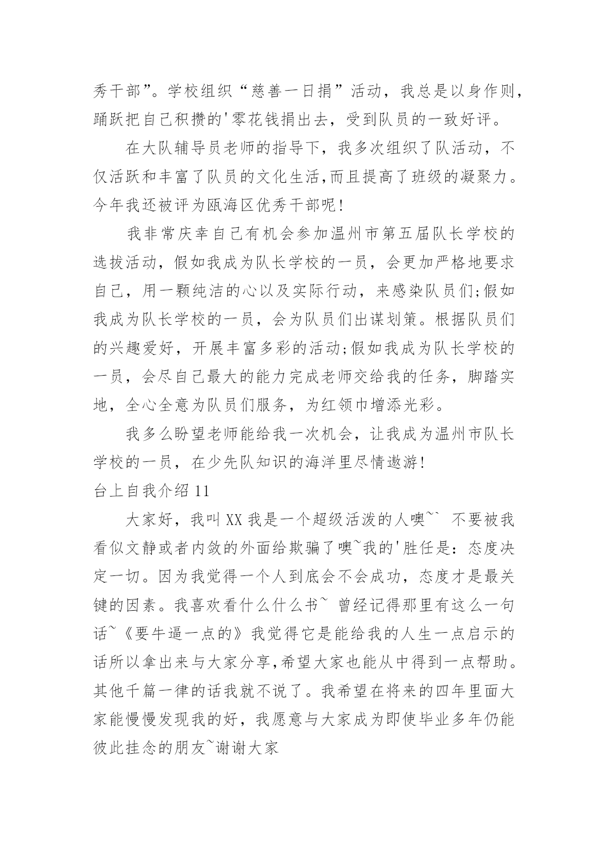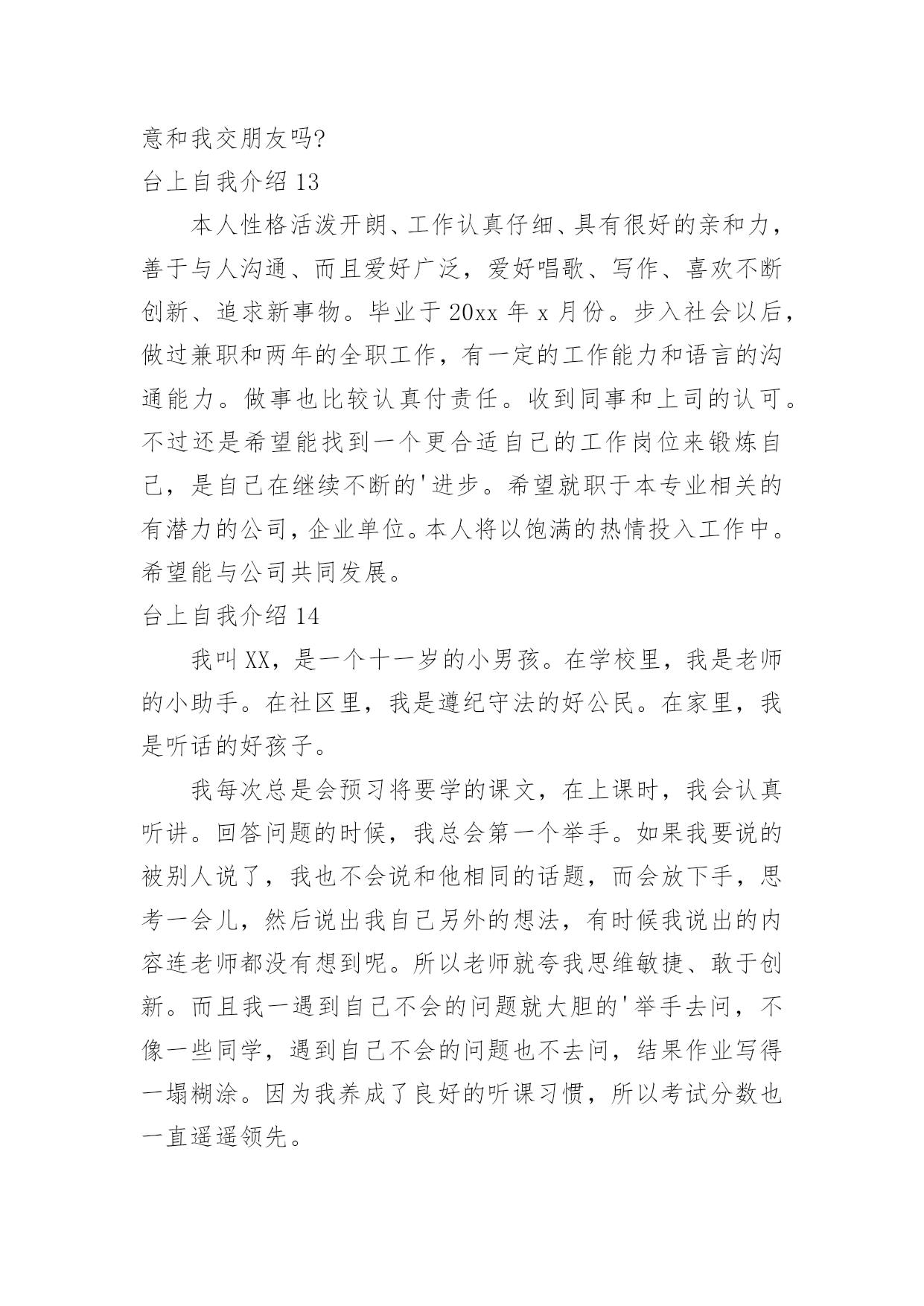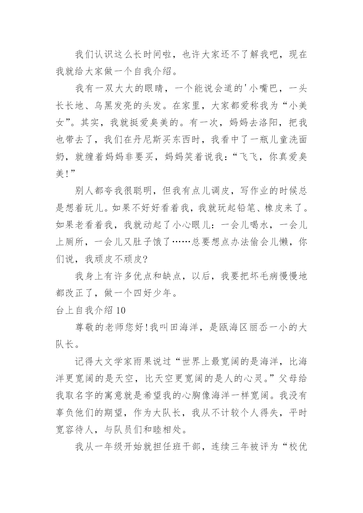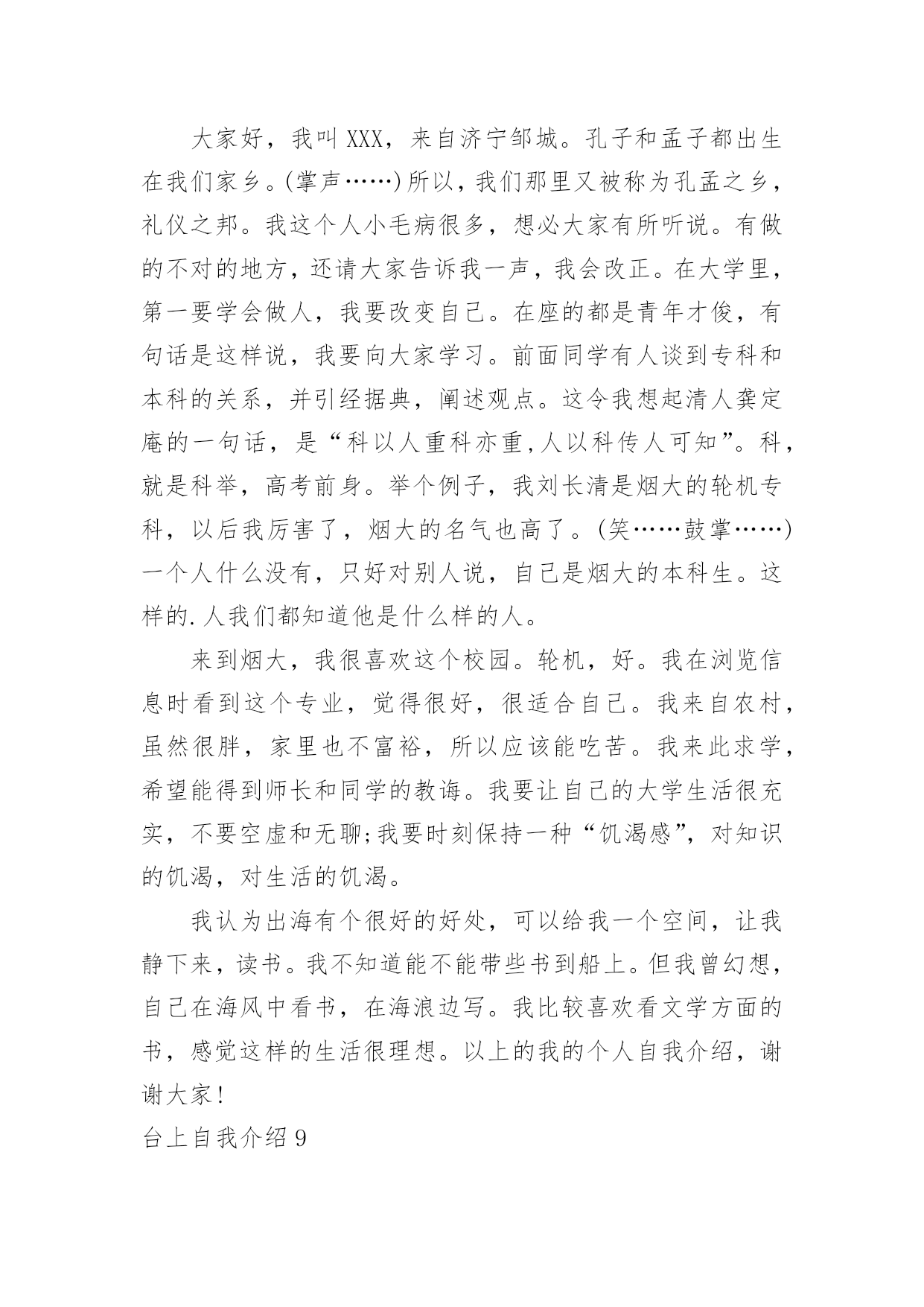 台上自我介绍台上自我介绍当我们在一个陌生场合中,通常需要用到自我介绍,自我介绍是人与人进行沟通的出发点。写自我介绍时总是没有新意?以下是小编整理的台上自我介绍,欢迎大家借鉴与参考,希望对大家有所帮助。台上自我介绍1亲爱的同学们:我叫××,今年××岁。我想大家一定还不太熟悉我吧!那我就做个自我介绍吧!我最喜欢的颜色是紫色。人家说,喜欢紫色的人性格活泼直率,有极加的变通能力。说到这里,我不由地想到我的性格,我的确是个有个性、敢作敢为、敢说话的人。一次,妈妈带我去她的同学家玩。刚到那位阿姨家,我便见到一位小妹妹躲阿姨家,好像很怕生。我见到此景,便知道可以表现以下我的`交友能力啦。我坐到了那位小妹妹身边,伸出手,说道:“来,我们交个朋友吧!”她也伸出手,和我握了握。聊了一会儿,我和那位小妹妹便成了无话不谈的好朋友。因为我的口才,我的人缘特别的好,上课发言也总有我的份。我长大想当一名律师,难道从小开始练习口才不是我长大当律师打下的基础吗?我有许多爱好。但最让我喜爱的还是看书。我喜爱阅读,不单是它能教我许多知识,它还能我心情愉快,变的开朗活泼。一天,我在学校处的很不愉快,百般无厌地回到家。见到父母亲,因为心情不好,而跟他们大吵一架。这时,心情落到了最地层,我躲在房间,无意中翻开一本逗你笑一笑的笑话书,书里又浮县出我百看不厌的的笑话。不一会儿,我就被这本书逗笑了。我的心情仿佛又好了许多,回忆起刚才对父母亲的不不对,真实惭愧不已呀!这就是我,一个普普通通的小男(女)孩。台上自我介绍2大家好!我的名字叫郑博洋,郑成功的郑,博士的博,海洋的洋,汉族。我的`个子不矮,但和班上的高个儿比起来,就逊色多了。和大多数同学一样,我今年也是18岁。我的缺点。主要是作事不麻利,自觉性不高,对自己的事不上心。上六年级的时候,学校就在我家对面。我却常常是七点半起床,要做半个多小时的准备才能出门,还经常迟到。因此同学们叫我“迟到大王”。现在,最起码六点多就要起床,才能有足够的时候吃饭、坐车等。这对我是个挑战。不过,我一定要借这个机会,改掉我不麻利的坏习惯。另外,自觉性不高,上课不免做些小动作、讲话。前几天大家都参加了,站着要一动也不动。我感到通过这次军训,我的自觉性有所提高。我也希望在以后的学习中改掉这个毛病。对自己的事不上心。我在当数学课代表时,有好几次本子忘发,作业没收齐,挨过老师不少责备。我也希望改掉它。我有决心改掉我的缺点和坏习惯。台上自我介绍3每天早上梳头的时候,镜子里总会出现一个女孩:蓬松的短发,一对弯弯的柳叶眉下,有着一双水汪汪的大眼睛,好奇地打量着这个世界。挺拔挺拔的鼻梁,一张能说会道的樱桃小嘴,笑起来就露出洁白的牙。我呢,爱静,爱看书。只要有个“被遗忘的角落”能让我安安静静地看书就行了。不知怎的,书对我有股特别的吸引力,只要看上一本好书,我就恨不得把他一口气看完。有一回,我正津津有味、专心致志地看书,突然听见妈妈在叫我:“帮我把水装满,我洗衣服要用。”“哦。”我漫不经心地答应着,捧起书,一步半寸地“挪”到了卫生间,慢吞吞地拧开了水龙头,一不小碰到了个东西,我丝毫没有留意,因为我还沉浸在书的世界中呢。过了十几分钟,一个火冒三丈的'声音在我耳边响起:“你看够了没有!”我心里一惊,手一抖,书就掉落在地上。我抬头一看,只见妈妈眼里冒出了熊熊怒火,气得头发都快立起来了。我这才猛然地想起水龙头还没关,可正当我要伸手去管的时候,我才发现,水已经溢到地上了。而且,刚才我碰倒的那个东西——肥皂,已经把原来清澈的水变成了浑浊的肥皂水妈妈无可奈何地教育我说:“要做一件事就要把它做好,一心二用不会有好结果。”我吐了吐舌头,拾起书,又继续看了起来。这就是我,一个看起书来就如痴如醉的我。愿这一本本好书能陪我慢慢长大。台上自我介绍4考官,你好,我毕业于徐州医学院本科学生,通过徐州人才招聘会,我怀着无比的真诚和高度责任感把我的人生向您靠拢。五年的大学生活使我树立了正确的人生观,我性格开朗,爱好与人交流,特别有责任心,并且我的专业知识优异,毕业于麻醉系专业,与我这次应聘的医生工作专业对口。望贵单位全面考察我的'情况,我将以优异的专业能力,加上热情尽责的工作态度,来让工作顺利有效开展。台上自我介绍5读小学一年级的我,是一个文静,好学的女生。由于我的文静,让我更爱看书,因为看书让我感到生活的'精彩和充实。每当我翻开书本时,总会情不自禁地涌出一种感觉:“看书,真好!”所以也让我小小的鼻梁架着一副近视眼镜。我也有一个不良的习惯—爱拖拉。每次的作业我都爱拖到最后来完成。总是换来妈妈的唠叨和爸爸的责骂。对于这个坏习惯我一定要克服它。我从小的梦想是:长大后当一名科学家。为了实现我的梦想,我会发奋图强的。这就是我,一个既有理想又有缺点的我!台上自我介绍6大家好,我叫XX,我们班有人给我取了两个