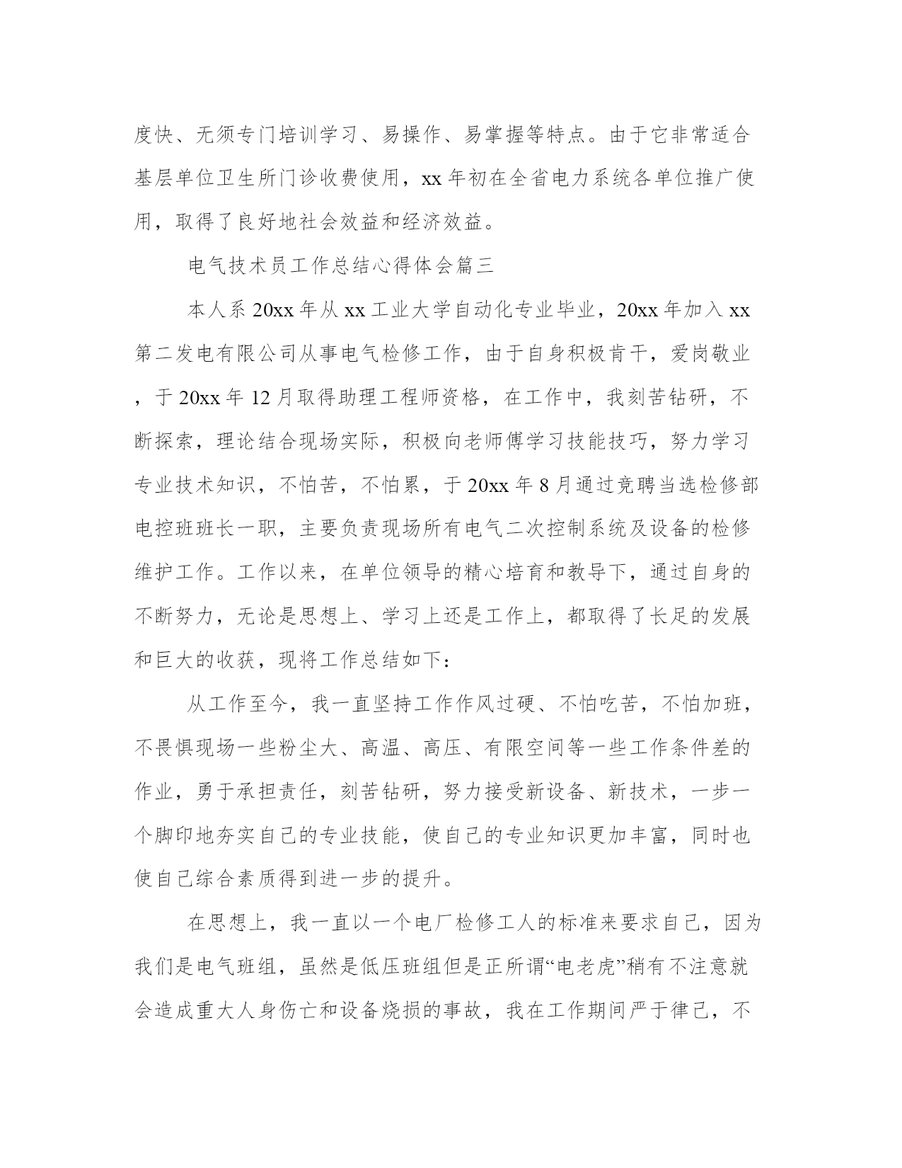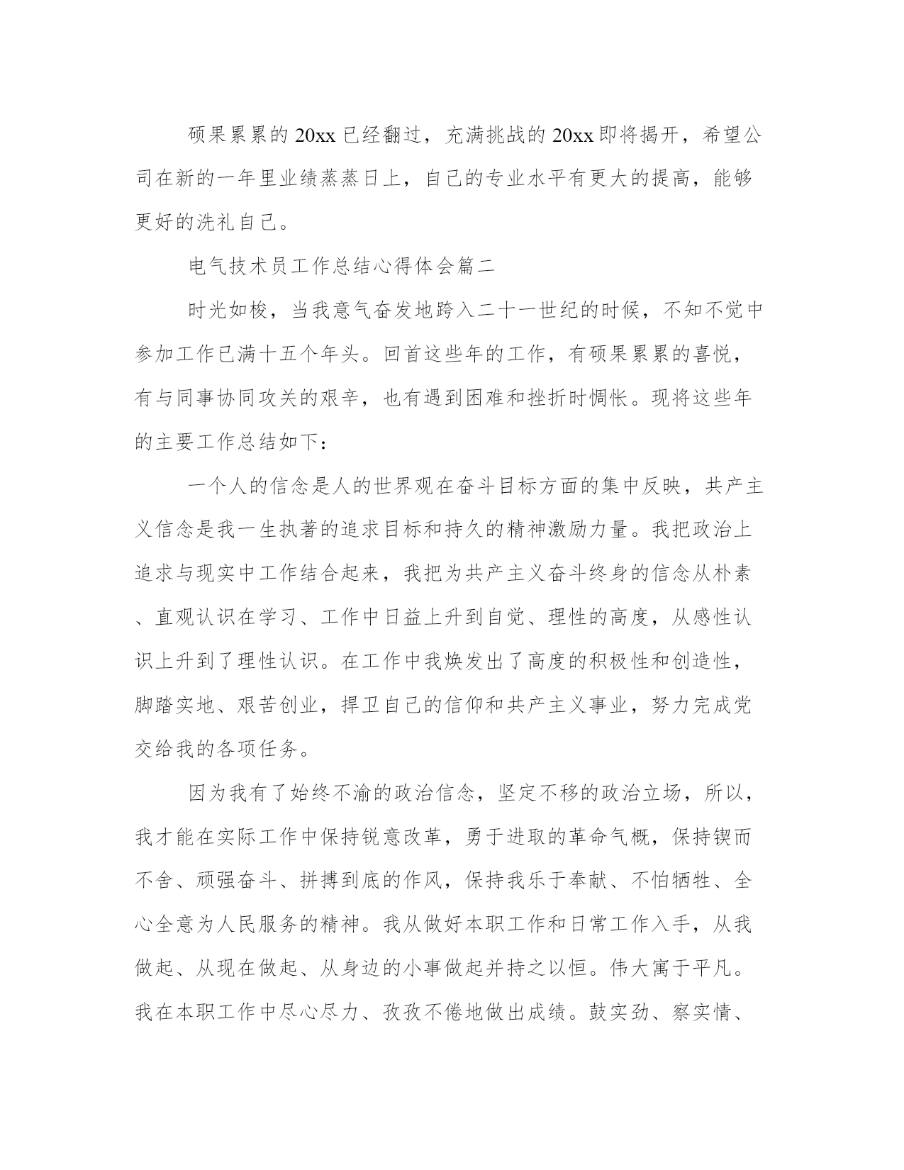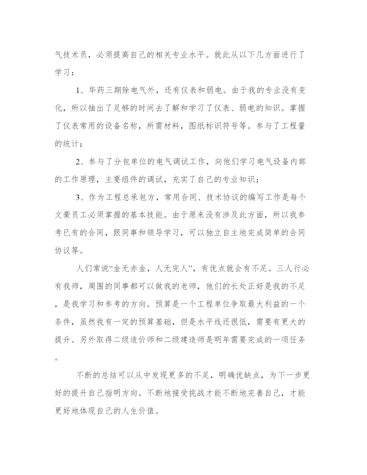 电气技术员工作总结心得体会(五篇)心中有不少心得体会时,不如来好好地做个总结,写一篇心得体会,如此可以一直更新迭代自己的想法。大家想知道怎么样才能写得一篇好的心得体会吗?下面我帮大家找寻并整理了一些优秀的心得体会范文,我们一起来了解一下吧。电气技术员工作总结心得体会篇一从毕业进入工程领域我一直从事制药行业的电气施工工作,并且一直在华北制药项目。现在在华药三期,主要工作仍然是现场电气施工管理和安全管理。对于这里的人和事物都比较了解熟悉,这对于我来说可以算是轻车熟路,但是以往的经验教训时刻在提醒着自己,经验仍然需要积累,不足仍然还有很多。原来的工作是直接面对监理方和建设方,现在增加了施工方。所以作为分包单位的甲方,我需要做到全面统筹全面管理,工作的性质没有变,但是范围变大了。这更加需要很好的协调能力才能去胜任自己的工作,对自己又提出了新的挑战。从今年8月份进入公司到现在虽然仅有短短的几个月,但是对公司有了新的认识。作为在电气安装工程领域一个年轻的企业来说,他的前途充满着无限挑战,充满着无限的希望。对于个人来讲,提供给我的是宽广而又活跃的舞台。现在的电气不在是单一的工种,它需要与仪表、自控等相关专业的严密结合。所以要想做一个合格完美的电气技术员,必须提高自己的相关专业水平。就此从以下几方面进行了学习:1、华药三期除电气外,还有仪表和弱电。由于我的专业没有变化,所以抽出了足够的时间去了解和学习了仪表、弱电的知识。掌握了仪表常用的设备名称,所需材料,图纸标识符号等。参与了工程量的统计;2、参与了分包单位的电气调试工作,向他们学习电气设备内部的工作原理,主要组件的调试,充实了自己的专业知识;3、作为工程总承包方,常用合同、技术协议的编写工作是每个文豪员工必须掌握的基本技能。由于原来没有涉及此方面,所以我参考已有的合同,跟同事和领导学习,可以独立自主地完成简单的合同协议等。人们常说“金无赤金,人无完人”,有优点就会有不足。三人行必有我师,周围的同事都可以做我的老师,他们的长处正好是我的不足,是我学习和参考的方向。预算是一个工程单位争取最大利益的一个条件,虽然我有一定的预算基础,但是水平线还很低,需要有更大的提升。另外取得二级造价师和二级建造师是明年需要完成的一项任务。不断的总结可以从中发现更多的不足,明确优缺点,为下一步更好的提升自己指明方向。不断地接受挑战才能不断地完善自己,才能更好地体现自己的人生价值。硕果累累的20xx已经翻过,充满挑战的20xx即将揭开,希望公司在新的一年里业绩蒸蒸日上,自己的专业水平有更大的提高,能够更好的洗礼自己。电气技术员工作总结心得体会篇二时光如梭,当我意气奋发地跨入二十一世纪的时候,不知不觉中参加工作已满十五个年头。回首这些年的工作,有硕果累累的喜悦,有与同事协同攻关的艰辛,也有遇到困难和挫折时惆怅。现将这些年的主要工作总结如下:一个人的信念是人的世界观在奋斗目标方面的集中反映,共产主义信念是我一生执著的追求目标和持久的精神激励力量。我把政治上追求与现实中工作结合起来,我把为共产主义奋斗终身的信念从朴素、直观认识在学习、工作中日益上升到自觉、理性的高度,从感性认识上升到了理性认识。在工作中我焕发出了高度的积极性和创造性,脚踏实地、艰苦创业,捍卫自己的信仰和共产主义事业,努力完成党交给我的各项任务。因为我有了始终不渝的政治信念,坚定不移的政治立场,所以,我才能在实际工作中保持锐意改革,勇于进取的革命气概,保持锲而不舍、顽强奋斗、拼搏到底的作风,保持我乐于奉献、不怕牺牲、全心全意为人民服务的精神。我从做好本职工作和日常工作入手,从我做起、从现在做起、从身边的小事做起并持之以恒。伟大寓于平凡。我在本职工作中尽心尽力、孜孜不倦地做出成绩。鼓实劲、察实情、说实话、办实事、求实效。我不断提高自己的业务本领,努力精通本职的业务知识,做本职工作的骨干和行家里手,脚踏实地的做好本职工作。把远大目标与现实努力结合起来,把为人民谋利益的决心同过硬的本领有机地统一起来、把为人民谋利益的热情同实事求是的态度有机地统一起来、把全心全意为人民服务的良好愿望同本职工作有机地统一起来。把全心全意为人民服务的良好愿望同本职工作统一起来。我在实践中为群众办实事,把着眼点放在本职岗位和现实基础上,在工作、生活中我一直相信一份耕耘、一份收获。所以我一直在努力。不断的努力学习、不断的努力工作。x年4月受省电力局局办公室之委托,为全局办公室系统编写了文秘类计算机培训教材,该书主要包括计算机的基础知识、文字处理软件的使用、公文处理软件的使用、lousorganizer(事务管理软件)的使用。由于该书通俗易懂,实用方便,受到各单位办公室秘书们的一致好评,在各单位得到广泛使用,作为首选的基础培训教材。x年5月参加xx省电力局