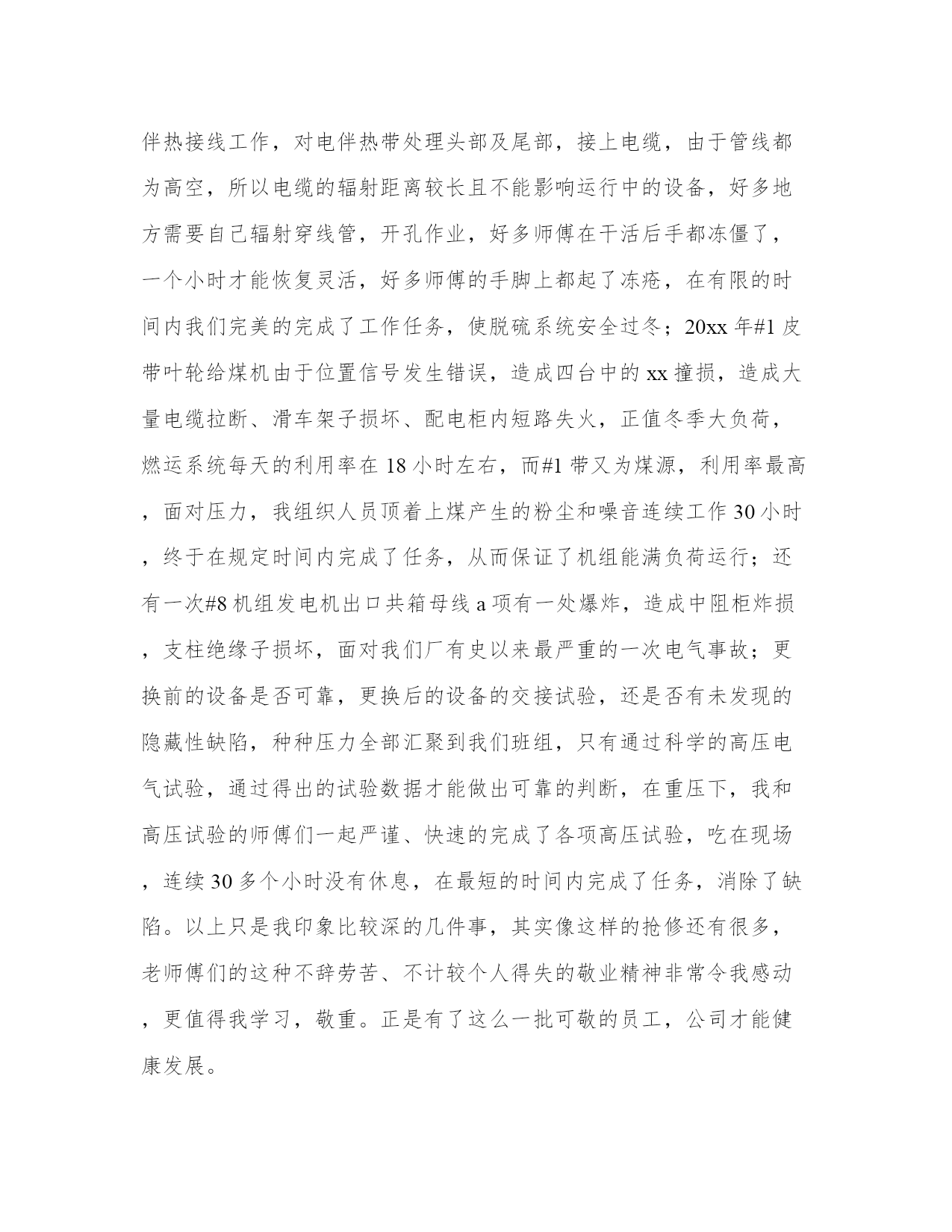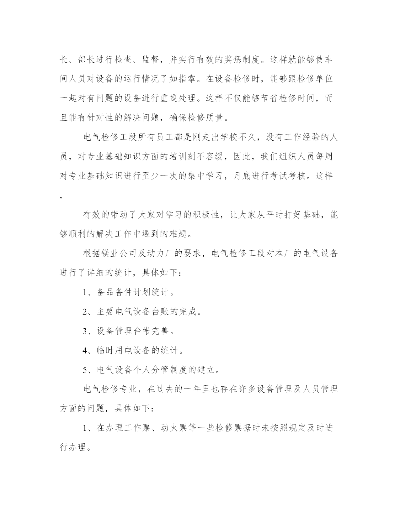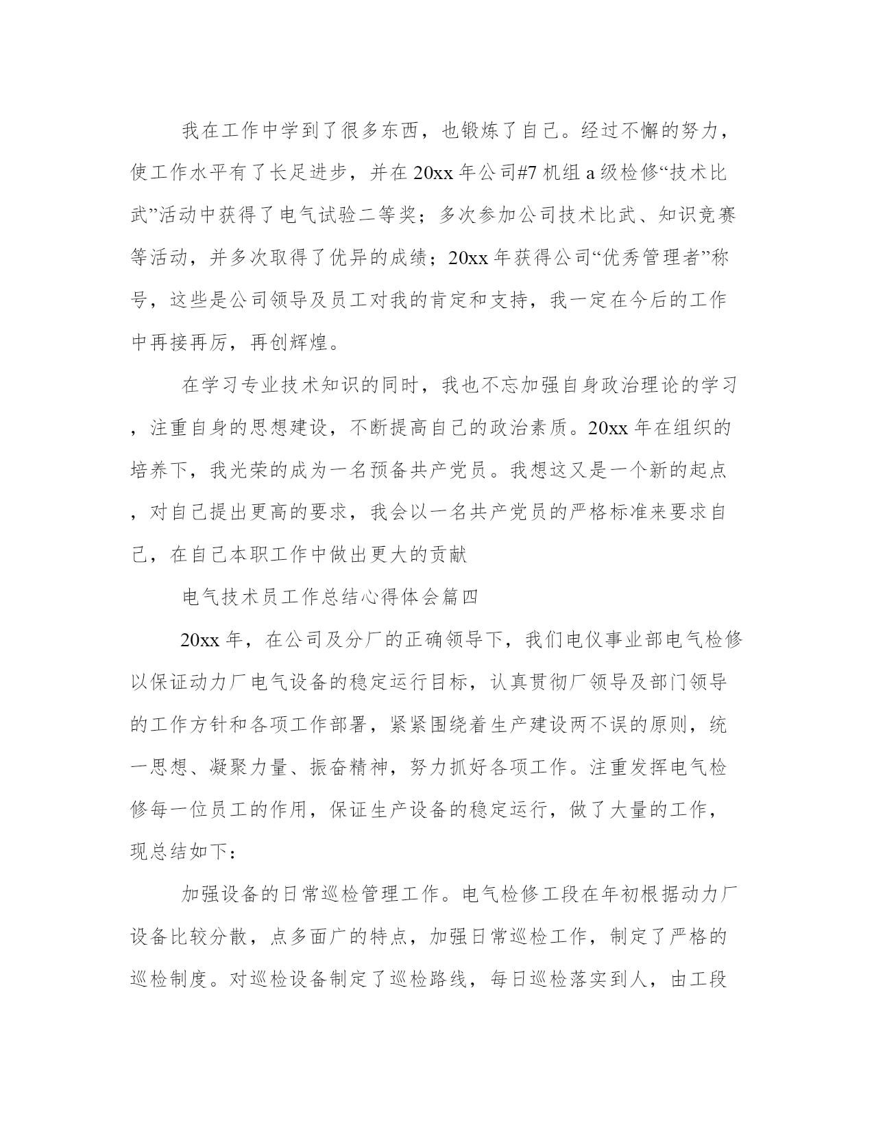 电气技术员工作总结心得体会(五篇)心中有不少心得体会时,不如来好好地做个总结,写一篇心得体会,如此可以一直更新迭代自己的想法。大家想知道怎么样才能写得一篇好的心得体会吗?下面我帮大家找寻并整理了一些优秀的心得体会范文,我们一起来了解一下吧。电气技术员工作总结心得体会篇一从毕业进入工程领域我一直从事制药行业的电气施工工作,并且一直在华北制药项目。现在在华药三期,主要工作仍然是现场电气施工管理和安全管理。对于这里的人和事物都比较了解熟悉,这对于我来说可以算是轻车熟路,但是以往的经验教训时刻在提醒着自己,经验仍然需要积累,不足仍然还有很多。原来的工作是直接面对监理方和建设方,现在增加了施工方。所以作为分包单位的甲方,我需要做到全面统筹全面管理,工作的性质没有变,但是范围变大了。这更加需要很好的协调能力才能去胜任自己的工作,对自己又提出了新的挑战。从今年8月份进入公司到现在虽然仅有短短的几个月,但是对公司有了新的认识。作为在电气安装工程领域一个年轻的企业来说,他的前途充满着无限挑战,充满着无限的希望。对于个人来讲,提供给我的是宽广而又活跃的舞台。现在的电气不在是单一的工种,它需要与仪表、自控等相关专业的严密结合。所以要想做一个合格完美的电气技术员,必须提高自己的相关专业水平。就此从以下几方面进行了学习:1、华药三期除电气外,还有仪表和弱电。由于我的专业没有变化,所以抽出了足够的时间去了解和学习了仪表、弱电的知识。掌握了仪表常用的设备名称,所需材料,图纸标识符号等。参与了工程量的统计;2、参与了分包单位的电气调试工作,向他们学习电气设备内部的工作原理,主要组件的调试,充实了自己的专业知识;3、作为工程总承包方,常用合同、技术协议的编写工作是每个文豪员工必须掌握的基本技能。由于原来没有涉及此方面,所以我参考已有的合同,跟同事和领导学习,可以独立自主地完成简单的合同协议等。人们常说“金无赤金,人无完人”,有优点就会有不足。三人行必有我师,周围的同事都可以做我的老师,他们的长处正好是我的不足,是我学习和参考的方向。预算是一个工程单位争取最大利益的一个条件,虽然我有一定的预算基础,但是水平线还很低,需要有更大的提升。另外取得二级造价师和二级建造师是明年需要完成的一项任务。不断的总结可以从中发现更多的不足,明确优缺点,为下一步更好的提升自己指明方向。不断地接受挑战才能不断地完善自己,才能更好地体现自己的人生价值。硕果累累的20xx已经翻过,充满挑战的20xx即将揭开,希望公司在新的一年里业绩蒸蒸日上,自己的专业水平有更大的提高,能够更好的洗礼自己。电气技术员工作总结心得体会篇二时光如梭,当我意气奋发地跨入二十一世纪的时候,不知不觉中参加工作已满十五个年头。回首这些年的工作,有硕果累累的喜悦,有与同事协同攻关的艰辛,也有遇到困难和挫折时惆怅。现将这些年的主要工作总结如下:一个人的信念是人的世界观在奋斗目标方面的集中反映,共产主义信念是我一生执著的追求目标和持久的精神激励力量。我把政治上追求与现实中工作结合起来,我把为共产主义奋斗终身的信念从朴素、直观认识在学习、工作中日益上升到自觉、理性的高度,从感性认识上升到了理性认识。在工作中我焕发出了高度的积极性和创造性,脚踏实地、艰苦创业,捍卫自己的信仰和共产主义事业,努力完成党交给我的各项任务。因为我有了始终不渝的政治信念,坚定不移的政治立场,所以,我才能在实际工作中保持锐意改革,勇于进取的革命气概,保持锲而不舍、顽强奋斗、拼搏到底的作风,保持我乐于奉献、不怕牺牲、全心全意为人民服务的精神。我从做好本职工作和日常工作入手,从我做起、从现在做起、从身边的小事做起并持之以恒。伟大寓于平凡。我在本职工作中尽心尽力、孜孜不倦地做出成绩。鼓实劲、察实情、说实话、办实事、求实效。我不断提高自己的业务本领,努力精通本职的业务知识,做本职工作的骨干和行家里手,脚踏实地的做好本职工作。把远大目标与现实努力结合起来,把为人民谋利益的决心同过硬的本领有机地统一起来、把为人民谋利益的热情同实事求是的态度有机地统一起来、把全心全意为人民服务的良好愿望同本职工作有机地统一起来。把全心全意为人民服务的良好愿望同本职工作统一起来。我在实践中为群众办实事,把着眼点放在本职岗位和现实基础上,在工作、生活中我一直相信一份耕耘、一份收获。所以我一直在努力。不断的努力学习、不断的努力工作。x年4月受省电力局局办公室之委托,为全局办公室系统编写了文秘类计算机培训教材,该书主要包括计算机的基础知识、文字处理软件的使用、公文处理软件的使用、lousorganizer(事务管理软件)的使用。由于该书通俗易懂,实用方便,受到各单位办公室秘书们的一致好评,在各单位得到广泛使用,作为首选的基础培训教材。x年5月参加xx省电力局