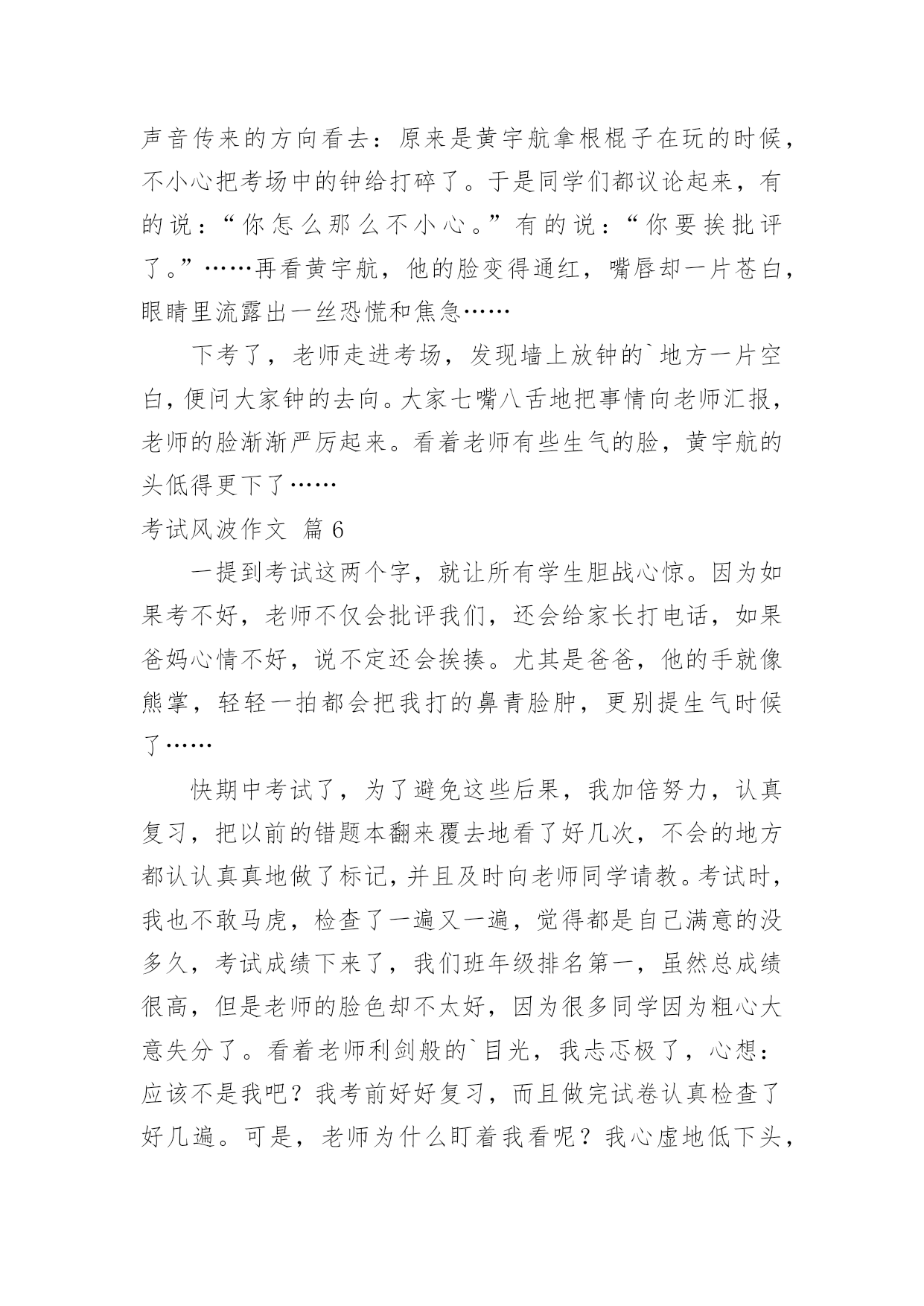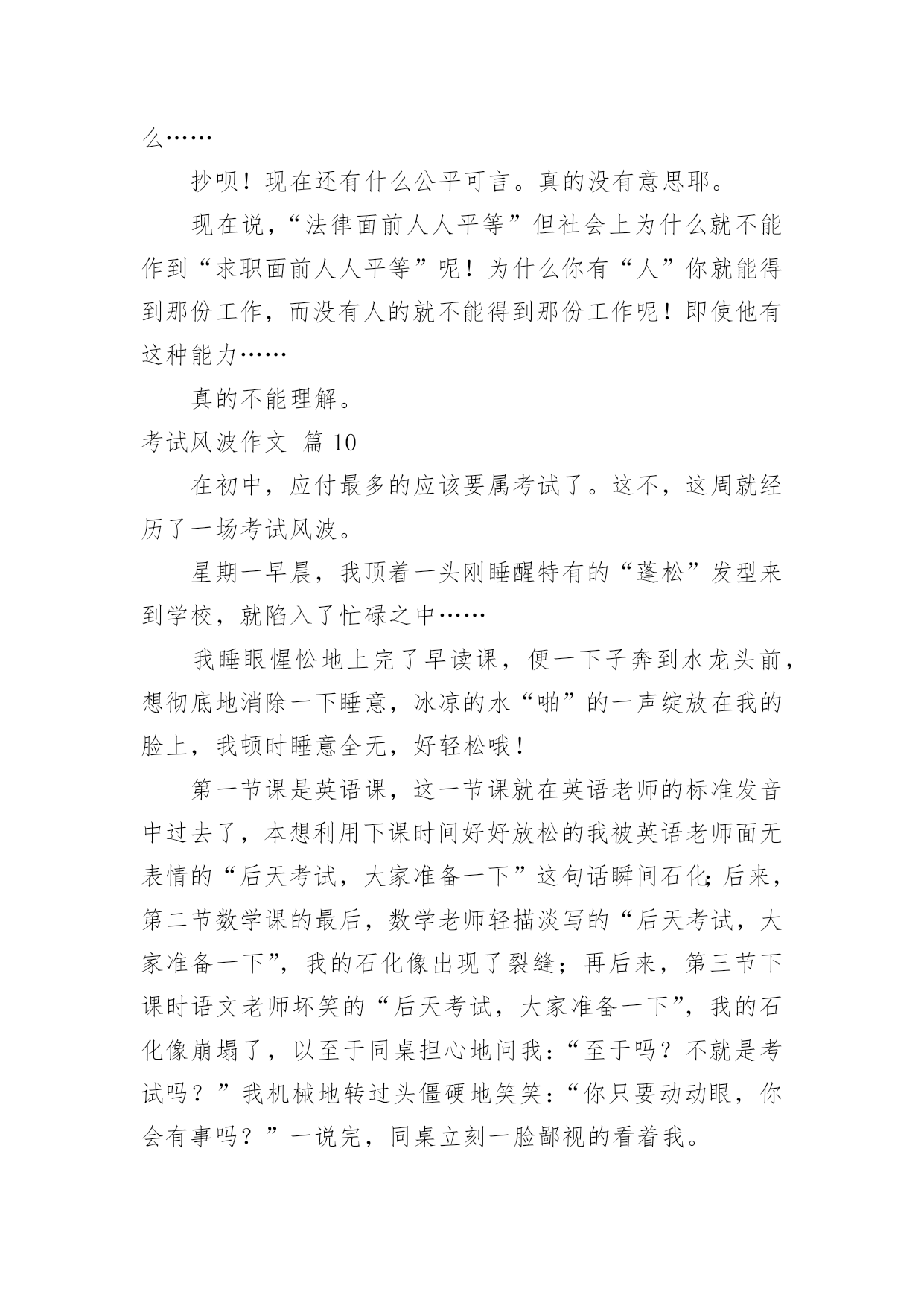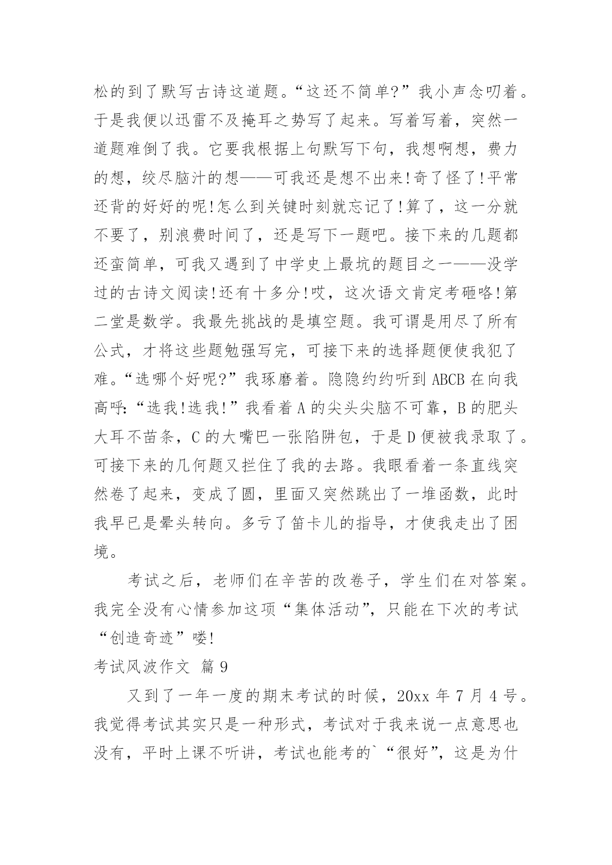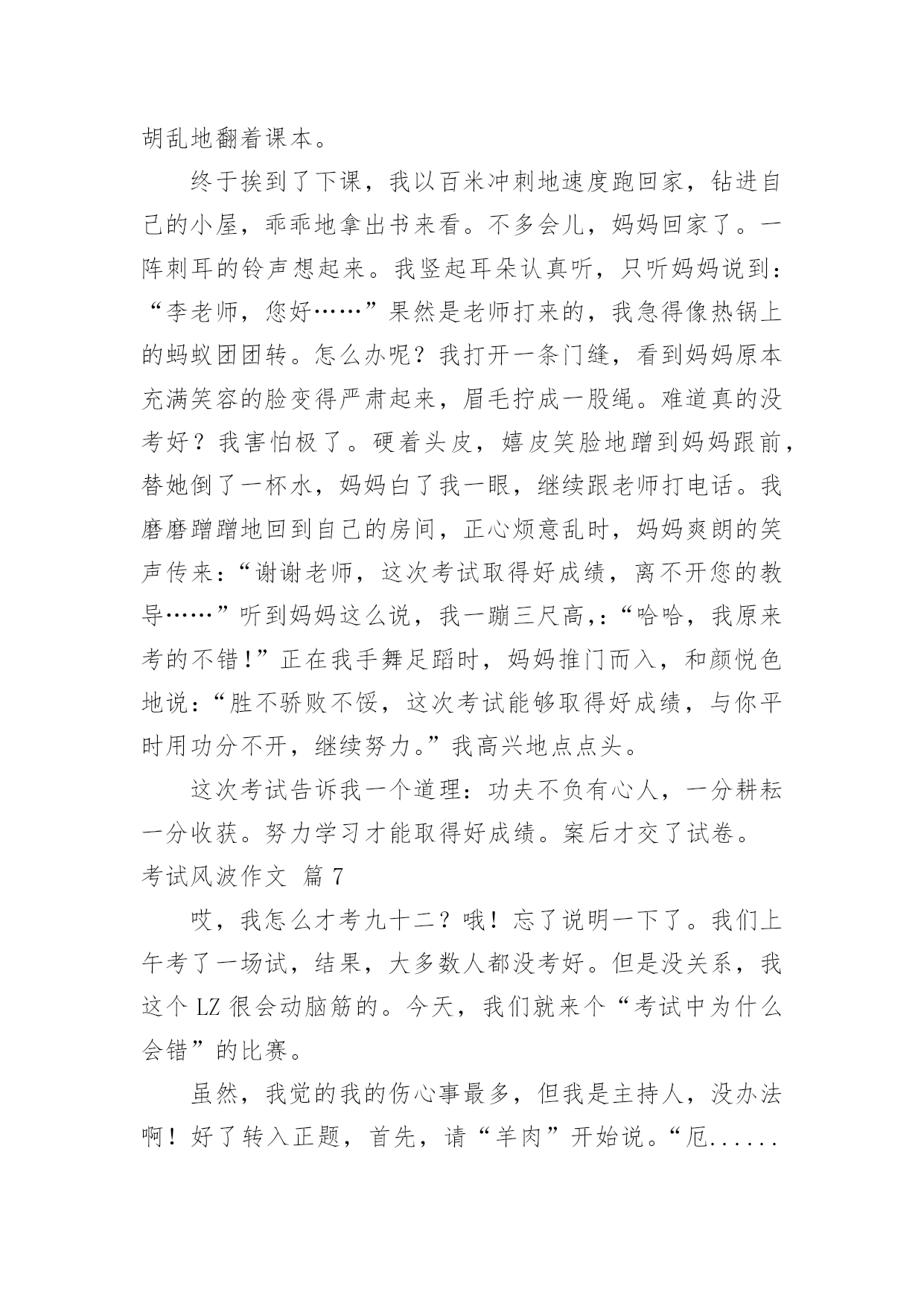 考试风波作文【推荐】考试风波作文10篇在平凡的学习、工作、生活中,大家最不陌生的就是作文了吧,作文根据写作时限的不同可以分为限时作文和非限时作文。如何写一篇有思想、有文采的作文呢?以下是小编收集整理的考试风波作文10篇,仅供参考,希望能够帮助到大家。考试风波作文篇1期中考试之前,一阵阵考试风波袭击着我们,可我们脆弱的身体经不住这样的风吹雨打,这样的考验呀!每次考试的.时候,我真想在鞋底抹油,赶紧溜之大吉。当老师拿着考试卷走进门时,侧耳细听,一阵震耳欲聋的响声马上袭入你的耳朵。那是我们的叹息声,比以前的欢呼声要大出好几倍呢考试的时候,你只能听见笔在纸上写字的声音,还有有些人想不到答案咬着笔头的声音。我那喊道:“让暴风雨来的更猛烈些吧!”六年了,每逢遇到考试。就是语数外一起来。语文考完了考数学,数学考完了考英语,英语考完了就放学,中间不间断,连休息的时间都没有了。好不容易盼来一个下课,大喊一声,冲出门外。我们自由啦!考试风波已过,一切风平浪静。哦耶!考试风波作文篇2盼望了一日又一日,期末考试终于来到了,我既欣喜若狂,又不知如何面对漫长的假期,让假期过得有意义。试卷一张张发下来,我觉得题目挺容易,于是我加强警惕,这时几个“死党”想作弊。由于本人平时的'成绩还算可以,马上就有人来“慰问”我了,可那同学刚扔出纸条,就被监考老师发现了,人脏俱获,挨了批评……真冤呀!不久,我自己也遇见“拦路虎”了。李白的《赠汪伦》,第三句“桃花潭水深千尺”,我当时怎么也想不起来。唉!又要扣两分。真惨啊!总而言之,考试风波渐渐平息了,就要面对暑假生活,我要让暑假要过得有意义,才能为以后的打好学习基础。我要怎样过得有意义呢?让我想一想……考试风波作文篇3从小到大,不知考了多少场试呀!考试后,无疑是两种结果:考得好或不好。考得好了,老爸老妈心里乐开了花儿,恨不得把什么都给你!老师也是和颜悦色的。在同学面前,有仇的报仇,有怨的抱怨,别提有多爽了。而考得不好的,那真是处境惨绝人寰了,整个儿就是一革命烈士,一副时刻准备着为国牺牲的架势,套用小品里的`一句话:眼睛一闭一睁,一天就过去了啊——眼睛一闭不睁,一辈子就过去了啊——总结一下考试结果,那就是:考得好,你赢得了全世界,考得不好,那就是世界没有了,自个儿也赔进去了。唉,说再多也没用了,反正不死也死了,静观其变吧!回头想想考试时,有趣的事还不少呢!就说在初1上学期时候,坐在我右前方的那哥们儿,那可真是绝了。我在考思政、历史埋头苦写时,猛地一抬头,发现他好像在周公家里做客,一只手正在撑自己的脖子,并且指甲比我要长上好几倍,我当时兴趣就来了,从口袋里拿出指甲刀,准备给这将来祖国的栋梁之才修修枝叶,不料监考老师的眼光似乎瞄上我,比动感光波还要强大,在瞬间将我缴杀。我当时手抖了抖,便不敢轻举妄动了,生怕这卷子被收了,安分了上半场考试,但对那“茂密的枝叶”依旧念念不忘。还是这场考试,下半场情况就迥乎不同了,我前面那位比我矮一截的“小弟弟”更猖獗,公开地将历史书摊在课桌上,更可怕的是,监考老师竟然都没看出来。我反正也考好了,不如好好提醒这位哥们儿吧!于是,我不断的敲他的头,但他只是左顾右盼一下,又继续明目张胆地“看书”,I服了you。当时我多么想喊一声我们亲爱的监考老师,但我最终放弃了。我在正义面前做了一次逃兵,我为了我的行为所不耻,But,更鄙视那个家伙。考试风波作文篇4生活就像一首诗,喜怒哀乐都藏在这首诗里,但让我最难忘的还是那一次考试。记得三年级下册有一次数学考试,我一拿到试卷看了一下题目,都是学过的很简单,我不慌不忙地做了起来,我做了一半就发现有好多题有问题,我一看钟表,只剩下10分钟了,我毛毛燥燥地写完后面的题目“叮——铃——铃”下课铃声响了,老师叫第一个同学收上来,哎呀!我还没有做完呢!不管了,收完试卷我从抽屉里拿出了数学书,我一看发现好多题都错了,这时我的心里怦怦地跳起来了。时间好像进入了无限循环空间,我大脑里浮现出妈妈严厉的话,老师失望的神色,到了晚上我更是忐忑不安躺在床上,望着无边无际的星空,等着明天的现实。第二天一早第一节课就是数学课,只见数学老师生气地走进教室,提着一个文件包,从里面拿出一大堆试卷,我顿时脑子一片空白,老师从高到低依次报分,“义程100,子奇98”怎么还没报到我的呢?只听:“唐灏轩87。5”我愣住了。这是有史以来考最差一次了,我的几个好朋友都来安慰我,我耸了耸肩,就在这时老师就让我去办公室,我一进去更是毛骨悚然,老师说:“你平时还可以的,这次怎么考砸了,你好好反思一下。”我无以辩驳。回到家,我把试卷给爸爸看,爸爸并没有骂我,而是亲切的对我说:“儿子,这些错题都是粗心导致的`,你细心一点一定会避免这些错误的。”听了爸爸的话,我更加不好意思,通过这次考试,我发现我的错误,上课要认真听,回家作业
