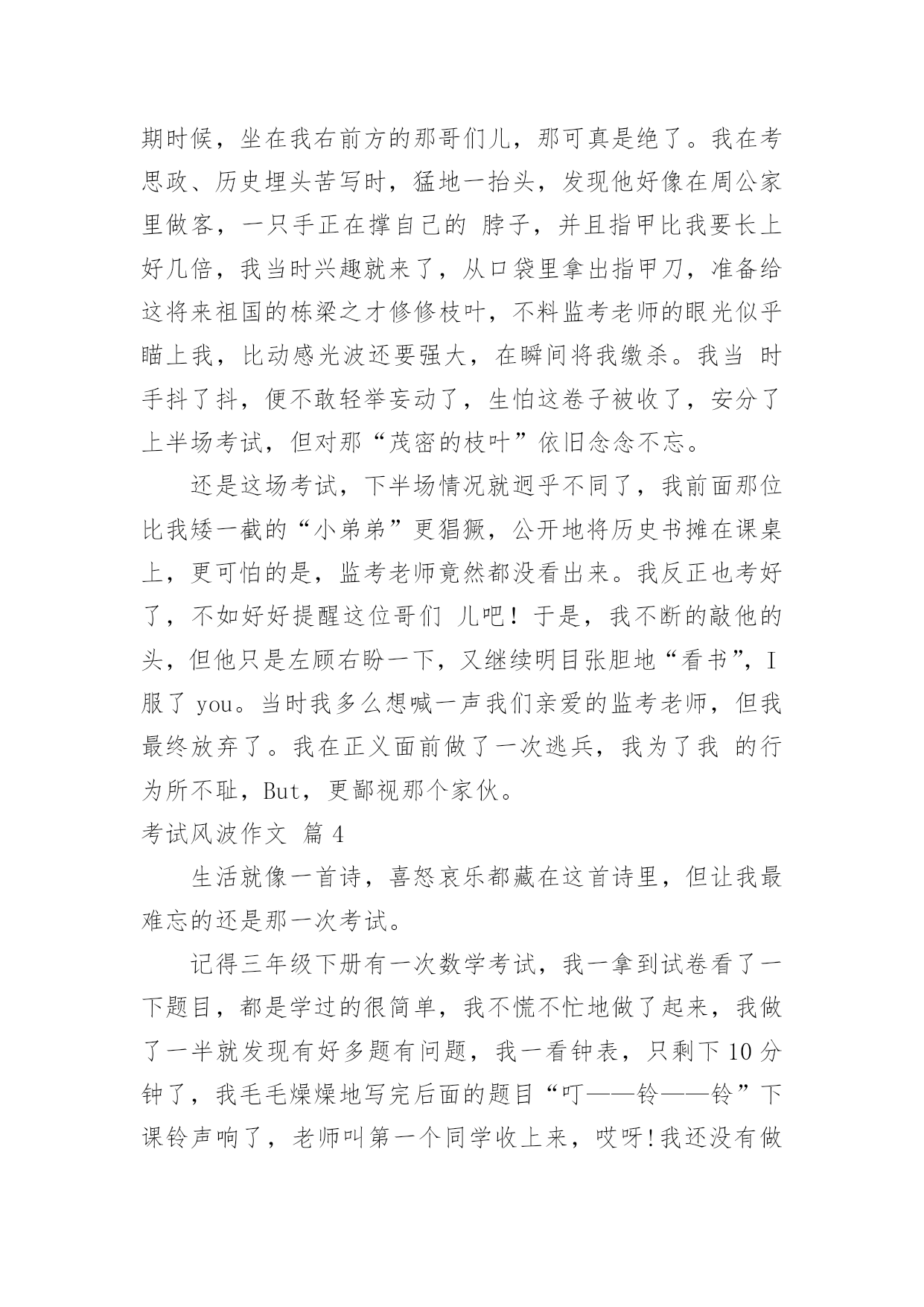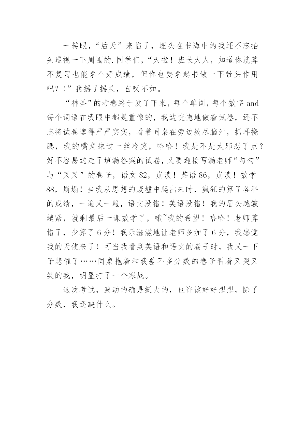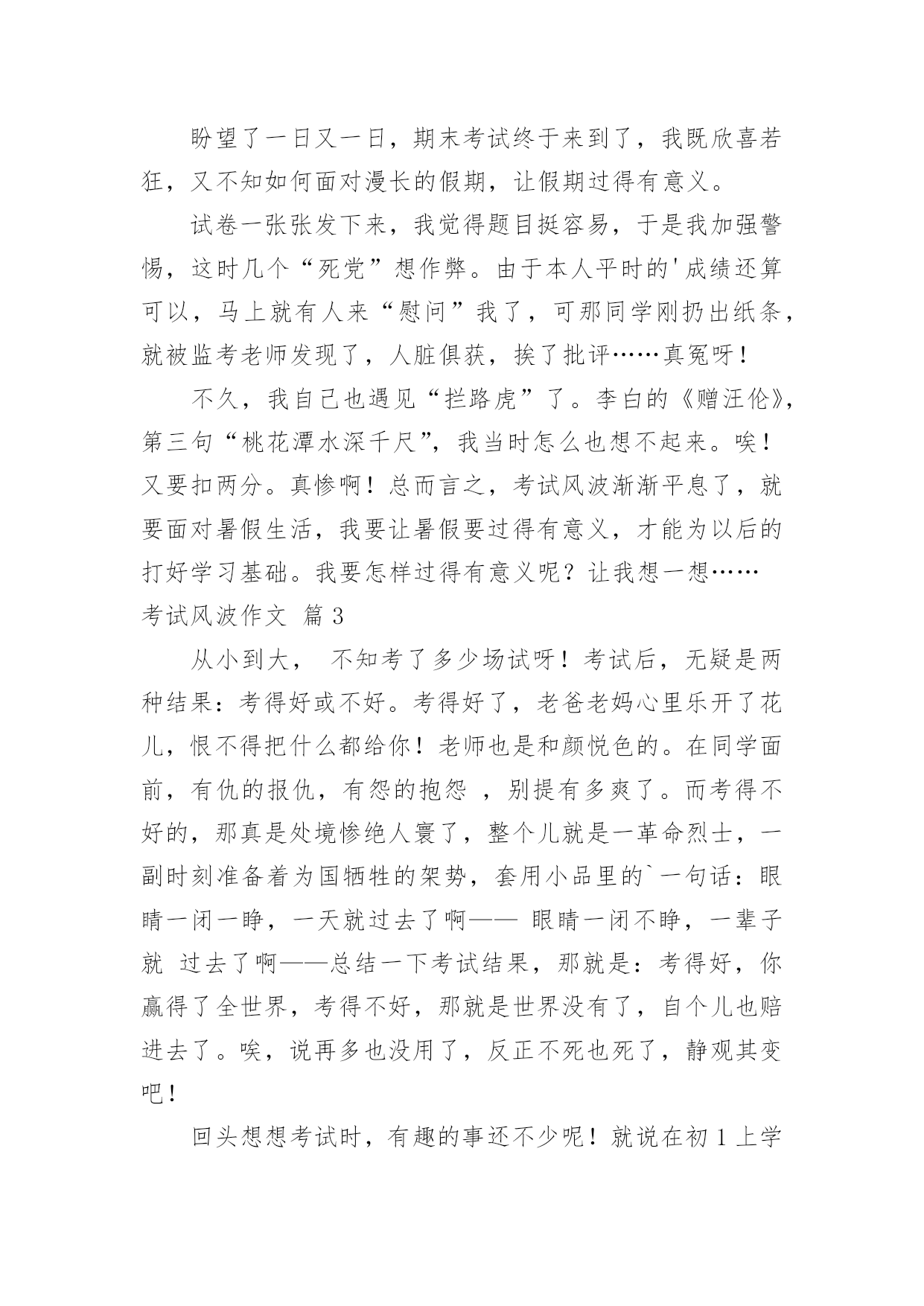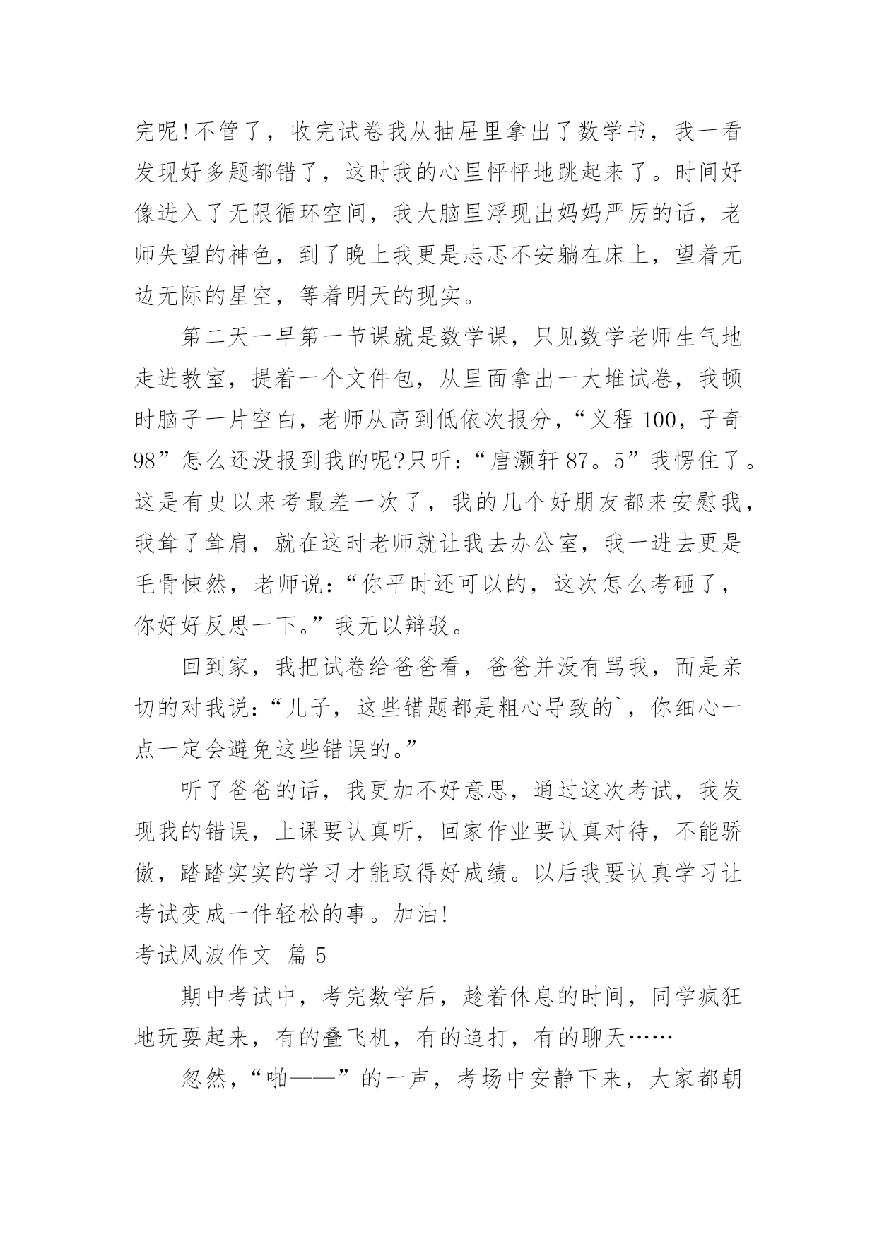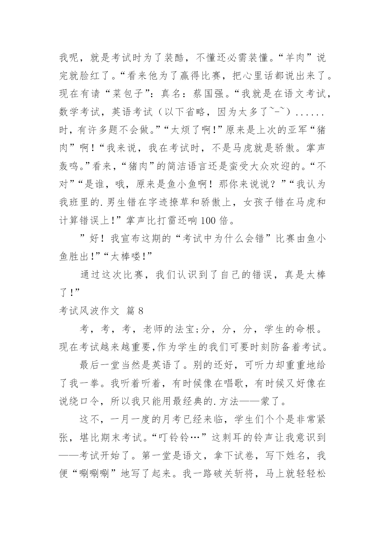 考试风波作文【推荐】考试风波作文10篇在平凡的学习、工作、生活中,大家最不陌生的就是作文了吧,作文根据写作时限的不同可以分为限时作文和非限时作文。如何写一篇有思想、有文采的作文呢?以下是小编收集整理的考试风波作文10篇,仅供参考,希望能够帮助到大家。考试风波作文篇1期中考试之前,一阵阵考试风波袭击着我们,可我们脆弱的身体经不住这样的风吹雨打,这样的考验呀!每次考试的.时候,我真想在鞋底抹油,赶紧溜之大吉。当老师拿着考试卷走进门时,侧耳细听,一阵震耳欲聋的响声马上袭入你的耳朵。那是我们的叹息声,比以前的欢呼声要大出好几倍呢考试的时候,你只能听见笔在纸上写字的声音,还有有些人想不到答案咬着笔头的声音。我那喊道:“让暴风雨来的更猛烈些吧!”六年了,每逢遇到考试。就是语数外一起来。语文考完了考数学,数学考完了考英语,英语考完了就放学,中间不间断,连休息的时间都没有了。好不容易盼来一个下课,大喊一声,冲出门外。我们自由啦!考试风波已过,一切风平浪静。哦耶!考试风波作文篇2盼望了一日又一日,期末考试终于来到了,我既欣喜若狂,又不知如何面对漫长的假期,让假期过得有意义。试卷一张张发下来,我觉得题目挺容易,于是我加强警惕,这时几个“死党”想作弊。由于本人平时的'成绩还算可以,马上就有人来“慰问”我了,可那同学刚扔出纸条,就被监考老师发现了,人脏俱获,挨了批评……真冤呀!不久,我自己也遇见“拦路虎”了。李白的《赠汪伦》,第三句“桃花潭水深千尺”,我当时怎么也想不起来。唉!又要扣两分。真惨啊!总而言之,考试风波渐渐平息了,就要面对暑假生活,我要让暑假要过得有意义,才能为以后的打好学习基础。我要怎样过得有意义呢?让我想一想……考试风波作文篇3从小到大,不知考了多少场试呀!考试后,无疑是两种结果:考得好或不好。考得好了,老爸老妈心里乐开了花儿,恨不得把什么都给你!老师也是和颜悦色的。在同学面前,有仇的报仇,有怨的抱怨,别提有多爽了。而考得不好的,那真是处境惨绝人寰了,整个儿就是一革命烈士,一副时刻准备着为国牺牲的架势,套用小品里的`一句话:眼睛一闭一睁,一天就过去了啊——眼睛一闭不睁,一辈子就过去了啊——总结一下考试结果,那就是:考得好,你赢得了全世界,考得不好,那就是世界没有了,自个儿也赔进去了。唉,说再多也没用了,反正不死也死了,静观其变吧!回头想想考试时,有趣的事还不少呢!就说在初1上学期时候,坐在我右前方的那哥们儿,那可真是绝了。我在考思政、历史埋头苦写时,猛地一抬头,发现他好像在周公家里做客,一只手正在撑自己的脖子,并且指甲比我要长上好几倍,我当时兴趣就来了,从口袋里拿出指甲刀,准备给这将来祖国的栋梁之才修修枝叶,不料监考老师的眼光似乎瞄上我,比动感光波还要强大,在瞬间将我缴杀。我当时手抖了抖,便不敢轻举妄动了,生怕这卷子被收了,安分了上半场考试,但对那“茂密的枝叶”依旧念念不忘。还是这场考试,下半场情况就迥乎不同了,我前面那位比我矮一截的“小弟弟”更猖獗,公开地将历史书摊在课桌上,更可怕的是,监考老师竟然都没看出来。我反正也考好了,不如好好提醒这位哥们儿吧!于是,我不断的敲他的头,但他只是左顾右盼一下,又继续明目张胆地“看书”,I服了you。当时我多么想喊一声我们亲爱的监考老师,但我最终放弃了。我在正义面前做了一次逃兵,我为了我的行为所不耻,But,更鄙视那个家伙。考试风波作文篇4生活就像一首诗,喜怒哀乐都藏在这首诗里,但让我最难忘的还是那一次考试。记得三年级下册有一次数学考试,我一拿到试卷看了一下题目,都是学过的很简单,我不慌不忙地做了起来,我做了一半就发现有好多题有问题,我一看钟表,只剩下10分钟了,我毛毛燥燥地写完后面的题目“叮——铃——铃”下课铃声响了,老师叫第一个同学收上来,哎呀!我还没有做完呢!不管了,收完试卷我从抽屉里拿出了数学书,我一看发现好多题都错了,这时我的心里怦怦地跳起来了。时间好像进入了无限循环空间,我大脑里浮现出妈妈严厉的话,老师失望的神色,到了晚上我更是忐忑不安躺在床上,望着无边无际的星空,等着明天的现实。第二天一早第一节课就是数学课,只见数学老师生气地走进教室,提着一个文件包,从里面拿出一大堆试卷,我顿时脑子一片空白,老师从高到低依次报分,“义程100,子奇98”怎么还没报到我的呢?只听:“唐灏轩87。5”我愣住了。这是有史以来考最差一次了,我的几个好朋友都来安慰我,我耸了耸肩,就在这时老师就让我去办公室,我一进去更是毛骨悚然,老师说:“你平时还可以的,这次怎么考砸了,你好好反思一下。”我无以辩驳。回到家,我把试卷给爸爸看,爸爸并没有骂我,而是亲切的对我说:“儿子,这些错题都是粗心导致的`,你细心一点一定会避免这些错误的。”听了爸爸的话,我更加不好意思,通过这次考试,我发现我的错误,上课要认真听,回家作业