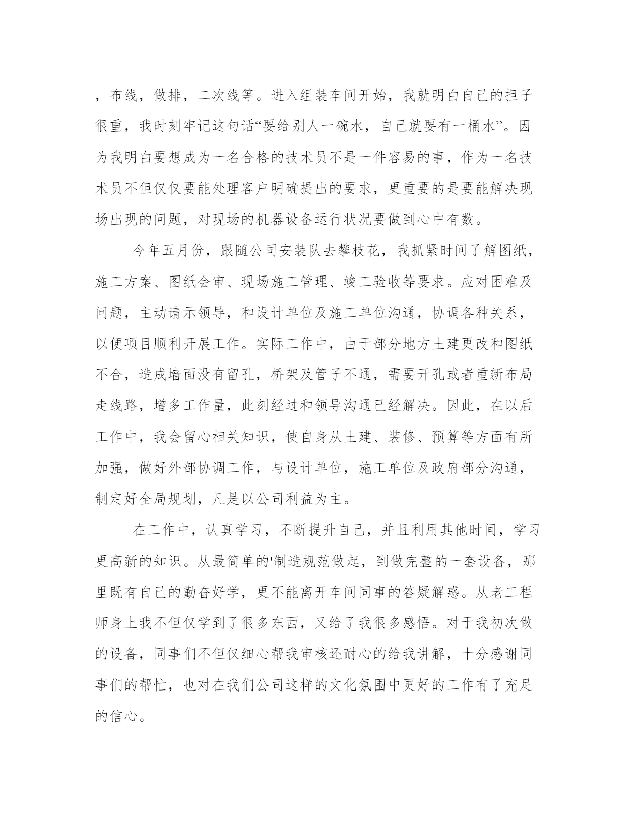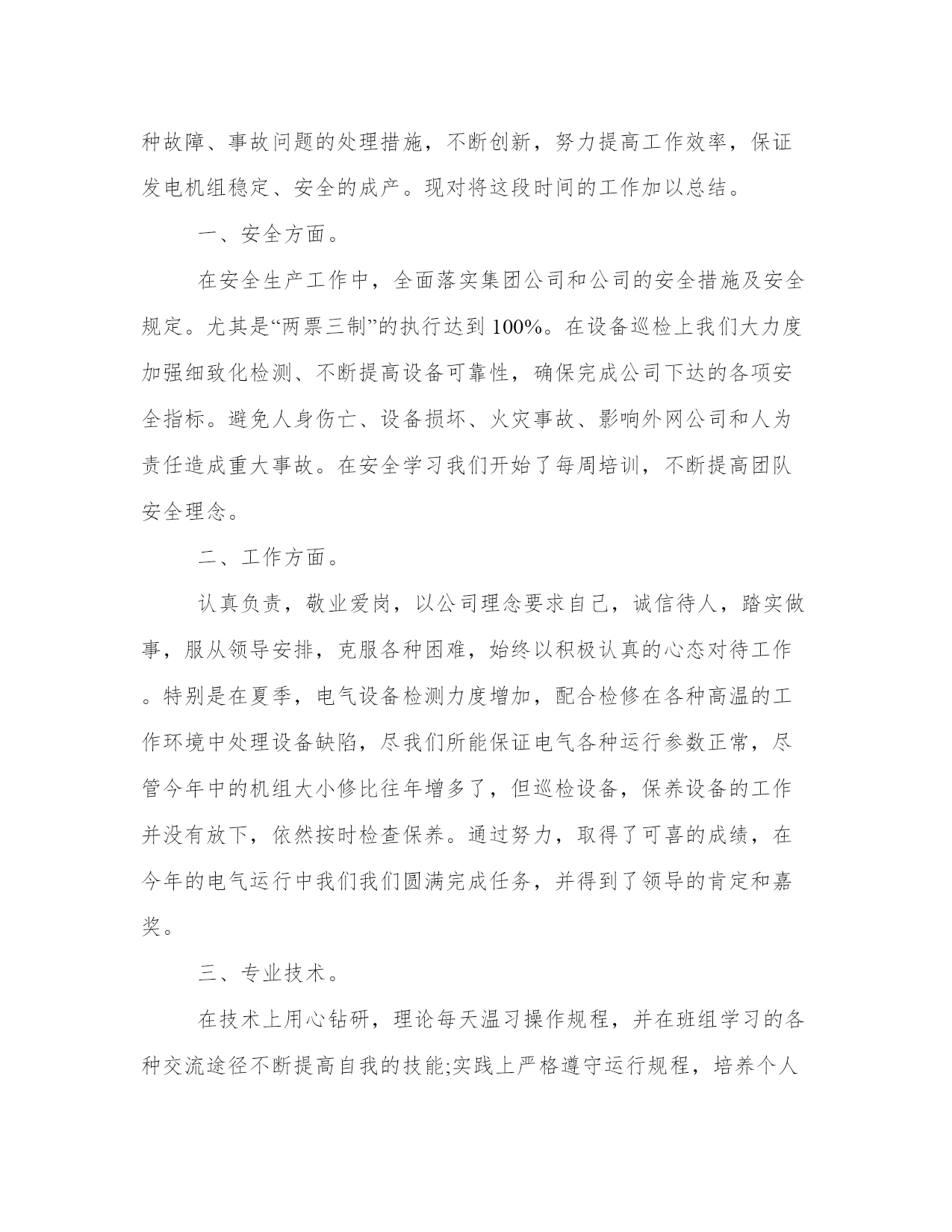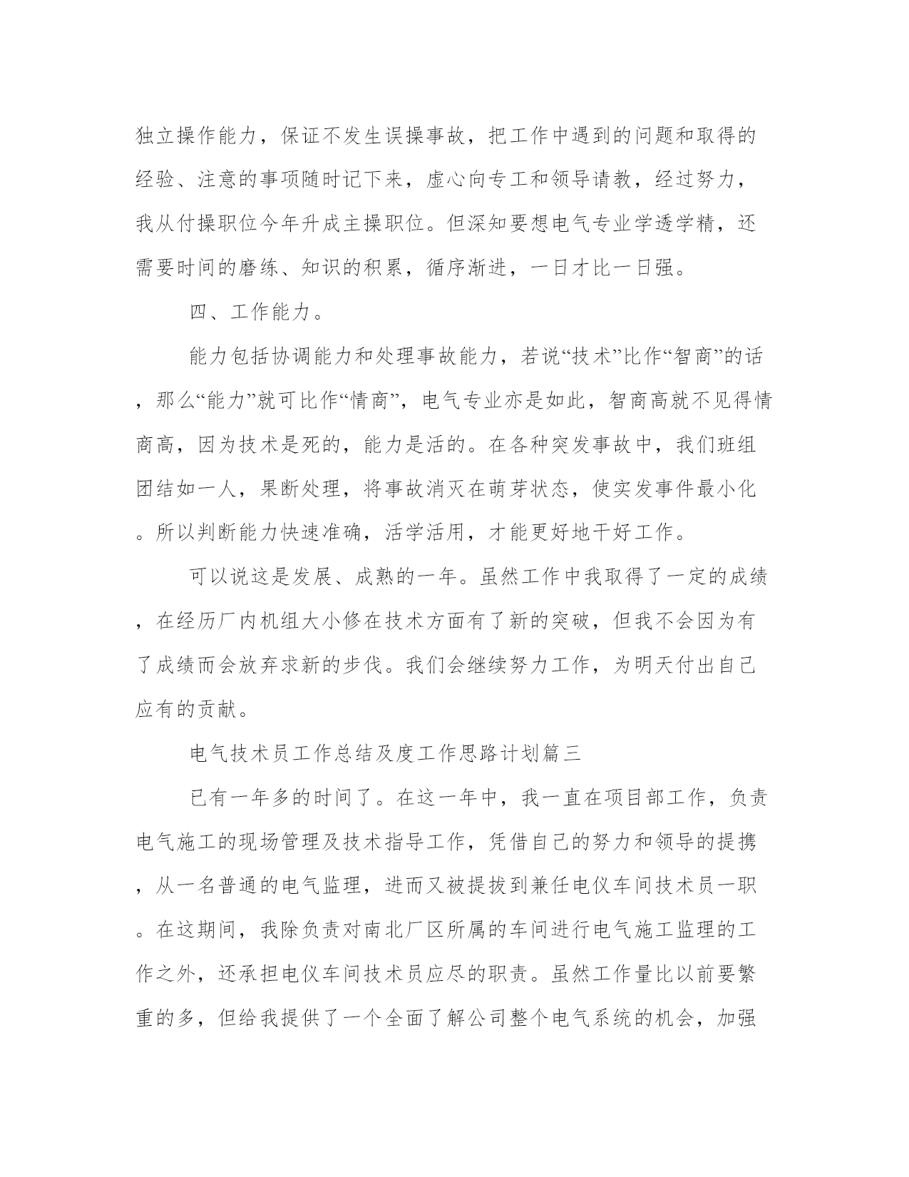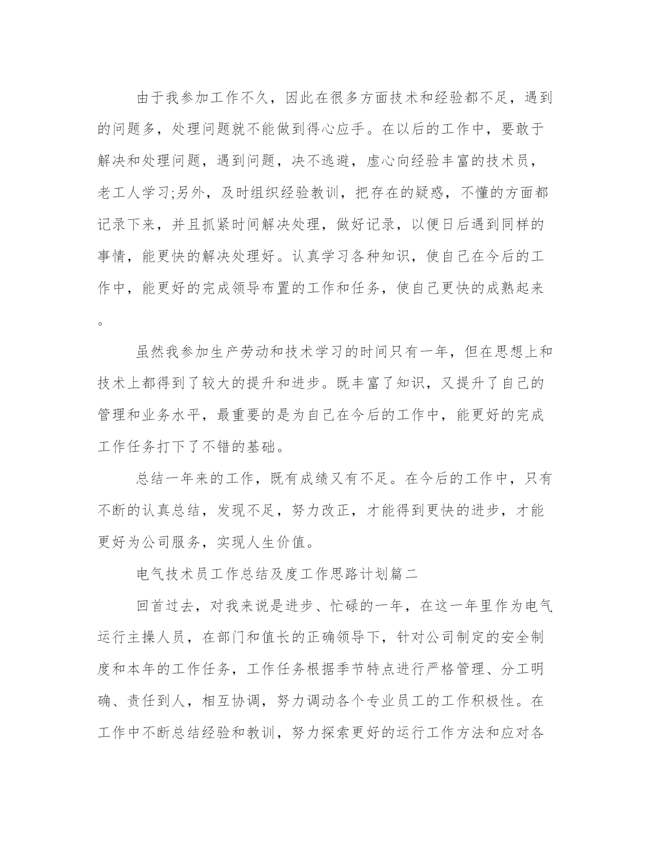 2024年电气技术员工作总结及度工作思路计划(汇总8篇)计划是提高工作与学习效率的一个前提。做好一个完整的工作计划,才能使工作与学习更加有效的快速的完成。因此,我们应该充分认识到计划的作用,并在日常生活中加以应用。以下是小编为大家收集的计划范文,仅供参考,大家一起来看看吧。电气技术员工作总结及度工作思路计划篇一时光飞逝,转眼间到公司已经一年,感受甚多,收获甚多。进入xx市xx电气设x公司,对我来说是一个不错的发展机遇,也是一个很好的锻炼和提升自己各方面潜力的机会。在此,首先个性感谢公司领导和同事们给予我的大力支持、关心与帮忙,使我能很快地适应的公司的管理制度,努力做好本职工作。进入公司以来,我认真了解了公司的发展概况,学习了公司的规章制度,了解了公司工艺流程。同时,更是真切地感受到了向上、催人奋进的企业文化,使我受益匪浅。现将本人一年来的工作状况总结如下:我进入xx是从钣金车间开始,做箱子柜子壳体,能说钣金车间是我对xx公司的第一印象。不得不说,在钣金车间的一个月,师傅们给我树立了不错的形象,使我受益匪浅。去年九月份,我进入组装车间实习,我深刻感受到同事们兢兢业业、力求完美的精神。在组装车间,我重点就是透过查阅相关资料、手册、图纸及说明书,了解各电器设备的操作及原理,学习设备布局,布线,做排,二次线等。进入组装车间开始,我就明白自己的担子很重,我时刻牢记这句话“要给别人一碗水,自己就要有一桶水”。因为我明白要想成为一名合格的技术员不是一件容易的事,作为一名技术员不但仅仅要能处理客户明确提出的要求,更重要的是要能解决现场出现的问题,对现场的机器设备运行状况要做到心中有数。今年五月份,跟随公司安装队去攀枝花,我抓紧时间了解图纸,施工方案、图纸会审、现场施工管理、竣工验收等要求。应对困难及问题,主动请示领导,和设计单位及施工单位沟通,协调各种关系,以便项目顺利开展工作。实际工作中,由于部分地方土建更改和图纸不合,造成墙面没有留孔,桥架及管子不通,需要开孔或者重新布局走线路,增多工作量,此刻经过和领导沟通已经解决。因此,在以后工作中,我会留心相关知识,使自身从土建、装修、预算等方面有所加强,做好外部协调工作,与设计单位,施工单位及政府部分沟通,制定好全局规划,凡是以公司利益为主。在工作中,认真学习,不断提升自己,并且利用其他时间,学习更高新的知识。从最简单的'制造规范做起,到做完整的一套设备,那里既有自己的勤奋好学,更不能离开车间同事的答疑解惑。从老工程师身上我不但仅学到了很多东西,又给了我很多感悟。对于我初次做的设备,同事们不但仅细心帮我审核还耐心的给我讲解,十分感谢同事们的帮忙,也对在我们公司这样的文化氛围中更好的工作有了充足的信心。由于我参加工作不久,因此在很多方面技术和经验都不足,遇到的问题多,处理问题就不能做到得心应手。在以后的工作中,要敢于解决和处理问题,遇到问题,决不逃避,虚心向经验丰富的技术员,老工人学习;另外,及时组织经验教训,把存在的疑惑,不懂的方面都记录下来,并且抓紧时间解决处理,做好记录,以便日后遇到同样的事情,能更快的解决处理好。认真学习各种知识,使自己在今后的工作中,能更好的完成领导布置的工作和任务,使自己更快的成熟起来。虽然我参加生产劳动和技术学习的时间只有一年,但在思想上和技术上都得到了较大的提升和进步。既丰富了知识,又提升了自己的管理和业务水平,最重要的是为自己在今后的工作中,能更好的完成工作任务打下了不错的基础。总结一年来的工作,既有成绩又有不足。在今后的工作中,只有不断的认真总结,发现不足,努力改正,才能得到更快的进步,才能更好为公司服务,实现人生价值。电气技术员工作总结及度工作思路计划篇二回首过去,对我来说是进步、忙碌的一年,在这一年里作为电气运行主操人员,在部门和值长的正确领导下,针对公司制定的安全制度和本年的工作任务,工作任务根据季节特点进行严格管理、分工明确、责任到人,相互协调,努力调动各个专业员工的工作积极性。在工作中不断总结经验和教训,努力探索更好的运行工作方法和应对各种故障、事故问题的处理措施,不断创新,努力提高工作效率,保证发电机组稳定、安全的成产。现对将这段时间的工作加以总结。一、安全方面。在安全生产工作中,全面落实集团公司和公司的安全措施及安全规定。尤其是“两票三制”的执行达到100%。在设备巡检上我们大力度加强细致化检测、不断提高设备可靠性,确保完成公司下达的各项安全指标。避免人身伤亡、设备损坏、火灾事故、影响外网公司和人为责任造成重大事故。在安全学习我们开始了每周培训,不断提高团队安全理念。二、工作方面。认真负责,敬业爱岗,以公司理念要求自己,诚信待人,踏实做事,服从领导安排,克服各种困难,始终以积极认真的心态对待工作。特别是在夏季,电气设