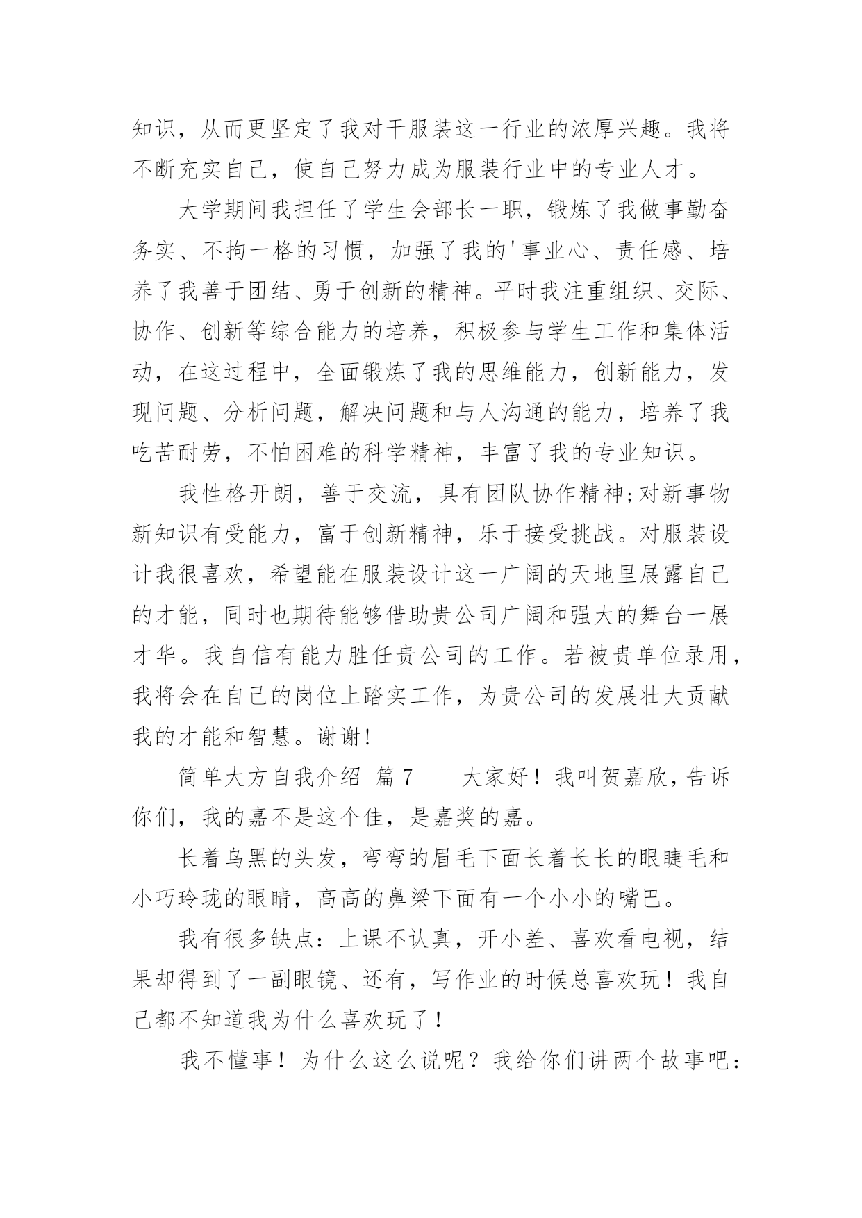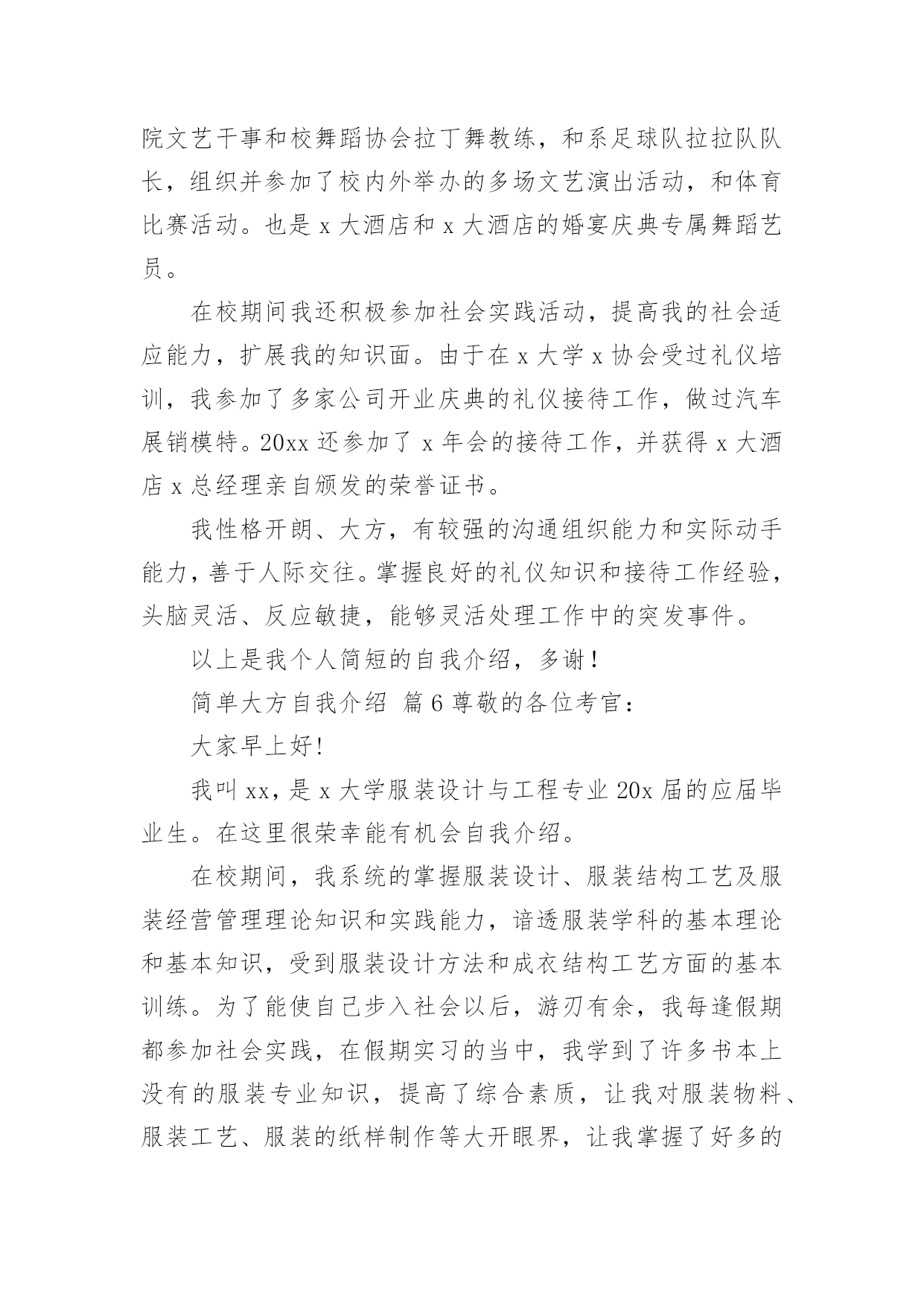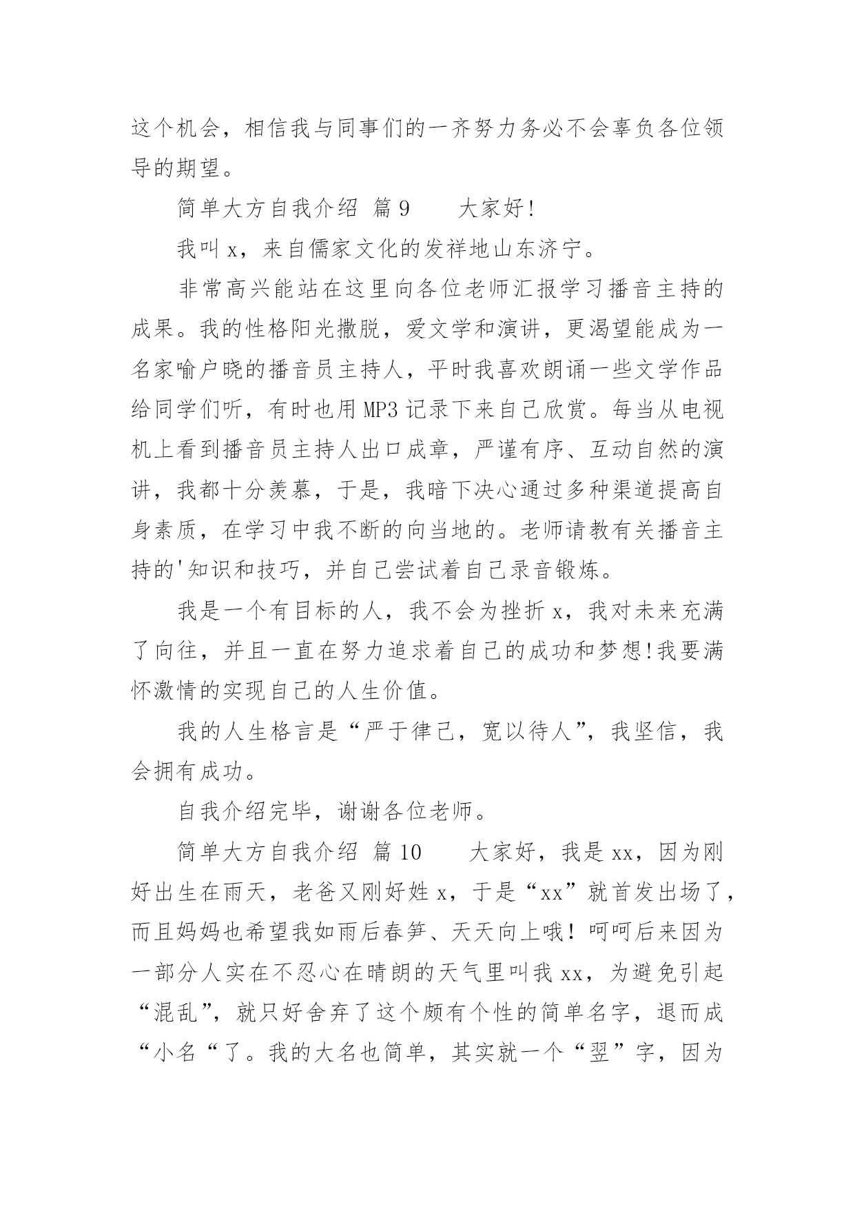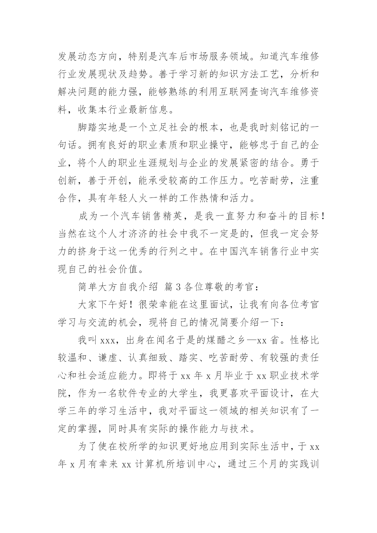 简单大方自我介绍简单大方自我介绍(精选25篇)来到一个陌生的地方时,我们往往需要进行适当的自我介绍,自我介绍是结识新朋友的重要手段。相信大家又在为写自我介绍犯愁了吧!下面是小编收集整理的简单大方自我介绍,欢迎阅读与收藏。简单大方自我介绍篇1各位考官:大家好!我叫xx,xx岁,来自武汉,我有着直爽的性格,但又不失稳重,不远千里来到xx这座城市求学。下面,我就自己的情况向各位作简单的个人自我介绍:“十年磨砺锋利出,宝剑只待君来识”。再苦再累,我都愿意一试,“吃得苦中苦,方为人上人”,在以后的`学习生活中,我一定会是一位尽自己的努力、过一个充实而又意义的大学生活。我也希望和各位相处愉快,天天开心,谢谢!简单大方自我介绍篇2大家好!作为汽车专业的一名应届毕业生。在学校期间,我始终以提高自身的综合素质为目标,以自我的全面发展为努力方向。通过四年的学习和生活,并参加了多次社会实践,我树立了正确的人生观和价值观,有一定的分析问题、解决问题的能力,有较强的动手能力。通过系统完善的汽车专业知识的学习,本人具有扎实的专业基础知识,并且有一定的`汽车管理知识。经常在课外大量猎阅图书馆中汽车类书刊资料。本人了解中国汽车产业发展动态方向,特别是汽车后市场服务领域。知道汽车维修行业发展现状及趋势。善于学习新的知识方法工艺,分析和解决问题的能力强,能够熟练的利用互联网查询汽车维修资料,收集本行业最新信息。脚踏实地是一个立足社会的根本,也是我时刻铭记的一句话。拥有良好的职业素质和职业操守,能够忠于自己的企业,将个人的职业生涯规划与企业的发展紧密的结合。勇于创新,善于开创,能承受较高的工作压力。吃苦耐劳,注重合作,具有年轻人火一样的工作热情和活力。成为一个汽车销售精英,是我一直努力和奋斗的目标!当然在这个人才济济的社会中我不一定是的,但我一定会努力的挤身于这一优秀的行列之中。在中国汽车销售行业中实现自己的社会价值。简单大方自我介绍篇3各位尊敬的考官:大家下午好!很荣幸能在这里面试,让我有向各位考官学习与交流的机会,现将自己的情况简要介绍一下:我叫xxx,出身在闻名于是的煤醋之乡—xx省。性格比较温和、谦虚、认真细致、踏实、吃苦耐劳、有较强的责任心和社会适应能力。即将于xx年x月毕业于xx职业技术学院,作为一名软件专业的大学生,我更喜欢平面设计,在大学三年的学习生活中,我对平面这一领域的相关知识有了一定的掌握,同时具有实际的操作能力与技术。为了使在校所学的知识更好地应用到实际生活中,于xx年x月有幸来xx计算机所培训中心,通过三个月的实践训练,全面系统地学习了平面方面的专业知识与技能,能够应用平面设计的相关软件(photoshop图像处理软件、illustrator与coreidraw矢量绘图软件、indesigin与pagemaker排版软件)做基本的图像处理、海报、企业宣传册等,能够将所学知识真正应用到实际生活中。在投身于社会之际,为了找到符合自己专业和兴趣的工作,更好地适应社会,我希望自己能够做到一种被别人需要的一种状态,至于做什么,就是在实践中,不断的学习、不断的`锻炼。因此,我希望加入贵单位,如果能够成为公司的一份子,我相信我一定在自己的岗位上尽职尽责、踏踏实实地贡献之集的一份力量,与公司共同促进、发展。“世界之大,人才济济”。我承认之集还不是最优秀的人才,但是我希望之集是此岗位最合适的人选,希望有幸能够被贵公司领导予以特别考虑!简单大方自我介绍篇4各位老师、同学:大家好!我的名字叫xx,来自xxxx,今天能和大家在这里相识,并开始度过我们的大学生活,我感到很高兴!我出生于南方的小城,造就了我温和的性格,对待大家,我会带着一份热情·一份真诚,我会珍惜这难得的缘分,珍视大家的友谊。我热爱学习,珍惜这难得的.大学生活。我要充分抓紧时间,掌握学习内容,用新的知识充实自己。也希望我们在学习上,互帮互学,为我们的学习生活交上一份满意的答卷。我选择的是师范类的英语,虽然多多少少是带着些许遗憾的,但英语是我的爱好,承载着我的理想,我还会就可能多的学习相关知识,补充充实自己,为今后走上工作岗位创造条件。我和在座的同学们一样,渴望展翅高飞,渴望将来有更大的发展空间,有施展才华的更广阔的天地。我想,有耕耘就会有收获。未来的四年里,由各位老师的倾情传授,我们一定会有一个无限美好的未来。我真诚的希望:我们能成为好朋友。请大家多帮助我。谢谢!简单大方自我介绍篇5亲爱的面试官:你们好。我叫x,专业xx。我是一个性格开朗,充满自信的阳光女孩。开朗的性格使我充满活力,善于与人交往;从容自信使我勇于挑战自我去尝试学习新的事物。在大学期间我不断地完善自己,提高自身素质。在学好专业课和公共课的基础上,我博览群书,为自己打下了坚实的专业基础。我阅读了大量课外书籍,不断增加新知识,陶冶情操