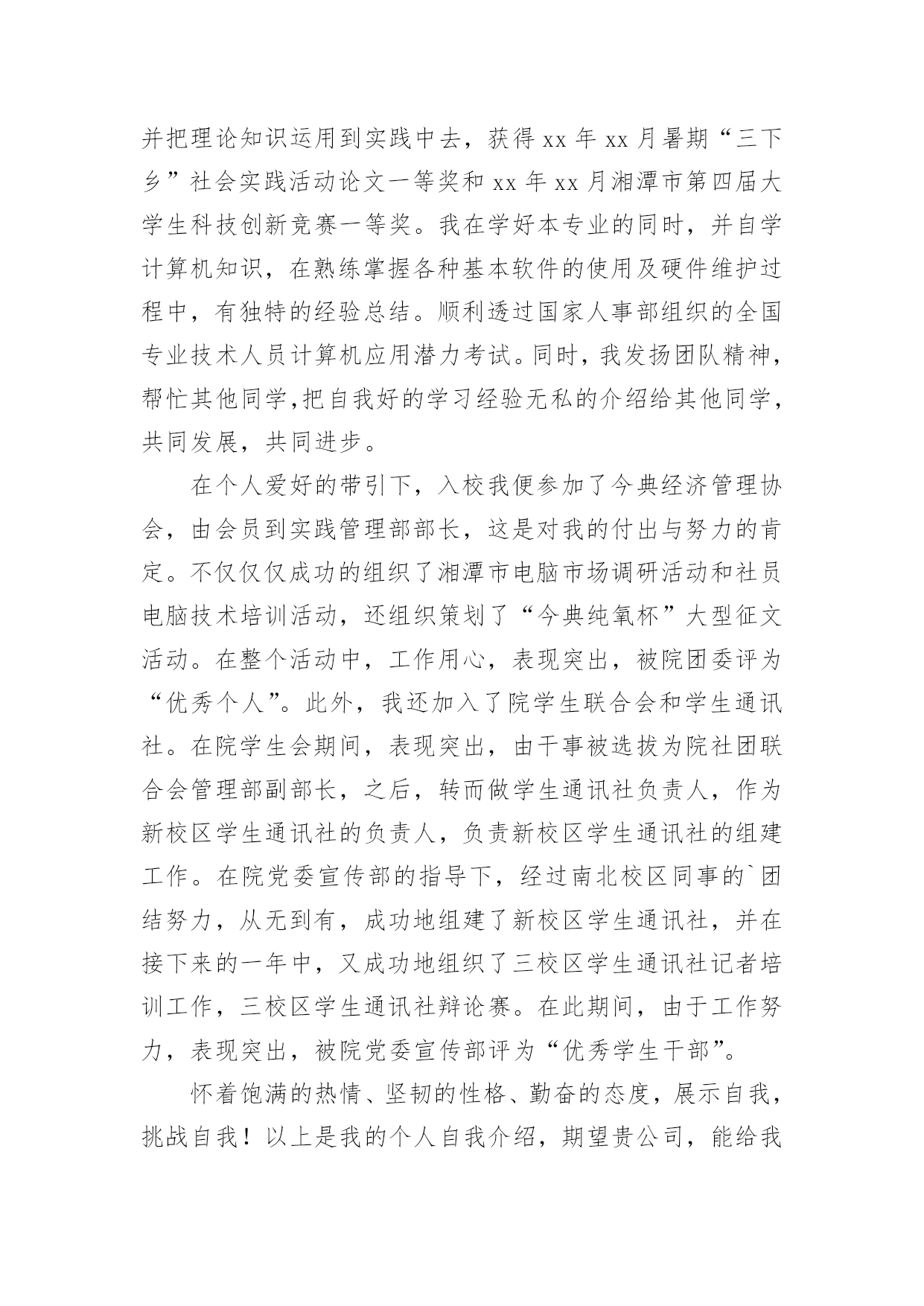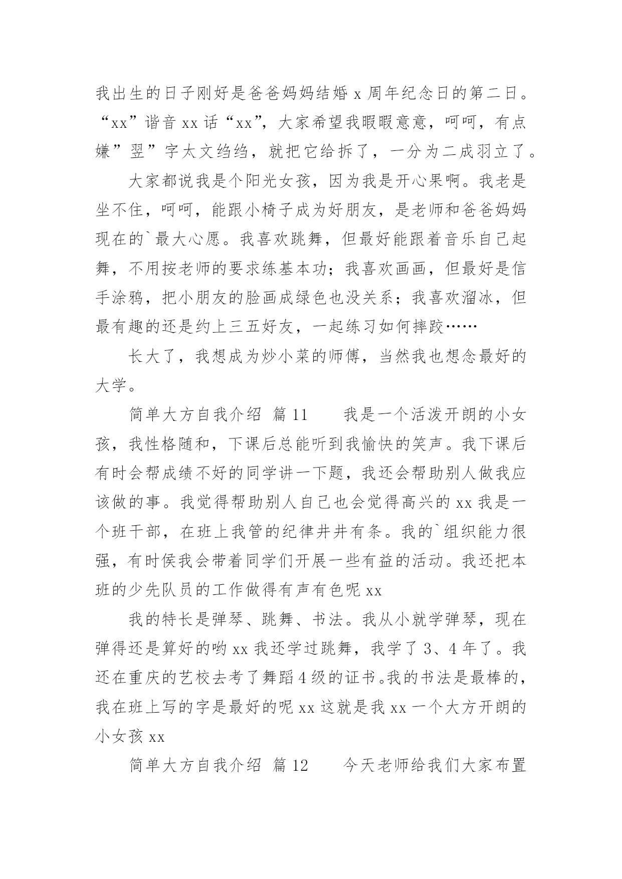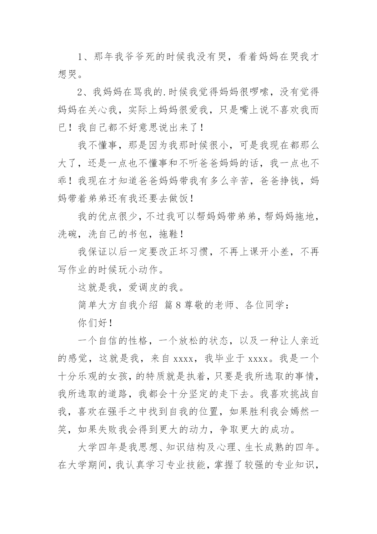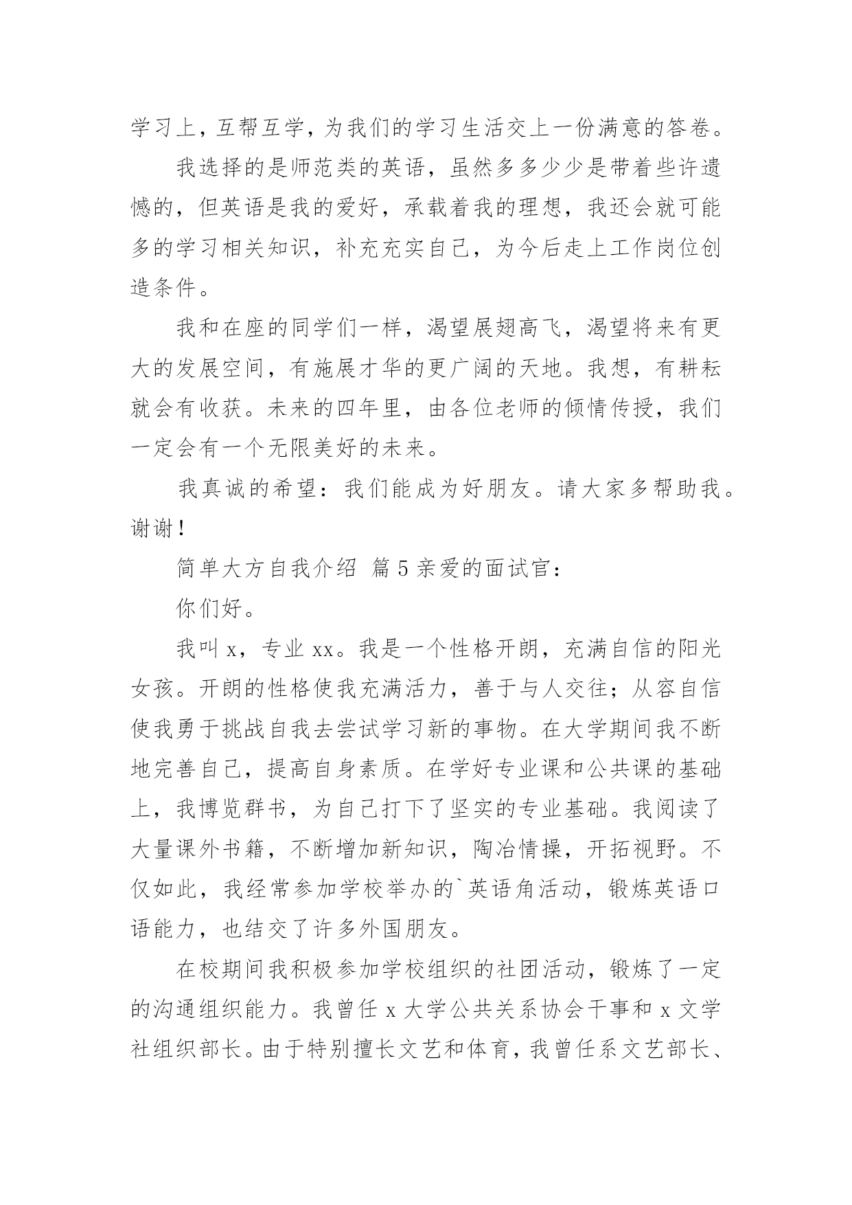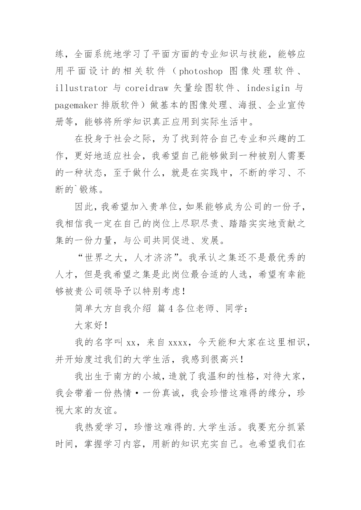 简单大方自我介绍简单大方自我介绍(精选25篇)来到一个陌生的地方时,我们往往需要进行适当的自我介绍,自我介绍是结识新朋友的重要手段。相信大家又在为写自我介绍犯愁了吧!下面是小编收集整理的简单大方自我介绍,欢迎阅读与收藏。简单大方自我介绍篇1各位考官:大家好!我叫xx,xx岁,来自武汉,我有着直爽的性格,但又不失稳重,不远千里来到xx这座城市求学。下面,我就自己的情况向各位作简单的个人自我介绍:“十年磨砺锋利出,宝剑只待君来识”。再苦再累,我都愿意一试,“吃得苦中苦,方为人上人”,在以后的`学习生活中,我一定会是一位尽自己的努力、过一个充实而又意义的大学生活。我也希望和各位相处愉快,天天开心,谢谢!简单大方自我介绍篇2大家好!作为汽车专业的一名应届毕业生。在学校期间,我始终以提高自身的综合素质为目标,以自我的全面发展为努力方向。通过四年的学习和生活,并参加了多次社会实践,我树立了正确的人生观和价值观,有一定的分析问题、解决问题的能力,有较强的动手能力。通过系统完善的汽车专业知识的学习,本人具有扎实的专业基础知识,并且有一定的`汽车管理知识。经常在课外大量猎阅图书馆中汽车类书刊资料。本人了解中国汽车产业发展动态方向,特别是汽车后市场服务领域。知道汽车维修行业发展现状及趋势。善于学习新的知识方法工艺,分析和解决问题的能力强,能够熟练的利用互联网查询汽车维修资料,收集本行业最新信息。脚踏实地是一个立足社会的根本,也是我时刻铭记的一句话。拥有良好的职业素质和职业操守,能够忠于自己的企业,将个人的职业生涯规划与企业的发展紧密的结合。勇于创新,善于开创,能承受较高的工作压力。吃苦耐劳,注重合作,具有年轻人火一样的工作热情和活力。成为一个汽车销售精英,是我一直努力和奋斗的目标!当然在这个人才济济的社会中我不一定是的,但我一定会努力的挤身于这一优秀的行列之中。在中国汽车销售行业中实现自己的社会价值。简单大方自我介绍篇3各位尊敬的考官:大家下午好!很荣幸能在这里面试,让我有向各位考官学习与交流的机会,现将自己的情况简要介绍一下:我叫xxx,出身在闻名于是的煤醋之乡—xx省。性格比较温和、谦虚、认真细致、踏实、吃苦耐劳、有较强的责任心和社会适应能力。即将于xx年x月毕业于xx职业技术学院,作为一名软件专业的大学生,我更喜欢平面设计,在大学三年的学习生活中,我对平面这一领域的相关知识有了一定的掌握,同时具有实际的操作能力与技术。为了使在校所学的知识更好地应用到实际生活中,于xx年x月有幸来xx计算机所培训中心,通过三个月的实践训练,全面系统地学习了平面方面的专业知识与技能,能够应用平面设计的相关软件(photoshop图像处理软件、illustrator与coreidraw矢量绘图软件、indesigin与pagemaker排版软件)做基本的图像处理、海报、企业宣传册等,能够将所学知识真正应用到实际生活中。在投身于社会之际,为了找到符合自己专业和兴趣的工作,更好地适应社会,我希望自己能够做到一种被别人需要的一种状态,至于做什么,就是在实践中,不断的学习、不断的`锻炼。因此,我希望加入贵单位,如果能够成为公司的一份子,我相信我一定在自己的岗位上尽职尽责、踏踏实实地贡献之集的一份力量,与公司共同促进、发展。“世界之大,人才济济”。我承认之集还不是最优秀的人才,但是我希望之集是此岗位最合适的人选,希望有幸能够被贵公司领导予以特别考虑!简单大方自我介绍篇4各位老师、同学:大家好!我的名字叫xx,来自xxxx,今天能和大家在这里相识,并开始度过我们的大学生活,我感到很高兴!我出生于南方的小城,造就了我温和的性格,对待大家,我会带着一份热情·一份真诚,我会珍惜这难得的缘分,珍视大家的友谊。我热爱学习,珍惜这难得的.大学生活。我要充分抓紧时间,掌握学习内容,用新的知识充实自己。也希望我们在学习上,互帮互学,为我们的学习生活交上一份满意的答卷。我选择的是师范类的英语,虽然多多少少是带着些许遗憾的,但英语是我的爱好,承载着我的理想,我还会就可能多的学习相关知识,补充充实自己,为今后走上工作岗位创造条件。我和在座的同学们一样,渴望展翅高飞,渴望将来有更大的发展空间,有施展才华的更广阔的天地。我想,有耕耘就会有收获。未来的四年里,由各位老师的倾情传授,我们一定会有一个无限美好的未来。我真诚的希望:我们能成为好朋友。请大家多帮助我。谢谢!简单大方自我介绍篇5亲爱的面试官:你们好。我叫x,专业xx。我是一个性格开朗,充满自信的阳光女孩。开朗的性格使我充满活力,善于与人交往;从容自信使我勇于挑战自我去尝试学习新的事物。在大学期间我不断地完善自己,提高自身素质。在学好专业课和公共课的基础上,我博览群书,为自己打下了坚实的专业基础。我阅读了大量课外书籍,不断增加新知识,陶冶情操