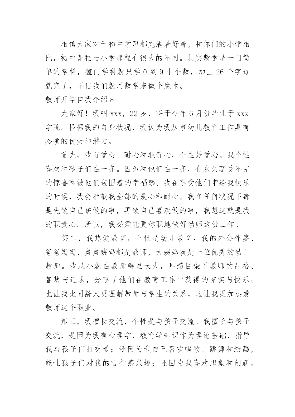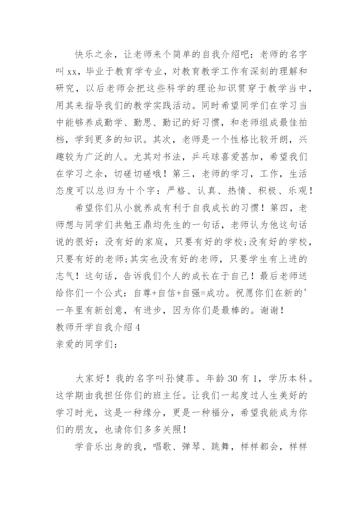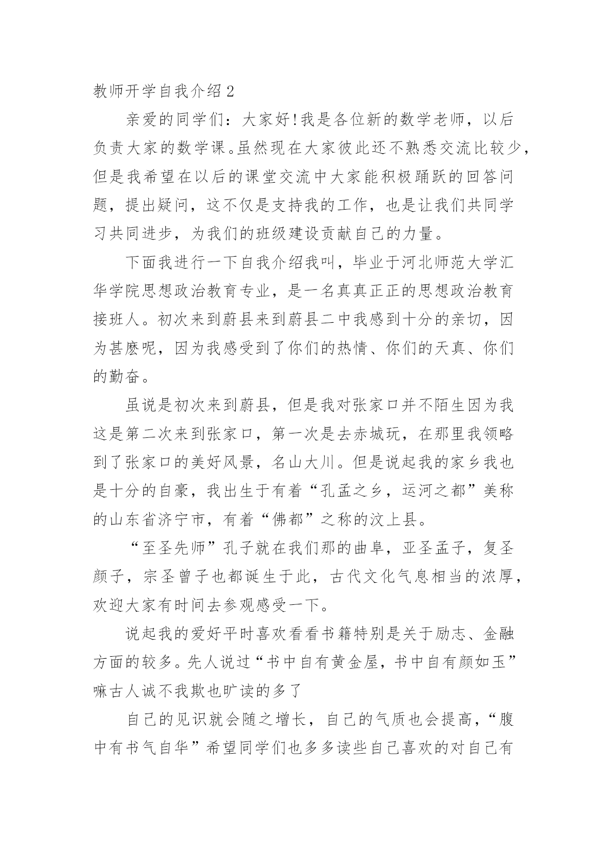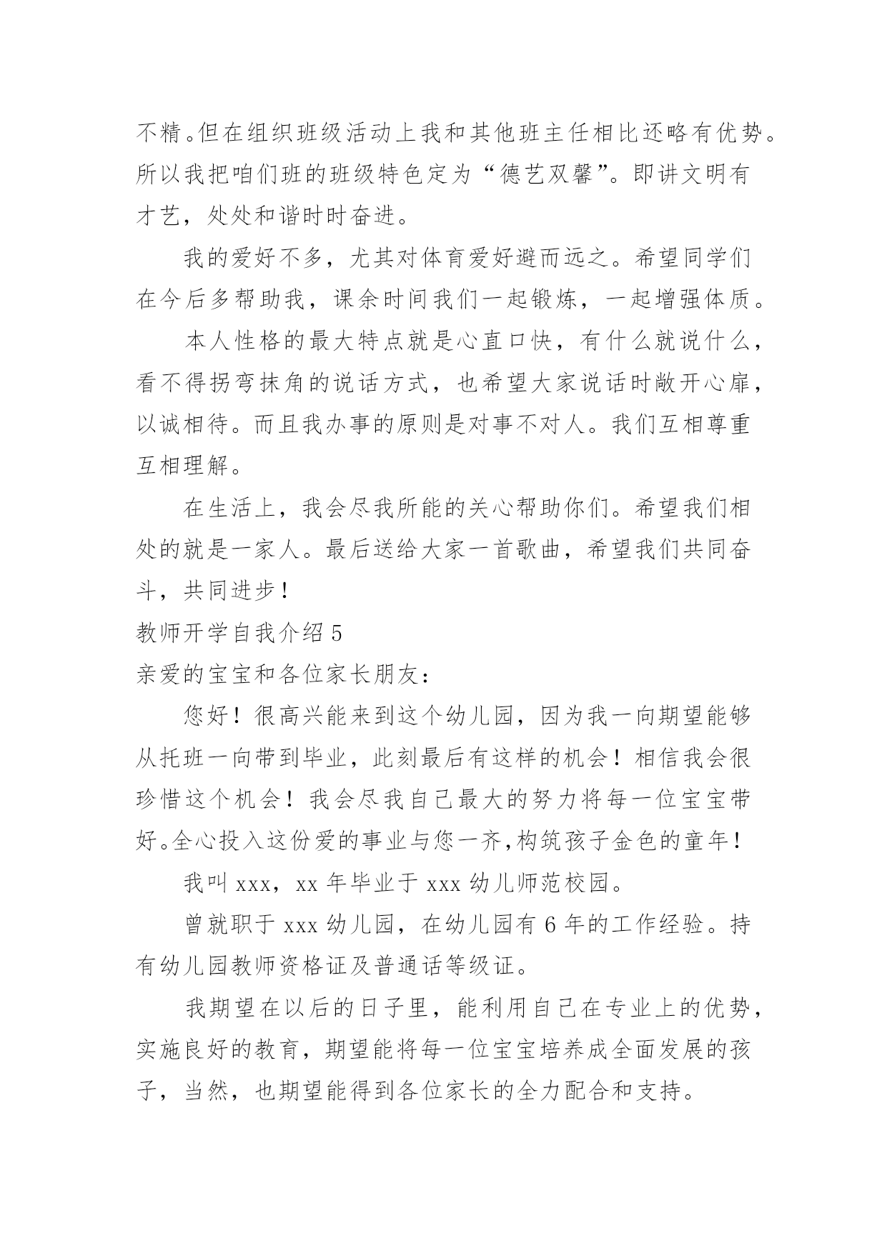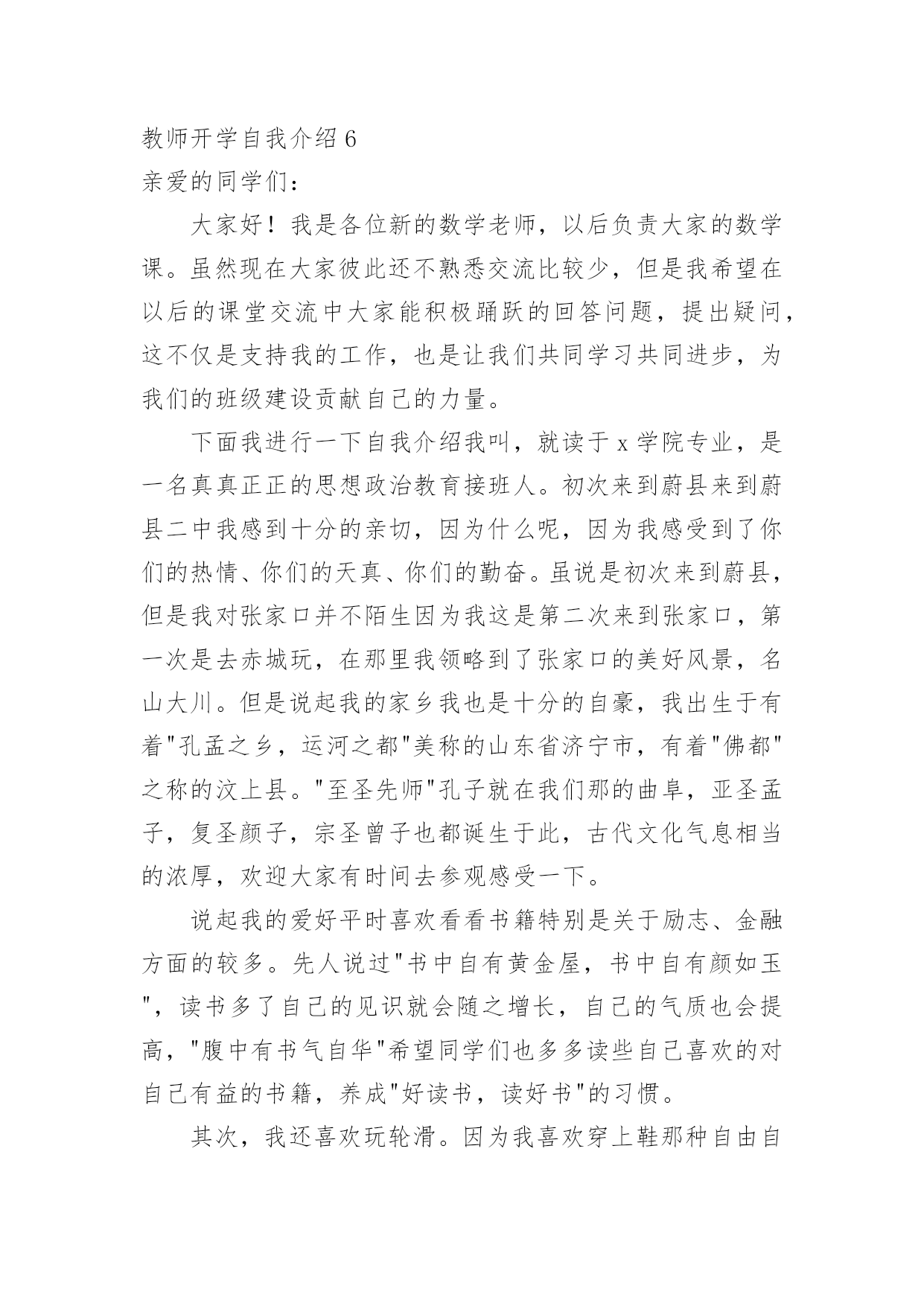 教师开学自我介绍教师开学自我介绍当来到一个陌生的地方时,时常需要用到自我介绍,自我介绍是人与人进行沟通的出发点。怎么写自我介绍才能避免踩雷呢?以下是小编为大家整理的教师开学自我介绍,供大家参考借鉴,希望可以帮助到有需要的朋友。教师开学自我介绍1我是一名有着xx年教龄的体育教师,中学体育教育一级职称,来到xx中学任教之前,一直工作在xx中学,现在就让我做个详细的自我介绍!在十三年的教育教学实践中,通过自己的努力和各学科老师的帮助,逐步形成了自己的教学风格,注重身教,师生相处和谐,有较强的课堂组织调控能力和课程创新能力。积极参加教科研活动,xx年参加了合肥市首批新课程改革试验,并在省教科所体育教研组的带领下,参与了国家级课题《超体重儿童健康行为的实验与研究》的研究,荣获国家二等奖,撰写的论文中,《中学生体育课的教法与激趣》一文发表在《安徽教育论坛》xx年第二期,《认识cai》在xx年合肥市电化教学论文评比中获二等奖,《议中学生体育兴趣的培养》一文荣获xx年度合肥中市区教育学会举办的教育教学论文评比二等奖。在学科竞赛中,xx年获合肥市首届体育教师(初中组)基本功比赛一等奖,同年参加安徽省第二届中小学体育教师教学基本功比赛,获初中组个人总分二等奖,自我介绍《中学体育教师自我介绍范文》。20xx-xx年获合肥市学校体育工作先进个人,xx年被xx区任命为首批骨干教师并保持至今,xx年获合肥市电化教育(现代教育技术)工作先进个人。四十三中学工作期间,除了从事体育教育工作之外,还担任其他一些工作,也获得了一些成绩。自95年开始,一直担任学校团委书记一职,亲手创立的中学生团校在xx年获得安徽省优秀中学生团校示范团校(当年合肥唯一),同年获得安徽省中学共青团工作先进个人称号;是合肥市第十二次团代会代表,也是安徽省第十一次团代会代表。担任学校科技活动小组组长其间,在小组全体师生共同努力下,xx年获首届全国青少年电脑机器人竞赛优秀辅导员称号,并获得中学组创意赛二等奖辅导员奖;xx年获安徽省青少年电脑机器人比赛第一名(领队兼教练);xx年8月,辅导学生参加合肥市第四届中小学电脑制作初中组机器人竞赛,荣获合肥市初中组一等奖。过去的成绩已经随着原来学校的消失而灰飞烟灭,我将以一名新教师的状态开始我在xx中学的工作。在xx中学富有特色教育教学管理模式的熏陶下,在这温馨和谐的大家庭里,我一定充分发挥自己的优点,积极投身庐中教育,成为一名优秀的教师。教师开学自我介绍2亲爱的同学们:大家好!我是各位新的数学老师,以后负责大家的数学课。虽然现在大家彼此还不熟悉交流比较少,但是我希望在以后的课堂交流中大家能积极踊跃的回答问题,提出疑问,这不仅是支持我的工作,也是让我们共同学习共同进步,为我们的班级建设贡献自己的力量。下面我进行一下自我介绍我叫,毕业于河北师范大学汇华学院思想政治教育专业,是一名真真正正的思想政治教育接班人。初次来到蔚县来到蔚县二中我感到十分的亲切,因为甚麽呢,因为我感受到了你们的热情、你们的天真、你们的勤奋。虽说是初次来到蔚县,但是我对张家口并不陌生因为我这是第二次来到张家口,第一次是去赤城玩,在那里我领略到了张家口的美好风景,名山大川。但是说起我的家乡我也是十分的自豪,我出生于有着“孔孟之乡,运河之都”美称的山东省济宁市,有着“佛都”之称的汶上县。“至圣先师”孔子就在我们那的曲阜,亚圣孟子,复圣颜子,宗圣曾子也都诞生于此,古代文化气息相当的浓厚,欢迎大家有时间去参观感受一下。说起我的爱好平时喜欢看看书籍特别是关于励志、金融方面的较多。先人说过“书中自有黄金屋,书中自有颜如玉”嘛古人诚不我欺也旷读的多了自己的见识就会随之增长,自己的气质也会提高,“腹中有书气自华”希望同学们也多多读些自己喜欢的对自己有益的书籍,养成“好读书,读好书”的习惯。其次,我还喜欢玩轮滑。因为我喜欢穿上鞋那种自由自在的感觉,特别是那种经过自己的努力飞速滑跑的飞翔,还有就是练成一个花样动作的成就感,那种成就感是非常美妙的,不不仅练习了自己的轮滑动作自己身体的柔韧性,最主要的是它能给你带来精神上的成就感,让自己的自信心不断增强。也希望同学们能找到自己的爱好不断发挥,提高自己各方面的能力,增强自己的综合素质,当然了,虽然我学的还不是很全面,但是如果有人想学习轮滑需要我的帮助我还是会十分乐意的。作为一名新的老师,经验不足是必然的,但是我们拥有初入职场的热情和激情,拥有充实自己的决心我会严格要求自己时刻铭记自己的责任为同学们服好务,做好事,也希望同学们积极配合,共创佳绩,让我们的未来会更好。谢谢大家。教师开学自我介绍3同学们好!很荣幸,我今天能站在这里!也很荣幸,从今以后,能和大家在一起学习。现在,同学们能够猜猜老师的心情如何呢?(学生回答)刚才同学们说得都很好,老师现在的心情除了激动