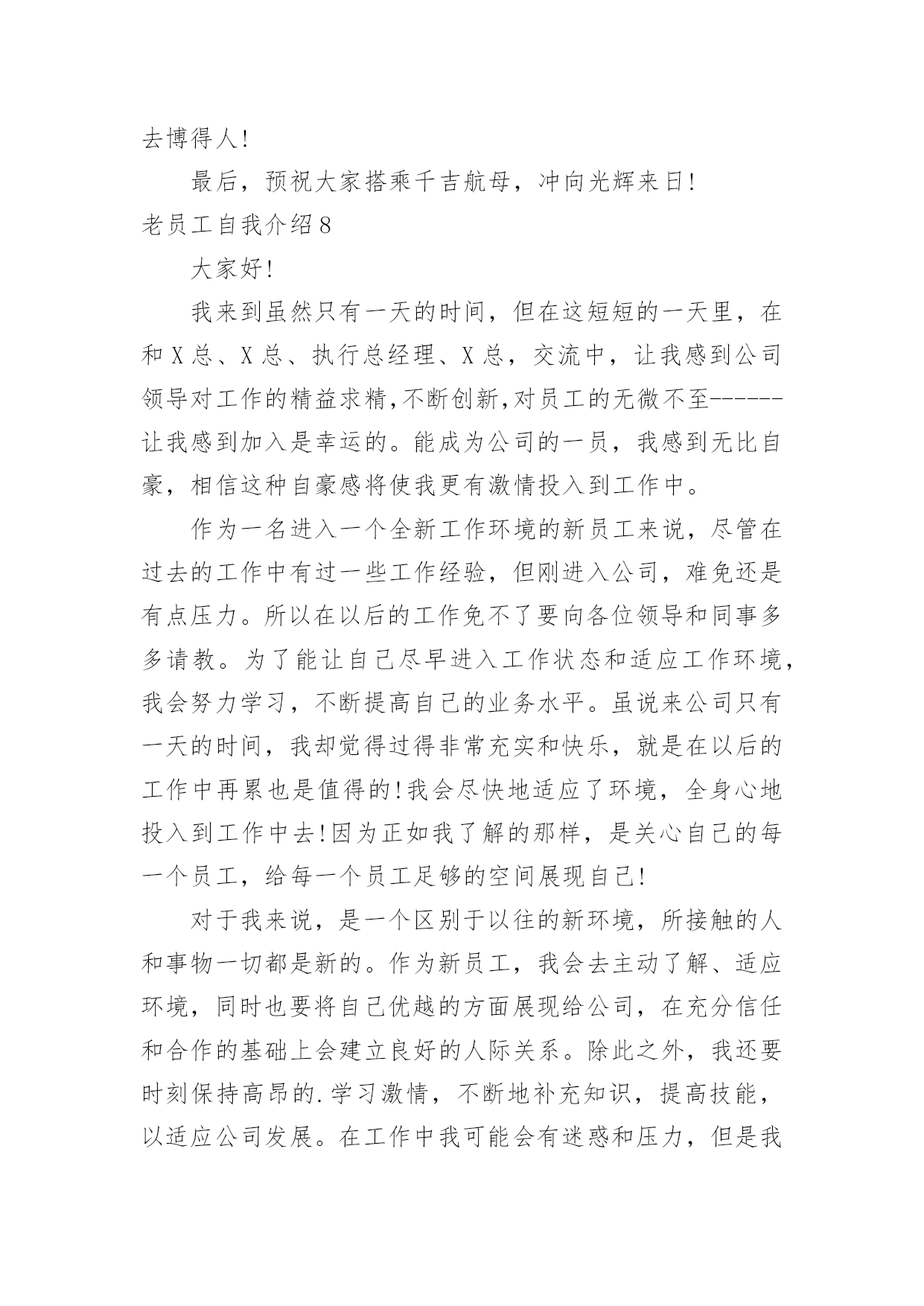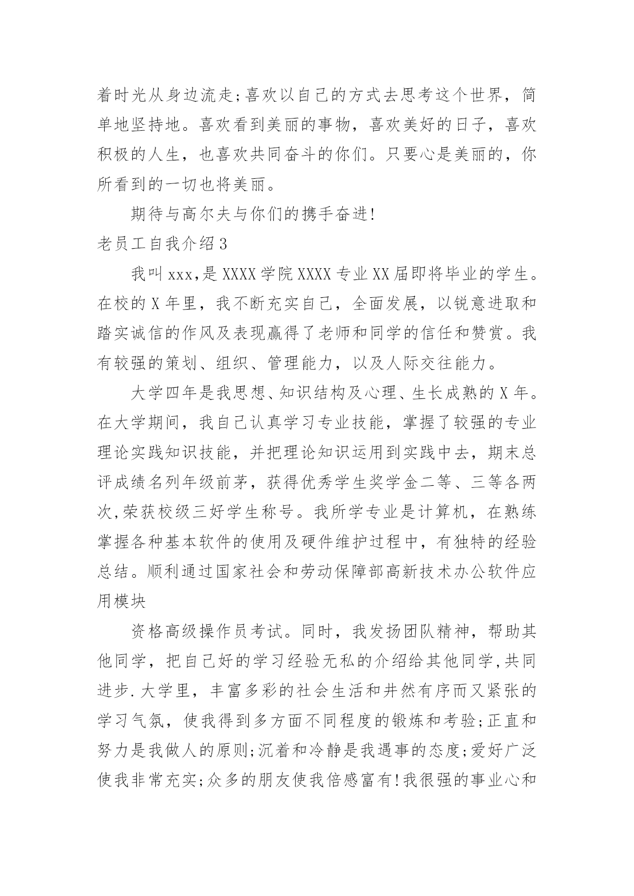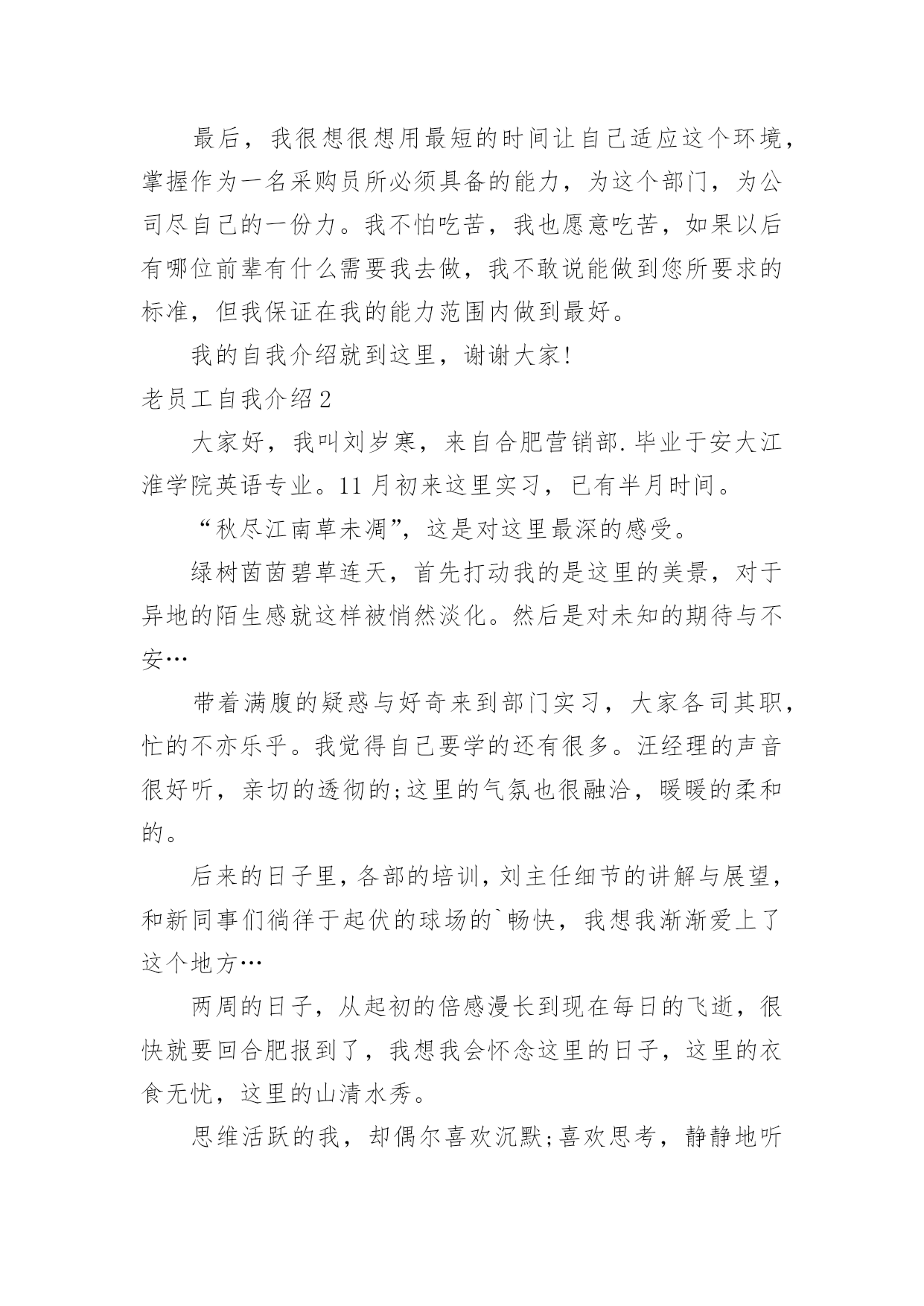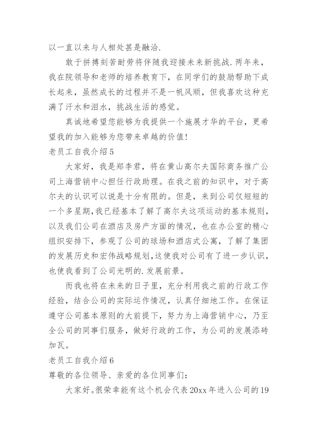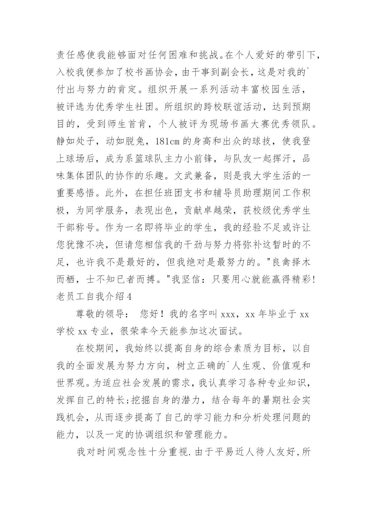 老员工自我介绍老员工自我介绍当去到一个新环境下,我们通常会被要求作自我介绍,通过自我介绍可以得到他人的认识。那么自我介绍有什么格式呢?下面是小编精心整理的老员工自我介绍,欢迎大家借鉴与参考,希望对大家有所帮助。老员工自我介绍1尊敬的各位领导,各位前辈:大家好!我叫,家在甘肃天水,今年刚刚从陕西师范大学法学专业毕业。我性格开朗,容易与人相处;做事认真并善于总结,乐于与他人交流。能够应聘到国虹工作我倍感荣幸,而能来到采购部工作,我不知道用哪些更恰当的词语来表达自己的欣喜之情。首先,请允许我借这次机会表达对各位领导的谢意,谢谢你们能给我这个什么都不懂的毛头小子一次如此之好的学习与锻炼的机会。其次,我刚刚离开大学,对公司的规定、公司所要求的人际关系、公司所要求的能力等等的掌握程度几乎为零,所以在以后的`工作中,还请各位领导和前辈能够多多指教,多多包涵!最后,我很想很想用最短的时间让自己适应这个环境,掌握作为一名采购员所必须具备的能力,为这个部门,为公司尽自己的一份力。我不怕吃苦,我也愿意吃苦,如果以后有哪位前辈有什么需要我去做,我不敢说能做到您所要求的标准,但我保证在我的能力范围内做到最好。我的自我介绍就到这里,谢谢大家!老员工自我介绍2大家好,我叫刘岁寒,来自合肥营销部.毕业于安大江淮学院英语专业。11月初来这里实习,已有半月时间。“秋尽江南草未凋”,这是对这里最深的感受。绿树茵茵碧草连天,首先打动我的是这里的美景,对于异地的陌生感就这样被悄然淡化。然后是对未知的期待与不安…带着满腹的疑惑与好奇来到部门实习,大家各司其职,忙的不亦乐乎。我觉得自己要学的还有很多。汪经理的声音很好听,亲切的透彻的;这里的气氛也很融洽,暖暖的柔和的。后来的日子里,各部的培训,刘主任细节的讲解与展望,和新同事们徜徉于起伏的球场的`畅快,我想我渐渐爱上了这个地方…两周的日子,从起初的倍感漫长到现在每日的飞逝,很快就要回合肥报到了,我想我会怀念这里的日子,这里的衣食无忧,这里的山清水秀。思维活跃的我,却偶尔喜欢沉默;喜欢思考,静静地听着时光从身边流走;喜欢以自己的方式去思考这个世界,简单地坚持地。喜欢看到美丽的事物,喜欢美好的日子,喜欢积极的人生,也喜欢共同奋斗的你们。只要心是美丽的,你所看到的一切也将美丽。期待与高尔夫与你们的携手奋进!老员工自我介绍3我叫xxx,是XXXX学院XXXX专业XX届即将毕业的学生。在校的X年里,我不断充实自己,全面发展,以锐意进取和踏实诚信的作风及表现赢得了老师和同学的信任和赞赏。我有较强的策划、组织、管理能力,以及人际交往能力。大学四年是我思想、知识结构及心理、生长成熟的X年。在大学期间,我自己认真学习专业技能,掌握了较强的专业理论实践知识技能,并把理论知识运用到实践中去,期末总评成绩名列年级前茅,获得优秀学生奖学金二等、三等各两次,荣获校级三好学生称号。我所学专业是计算机,在熟练掌握各种基本软件的使用及硬件维护过程中,有独特的经验总结。顺利通过国家社会和劳动保障部高新技术办公软件应用模块资格高级操作员考试。同时,我发扬团队精神,帮助其他同学,把自己好的学习经验无私的介绍给其他同学,共同进步.大学里,丰富多彩的社会生活和井然有序而又紧张的学习气氛,使我得到多方面不同程度的锻炼和考验;正直和努力是我做人的原则;沉着和冷静是我遇事的态度;爱好广泛使我非常充实;众多的朋友使我倍感富有!我很强的事业心和责任感使我能够面对任何困难和挑战。在个人爱好的带引下,入校我便参加了校书画协会,由干事到副会长,这是对我的`付出与努力的肯定。组织开展一系列活动丰富校园生活,被评选为优秀学生社团。所组织的跨校联谊活动,达到预期目的,受到师生首肯,个人被评为现场书画大赛优秀领队。静如处子,动如脱兔,181cm的身高和出众的球技,使我登上球场后,成为系篮球队主力小前锋,与队友一起挥汗,品味集体团队的协作的乐趣。文武兼备,则是我大学生活的一重要感悟。此外,在担任班团支书和辅导员助理期间工作积极,为同学服务,表现出色,贡献卓越荣,获校级优秀学生干部称号。作为一名即将毕业的学生,我的经验不足或许让您犹豫不决,但请您相信我的干劲与努力将弥补这暂时的不足,也许我不是最好的,但我绝对是最努力的。"良禽择木而栖,士不知已者而搏。"我坚信:只要用心就能赢得精彩!老员工自我介绍4尊敬的领导:您好!我的名字叫xxx,xx年毕业于xx学校xx专业,很荣幸今天能参加这次面试。在校期间,我始终以提高自身的综合素质为目标,以自我的全面发展为努力方向,树立正确的`人生观、价值观和世界观。为适应社会发展的需求,我认真学习各种专业知识,发挥自己的特长;挖掘自身的潜力,结合每年的暑期社会实践机会,从而逐步提高了自己的学习能力和分析处理问题的能力,以及一定的协调组织和管理能力。我对时间观念