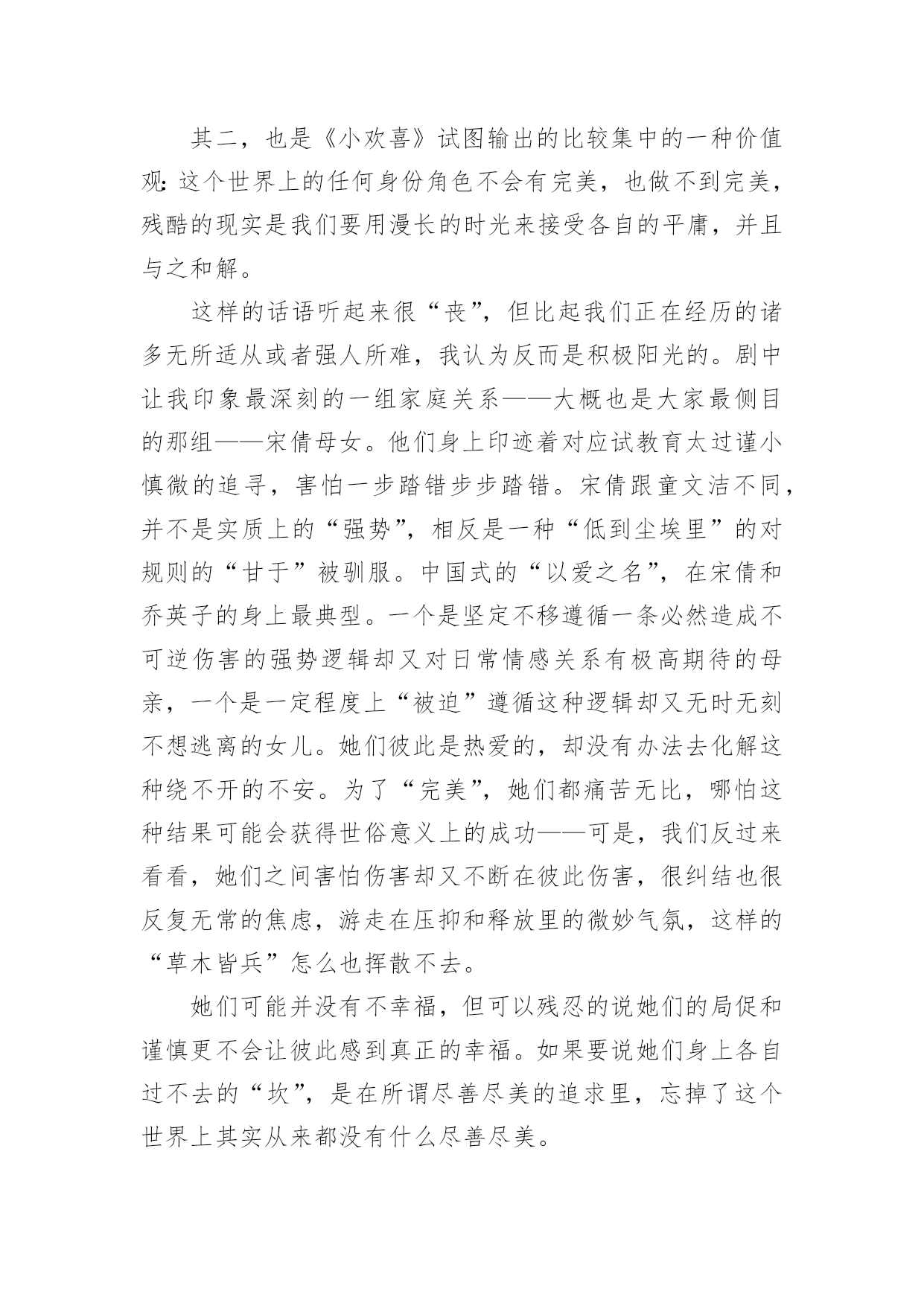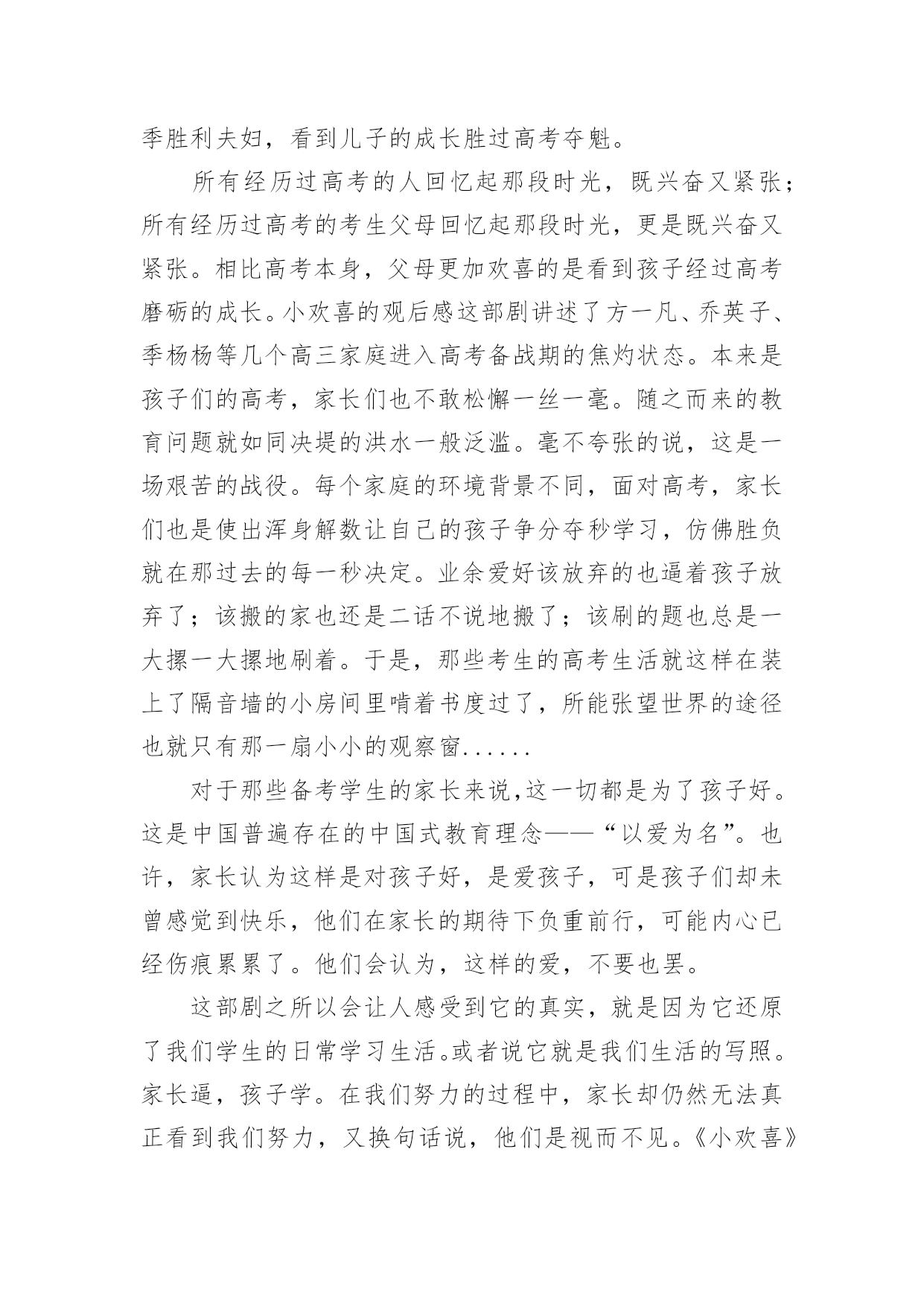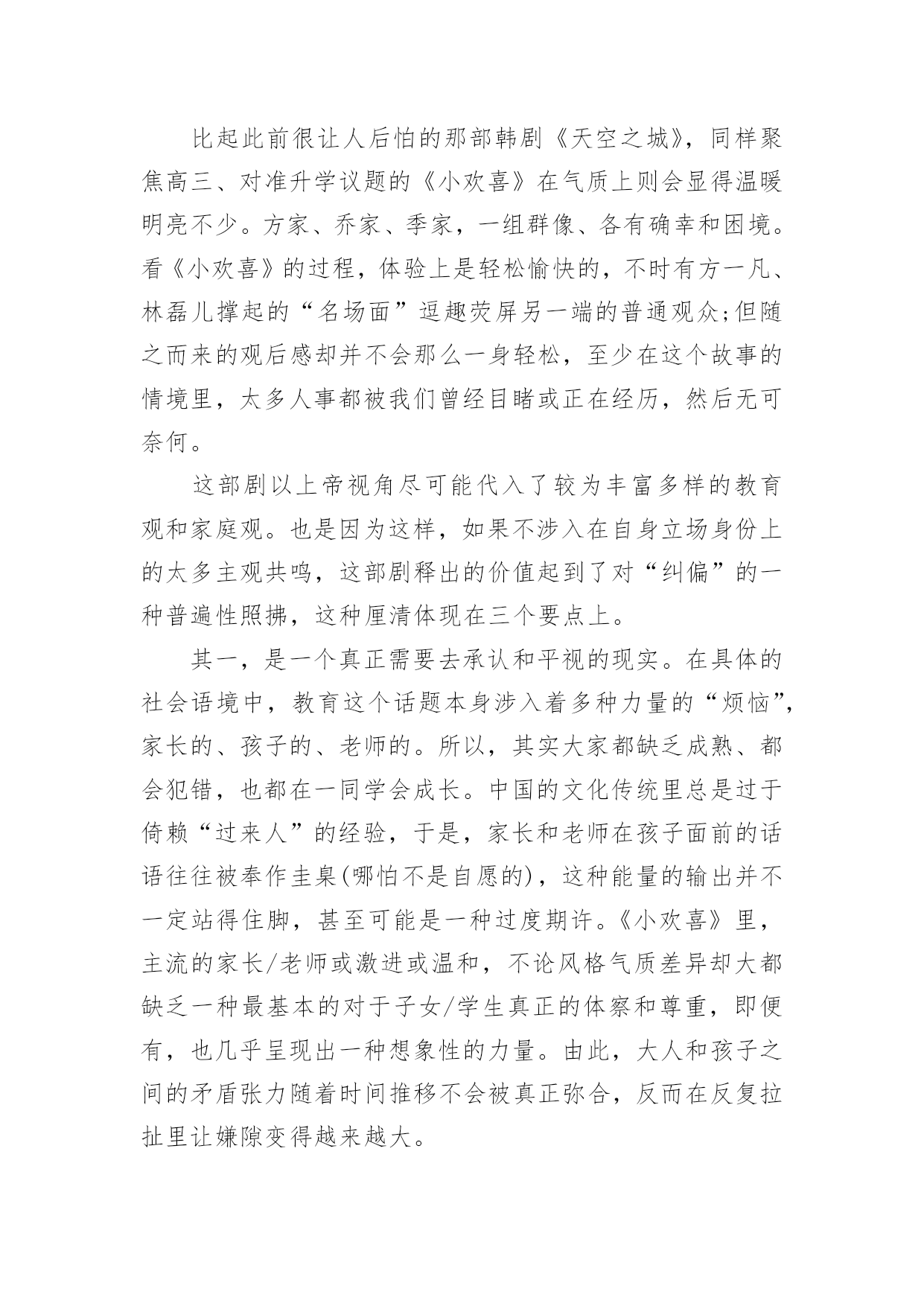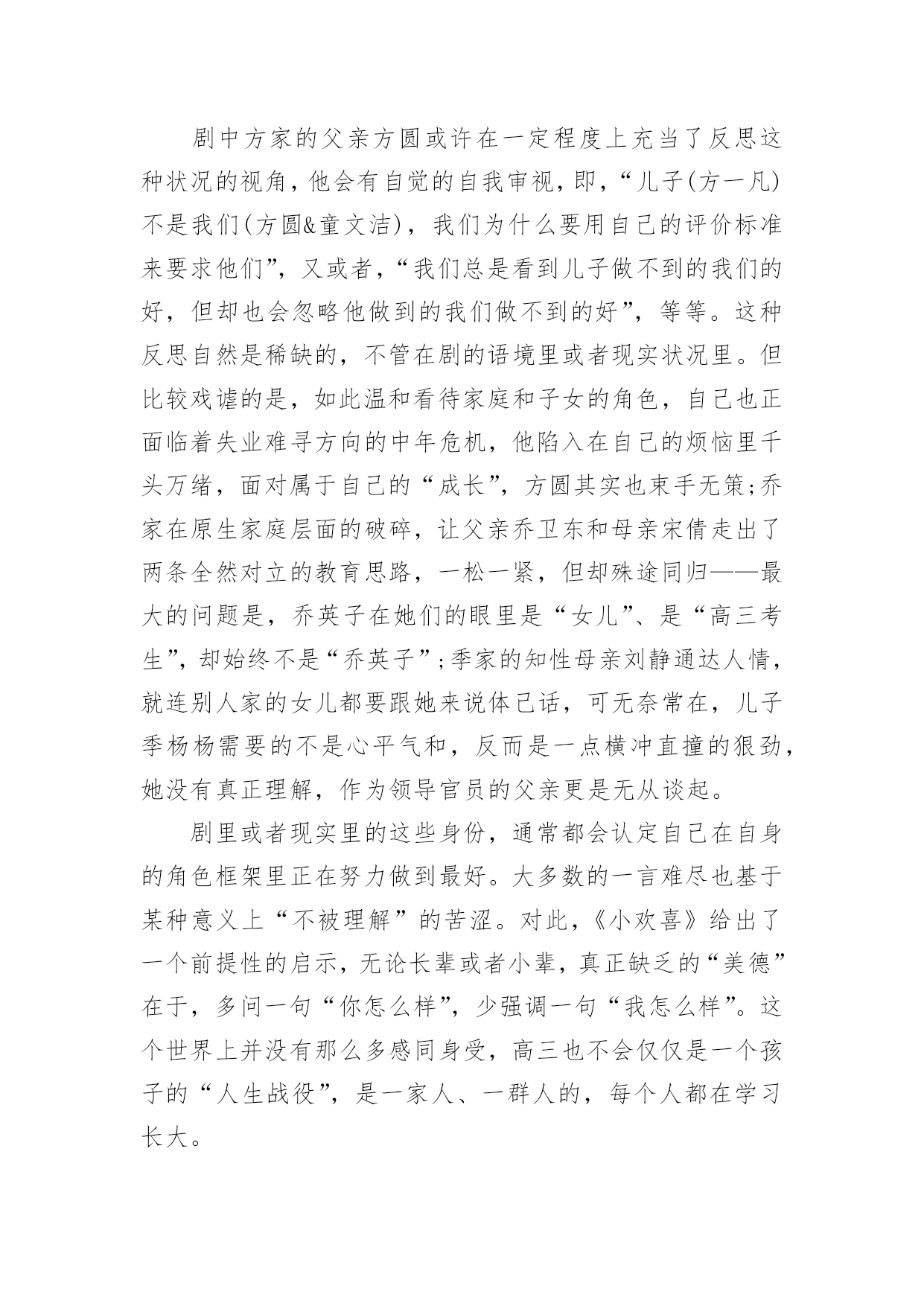 小欢喜的观后感看完一部影视作品以后,这次观看让你有什么领悟呢?需要回过头来写一写观后感了。那么你真的会写观后感吗?以下是小编精心整理的小欢喜的观后感,仅供参考,欢迎大家阅读。小欢喜的观后感1一部《小欢喜》,天下父母心。欢快的风格叙写紧张的高三生活,三组拥有不同的烦恼的家庭却有着共同的目标,就是孩子高考成功。默默付出不讲回报的职业就是父母,这种职业的高级版就是“高三”的父母。无论你是考生还是家长,《小欢喜》总有你的存在。方家、乔家、季家,这三家几乎可以代表绝大多数高考考生的家庭现状,无论是哪一家,家家都有一本难念的经。三个家庭,四个即将面对高考的孩子,有学渣也有学霸,有问题少年也有乖乖男,每个人的境遇都不尽相同,而紧张与压力却伴随着每一个人。方家的孩子是幸福的,家庭完整,父母恩爱,唯一的苦恼就是方一凡的成绩。中途转学而来的学霸林磊儿就说明了问题,如果方一凡的成绩像林磊儿一样,方家自然就会安静许多。方一凡的成绩还没见起色,方圆、童文洁双双离职,方家二老被骗背债,烦心事一件接着一件。尽管如此,方圆、童文洁并没有放松对方一凡的“看管”,只要方一凡能够金榜题名,他们肯定是竭尽全力。当孩子们知道父母离职的时候,开始偷偷的做家教来分摊家庭的负担。看着林磊儿和方一凡一本正经的穿着极不合身的西装,既幽默又心酸,但不可否认孩子们已经长大成人……乔家的情况看似简单,其实暗潮涌动,离异的宋倩、懂事的乔英子,组成一个貌似正常的单亲家庭。曾经是教师身份的宋倩无论在前夫还是女儿面前,都保持着百分百的强势,她对女儿的要求几近苛刻,衣食住行直至每次考试的分数,都有明确的要求。宋倩对女儿的爱是自私的、唯一的、孤独的。乔英子是一个极其懂事而又聪明的孩子,她深知妈妈不易而积极迎合妈妈的欢心,但她并不开心,直至抑郁。吃火锅、玩乐高、天文讲解员,乔卫东是一个懂女儿的好爸爸。高考迫在眉睫,乔卫东、宋倩深刻的剖析自我,积极改变自己,给乔英子一个久违的家。进入考场前,乔卫东和宋倩在英子面前“亮证”,皆大欢喜!季家的情况较为特别,季杨杨是一个留守的叛逆少年,因与父母长期异地分离而特别的独立、自我。季胜利和刘静的回归,并没有得到季杨杨的欢迎,突如其来的约束甚至令季杨杨反感。经过几场势均力敌的“交锋”,季胜利和刘静并没有改变季杨杨的态度和想法。季家的父母是三家中最理性的,季胜利和刘静冷静的分析了各种原因,最终选择从儿子最喜爱的赛车入手,经过短暂的磨合,季家成了最和谐的一家。让人泪目的是,季杨杨得知妈妈刘静的病情后,默默的剃了光头以示对对妈妈的支持。原本为了陪伴儿子高考的季胜利夫妇,看到儿子的成长胜过高考夺魁。所有经历过高考的人回忆起那段时光,既兴奋又紧张;所有经历过高考的考生父母回忆起那段时光,更是既兴奋又紧张。相比高考本身,父母更加欢喜的是看到孩子经过高考磨砺的成长。小欢喜的观后感这部剧讲述了方一凡、乔英子、季杨杨等几个高三家庭进入高考备战期的焦灼状态。本来是孩子们的高考,家长们也不敢松懈一丝一毫。随之而来的教育问题就如同决堤的洪水一般泛滥。毫不夸张的说,这是一场艰苦的战役。每个家庭的环境背景不同,面对高考,家长们也是使出浑身解数让自己的孩子争分夺秒学习,仿佛胜负就在那过去的每一秒决定。业余爱好该放弃的也逼着孩子放弃了;该搬的家也还是二话不说地搬了;该刷的题也总是一大摞一大摞地刷着。于是,那些考生的高考生活就这样在装上了隔音墙的小房间里啃着书度过了,所能张望世界的途径也就只有那一扇小小的观察窗......对于那些备考学生的家长来说,这一切都是为了孩子好。这是中国普遍存在的中国式教育理念——“以爱为名”。也许,家长认为这样是对孩子好,是爱孩子,可是孩子们却未曾感觉到快乐,他们在家长的期待下负重前行,可能内心已经伤痕累累了。他们会认为,这样的爱,不要也罢。这部剧之所以会让人感受到它的真实,就是因为它还原了我们学生的日常学习生活。或者说它就是我们生活的写照。家长逼,孩子学。在我们努力的过程中,家长却仍然无法真正看到我们努力,又换句话说,他们是视而不见。《小欢喜》这部剧中曾出现多少家长与家长之间“比孩子”的剧情,或说你家的孩子学习好,或说他家的孩子性格好。日常生活中的家长又何尝不是这样呢?在一群家长中,他们普遍认为;为什么别人家的孩子总是比自家孩子优秀呢?却不曾看见自己孩子身上的优点,似乎是他们总能把缺点放大好多倍,所以屏蔽掉了他们寻找优点的能力。也许,对于他们来说这样比一比可以激励孩子改进,但是他们却不知道这样对孩子来说是扼杀他们“做好自己”的天性。我特别喜欢剧中方一凡说过的一句话:“各个家庭状况不一样,这根本就没有可比性。”这句话是真的特别耐人寻味。其实他说的一点也没错,每个家庭有每个家庭的教育方式以及生活方式,而在不一样的环境中生活的人所养成的一些习惯、性格以及特点当然都不一样