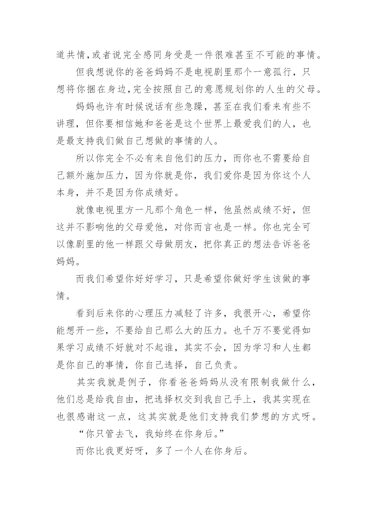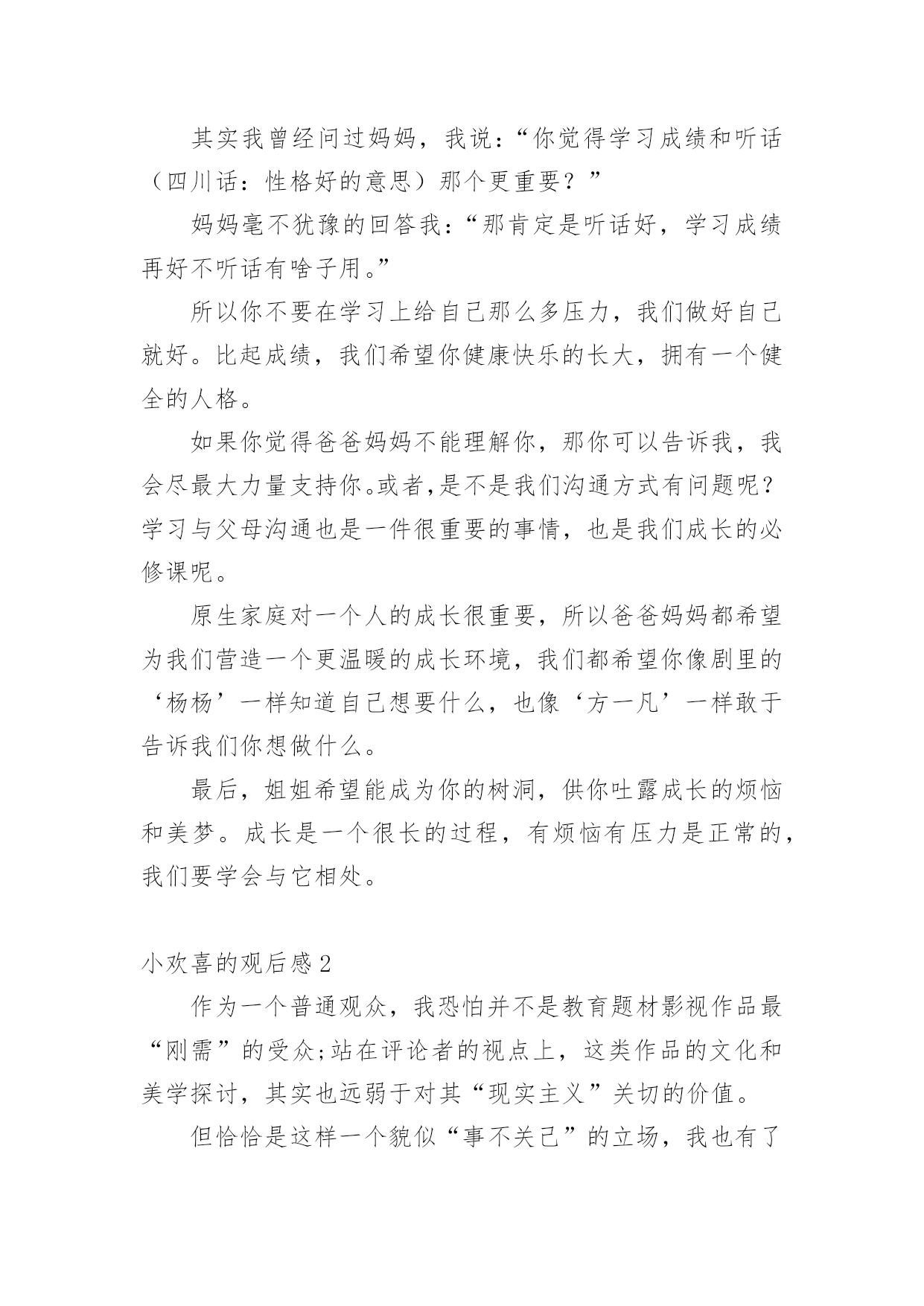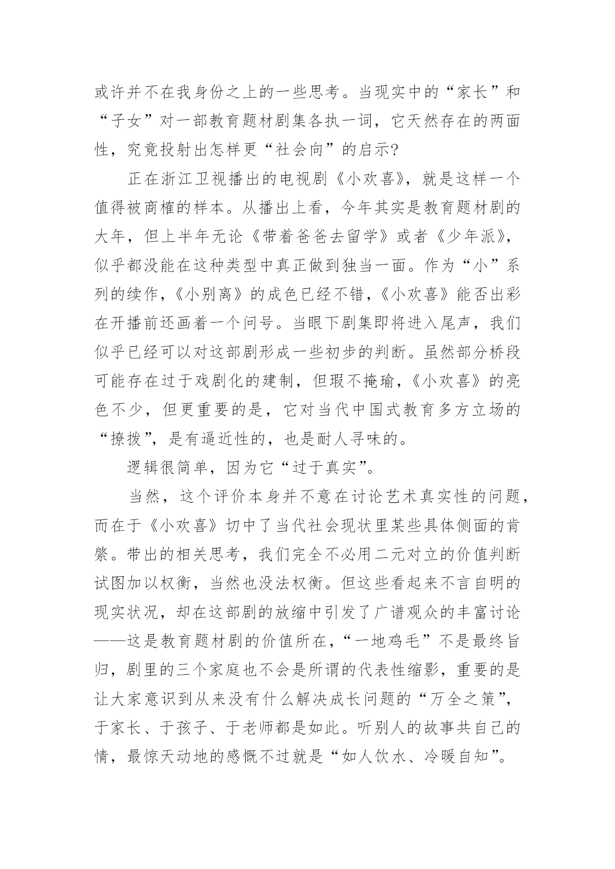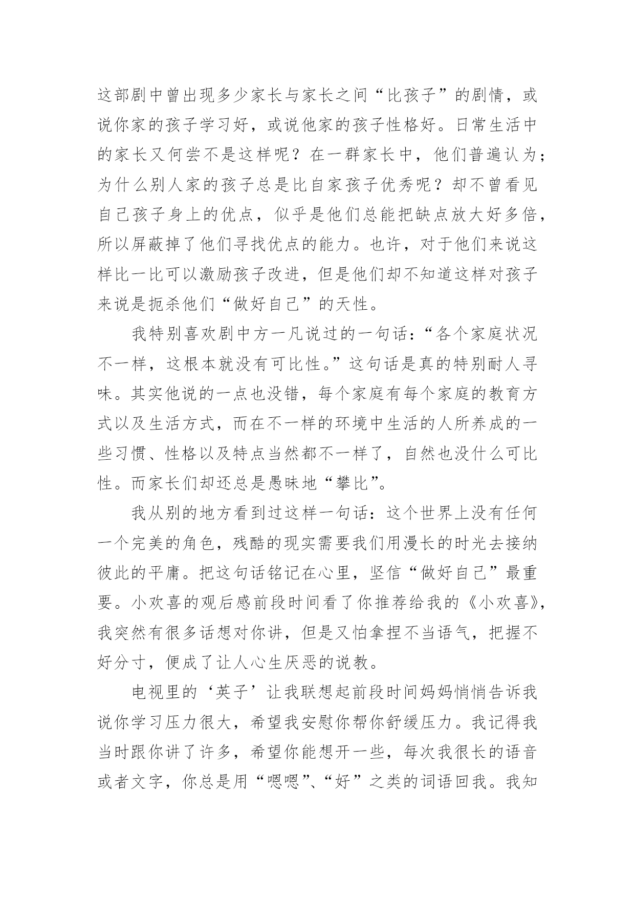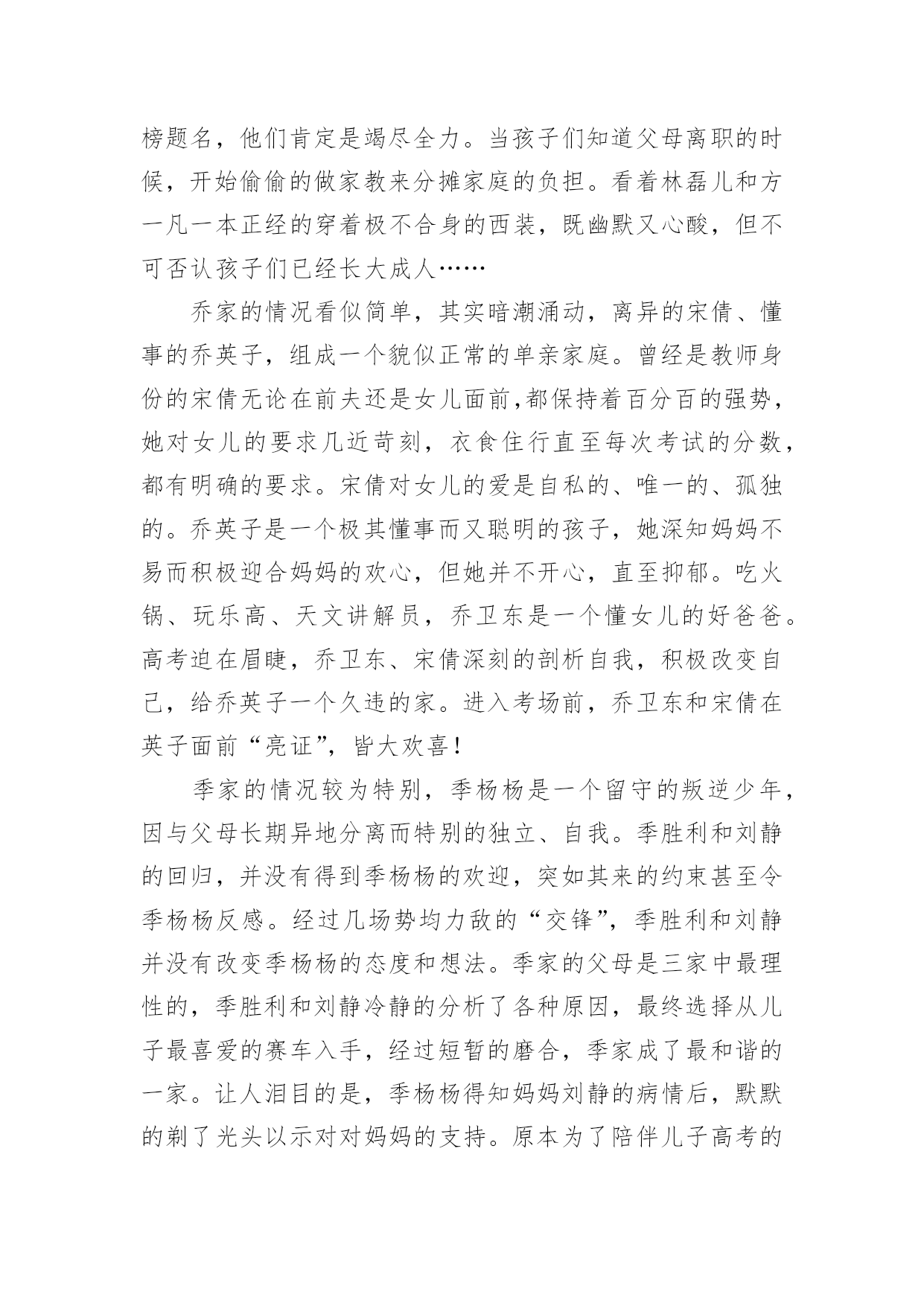 小欢喜的观后感看完一部影视作品以后,这次观看让你有什么领悟呢?需要回过头来写一写观后感了。那么你真的会写观后感吗?以下是小编精心整理的小欢喜的观后感,仅供参考,欢迎大家阅读。小欢喜的观后感1一部《小欢喜》,天下父母心。欢快的风格叙写紧张的高三生活,三组拥有不同的烦恼的家庭却有着共同的目标,就是孩子高考成功。默默付出不讲回报的职业就是父母,这种职业的高级版就是“高三”的父母。无论你是考生还是家长,《小欢喜》总有你的存在。方家、乔家、季家,这三家几乎可以代表绝大多数高考考生的家庭现状,无论是哪一家,家家都有一本难念的经。三个家庭,四个即将面对高考的孩子,有学渣也有学霸,有问题少年也有乖乖男,每个人的境遇都不尽相同,而紧张与压力却伴随着每一个人。方家的孩子是幸福的,家庭完整,父母恩爱,唯一的苦恼就是方一凡的成绩。中途转学而来的学霸林磊儿就说明了问题,如果方一凡的成绩像林磊儿一样,方家自然就会安静许多。方一凡的成绩还没见起色,方圆、童文洁双双离职,方家二老被骗背债,烦心事一件接着一件。尽管如此,方圆、童文洁并没有放松对方一凡的“看管”,只要方一凡能够金榜题名,他们肯定是竭尽全力。当孩子们知道父母离职的时候,开始偷偷的做家教来分摊家庭的负担。看着林磊儿和方一凡一本正经的穿着极不合身的西装,既幽默又心酸,但不可否认孩子们已经长大成人……乔家的情况看似简单,其实暗潮涌动,离异的宋倩、懂事的乔英子,组成一个貌似正常的单亲家庭。曾经是教师身份的宋倩无论在前夫还是女儿面前,都保持着百分百的强势,她对女儿的要求几近苛刻,衣食住行直至每次考试的分数,都有明确的要求。宋倩对女儿的爱是自私的、唯一的、孤独的。乔英子是一个极其懂事而又聪明的孩子,她深知妈妈不易而积极迎合妈妈的欢心,但她并不开心,直至抑郁。吃火锅、玩乐高、天文讲解员,乔卫东是一个懂女儿的好爸爸。高考迫在眉睫,乔卫东、宋倩深刻的剖析自我,积极改变自己,给乔英子一个久违的家。进入考场前,乔卫东和宋倩在英子面前“亮证”,皆大欢喜!季家的情况较为特别,季杨杨是一个留守的叛逆少年,因与父母长期异地分离而特别的独立、自我。季胜利和刘静的回归,并没有得到季杨杨的欢迎,突如其来的约束甚至令季杨杨反感。经过几场势均力敌的“交锋”,季胜利和刘静并没有改变季杨杨的态度和想法。季家的父母是三家中最理性的,季胜利和刘静冷静的分析了各种原因,最终选择从儿子最喜爱的赛车入手,经过短暂的磨合,季家成了最和谐的一家。让人泪目的是,季杨杨得知妈妈刘静的病情后,默默的剃了光头以示对对妈妈的支持。原本为了陪伴儿子高考的季胜利夫妇,看到儿子的成长胜过高考夺魁。所有经历过高考的人回忆起那段时光,既兴奋又紧张;所有经历过高考的考生父母回忆起那段时光,更是既兴奋又紧张。相比高考本身,父母更加欢喜的是看到孩子经过高考磨砺的成长。小欢喜的观后感这部剧讲述了方一凡、乔英子、季杨杨等几个高三家庭进入高考备战期的焦灼状态。本来是孩子们的高考,家长们也不敢松懈一丝一毫。随之而来的教育问题就如同决堤的洪水一般泛滥。毫不夸张的说,这是一场艰苦的战役。每个家庭的环境背景不同,面对高考,家长们也是使出浑身解数让自己的孩子争分夺秒学习,仿佛胜负就在那过去的每一秒决定。业余爱好该放弃的也逼着孩子放弃了;该搬的家也还是二话不说地搬了;该刷的题也总是一大摞一大摞地刷着。于是,那些考生的高考生活就这样在装上了隔音墙的小房间里啃着书度过了,所能张望世界的途径也就只有那一扇小小的观察窗......对于那些备考学生的家长来说,这一切都是为了孩子好。这是中国普遍存在的中国式教育理念——“以爱为名”。也许,家长认为这样是对孩子好,是爱孩子,可是孩子们却未曾感觉到快乐,他们在家长的期待下负重前行,可能内心已经伤痕累累了。他们会认为,这样的爱,不要也罢。这部剧之所以会让人感受到它的真实,就是因为它还原了我们学生的日常学习生活。或者说它就是我们生活的写照。家长逼,孩子学。在我们努力的过程中,家长却仍然无法真正看到我们努力,又换句话说,他们是视而不见。《小欢喜》这部剧中曾出现多少家长与家长之间“比孩子”的剧情,或说你家的孩子学习好,或说他家的孩子性格好。日常生活中的家长又何尝不是这样呢?在一群家长中,他们普遍认为;为什么别人家的孩子总是比自家孩子优秀呢?却不曾看见自己孩子身上的优点,似乎是他们总能把缺点放大好多倍,所以屏蔽掉了他们寻找优点的能力。也许,对于他们来说这样比一比可以激励孩子改进,但是他们却不知道这样对孩子来说是扼杀他们“做好自己”的天性。我特别喜欢剧中方一凡说过的一句话:“各个家庭状况不一样,这根本就没有可比性。”这句话是真的特别耐人寻味。其实他说的一点也没错,每个家庭有每个家庭的教育方式以及生活方式,而在不一样的环境中生活的人所养成的一些习惯、性格以及特点当然都不一样