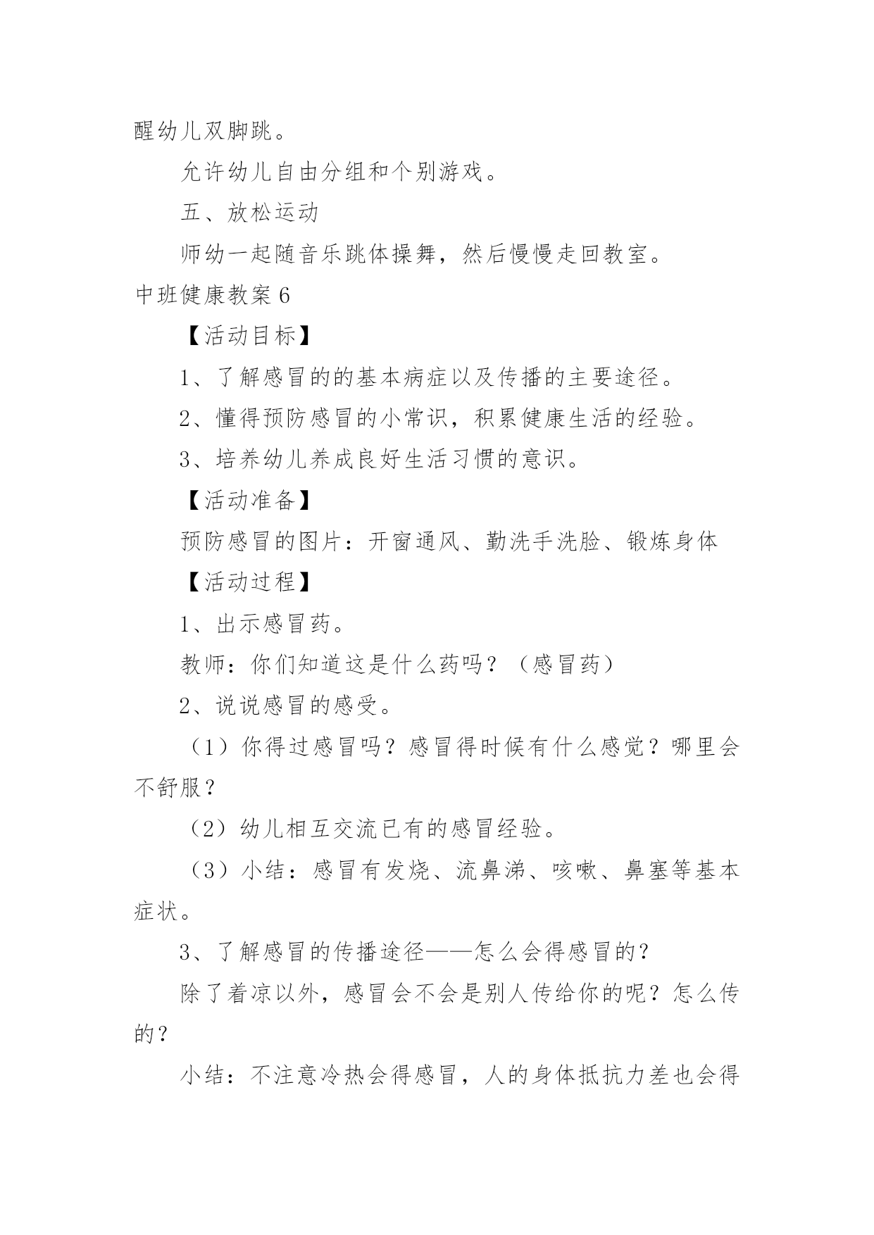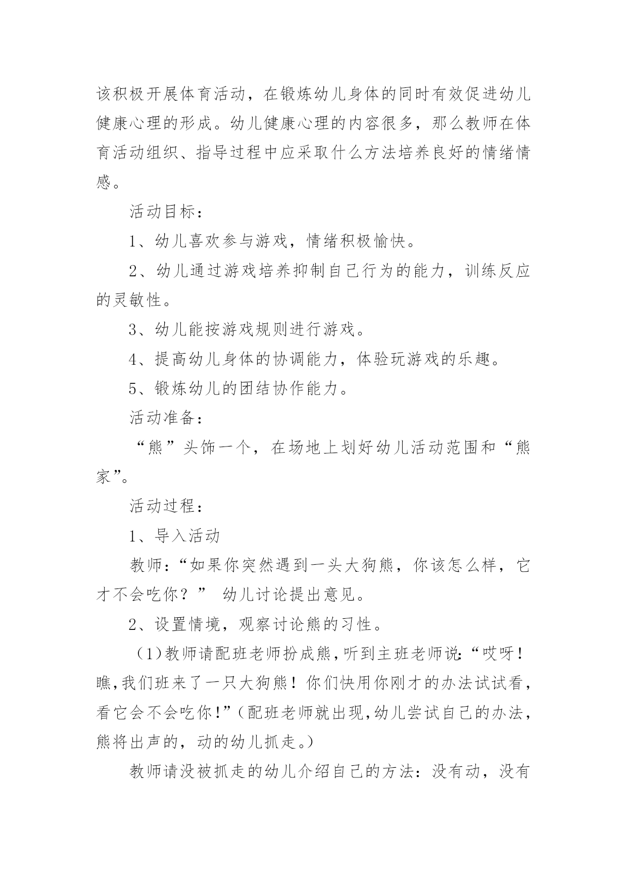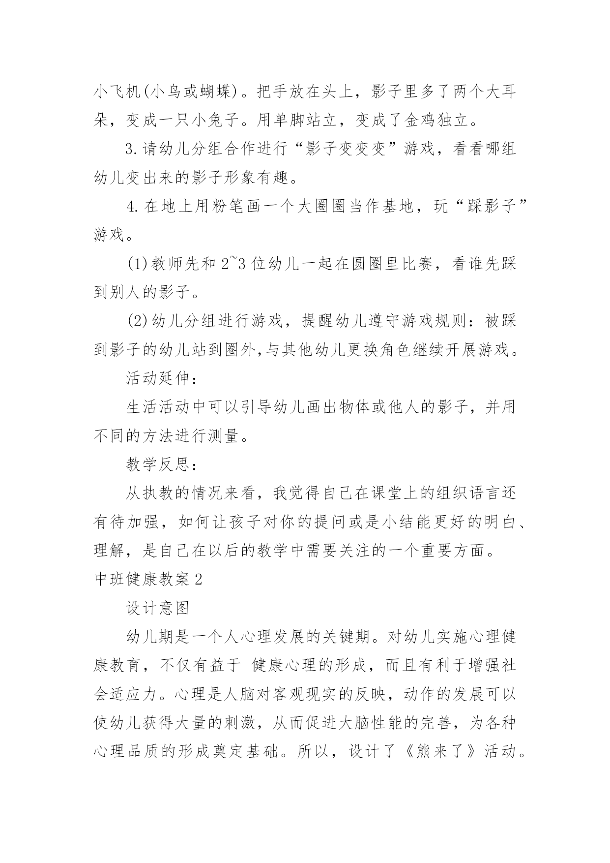 中班健康教案中班健康教案作为一位不辞辛劳的人民教师,时常需要编写教案,借助教案可以提高教学质量,收到预期的教学效果。那么写教案需要注意哪些问题呢?下面是小编整理的中班健康教案,希望能够帮助到大家。中班健康教案1活动目标1.能创造性的与影子做游戏,体验游戏乐趣。2.提高动作的灵活性和敏捷性。3.乐意参与游戏,体验游戏的乐趣。4.喜欢帮助别人,与同伴友好相处。活动准备1.根据天气情况在户外随时让幼儿观察在不同时段影子的变化。2.选择阳光明媚的天气开展活动。活动过程1.带领幼儿到空地上,请幼儿找一找自己的影子,并看看周围的东西是不是都有影子。2.请幼儿变换动作,并观察影子的变化。蹲下来,影子变短了,变成了小矮人。将手平举,影子多了翅膀,变成了小飞机(小鸟或蝴蝶)。把手放在头上,影子里多了两个大耳朵,变成一只小兔子。用单脚站立,变成了金鸡独立。3.请幼儿分组合作进行“影子变变变”游戏,看看哪组幼儿变出来的影子形象有趣。4.在地上用粉笔画一个大圈圈当作基地,玩“踩影子”游戏。(1)教师先和2~3位幼儿一起在圆圈里比赛,看谁先踩到别人的影子。(2)幼儿分组进行游戏,提醒幼儿遵守游戏规则:被踩到影子的幼儿站到圈外,与其他幼儿更换角色继续开展游戏。活动延伸:生活活动中可以引导幼儿画出物体或他人的影子,并用不同的方法进行测量。教学反思:从执教的情况来看,我觉得自己在课堂上的组织语言还有待加强,如何让孩子对你的提问或是小结能更好的明白、理解,是自己在以后的教学中需要关注的一个重要方面。中班健康教案2设计意图幼儿期是一个人心理发展的关键期。对幼儿实施心理健康教育,不仅有益于健康心理的形成,而且有利于增强社会适应力。心理是人脑对客观现实的反映,动作的发展可以使幼儿获得大量的刺激,从而促进大脑性能的完善,为各种心理品质的形成奠定基础。所以,设计了《熊来了》活动。该积极开展体育活动,在锻炼幼儿身体的同时有效促进幼儿健康心理的形成。幼儿健康心理的内容很多,那么教师在体育活动组织、指导过程中应采取什么方法培养良好的情绪情感。活动目标:1、幼儿喜欢参与游戏,情绪积极愉快。2、幼儿通过游戏培养抑制自己行为的能力,训练反应的灵敏性。3、幼儿能按游戏规则进行游戏。4、提高幼儿身体的协调能力,体验玩游戏的乐趣。5、锻炼幼儿的团结协作能力。活动准备:“熊”头饰一个,在场地上划好幼儿活动范围和“熊家”。活动过程:1、导入活动教师:“如果你突然遇到一头大狗熊,你该怎么样,它才不会吃你?”幼儿讨论提出意见。2、设置情境,观察讨论熊的习性。(1)教师请配班老师扮成熊,听到主班老师说:“哎呀!瞧,我们班来了一只大狗熊!你们快用你刚才的办法试试看,看它会不会吃你!”(配班老师就出现,幼儿尝试自己的办法,熊将出声的,动的幼儿抓走。)教师请没被抓走的幼儿介绍自己的方法:没有动,没有出声音等。(2)教师引导幼儿了解熊的习性:“熊”介绍自己的特点:“人们都叫我‘黑瞎子’,没错,我的眼睛不好,但是我的耳朵可灵了!一点点声音我都能听见!”(3)教师引导幼儿讨论:遇到熊的时候该怎么办?引出“看到了熊不要动,不要说话,就不会被熊吃了。”3、学习儿歌《熊来啦》。附:儿歌《熊来啦》熊来啦!熊来啦!闻闻你来闻闻他。别动别笑别说话,别被狗熊抓回家。(1)教师:“我这儿有一首儿歌,只要你会念这首儿歌就不会被熊抓走了,想不想听听?”(2)教师念儿歌,幼儿以集体,分男女的形式学习儿歌。4、第二次游戏。教师:“如果熊再来,我们怕不怕?(不怕),对了,熊来了,我们就一边念儿歌,一边用儿歌里的方法,就不会被熊抓走了!”教师:“哎呀!熊来啦!”(熊出现)教师和幼儿一起念儿歌玩游戏。5、商定游戏玩法和规则。教师和幼儿一起讨论:熊没来的时候我们干什么?什么时候念儿歌?什么时候不动了?什么时候游戏结束?熊的家在哪里等问题。6、教师总结幼儿的讨论结果。7、幼儿扮熊进行游戏。(1)请一位幼儿扮熊进行游戏。(2)请若干幼儿扮熊进行游戏。8、教师小结,评价表扬按规则进行游戏的幼儿。9、幼儿扮“熊”走进教室。活动反思教师的爱是教育中最为宝贵的营养,沐浴在爱的甘露下的幼儿才会有安全感,才能逐步适应幼儿园的生活。教师的反应,教师的一言一行对幼儿产生潜移默化的影响。除了关注他们的心理感受以外,还应该用亲切的语言、目光去亲近他们,关怀他们。让教师在体育活动组织、指导过程中采取适当的方法,在锻炼幼儿身体的同时有效促进幼儿健康心理的形成。活动中支持幼儿的自我挑战活动,使幼儿获得成功感;能及时发现幼儿在活动中的表现并作出反馈,激发幼儿的活动兴趣和自信心;注意活动中部分幼儿心理负担过重的问题并加以引导,使幼儿体验到活动的乐趣,并产生积极的情绪体验。从而培养幼儿良好的情绪情感。为幼儿快乐的人生奠定基础。交流探讨。向其他教师讲述自己教学的实际与体会,