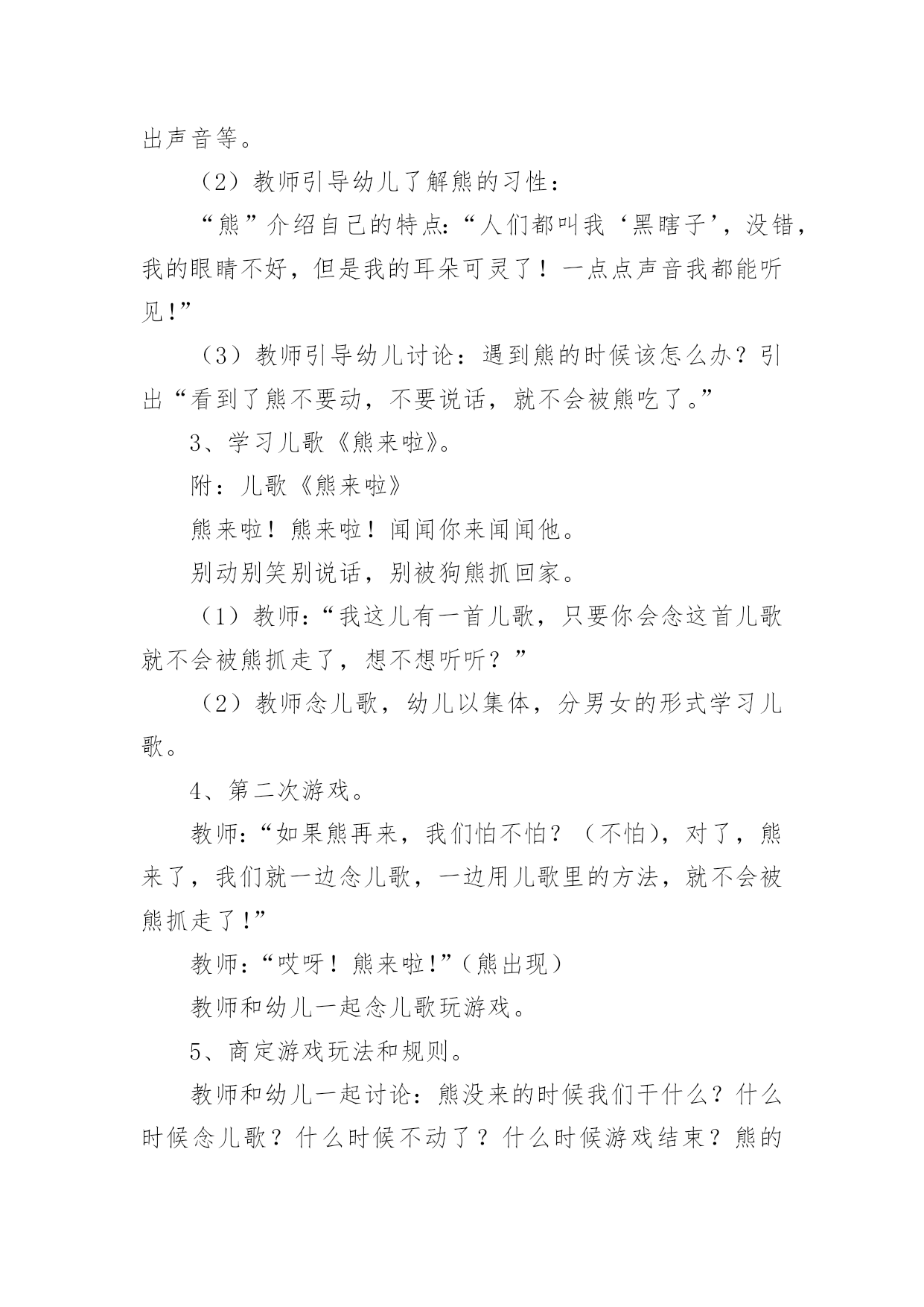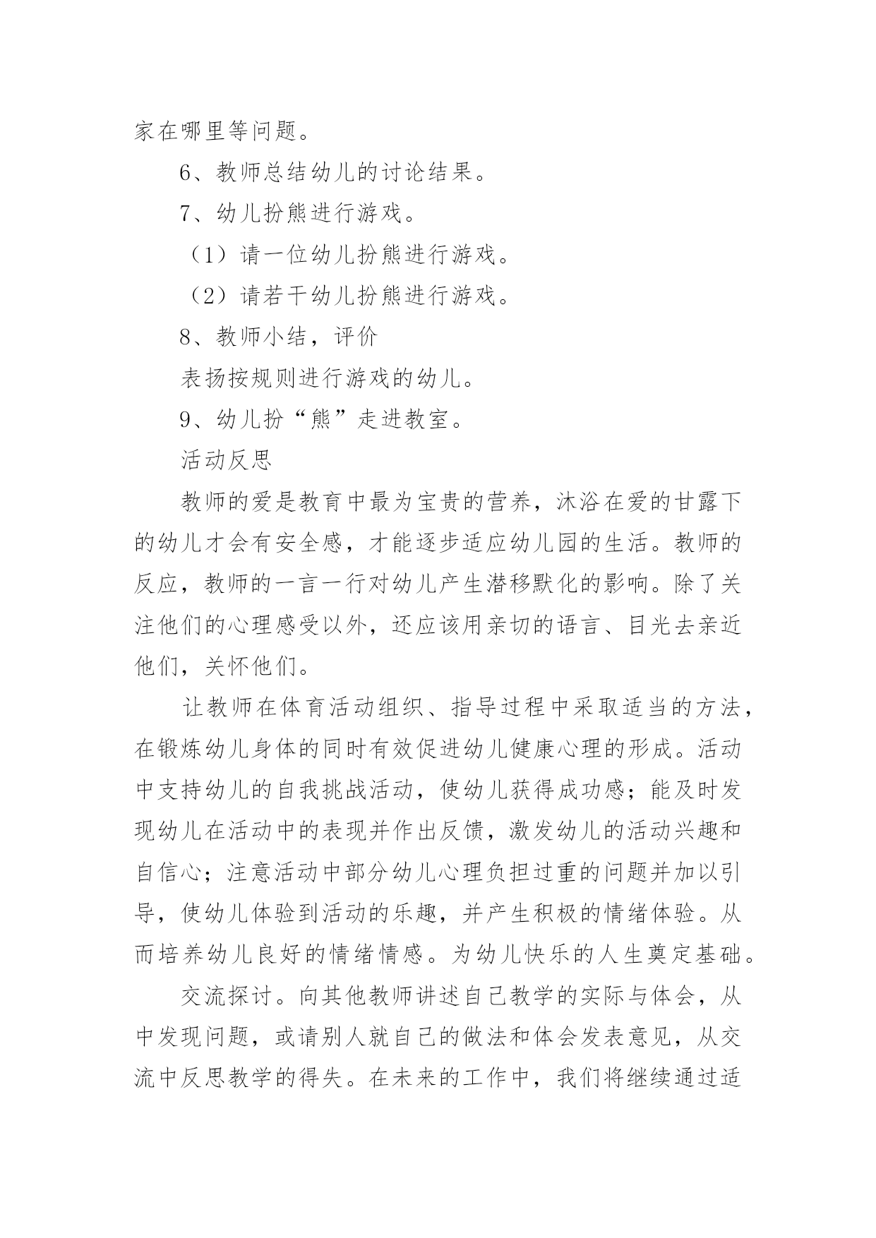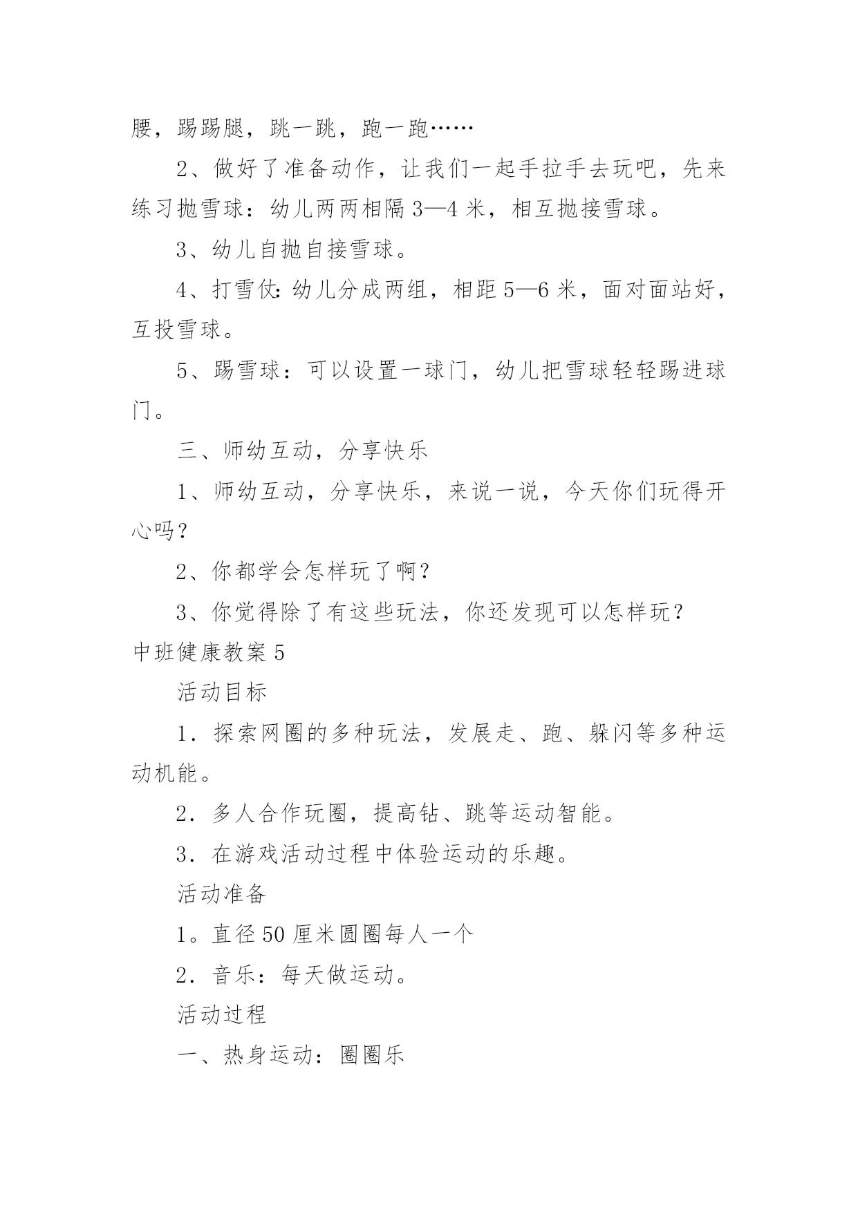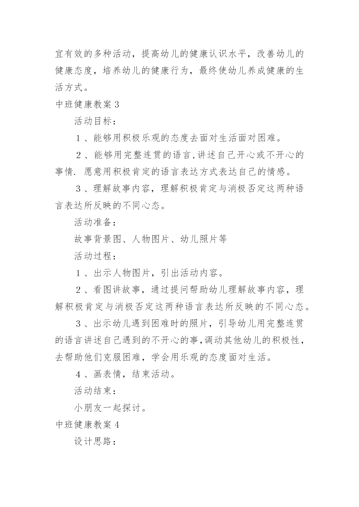 中班健康教案中班健康教案作为一位不辞辛劳的人民教师,时常需要编写教案,借助教案可以提高教学质量,收到预期的教学效果。那么写教案需要注意哪些问题呢?下面是小编整理的中班健康教案,希望能够帮助到大家。中班健康教案1活动目标1.能创造性的与影子做游戏,体验游戏乐趣。2.提高动作的灵活性和敏捷性。3.乐意参与游戏,体验游戏的乐趣。4.喜欢帮助别人,与同伴友好相处。活动准备1.根据天气情况在户外随时让幼儿观察在不同时段影子的变化。2.选择阳光明媚的天气开展活动。活动过程1.带领幼儿到空地上,请幼儿找一找自己的影子,并看看周围的东西是不是都有影子。2.请幼儿变换动作,并观察影子的变化。蹲下来,影子变短了,变成了小矮人。将手平举,影子多了翅膀,变成了小飞机(小鸟或蝴蝶)。把手放在头上,影子里多了两个大耳朵,变成一只小兔子。用单脚站立,变成了金鸡独立。3.请幼儿分组合作进行“影子变变变”游戏,看看哪组幼儿变出来的影子形象有趣。4.在地上用粉笔画一个大圈圈当作基地,玩“踩影子”游戏。(1)教师先和2~3位幼儿一起在圆圈里比赛,看谁先踩到别人的影子。(2)幼儿分组进行游戏,提醒幼儿遵守游戏规则:被踩到影子的幼儿站到圈外,与其他幼儿更换角色继续开展游戏。活动延伸:生活活动中可以引导幼儿画出物体或他人的影子,并用不同的方法进行测量。教学反思:从执教的情况来看,我觉得自己在课堂上的组织语言还有待加强,如何让孩子对你的提问或是小结能更好的明白、理解,是自己在以后的教学中需要关注的一个重要方面。中班健康教案2设计意图幼儿期是一个人心理发展的关键期。对幼儿实施心理健康教育,不仅有益于健康心理的形成,而且有利于增强社会适应力。心理是人脑对客观现实的反映,动作的发展可以使幼儿获得大量的刺激,从而促进大脑性能的完善,为各种心理品质的形成奠定基础。所以,设计了《熊来了》活动。该积极开展体育活动,在锻炼幼儿身体的同时有效促进幼儿健康心理的形成。幼儿健康心理的内容很多,那么教师在体育活动组织、指导过程中应采取什么方法培养良好的情绪情感。活动目标:1、幼儿喜欢参与游戏,情绪积极愉快。2、幼儿通过游戏培养抑制自己行为的能力,训练反应的灵敏性。3、幼儿能按游戏规则进行游戏。4、提高幼儿身体的协调能力,体验玩游戏的乐趣。5、锻炼幼儿的团结协作能力。活动准备:“熊”头饰一个,在场地上划好幼儿活动范围和“熊家”。活动过程:1、导入活动教师:“如果你突然遇到一头大狗熊,你该怎么样,它才不会吃你?”幼儿讨论提出意见。2、设置情境,观察讨论熊的习性。(1)教师请配班老师扮成熊,听到主班老师说:“哎呀!瞧,我们班来了一只大狗熊!你们快用你刚才的办法试试看,看它会不会吃你!”(配班老师就出现,幼儿尝试自己的办法,熊将出声的,动的幼儿抓走。)教师请没被抓走的幼儿介绍自己的方法:没有动,没有出声音等。(2)教师引导幼儿了解熊的习性:“熊”介绍自己的特点:“人们都叫我‘黑瞎子’,没错,我的眼睛不好,但是我的耳朵可灵了!一点点声音我都能听见!”(3)教师引导幼儿讨论:遇到熊的时候该怎么办?引出“看到了熊不要动,不要说话,就不会被熊吃了。”3、学习儿歌《熊来啦》。附:儿歌《熊来啦》熊来啦!熊来啦!闻闻你来闻闻他。别动别笑别说话,别被狗熊抓回家。(1)教师:“我这儿有一首儿歌,只要你会念这首儿歌就不会被熊抓走了,想不想听听?”(2)教师念儿歌,幼儿以集体,分男女的形式学习儿歌。4、第二次游戏。教师:“如果熊再来,我们怕不怕?(不怕),对了,熊来了,我们就一边念儿歌,一边用儿歌里的方法,就不会被熊抓走了!”教师:“哎呀!熊来啦!”(熊出现)教师和幼儿一起念儿歌玩游戏。5、商定游戏玩法和规则。教师和幼儿一起讨论:熊没来的时候我们干什么?什么时候念儿歌?什么时候不动了?什么时候游戏结束?熊的家在哪里等问题。6、教师总结幼儿的讨论结果。7、幼儿扮熊进行游戏。(1)请一位幼儿扮熊进行游戏。(2)请若干幼儿扮熊进行游戏。8、教师小结,评价表扬按规则进行游戏的幼儿。9、幼儿扮“熊”走进教室。活动反思教师的爱是教育中最为宝贵的营养,沐浴在爱的甘露下的幼儿才会有安全感,才能逐步适应幼儿园的生活。教师的反应,教师的一言一行对幼儿产生潜移默化的影响。除了关注他们的心理感受以外,还应该用亲切的语言、目光去亲近他们,关怀他们。让教师在体育活动组织、指导过程中采取适当的方法,在锻炼幼儿身体的同时有效促进幼儿健康心理的形成。活动中支持幼儿的自我挑战活动,使幼儿获得成功感;能及时发现幼儿在活动中的表现并作出反馈,激发幼儿的活动兴趣和自信心;注意活动中部分幼儿心理负担过重的问题并加以引导,使幼儿体验到活动的乐趣,并产生积极的情绪体验。从而培养幼儿良好的情绪情感。为幼儿快乐的人生奠定基础。交流探讨。向其他教师讲述自己教学的实际与体会,