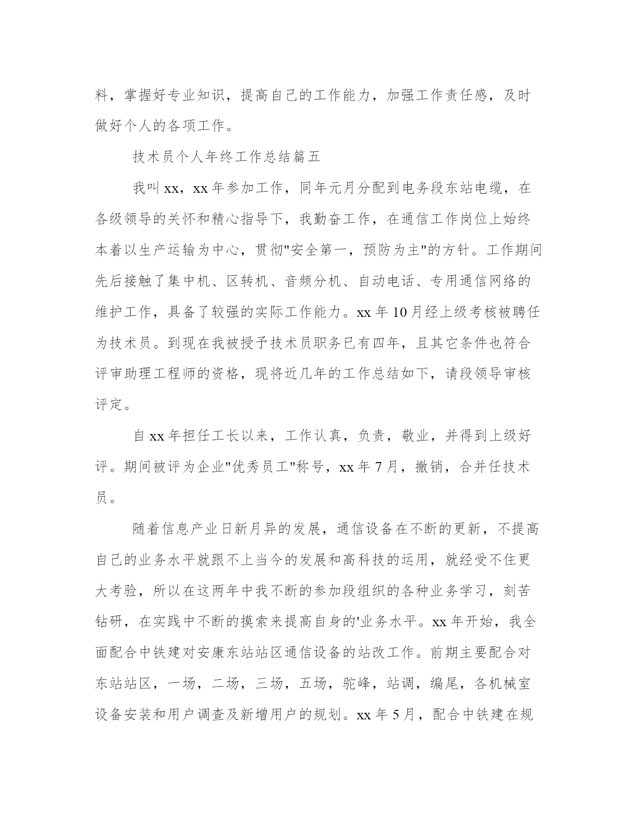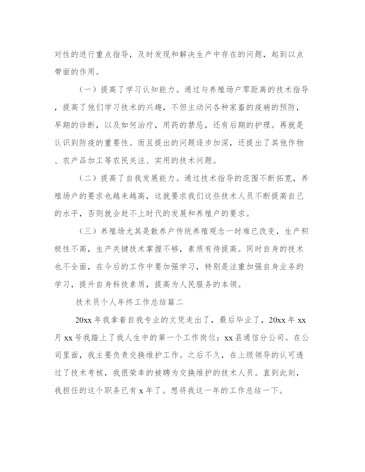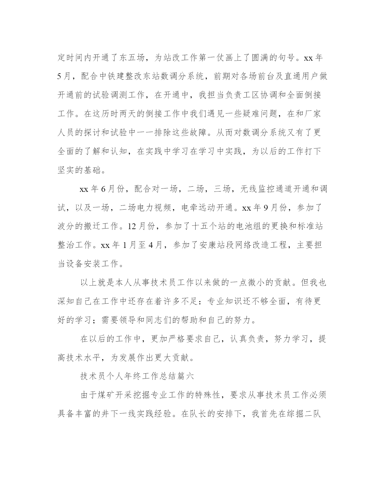 技术员个人年终工作总结(模板9篇)总结是对某段时间内表现进行总结和归纳的一种方式,为我们提供了回顾和思考的机会。写总结时要注意提出问题和解决办法,展示自己的思考和创新能力。下面是一些总结的案例,详细展示了如何写好一篇总结。技术员个人年终工作总结篇一20xx年xx县畜牧局成立“畜牧局技术服务团”,我作为xx县畜牧技术工积极参加xx县畜牧局组织的畜牧技术培训活动,利用工作之余,全面地学习畜禽养殖管理技术和动物疫病防控技术,提高专业理论知识,增强自己指导的深度和广度。平时注意提高自己的业务知识水平,多搜集相关专业技术资料,促进知识更新积累。及时了解xx养殖场和该村5个散养户的养殖习惯,根据他们的需要和县畜牧局的要求,结合本人的实际,制定了年度工作计划,确立了工作的指导思想,明确了年度目标,落实了工作措施。为全面更好的做好“一对一包场到户”技术指导工作奠定了基础。三是广泛开展技术资料发放工作,根据不同季节,做好各类疫苗的发放和注射,防止各类疫病的传播。使他们的损失降低到最低。通过对自己所指导的养殖场带动自然村中接受能力好,相信科学的5个散养户,制定了具体的实施方案。在平时的入户过程中,有针对性的进行重点指导,及时发现和解决生产中存在的问题,起到以点带面的作用。(一)提高了学习认知能力。通过与养殖场户零距离的技术指导,提高了他们学习技术的兴趣,不但主动问各种家畜的疫病的预防,早期的诊断,以及如何治疗,用药的禁忌,还有后期的护理。再就是认识到防疫的重要性。而且提出的问题逐步加深,还提出了其他作物、农产品加工等农民关注、实用的技术问题。(二)提高了自我发展能力。通过技术指导的范围不断拓宽,养殖场户的要求也越来越高,这就要求我们这些技术人员不断提高自己的水平,否则就会赶不上时代的发展和养殖户的要求。(三)养殖场尤其是散养户传统养殖观念一时难已改变,生产积极性不高,生产关键技术掌握不够,素质有待提高。同时自身的技术也不全面,在今后的工作中要加强学习,特别是注重加强自身业务的学习,提升自身科技素质,提高为人民服务的本领。技术员个人年终工作总结篇二20xx年我拿着自我专业的文凭走出了,最后毕业了,20xx年xx月xx号我踏上了我人生中的第一个工作岗位:xx县通信分公司。在公司里面,我主要负责交换维护工作。之后不久,在上级领导的认可透过了技术考核,我很荣幸的被聘为交换维护的技术人员。直到此刻,我担任的这个职务已有x年了。想将我这一年的工作总结一下。我于x年x月份至x年x月份在x担任程控交换机维护工作。这也是参加工作以来走上的第一个工作岗位。其实,x的设备维护工作是以交换设备为主的,还包括市话测量、电源、传输、油机等设备的综合维护工作。在综合维护工作中,始终坚持“理论联系实际”的原则,边学边用,不断提升了专业维护技能。俗话说:“工欲善其事,必先利其器”。在学习专业技术理论上,采取内外结合的原则,以自学为主,以公司培训为辅,毕竟外出培训的时光是极为有限的。几年来,我一向持续了不间断的学习,并在实际工作中发挥了有效的指导作用。孔子曰:“三人行,必有我师焉”。因此,在实际工作中,我力诫形式主义,一向持续谦虚谨慎、不骄不躁的作风,遇到不能处理的障碍,及时请教有丰富经验的老师傅,既及时恢复了正常通信,又学到了技术本领。在几年的时光中,我先后掌握了交换机的局数据及用户数据的操作;对sdh设备的性能有了进一步的了解;对电源设备的工作原理有了更加深入的认识;对于isdn、宽带设备及终端维护积累了必须的经验,总计为isdn及宽带用户排除终端障碍200余次。此外,在多次大型割接中,圆满完成了上级布置的工作任务。20xx年x月,因工作需要,被调入县公司负责机房环境整治、交换设备维护等工作。由技术岗位转变到技术管理岗位对我提出了新的更高标准的要求,也为综合素质的提升创造了一个良好的机会。对于综合工作,我合理规划时光,统筹安排工作,确保了各项工作不掉队。个性在机房环境整治上,我以市公司的相关要求为标准,从细节上下功夫,与建设维护部门相互协作,取得了良好效果。在历次安全检查中,市公司都给予了认可,同时也指出了不足。对此,我认真总结并及时完成了整改。我有时感觉压力很大,感觉到知识不够用。于是,我利用工作之余的分分秒秒,学习了关系工作各方面的知识,随着知识与经验的积累,处理起工作来能够游刃有余了。但是,这距离多面手的要求来说,还有很大的差距。但是,我相信持续的努力总会有成效的。人生路漫漫,我将把我一生的时光投入到这份我喜爱的工作中去,为公司做出自我的贡献。技术员个人年终工作总结篇三201x年5月11日,这是一个不一样的日子,从此我正式进入xx集团化工厂聚合干燥分厂,开始了自己真正意义上成为一个产业工人的日子。这里对于刚出校门初涉世事的我