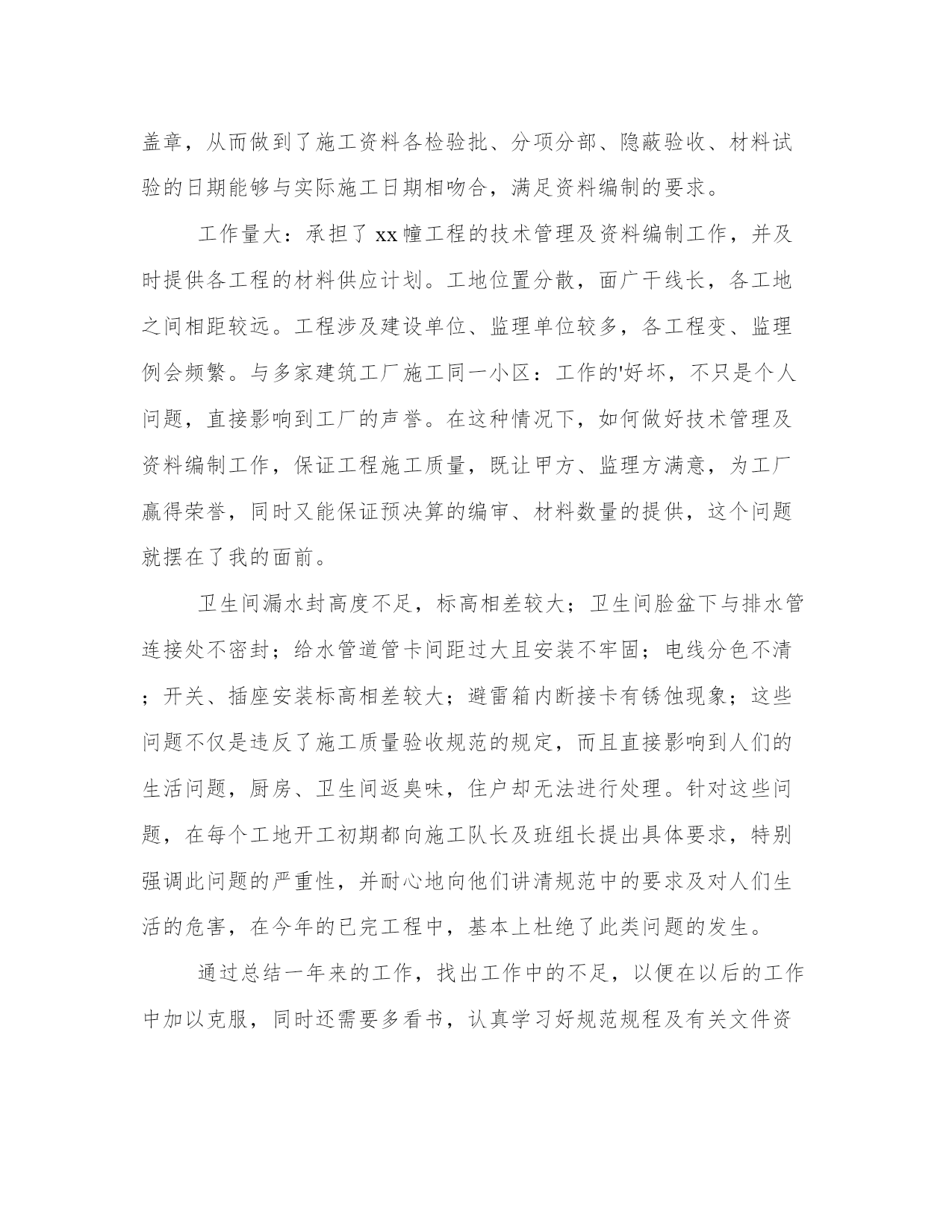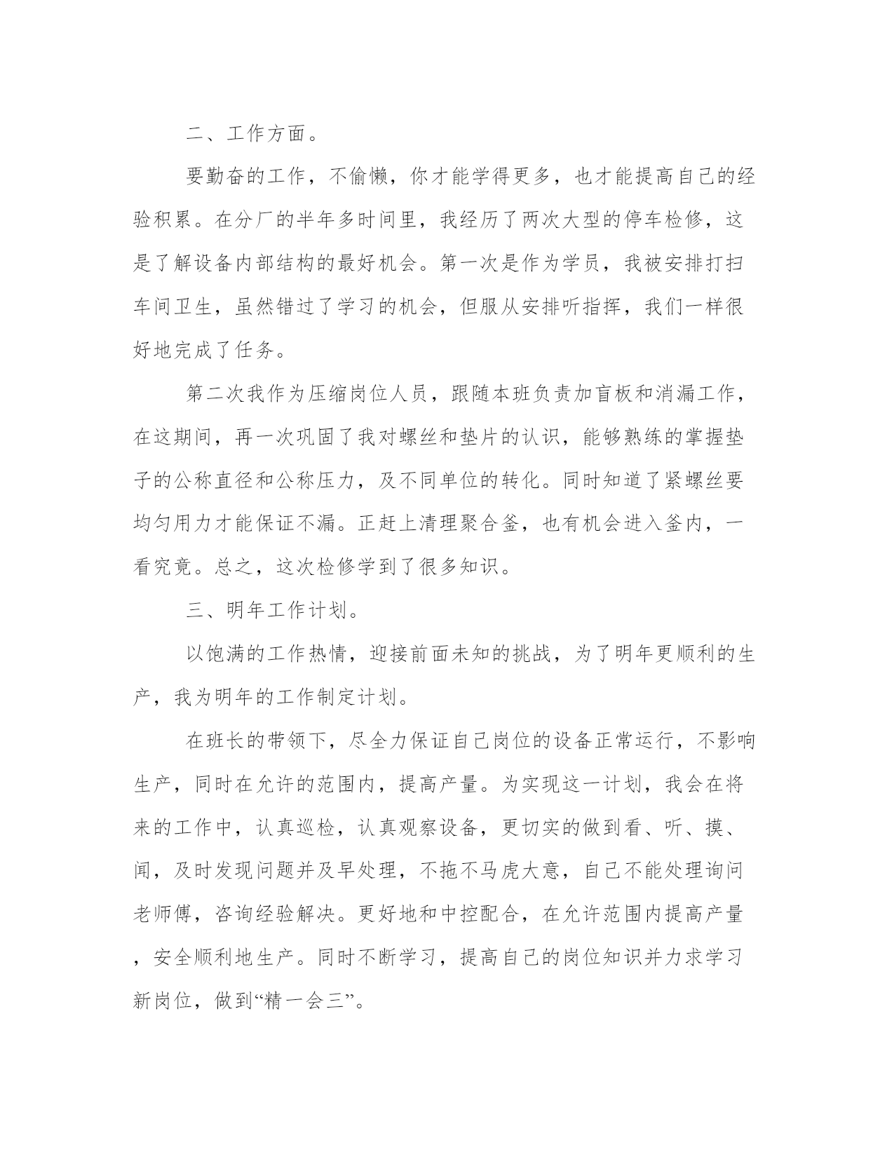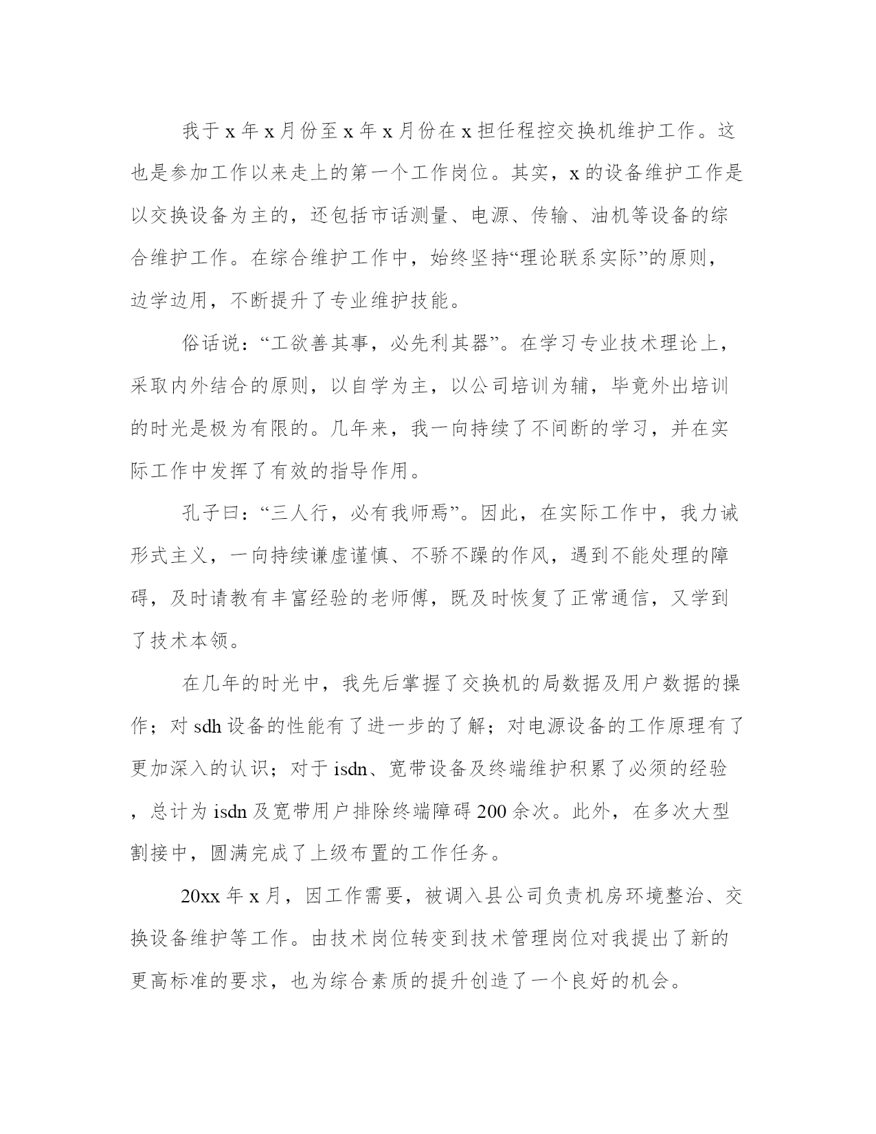 技术员个人年终工作总结(模板9篇)总结是对某段时间内表现进行总结和归纳的一种方式,为我们提供了回顾和思考的机会。写总结时要注意提出问题和解决办法,展示自己的思考和创新能力。下面是一些总结的案例,详细展示了如何写好一篇总结。技术员个人年终工作总结篇一20xx年xx县畜牧局成立“畜牧局技术服务团”,我作为xx县畜牧技术工积极参加xx县畜牧局组织的畜牧技术培训活动,利用工作之余,全面地学习畜禽养殖管理技术和动物疫病防控技术,提高专业理论知识,增强自己指导的深度和广度。平时注意提高自己的业务知识水平,多搜集相关专业技术资料,促进知识更新积累。及时了解xx养殖场和该村5个散养户的养殖习惯,根据他们的需要和县畜牧局的要求,结合本人的实际,制定了年度工作计划,确立了工作的指导思想,明确了年度目标,落实了工作措施。为全面更好的做好“一对一包场到户”技术指导工作奠定了基础。三是广泛开展技术资料发放工作,根据不同季节,做好各类疫苗的发放和注射,防止各类疫病的传播。使他们的损失降低到最低。通过对自己所指导的养殖场带动自然村中接受能力好,相信科学的5个散养户,制定了具体的实施方案。在平时的入户过程中,有针对性的进行重点指导,及时发现和解决生产中存在的问题,起到以点带面的作用。(一)提高了学习认知能力。通过与养殖场户零距离的技术指导,提高了他们学习技术的兴趣,不但主动问各种家畜的疫病的预防,早期的诊断,以及如何治疗,用药的禁忌,还有后期的护理。再就是认识到防疫的重要性。而且提出的问题逐步加深,还提出了其他作物、农产品加工等农民关注、实用的技术问题。(二)提高了自我发展能力。通过技术指导的范围不断拓宽,养殖场户的要求也越来越高,这就要求我们这些技术人员不断提高自己的水平,否则就会赶不上时代的发展和养殖户的要求。(三)养殖场尤其是散养户传统养殖观念一时难已改变,生产积极性不高,生产关键技术掌握不够,素质有待提高。同时自身的技术也不全面,在今后的工作中要加强学习,特别是注重加强自身业务的学习,提升自身科技素质,提高为人民服务的本领。技术员个人年终工作总结篇二20xx年我拿着自我专业的文凭走出了,最后毕业了,20xx年xx月xx号我踏上了我人生中的第一个工作岗位:xx县通信分公司。在公司里面,我主要负责交换维护工作。之后不久,在上级领导的认可透过了技术考核,我很荣幸的被聘为交换维护的技术人员。直到此刻,我担任的这个职务已有x年了。想将我这一年的工作总结一下。我于x年x月份至x年x月份在x担任程控交换机维护工作。这也是参加工作以来走上的第一个工作岗位。其实,x的设备维护工作是以交换设备为主的,还包括市话测量、电源、传输、油机等设备的综合维护工作。在综合维护工作中,始终坚持“理论联系实际”的原则,边学边用,不断提升了专业维护技能。俗话说:“工欲善其事,必先利其器”。在学习专业技术理论上,采取内外结合的原则,以自学为主,以公司培训为辅,毕竟外出培训的时光是极为有限的。几年来,我一向持续了不间断的学习,并在实际工作中发挥了有效的指导作用。孔子曰:“三人行,必有我师焉”。因此,在实际工作中,我力诫形式主义,一向持续谦虚谨慎、不骄不躁的作风,遇到不能处理的障碍,及时请教有丰富经验的老师傅,既及时恢复了正常通信,又学到了技术本领。在几年的时光中,我先后掌握了交换机的局数据及用户数据的操作;对sdh设备的性能有了进一步的了解;对电源设备的工作原理有了更加深入的认识;对于isdn、宽带设备及终端维护积累了必须的经验,总计为isdn及宽带用户排除终端障碍200余次。此外,在多次大型割接中,圆满完成了上级布置的工作任务。20xx年x月,因工作需要,被调入县公司负责机房环境整治、交换设备维护等工作。由技术岗位转变到技术管理岗位对我提出了新的更高标准的要求,也为综合素质的提升创造了一个良好的机会。对于综合工作,我合理规划时光,统筹安排工作,确保了各项工作不掉队。个性在机房环境整治上,我以市公司的相关要求为标准,从细节上下功夫,与建设维护部门相互协作,取得了良好效果。在历次安全检查中,市公司都给予了认可,同时也指出了不足。对此,我认真总结并及时完成了整改。我有时感觉压力很大,感觉到知识不够用。于是,我利用工作之余的分分秒秒,学习了关系工作各方面的知识,随着知识与经验的积累,处理起工作来能够游刃有余了。但是,这距离多面手的要求来说,还有很大的差距。但是,我相信持续的努力总会有成效的。人生路漫漫,我将把我一生的时光投入到这份我喜爱的工作中去,为公司做出自我的贡献。技术员个人年终工作总结篇三201x年5月11日,这是一个不一样的日子,从此我正式进入xx集团化工厂聚合干燥分厂,开始了自己真正意义上成为一个产业工人的日子。这里对于刚出校门初涉世事的我
