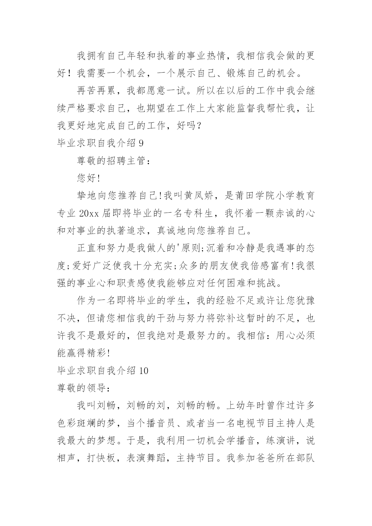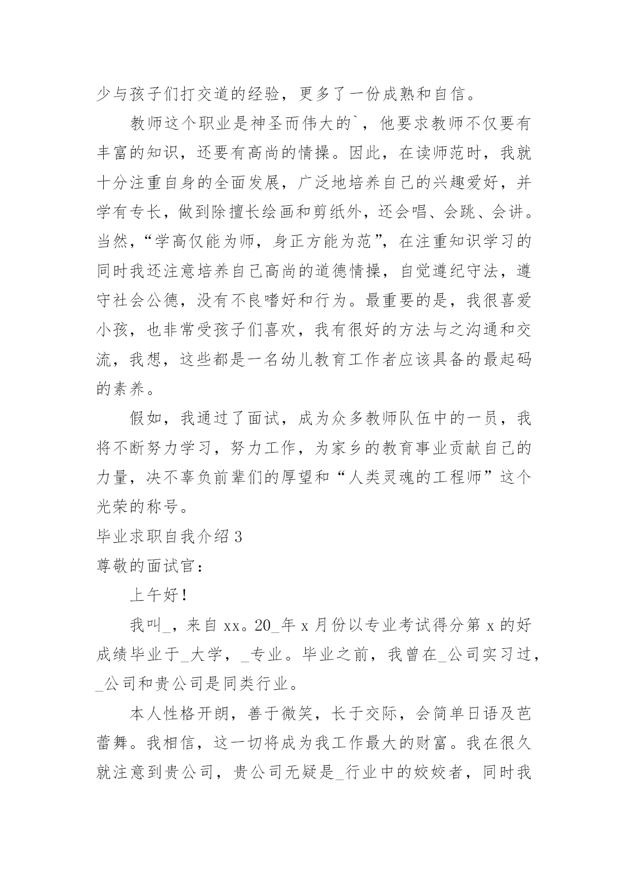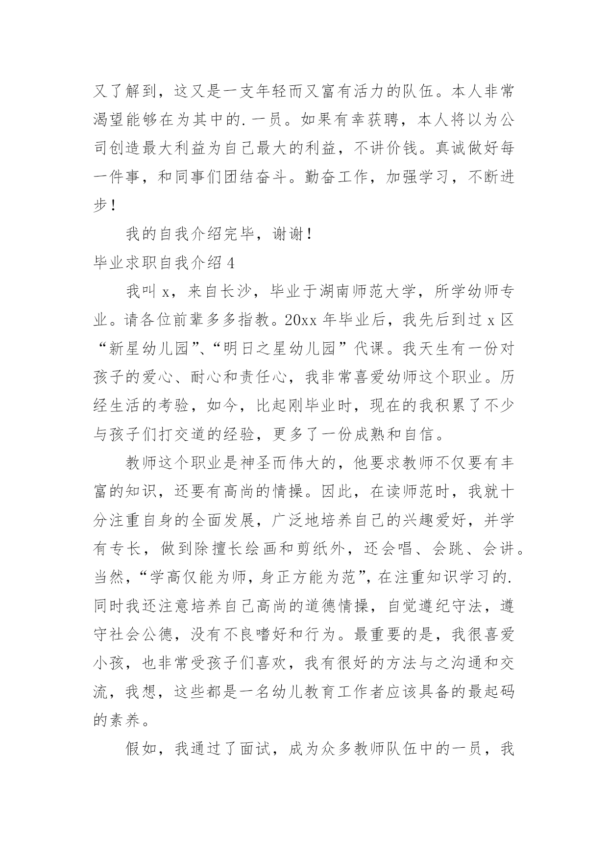毕业求职自我介绍毕业求职自我介绍(合集15篇)来到一个新的地方后,进行自我介绍是必不可少的,自我介绍是一展示自己的手段。你所见过的自我介绍是什么样的呢?以下是小编收集整理的毕业求职自我介绍,欢迎阅读,希望大家能够喜欢。毕业求职自我介绍1各位领导,各位评委:大家好!我叫xx,xx岁,将于今年6月份毕业于xx美术学院。根据我的自身情况,我认为我从事幼儿教育工作具有一定的优势和潜力。第一,我热爱教育,特别是幼儿教育。我的外公外婆、爸爸妈妈、舅舅姨妈都是教师,大姨妈就是一位优秀的幼儿教师。我从小就在教师群里长大,耳濡目染了教师的品格、智慧与追求,分享了他们在教育工作中获得的充实与快乐;也让我比同龄人更理解教师与学生的关系,这让我更加热爱教师这个职业。第二,我有爱心、耐心和责任心,特别是爱心。我特别喜欢和孩子们在一起。因为和他们在一起,有永远享受不完的惊喜和被他们包围着的幸福感。我在享受他们带给我快乐的时候,我会奉献我全部的`爱心和耐心。我在任何情况下都是先做自己该做的事,再做自己喜欢做的事,我想这就是我的责任心。所以,我一定能更称职地做好幼师这份工作。第三,我擅长交流,特别是与孩子交流。我擅长与孩子交流,是因为我有心理学、教育学知识作为理论基础,指导我与孩子们打交道;还因为我自己喜欢唱歌、跳舞和绘画,能让孩子们对我的言行感兴趣;还因为我喜欢想象和创新,总能给孩子们带来意外的惊喜和感动;还因为我喜欢蹲下身子与孩子说话,他们把我当朋友和亲人;还因为我善于赞美孩子,孩子们会从我这里品尝到成功的滋味。所以,我能把幼师这份工作做得有声有色。当然,在从事幼儿教育工作时肯定会遇到一些困难,但我不怕,我会不断学习不断努力的,我会把教育当事业,乐于奉献;把教育当科学,敢于求真;把教育当艺术,勇于创新。我会在幼儿教育这条爱的路上不断跋涉、不断收获、不断享受,创造我平凡而精彩的人生!谢谢大家!毕业求职自我介绍2尊敬的各位老师:大家上午。我叫xx,来自长沙,毕业于湖南师范大学,所学幼师专业。请各位前辈多多指教。20xx年毕业后,我先后到过xx区“新星幼儿园”、“明日之星幼儿园”代课。我天生有一份对孩子的爱心、耐心和责任心,我非常喜爱幼师这个职业。历经生活的考验,如今,比起刚毕业时,现在的我积累了不少与孩子们打交道的经验,更多了一份成熟和自信。教师这个职业是神圣而伟大的`,他要求教师不仅要有丰富的知识,还要有高尚的情操。因此,在读师范时,我就十分注重自身的全面发展,广泛地培养自己的兴趣爱好,并学有专长,做到除擅长绘画和剪纸外,还会唱、会跳、会讲。当然,“学高仅能为师,身正方能为范”,在注重知识学习的同时我还注意培养自己高尚的道德情操,自觉遵纪守法,遵守社会公德,没有不良嗜好和行为。最重要的是,我很喜爱小孩,也非常受孩子们喜欢,我有很好的方法与之沟通和交流,我想,这些都是一名幼儿教育工作者应该具备的最起码的素养。假如,我通过了面试,成为众多教师队伍中的一员,我将不断努力学习,努力工作,为家乡的教育事业贡献自己的力量,决不辜负前辈们的厚望和“人类灵魂的工程师”这个光荣的称号。毕业求职自我介绍3尊敬的面试官:上午好!我叫_,来自xx。20_年x月份以专业考试得分第x的好成绩毕业于_大学,_专业。毕业之前,我曾在_公司实习过,_公司和贵公司是同类行业。本人性格开朗,善于微笑,长于交际,会简单日语及芭蕾舞。我相信,这一切将成为我工作最大的财富。我在很久就注意到贵公司,贵公司无疑是_行业中的姣姣者,同时我又了解到,这又是一支年轻而又富有活力的队伍。本人非常渴望能够在为其中的.一员。如果有幸获聘,本人将以为公司创造最大利益为自己最大的利益,不讲价钱。真诚做好每一件事,和同事们团结奋斗。勤奋工作,加强学习,不断进步!我的自我介绍完毕,谢谢!毕业求职自我介绍4我叫x,来自长沙,毕业于湖南师范大学,所学幼师专业。请各位前辈多多指教。20xx年毕业后,我先后到过x区“新星幼儿园”、“明日之星幼儿园”代课。我天生有一份对孩子的爱心、耐心和责任心,我非常喜爱幼师这个职业。历经生活的考验,如今,比起刚毕业时,现在的我积累了不少与孩子们打交道的经验,更多了一份成熟和自信。教师这个职业是神圣而伟大的,他要求教师不仅要有丰富的知识,还要有高尚的情操。因此,在读师范时,我就十分注重自身的全面发展,广泛地培养自己的兴趣爱好,并学有专长,做到除擅长绘画和剪纸外,还会唱、会跳、会讲。当然,“学高仅能为师,身正方能为范”,在注重知识学习的.同时我还注意培养自己高尚的道德情操,自觉遵纪守法,遵守社会公德,没有不良嗜好和行为。最重要的是,我很喜爱小孩,也非常受孩子们喜欢,我有很好的方法与之沟通和交流,我想,这些都是一名幼儿教育工作者应该具备的最起码的素养。假如,我通过了面试,成为众多教师队伍中的一员,我