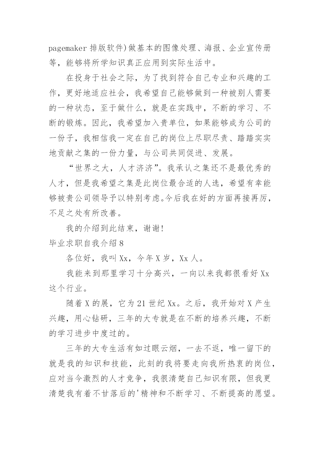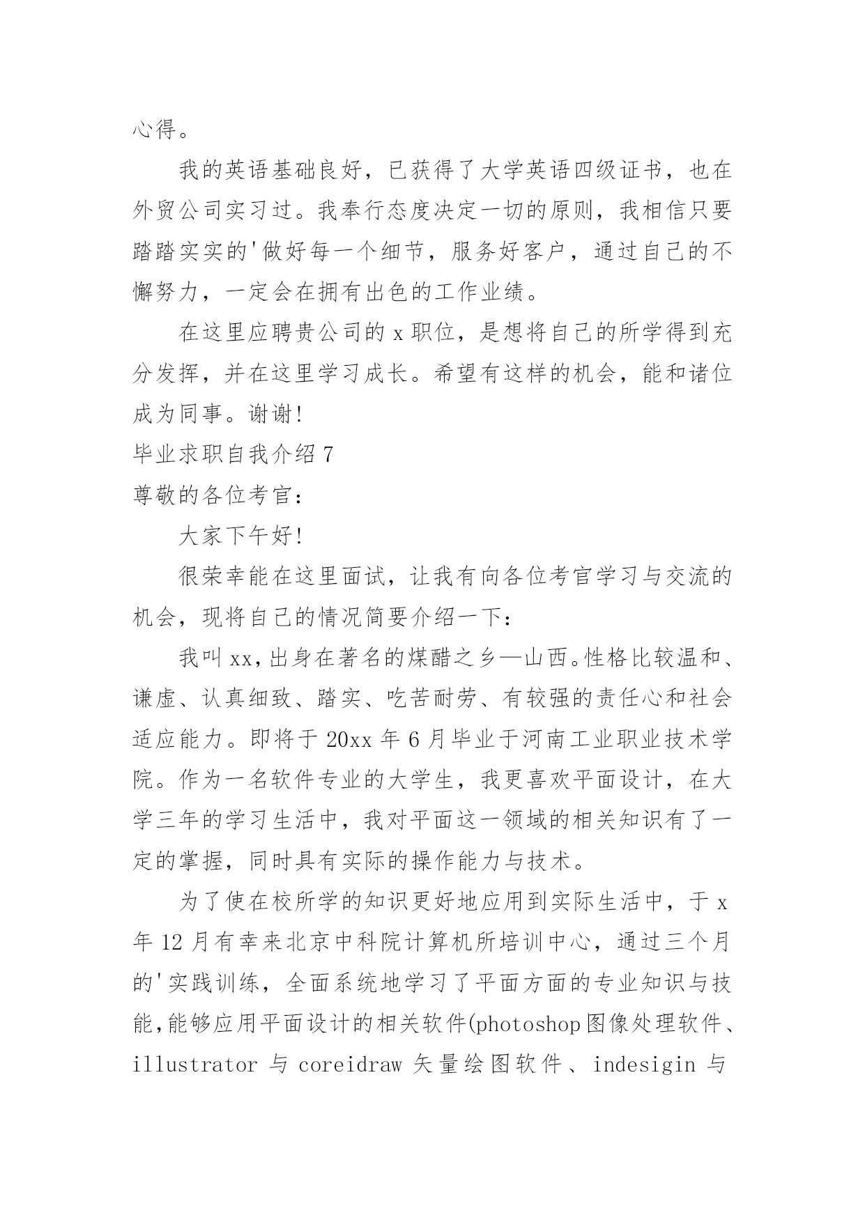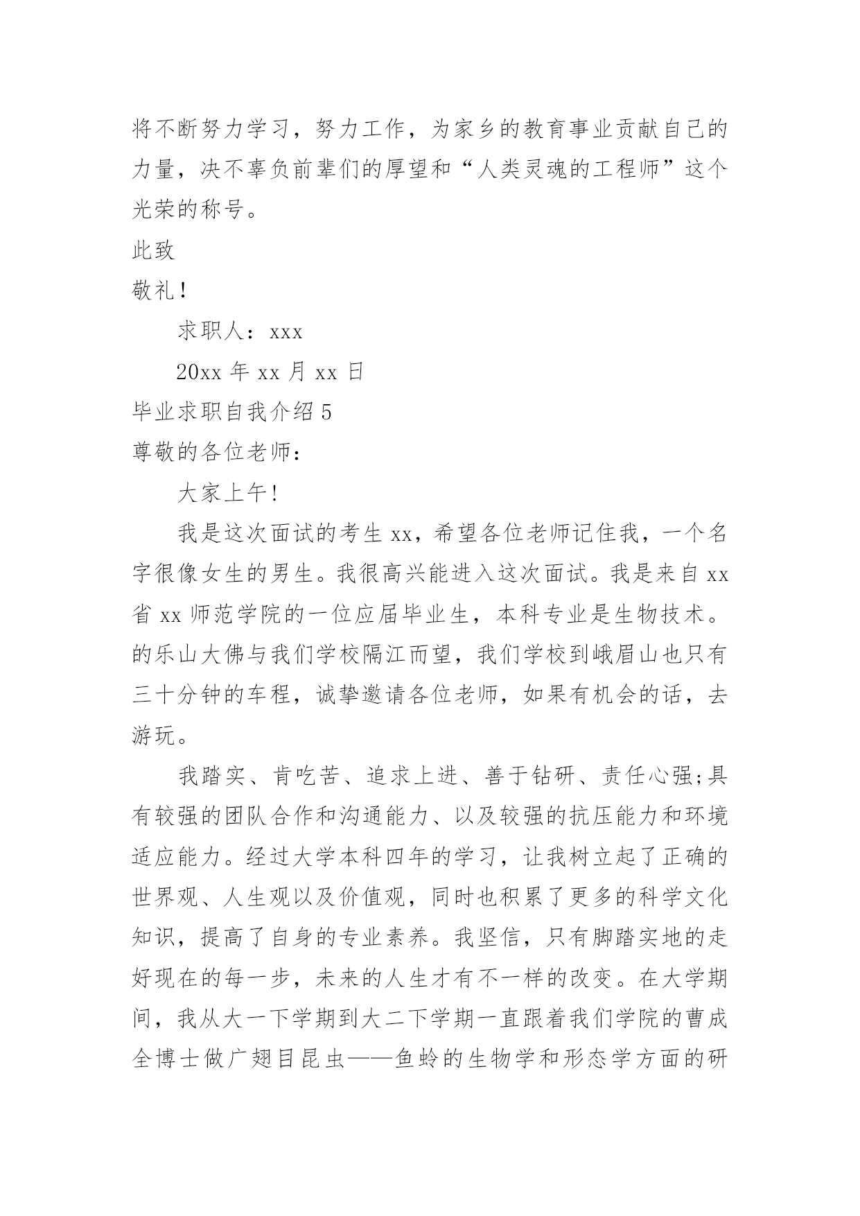 毕业求职自我介绍毕业求职自我介绍(合集15篇)来到一个新的地方后,进行自我介绍是必不可少的,自我介绍是一展示自己的手段。你所见过的自我介绍是什么样的呢?以下是小编收集整理的毕业求职自我介绍,欢迎阅读,希望大家能够喜欢。毕业求职自我介绍1各位领导,各位评委:大家好!我叫xx,xx岁,将于今年6月份毕业于xx美术学院。根据我的自身情况,我认为我从事幼儿教育工作具有一定的优势和潜力。第一,我热爱教育,特别是幼儿教育。我的外公外婆、爸爸妈妈、舅舅姨妈都是教师,大姨妈就是一位优秀的幼儿教师。我从小就在教师群里长大,耳濡目染了教师的品格、智慧与追求,分享了他们在教育工作中获得的充实与快乐;也让我比同龄人更理解教师与学生的关系,这让我更加热爱教师这个职业。第二,我有爱心、耐心和责任心,特别是爱心。我特别喜欢和孩子们在一起。因为和他们在一起,有永远享受不完的惊喜和被他们包围着的幸福感。我在享受他们带给我快乐的时候,我会奉献我全部的`爱心和耐心。我在任何情况下都是先做自己该做的事,再做自己喜欢做的事,我想这就是我的责任心。所以,我一定能更称职地做好幼师这份工作。第三,我擅长交流,特别是与孩子交流。我擅长与孩子交流,是因为我有心理学、教育学知识作为理论基础,指导我与孩子们打交道;还因为我自己喜欢唱歌、跳舞和绘画,能让孩子们对我的言行感兴趣;还因为我喜欢想象和创新,总能给孩子们带来意外的惊喜和感动;还因为我喜欢蹲下身子与孩子说话,他们把我当朋友和亲人;还因为我善于赞美孩子,孩子们会从我这里品尝到成功的滋味。所以,我能把幼师这份工作做得有声有色。当然,在从事幼儿教育工作时肯定会遇到一些困难,但我不怕,我会不断学习不断努力的,我会把教育当事业,乐于奉献;把教育当科学,敢于求真;把教育当艺术,勇于创新。我会在幼儿教育这条爱的路上不断跋涉、不断收获、不断享受,创造我平凡而精彩的人生!谢谢大家!毕业求职自我介绍2尊敬的各位老师:大家上午。我叫xx,来自长沙,毕业于湖南师范大学,所学幼师专业。请各位前辈多多指教。20xx年毕业后,我先后到过xx区“新星幼儿园”、“明日之星幼儿园”代课。我天生有一份对孩子的爱心、耐心和责任心,我非常喜爱幼师这个职业。历经生活的考验,如今,比起刚毕业时,现在的我积累了不少与孩子们打交道的经验,更多了一份成熟和自信。教师这个职业是神圣而伟大的`,他要求教师不仅要有丰富的知识,还要有高尚的情操。因此,在读师范时,我就十分注重自身的全面发展,广泛地培养自己的兴趣爱好,并学有专长,做到除擅长绘画和剪纸外,还会唱、会跳、会讲。当然,“学高仅能为师,身正方能为范”,在注重知识学习的同时我还注意培养自己高尚的道德情操,自觉遵纪守法,遵守社会公德,没有不良嗜好和行为。最重要的是,我很喜爱小孩,也非常受孩子们喜欢,我有很好的方法与之沟通和交流,我想,这些都是一名幼儿教育工作者应该具备的最起码的素养。假如,我通过了面试,成为众多教师队伍中的一员,我将不断努力学习,努力工作,为家乡的教育事业贡献自己的力量,决不辜负前辈们的厚望和“人类灵魂的工程师”这个光荣的称号。毕业求职自我介绍3尊敬的面试官:上午好!我叫_,来自xx。20_年x月份以专业考试得分第x的好成绩毕业于_大学,_专业。毕业之前,我曾在_公司实习过,_公司和贵公司是同类行业。本人性格开朗,善于微笑,长于交际,会简单日语及芭蕾舞。我相信,这一切将成为我工作最大的财富。我在很久就注意到贵公司,贵公司无疑是_行业中的姣姣者,同时我又了解到,这又是一支年轻而又富有活力的队伍。本人非常渴望能够在为其中的.一员。如果有幸获聘,本人将以为公司创造最大利益为自己最大的利益,不讲价钱。真诚做好每一件事,和同事们团结奋斗。勤奋工作,加强学习,不断进步!我的自我介绍完毕,谢谢!毕业求职自我介绍4我叫x,来自长沙,毕业于湖南师范大学,所学幼师专业。请各位前辈多多指教。20xx年毕业后,我先后到过x区“新星幼儿园”、“明日之星幼儿园”代课。我天生有一份对孩子的爱心、耐心和责任心,我非常喜爱幼师这个职业。历经生活的考验,如今,比起刚毕业时,现在的我积累了不少与孩子们打交道的经验,更多了一份成熟和自信。教师这个职业是神圣而伟大的,他要求教师不仅要有丰富的知识,还要有高尚的情操。因此,在读师范时,我就十分注重自身的全面发展,广泛地培养自己的兴趣爱好,并学有专长,做到除擅长绘画和剪纸外,还会唱、会跳、会讲。当然,“学高仅能为师,身正方能为范”,在注重知识学习的.同时我还注意培养自己高尚的道德情操,自觉遵纪守法,遵守社会公德,没有不良嗜好和行为。最重要的是,我很喜爱小孩,也非常受孩子们喜欢,我有很好的方法与之沟通和交流,我想,这些都是一名幼儿教育工作者应该具备的最起码的素养。假如,我通过了面试,成为众多教师队伍中的一员,我