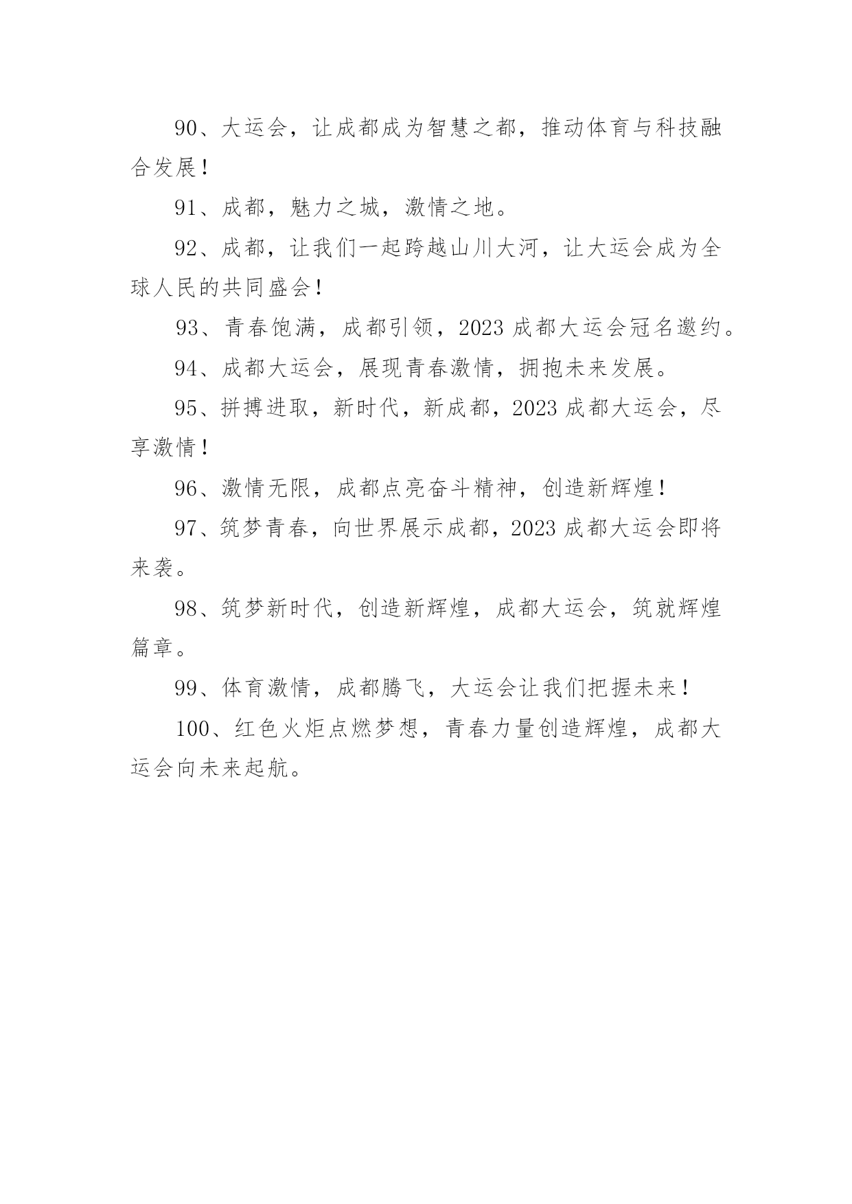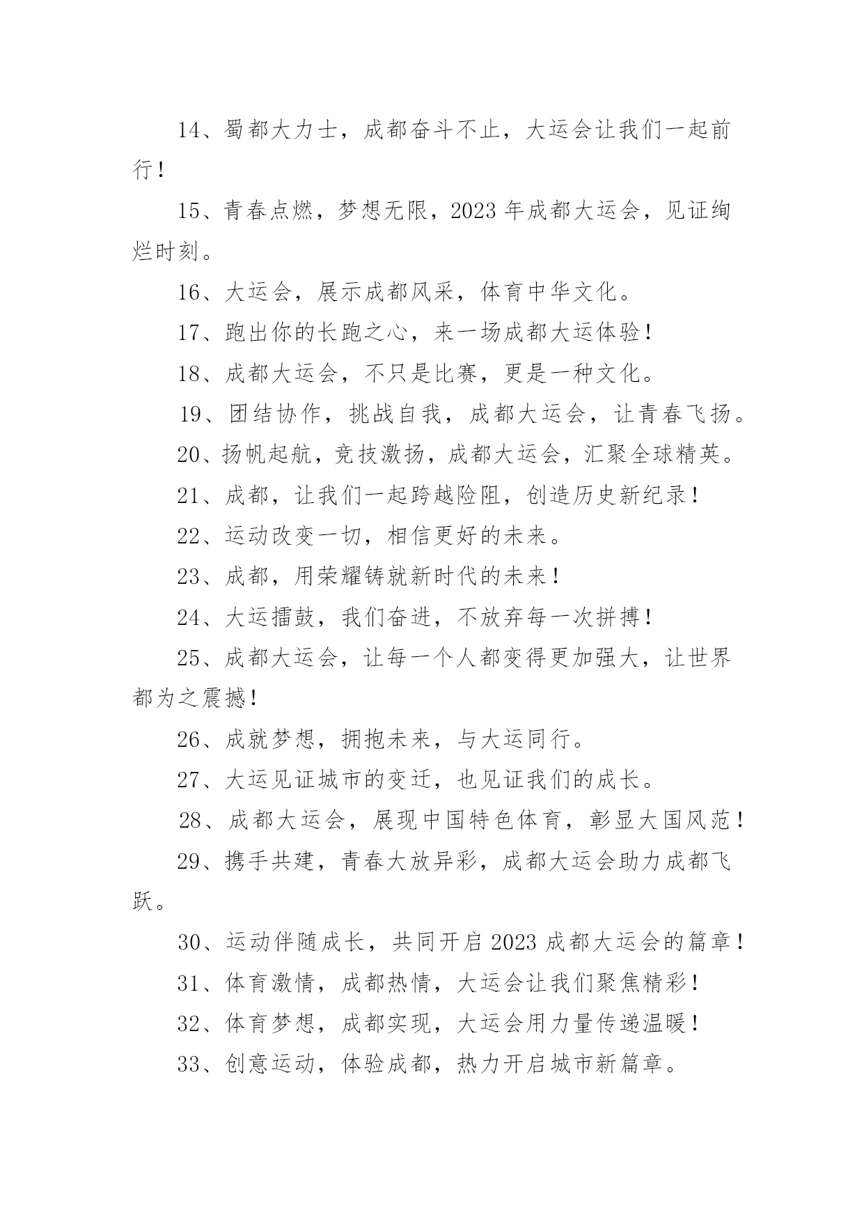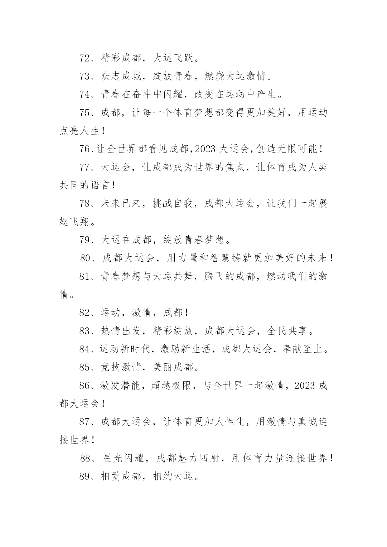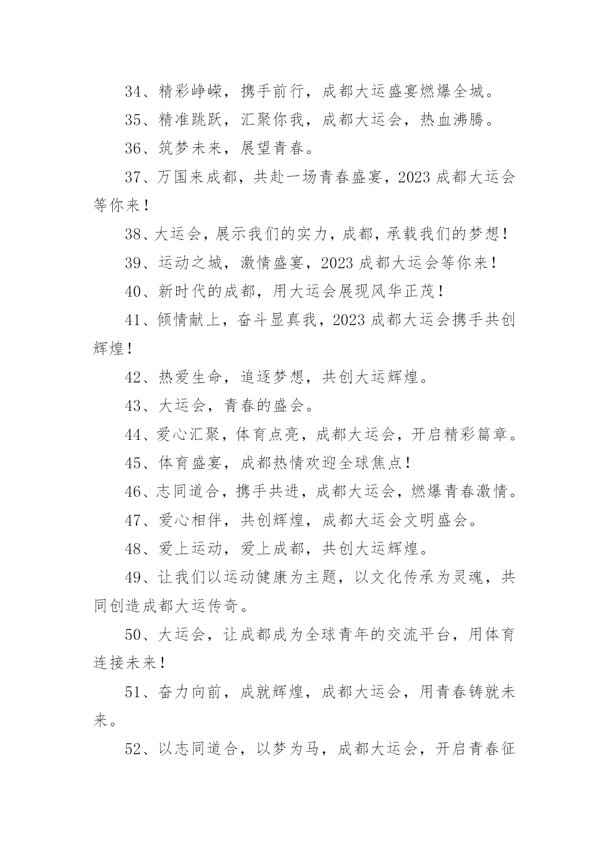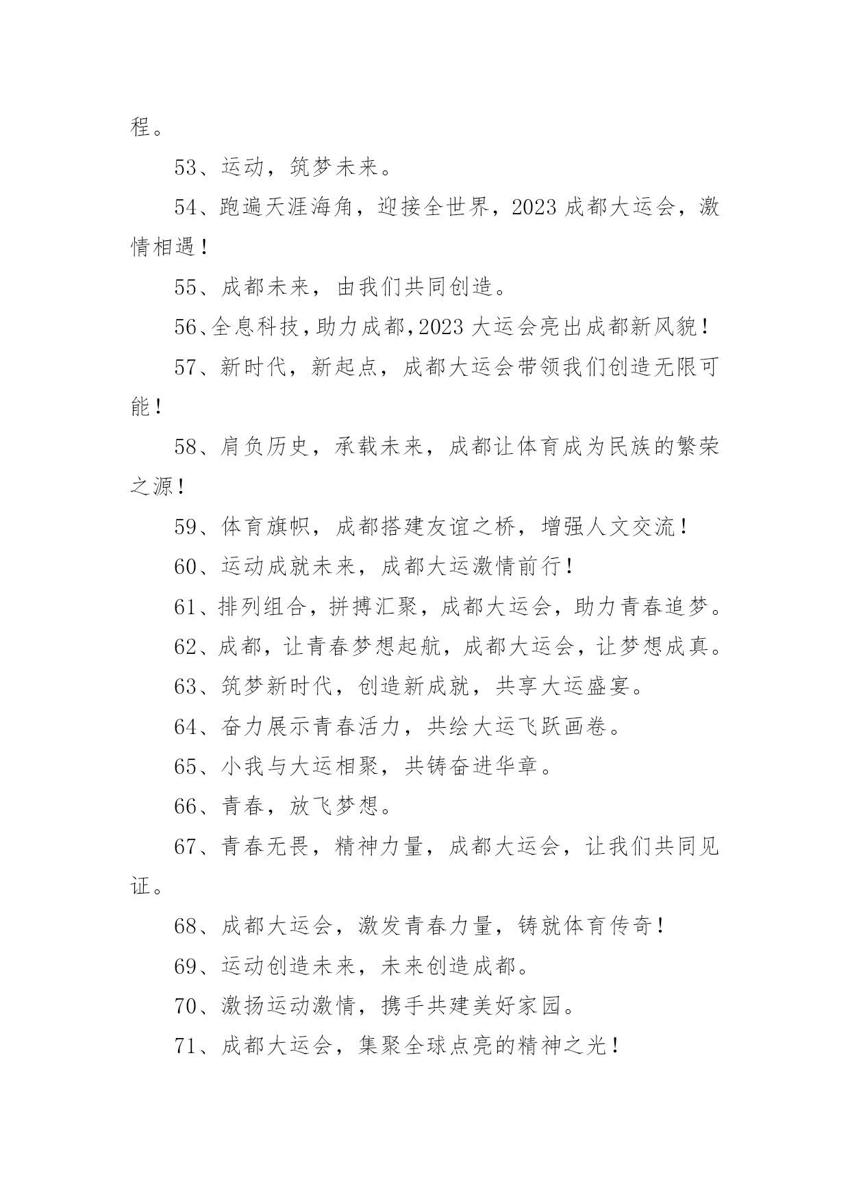 迎接成都大运会的口号迎接成都大运会的口号(精选100句)在平日的学习、工作和生活里,大家都知道一些经典的口号吧,口号往往带有很强的倾向性,它的引导和鼓动作用十分明显。那什么样的口号才是经典的呢?以下是小编为大家整理的迎接成都大运会的口号(精选100句),欢迎阅读与收藏。1、成都大运会,让世界了解我们,让我们了解世界!2、成功因我们在行动,成都大运会为梦想接力。3、跳出青春最美的舞步,在2023成都大运会上,分享梦想!4、硬实力造就赛场强者,文化底蕴塑造体育精神。5、成为传奇,点燃精彩,2023成都大运会,打造全新篇章!6、成都,展现拼搏与荣耀,让大运会成为时代的见证!7、一场赛事,一场盛宴,成都大运燃动青春。8、跃动青春,释放激情,2023成都大运会打造绚烂盛宴!9、成都大运会,点燃激情,共创未来!10、筑梦之城成道之光,运动之都成都大运会。11、成都,我们的大运会,我们的激情。12、2023,全球瞩目成都。13、爱上跑道,奋力冲刺,成就大运荣光。14、蜀都大力士,成都奋斗不止,大运会让我们一起前行!15、青春点燃,梦想无限,2023年成都大运会,见证绚烂时刻。16、大运会,展示成都风采,体育中华文化。17、跑出你的长跑之心,来一场成都大运体验!18、成都大运会,不只是比赛,更是一种文化。19、团结协作,挑战自我,成都大运会,让青春飞扬。20、扬帆起航,竞技激扬,成都大运会,汇聚全球精英。21、成都,让我们一起跨越险阻,创造历史新纪录!22、运动改变一切,相信更好的未来。23、成都,用荣耀铸就新时代的未来!24、大运擂鼓,我们奋进,不放弃每一次拼搏!25、成都大运会,让每一个人都变得更加强大,让世界都为之震撼!26、成就梦想,拥抱未来,与大运同行。27、大运见证城市的变迁,也见证我们的成长。28、成都大运会,展现中国特色体育,彰显大国风范!29、携手共建,青春大放异彩,成都大运会助力成都飞跃。30、运动伴随成长,共同开启2023成都大运会的篇章!31、体育激情,成都热情,大运会让我们聚焦精彩!32、体育梦想,成都实现,大运会用力量传递温暖!33、创意运动,体验成都,热力开启城市新篇章。34、精彩峥嵘,携手前行,成都大运盛宴燃爆全城。35、精准跳跃,汇聚你我,成都大运会,热血沸腾。36、筑梦未来,展望青春。37、万国来成都,共赴一场青春盛宴,2023成都大运会等你来!38、大运会,展示我们的实力,成都,承载我们的梦想!39、运动之城,激情盛宴,2023成都大运会等你来!40、新时代的成都,用大运会展现风华正茂!41、倾情献上,奋斗显真我,2023成都大运会携手共创辉煌!42、热爱生命,追逐梦想,共创大运辉煌。43、大运会,青春的盛会。44、爱心汇聚,体育点亮,成都大运会,开启精彩篇章。45、体育盛宴,成都热情欢迎全球焦点!46、志同道合,携手共进,成都大运会,燃爆青春激情。47、爱心相伴,共创辉煌,成都大运会文明盛会。48、爱上运动,爱上成都,共创大运辉煌。49、让我们以运动健康为主题,以文化传承为灵魂,共同创造成都大运传奇。50、大运会,让成都成为全球青年的交流平台,用体育连接未来!51、奋力向前,成就辉煌,成都大运会,用青春铸就未来。52、以志同道合,以梦为马,成都大运会,开启青春征程。53、运动,筑梦未来。54、跑遍天涯海角,迎接全世界,2023成都大运会,激情相遇!55、成都未来,由我们共同创造。56、全息科技,助力成都,2023大运会亮出成都新风貌!57、新时代,新起点,成都大运会带领我们创造无限可能!58、肩负历史,承载未来,成都让体育成为民族的繁荣之源!59、体育旗帜,成都搭建友谊之桥,增强人文交流!60、运动成就未来,成都大运激情前行!61、排列组合,拼搏汇聚,成都大运会,助力青春追梦。62、成都,让青春梦想起航,成都大运会,让梦想成真。63、筑梦新时代,创造新成就,共享大运盛宴。64、奋力展示青春活力,共绘大运飞跃画卷。65、小我与大运相聚,共铸奋进华章。66、青春,放飞梦想。67、青春无畏,精神力量,成都大运会,让我们共同见证。68、成都大运会,激发青春力量,铸就体育传奇!69、运动创造未来,未来创造成都。70、激扬运动激情,携手共建美好家园。71、成都大运会,集聚全球点亮的精神之光!72、精彩成都,大运飞跃。73、众志成城,绽放青春,燃烧大运激情。74、青春在奋斗中闪耀,改变在运动中产生。75、成都,让每一个体育梦想都变得更加美好,用运动点亮人生!76、让全世界都看见成都,2023大运会,创造无限可能!77、大运会,让成都成为世界的焦点,让体育成为人类共同的语言!78、未来已来,挑战自我,成都大运会,让我们一起展翅飞翔。79、大运在成都,绽放青春梦想。80、成都大运会,用力量和智慧铸就更加美好的未来!8