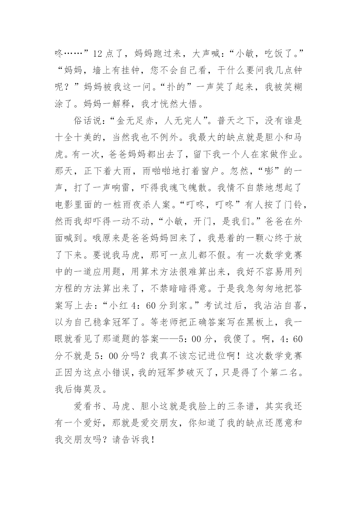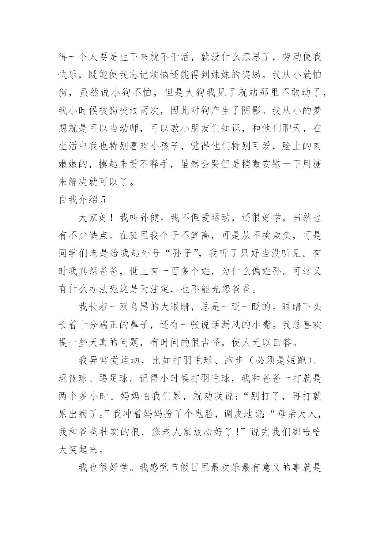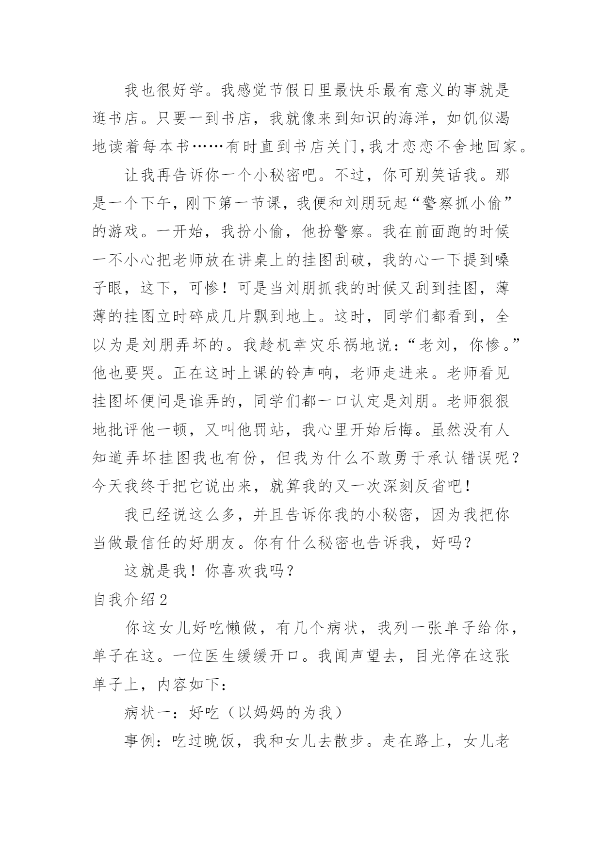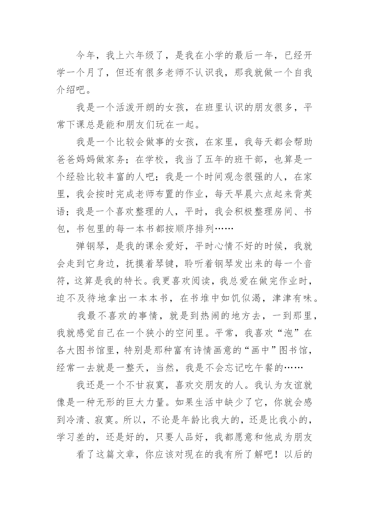 自我介绍自我介绍当我们在一个新环境中,进行自我介绍是必不可少的,通过自我介绍可以得到他人的认可。那要怎么写好自我介绍呢?下面是小编收集整理的自我介绍,仅供参考,欢迎大家阅读。自我介绍1大家好!我叫孙健。我不但爱运动,还很好学,当然也有不少缺点。在班里我个子不算高,但是从不挨欺负,可是同学们老是给我起外号“孙子”,我听只好当没听见。有时我真怨爸爸,世上有一百多个姓,为什么偏姓孙。可这又有什么办法呢?这是天注定,也不能光怨爸爸。我长着一双乌黑的大眼睛,总是一眨一眨的。眼睛下面长着非常端正的鼻子,还有一张说话漏风的小嘴。我总喜欢提一些天真的问题,有时问的很古怪,使人无以回答。我特别爱运动,比如打羽毛球、跑步(必须是短跑)、玩篮球、踢足球……记得小时候打羽毛球,我和爸爸一打就是两个多小时。妈妈怕我们累,就劝我说:“别打,再打就累出病。”我冲着妈妈扮个鬼脸,调皮地说;“母亲大人,我和爸爸壮实的很,您老人家放心好!”说完我们都哈哈大笑起来。我也很好学。我感觉节假日里最快乐最有意义的事就是逛书店。只要一到书店,我就像来到知识的海洋,如饥似渴地读着每本书……有时直到书店关门,我才恋恋不舍地回家。让我再告诉你一个小秘密吧。不过,你可别笑话我。那是一个下午,刚下第一节课,我便和刘朋玩起“警察抓小偷”的游戏。一开始,我扮小偷,他扮警察。我在前面跑的时候一不小心把老师放在讲桌上的挂图刮破,我的心一下提到嗓子眼,这下,可惨!可是当刘朋抓我的时候又刮到挂图,薄薄的挂图立时碎成几片飘到地上。这时,同学们都看到,全以为是刘朋弄坏的。我趁机幸灾乐祸地说:“老刘,你惨。”他也要哭。正在这时上课的铃声响,老师走进来。老师看见挂图坏便问是谁弄的,同学们都一口认定是刘朋。老师狠狠地批评他一顿,又叫他罚站,我心里开始后悔。虽然没有人知道弄坏挂图我也有份,但我为什么不敢勇于承认错误呢?今天我终于把它说出来,就算我的又一次深刻反省吧!我已经说这么多,并且告诉你我的小秘密,因为我把你当做最信任的好朋友。你有什么秘密也告诉我,好吗?这就是我!你喜欢我吗?自我介绍2你这女儿好吃懒做,有几个病状,我列一张单子给你,单子在这。一位医生缓缓开口。我闻声望去,目光停在这张单子上,内容如下:病状一:好吃(以妈妈的为我)事例:吃过晚饭,我和女儿去散步。走在路上,女儿老是东张西望,这瞧瞧,那望望,不时被我看见她吞口水,路过小吃店时,眼珠子快蹦近去,又抿抿嘴唇,摆摆头,装作若无其事的散步。终于,返程时,她张开大嘴:妈,我要吃那个螺蛳,好好吃的,我都好几年没得吃了,您就发发慈悲,赏赏光吧!再说也不贵,给我解解馋,好不好啊?我被她的长篇大论愣住了:不行啊,我没带钱。我带了,我带了啊。她急切地说。这个我有点犹豫。默认啦,我去买啦!她飞快跑向小吃店,买回她的战利品。回到家她就像饿狼一样扑向螺蛳,不是刚刚吃过饭吗?嘿嘿,不错,但是她是不怕肚子吃破的。病状二:懒做事例:当当当,女儿敲着碗说:吃饱了吃饱啦,各位慢慢吃啊,我失陪玩啦!女儿放下碗,哒哒哒上楼玩了。玩啊玩啊玩,玩腻了,又哒哒哒下楼了。走进厨房(我故意没洗碗)只听见女儿说:这么懒,碗都没洗!一会儿又跑去玩了。1小时候,回到家,我就劈头盖脸就问:你怎么这么懒啊,一大堆碗放在这里,你都不会洗啊,动动手又怎么样?女儿忙着脚底抹油,溜了。溜哪了?跑到厕所偷懒呗!病状三:健忘数不胜数,我看着眼花缭乱,怎,怎办?改掉吗,我看,改掉!哼,士别三日当刮目相待,我就给你看看新的我!想完,我又拿着零钱跑到小卖部买东西吃了,咦?不是改掉好吃的习惯吗?呀,我把这给忘了自我介绍3今年,我上六年级了,是我在小学的最后一年,已经开学一个月了,但还有很多老师不认识我,那我就做一个自我介绍吧。我是一个活泼开朗的女孩,在班里认识的朋友很多,平常下课总是能和朋友们玩在一起。我是一个比较会做事的女孩,在家里,我每天都会帮助爸爸妈妈做家务;在学校,我当了五年的班干部,也算是一个经验比较丰富的人吧;我是一个时间观念很强的人,在家里,我会按时完成老师布置的作业,每天早晨六点起来背英语;我是一个喜欢整理的人,平时,我会积极整理房间、书包,书包里的每一本书都按顺序排列……弹钢琴,是我的课余爱好,平时心情不好的时候,我就会走到它身边,抚摸着琴键,聆听着钢琴发出来的每一个音符,这算是我的特长。我更喜欢阅读,我总爱在做完作业时,迫不及待地拿出一本本书,在书堆中如饥似渴,津津有味。我最不喜欢的事情,就是到热闹的地方去,一到那里,我就感觉自己在一个狭小的空间里。平常,我喜欢“泡”在各大图书馆里,特别是那种富有诗情画意的“画中”图书馆,经常一去就是一整天,当然,我是不会忘记吃午餐的……我还是一个不甘寂寞,喜欢交朋友的人。我认为友谊就像是一种无形的巨大力量。如果生活中缺少了它,你就会感到冷清、寂寞。所以,不论