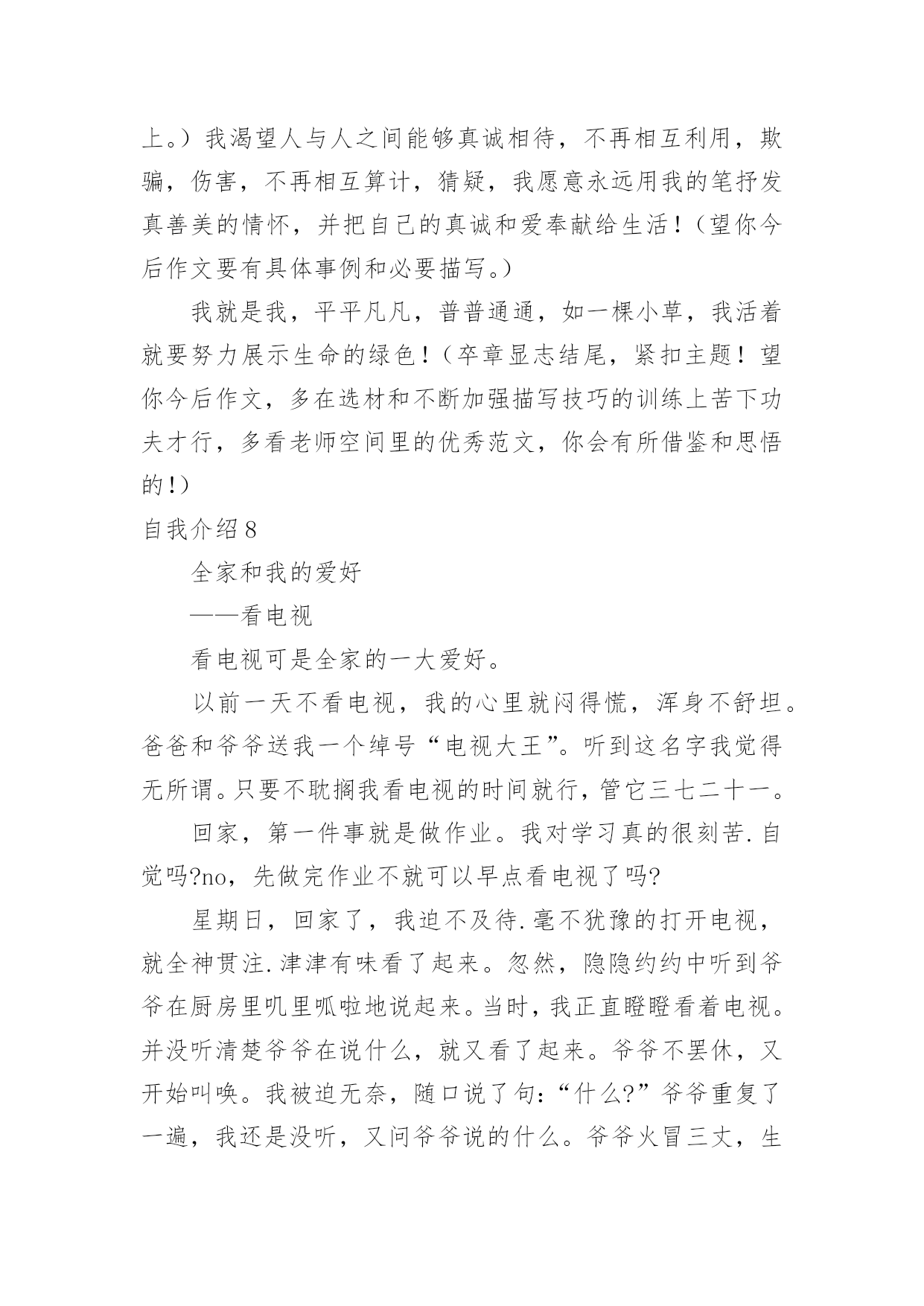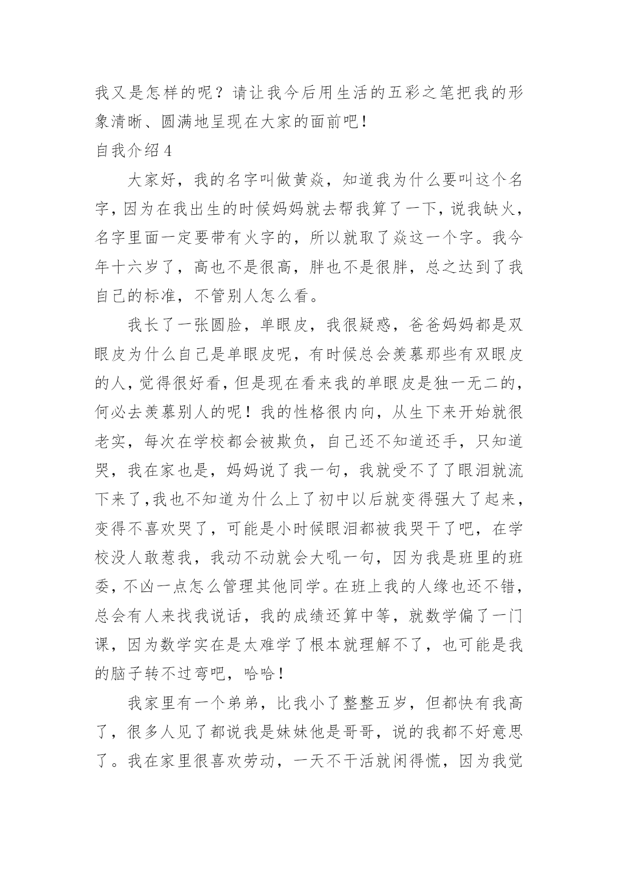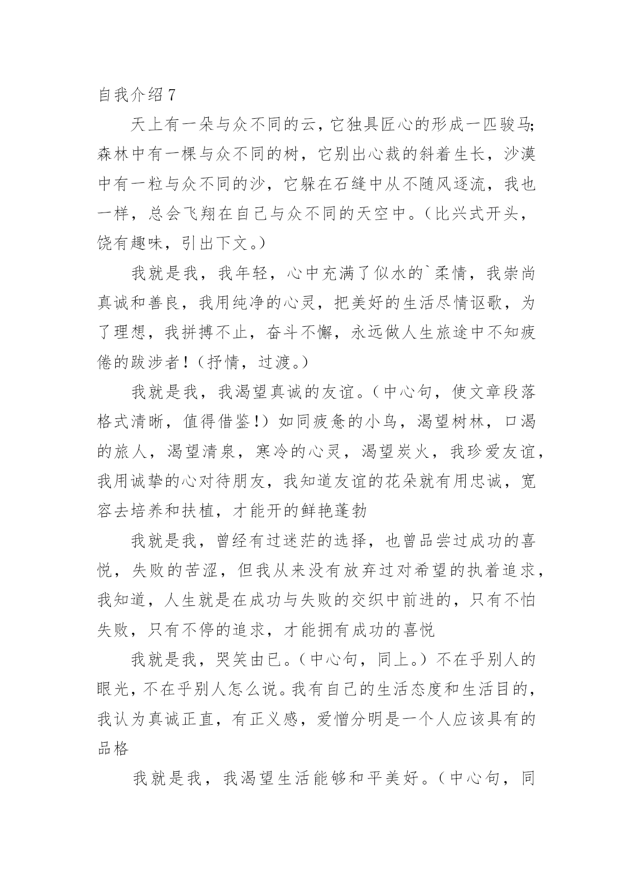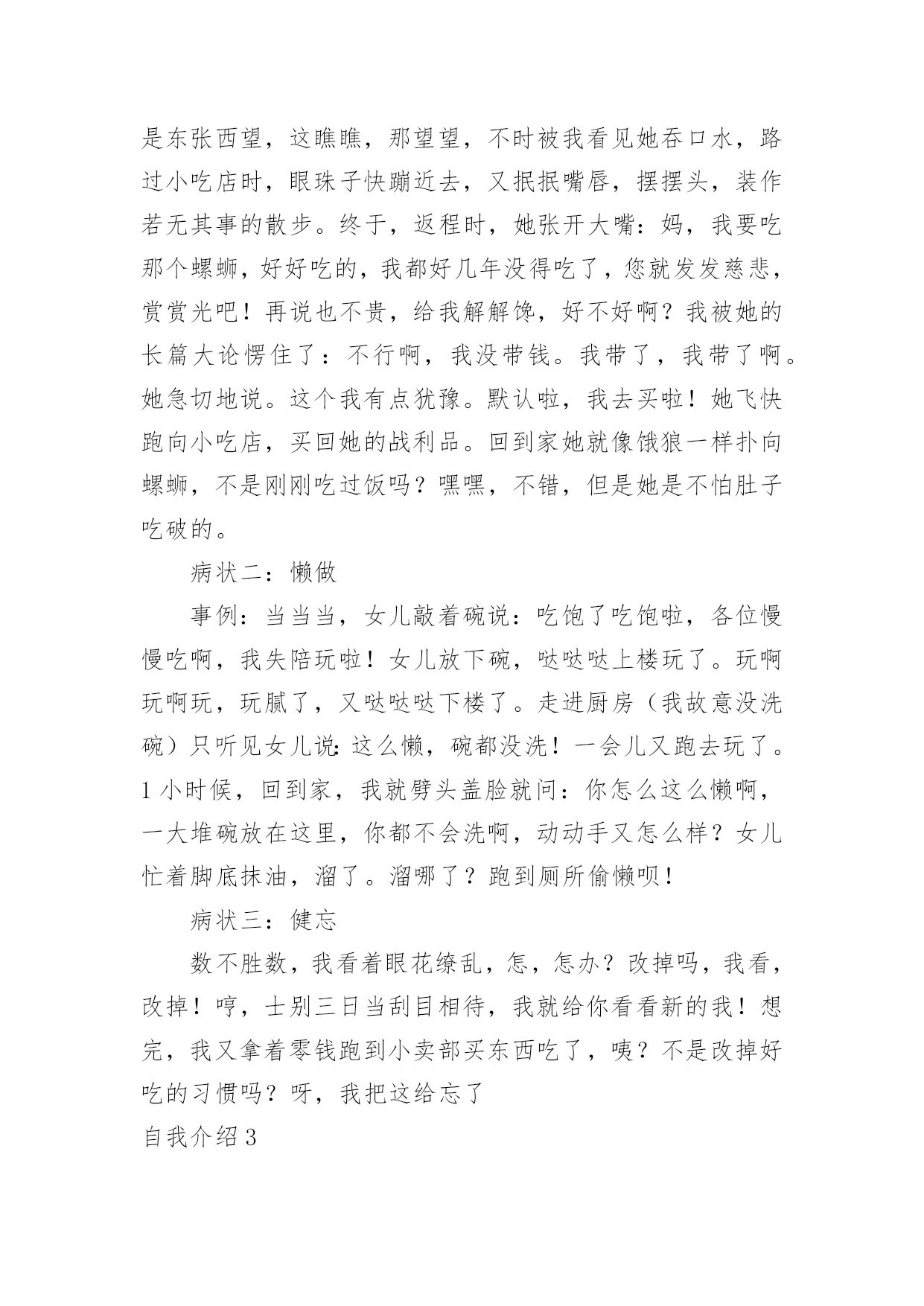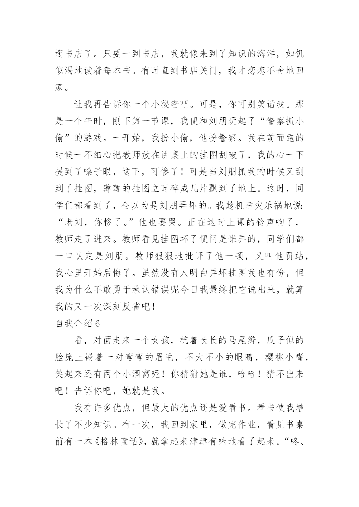 自我介绍自我介绍当我们在一个新环境中,进行自我介绍是必不可少的,通过自我介绍可以得到他人的认可。那要怎么写好自我介绍呢?下面是小编收集整理的自我介绍,仅供参考,欢迎大家阅读。自我介绍1大家好!我叫孙健。我不但爱运动,还很好学,当然也有不少缺点。在班里我个子不算高,但是从不挨欺负,可是同学们老是给我起外号“孙子”,我听只好当没听见。有时我真怨爸爸,世上有一百多个姓,为什么偏姓孙。可这又有什么办法呢?这是天注定,也不能光怨爸爸。我长着一双乌黑的大眼睛,总是一眨一眨的。眼睛下面长着非常端正的鼻子,还有一张说话漏风的小嘴。我总喜欢提一些天真的问题,有时问的很古怪,使人无以回答。我特别爱运动,比如打羽毛球、跑步(必须是短跑)、玩篮球、踢足球……记得小时候打羽毛球,我和爸爸一打就是两个多小时。妈妈怕我们累,就劝我说:“别打,再打就累出病。”我冲着妈妈扮个鬼脸,调皮地说;“母亲大人,我和爸爸壮实的很,您老人家放心好!”说完我们都哈哈大笑起来。我也很好学。我感觉节假日里最快乐最有意义的事就是逛书店。只要一到书店,我就像来到知识的海洋,如饥似渴地读着每本书……有时直到书店关门,我才恋恋不舍地回家。让我再告诉你一个小秘密吧。不过,你可别笑话我。那是一个下午,刚下第一节课,我便和刘朋玩起“警察抓小偷”的游戏。一开始,我扮小偷,他扮警察。我在前面跑的时候一不小心把老师放在讲桌上的挂图刮破,我的心一下提到嗓子眼,这下,可惨!可是当刘朋抓我的时候又刮到挂图,薄薄的挂图立时碎成几片飘到地上。这时,同学们都看到,全以为是刘朋弄坏的。我趁机幸灾乐祸地说:“老刘,你惨。”他也要哭。正在这时上课的铃声响,老师走进来。老师看见挂图坏便问是谁弄的,同学们都一口认定是刘朋。老师狠狠地批评他一顿,又叫他罚站,我心里开始后悔。虽然没有人知道弄坏挂图我也有份,但我为什么不敢勇于承认错误呢?今天我终于把它说出来,就算我的又一次深刻反省吧!我已经说这么多,并且告诉你我的小秘密,因为我把你当做最信任的好朋友。你有什么秘密也告诉我,好吗?这就是我!你喜欢我吗?自我介绍2你这女儿好吃懒做,有几个病状,我列一张单子给你,单子在这。一位医生缓缓开口。我闻声望去,目光停在这张单子上,内容如下:病状一:好吃(以妈妈的为我)事例:吃过晚饭,我和女儿去散步。走在路上,女儿老是东张西望,这瞧瞧,那望望,不时被我看见她吞口水,路过小吃店时,眼珠子快蹦近去,又抿抿嘴唇,摆摆头,装作若无其事的散步。终于,返程时,她张开大嘴:妈,我要吃那个螺蛳,好好吃的,我都好几年没得吃了,您就发发慈悲,赏赏光吧!再说也不贵,给我解解馋,好不好啊?我被她的长篇大论愣住了:不行啊,我没带钱。我带了,我带了啊。她急切地说。这个我有点犹豫。默认啦,我去买啦!她飞快跑向小吃店,买回她的战利品。回到家她就像饿狼一样扑向螺蛳,不是刚刚吃过饭吗?嘿嘿,不错,但是她是不怕肚子吃破的。病状二:懒做事例:当当当,女儿敲着碗说:吃饱了吃饱啦,各位慢慢吃啊,我失陪玩啦!女儿放下碗,哒哒哒上楼玩了。玩啊玩啊玩,玩腻了,又哒哒哒下楼了。走进厨房(我故意没洗碗)只听见女儿说:这么懒,碗都没洗!一会儿又跑去玩了。1小时候,回到家,我就劈头盖脸就问:你怎么这么懒啊,一大堆碗放在这里,你都不会洗啊,动动手又怎么样?女儿忙着脚底抹油,溜了。溜哪了?跑到厕所偷懒呗!病状三:健忘数不胜数,我看着眼花缭乱,怎,怎办?改掉吗,我看,改掉!哼,士别三日当刮目相待,我就给你看看新的我!想完,我又拿着零钱跑到小卖部买东西吃了,咦?不是改掉好吃的习惯吗?呀,我把这给忘了自我介绍3今年,我上六年级了,是我在小学的最后一年,已经开学一个月了,但还有很多老师不认识我,那我就做一个自我介绍吧。我是一个活泼开朗的女孩,在班里认识的朋友很多,平常下课总是能和朋友们玩在一起。我是一个比较会做事的女孩,在家里,我每天都会帮助爸爸妈妈做家务;在学校,我当了五年的班干部,也算是一个经验比较丰富的人吧;我是一个时间观念很强的人,在家里,我会按时完成老师布置的作业,每天早晨六点起来背英语;我是一个喜欢整理的人,平时,我会积极整理房间、书包,书包里的每一本书都按顺序排列……弹钢琴,是我的课余爱好,平时心情不好的时候,我就会走到它身边,抚摸着琴键,聆听着钢琴发出来的每一个音符,这算是我的特长。我更喜欢阅读,我总爱在做完作业时,迫不及待地拿出一本本书,在书堆中如饥似渴,津津有味。我最不喜欢的事情,就是到热闹的地方去,一到那里,我就感觉自己在一个狭小的空间里。平常,我喜欢“泡”在各大图书馆里,特别是那种富有诗情画意的“画中”图书馆,经常一去就是一整天,当然,我是不会忘记吃午餐的……我还是一个不甘寂寞,喜欢交朋友的人。我认为友谊就像是一种无形的巨大力量。如果生活中缺少了它,你就会感到冷清、寂寞。所以,不论