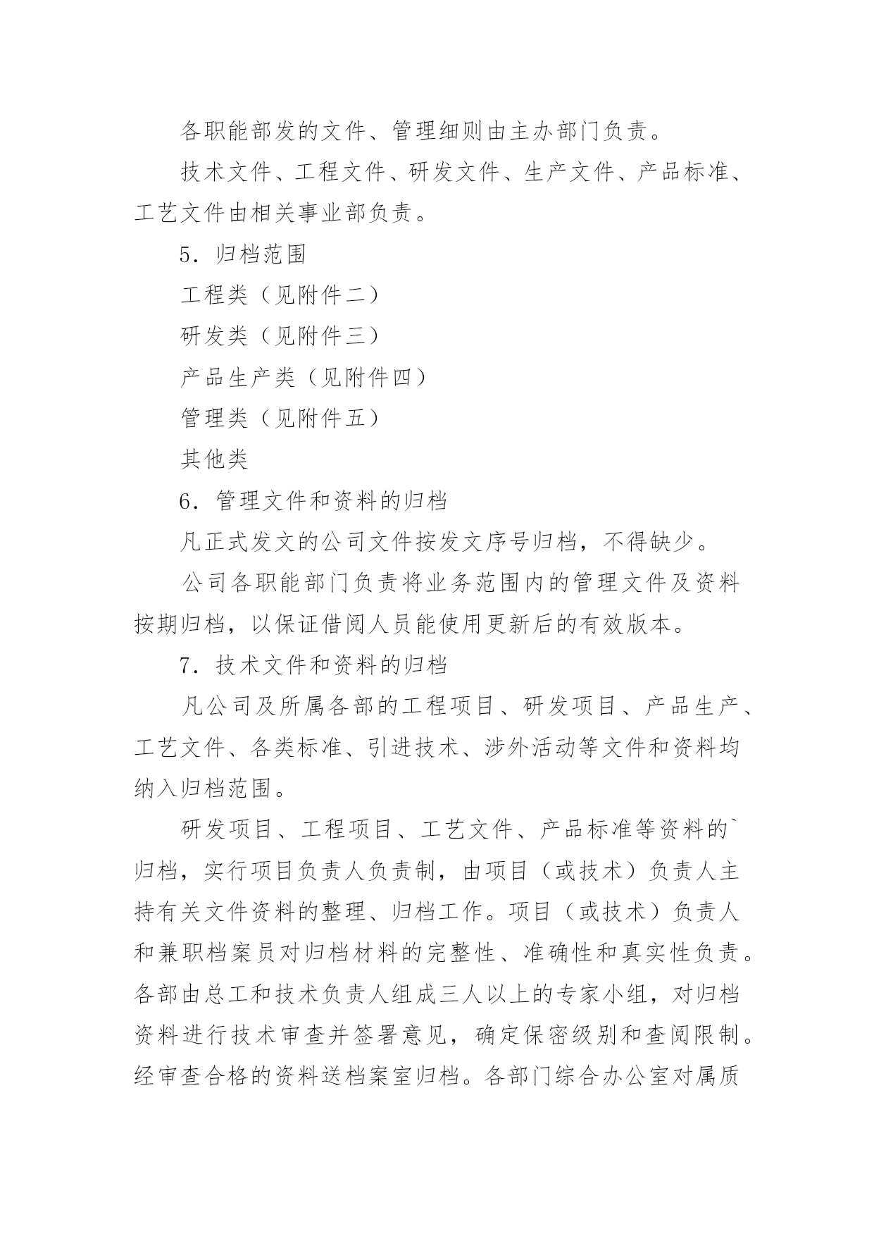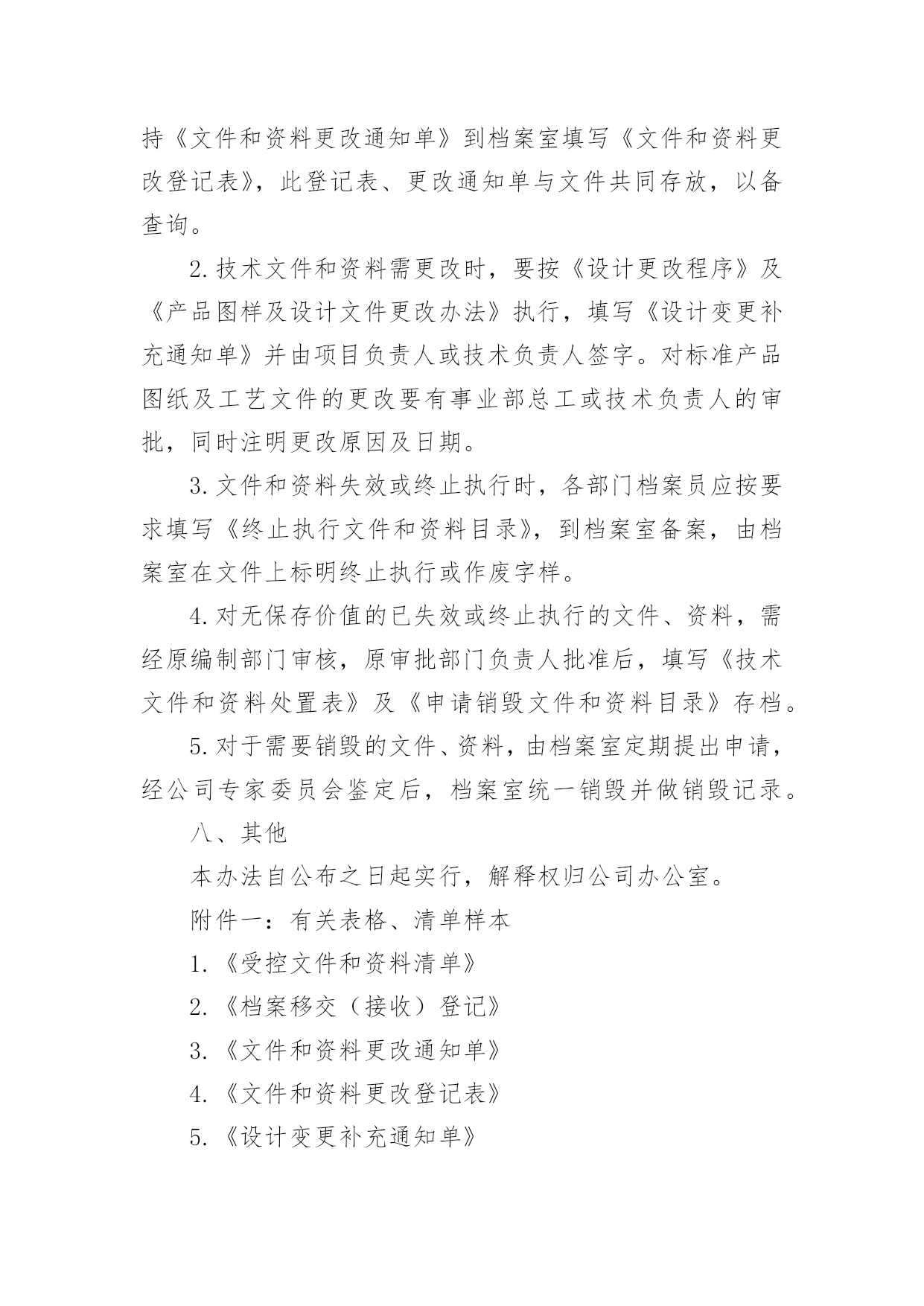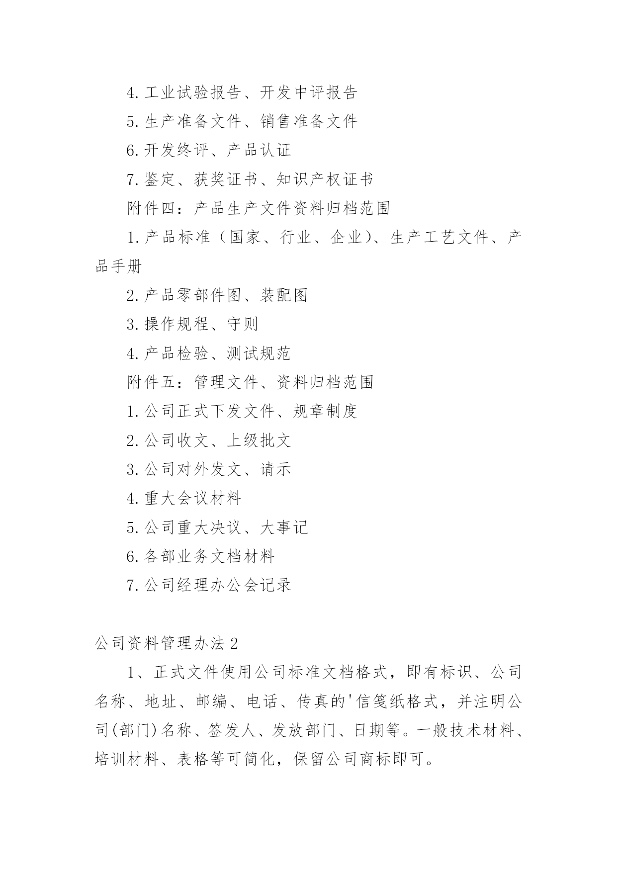 公司资料管理办法公司资料管理办法1一、目的为加强公司档案管理工作,规范公司资料、文件保管程序,保护公司的知识产权和保证各种资料的完整性,并符合ISO9001质量体系的规范要求,根据《中华人民共和国档案法》及国家有关档案管理、保密工作的规定,特制定本办法。二、适用范围本办法适用于公司及所属各部门所有管理文件、技术文件和资料的管理,其中包括企业管理、工程设计、产品研发、生产制造等涉及企业经营各方面的具有归档保存价值的实物、文字、图纸、图片、软盘、光盘、声、像等资料。三、机构设置及职责公司设立档案资料室,负责全公司各类档案、资料的管理,隶属于公司办公室。各部门综合办公室及专职或兼职档案员对本部门归档文件资料进行初级管理。四、档案归档1.归档要求归档的文件和资料必须是定稿后的正式印本及必要的文件原稿、装订好的原始记录。合同要存正本,公司文件及外部文件应归档原件,一般不存复印件。文字、图纸与软件(盘)同存时,应保持一致。属于ISO9001质量体系的受控文件应填写受控编号。归档的文件和资料要求质量优良,图样清晰,字迹工整,装订整齐美观,禁用字迹不牢固的工具书写。对软盘、光盘、声像、照片等资料,归档时要有保护措施,包装良好,封面书写标题及编号,无涂改。凡对公司有保存价值的各种文件、资料、实物等,各部门有责任及时归档。因归档不及时造成资料损坏或丢失,给公司利益造成损害的,有关部门须承担责任。归档文件和资料如有保密要求和查阅限制的,由归档部门与档案室拟定保密级别和限制查阅使用范围。2.归档时间工程、研发项目资料在项目完工后一个月内归档。各类管理文件、产品标准、技术文件每一年年末归档一次。其余各类具有保存价值的文件和资料应及时归档。3.归档程序和手续各类档案在归档前由各部门兼职档案员预立卷。归档时要作《档案移交(接收)登记》,属质量体系受控文件要提交《受控文件和资料清单》,经档案室和归档部门双方当面清点签字后备查。对不完整、不准确或不符合存档要求的各类档案,档案室有权要求归档部门完善达到要求后再办理归档手续。同一项目的成套资料在归档时要有资料目录,并按要求提供《图纸资料存档清单》。4.归档责任部门公司下发行政文件、管理制度、公司重要会议材料、外来文件由公司办公室负责。各职能部发的文件、管理细则由主办部门负责。技术文件、工程文件、研发文件、生产文件、产品标准、工艺文件由相关事业部负责。5.归档范围工程类(见附件二)研发类(见附件三)产品生产类(见附件四)管理类(见附件五)其他类6.管理文件和资料的归档凡正式发文的公司文件按发文序号归档,不得缺少。公司各职能部门负责将业务范围内的管理文件及资料按期归档,以保证借阅人员能使用更新后的有效版本。7.技术文件和资料的归档凡公司及所属各部的工程项目、研发项目、产品生产、工艺文件、各类标准、引进技术、涉外活动等文件和资料均纳入归档范围。研发项目、工程项目、工艺文件、产品标准等资料的`归档,实行项目负责人负责制,由项目(或技术)负责人主持有关文件资料的整理、归档工作。项目(或技术)负责人和兼职档案员对归档材料的完整性、准确性和真实性负责。各部由总工和技术负责人组成三人以上的专家小组,对归档资料进行技术审查并签署意见,确定保密级别和查阅限制。经审查合格的资料送档案室归档。各部门综合办公室对属质量体系范围内文件资料的规范性、完整性负责。档案室在工程、研发项目资料和产品标准归档后,书面通知管理规划部。此书面通知将作为公司对事业部项目考核的依据之一。五.档案和资料的保管1.各种管理、技术文件和资料属于公司专有技术、知识产权和无形资产的重要组成部分,要严格管理,严防因失密给公司造成损失。2.管理文件和资料、技术文件、工程项目的图纸等应进行分类管理,文件与资料必须编号。3.档案资料是公司研发、工程、生产、经营和管理的重要依据,档案资料室必须确保安全。(1)健全借阅审批、登记制度,严防文件资料损坏、丢失。未经许可不得复制、使用保密档案。(2)做好“五防”工作,即:防火、防盗、防晒、防潮、防虫。(3)档案室内要经常打扫,保持清洁卫生。(4)室内严禁吸烟,不得将易燃、易爆物品带入室内。(5)工作人员离开档案室时要关灯、关好门窗。六、档案资料的使用1.公司档案资料分为机密、秘密、无密级三个级别。机密级的档案资料有严格的查阅限制,其复制和借阅需经公司主管领导批准。公司的重要文件、技术资料列入机密级档案管理。秘密级档案和资料有查阅限制,复制借阅要经归档部门负责人同意,公司办公室批准。对公司较重要的文件、技术和项目资料列入秘密级别管理。无密级档案资料,公司内部职工可以查阅、复制、借用,但需进行登记备案。2.查阅档案资料,需执行档案资料保密规定,并做查阅登记。本公司员工可查阅本职工作范围的档案资料;如要查阅非本职工作的档案资料,需经档案