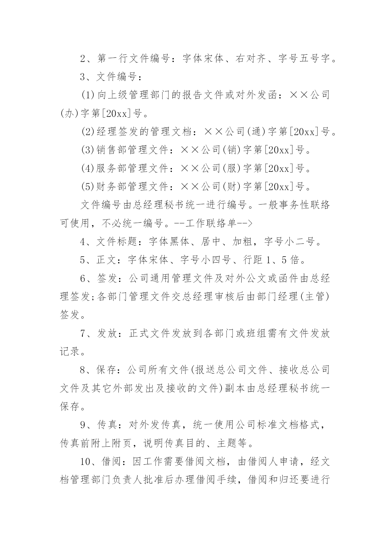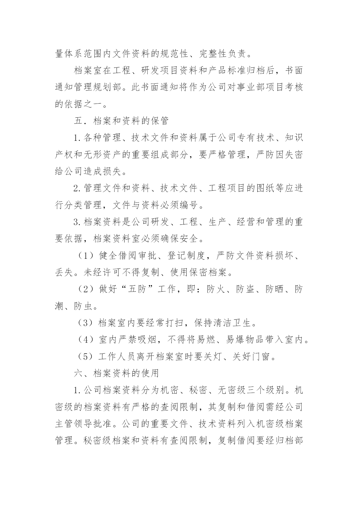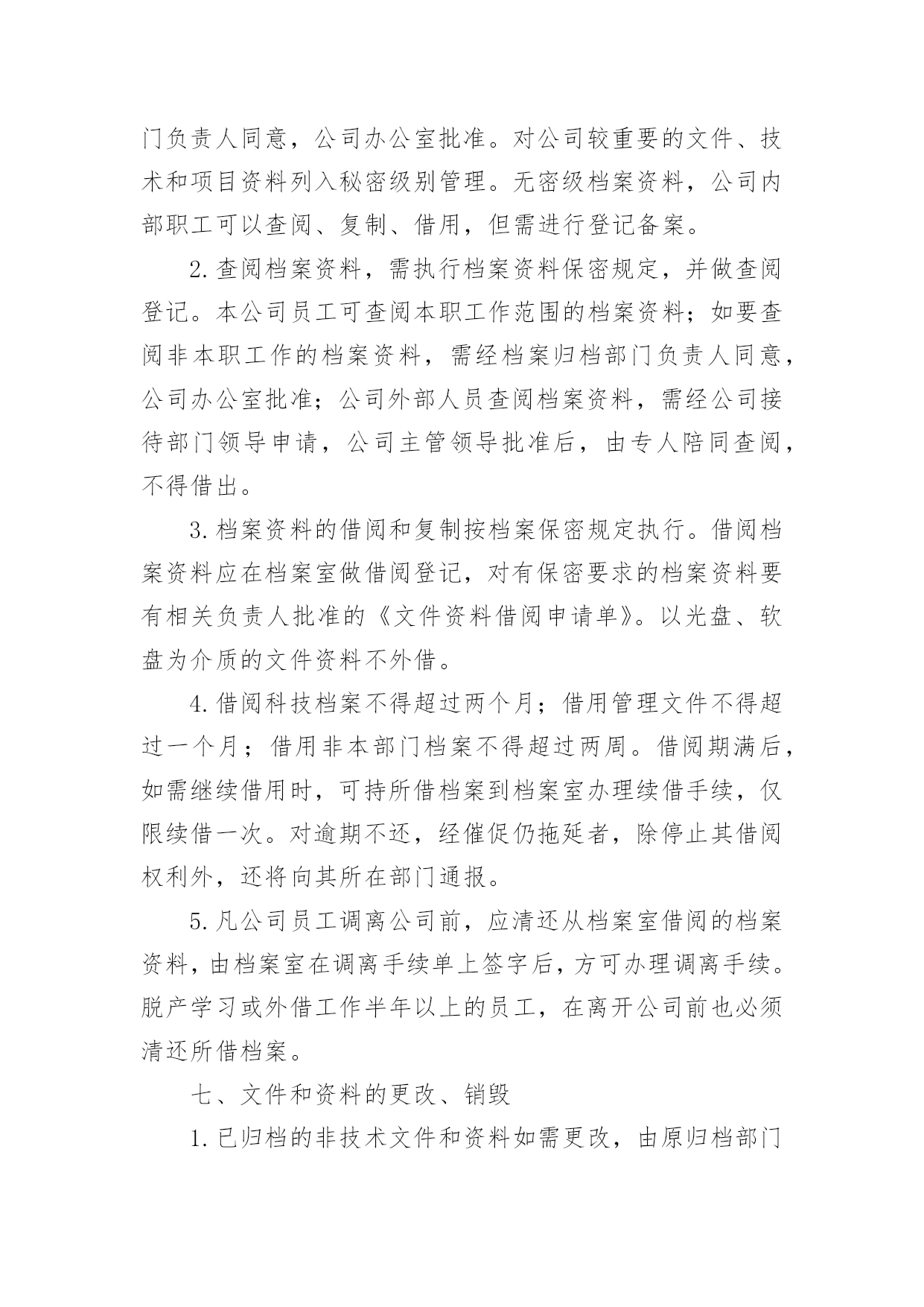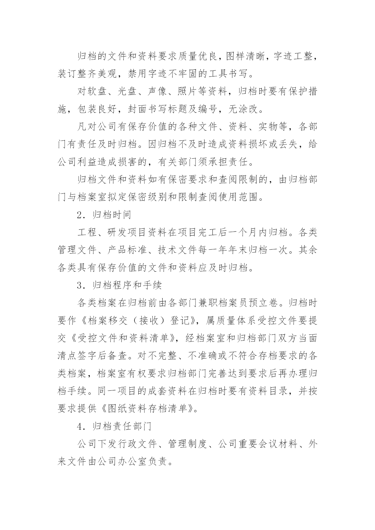 公司资料管理办法公司资料管理办法1一、目的为加强公司档案管理工作,规范公司资料、文件保管程序,保护公司的知识产权和保证各种资料的完整性,并符合ISO9001质量体系的规范要求,根据《中华人民共和国档案法》及国家有关档案管理、保密工作的规定,特制定本办法。二、适用范围本办法适用于公司及所属各部门所有管理文件、技术文件和资料的管理,其中包括企业管理、工程设计、产品研发、生产制造等涉及企业经营各方面的具有归档保存价值的实物、文字、图纸、图片、软盘、光盘、声、像等资料。三、机构设置及职责公司设立档案资料室,负责全公司各类档案、资料的管理,隶属于公司办公室。各部门综合办公室及专职或兼职档案员对本部门归档文件资料进行初级管理。四、档案归档1.归档要求归档的文件和资料必须是定稿后的正式印本及必要的文件原稿、装订好的原始记录。合同要存正本,公司文件及外部文件应归档原件,一般不存复印件。文字、图纸与软件(盘)同存时,应保持一致。属于ISO9001质量体系的受控文件应填写受控编号。归档的文件和资料要求质量优良,图样清晰,字迹工整,装订整齐美观,禁用字迹不牢固的工具书写。对软盘、光盘、声像、照片等资料,归档时要有保护措施,包装良好,封面书写标题及编号,无涂改。凡对公司有保存价值的各种文件、资料、实物等,各部门有责任及时归档。因归档不及时造成资料损坏或丢失,给公司利益造成损害的,有关部门须承担责任。归档文件和资料如有保密要求和查阅限制的,由归档部门与档案室拟定保密级别和限制查阅使用范围。2.归档时间工程、研发项目资料在项目完工后一个月内归档。各类管理文件、产品标准、技术文件每一年年末归档一次。其余各类具有保存价值的文件和资料应及时归档。3.归档程序和手续各类档案在归档前由各部门兼职档案员预立卷。归档时要作《档案移交(接收)登记》,属质量体系受控文件要提交《受控文件和资料清单》,经档案室和归档部门双方当面清点签字后备查。对不完整、不准确或不符合存档要求的各类档案,档案室有权要求归档部门完善达到要求后再办理归档手续。同一项目的成套资料在归档时要有资料目录,并按要求提供《图纸资料存档清单》。4.归档责任部门公司下发行政文件、管理制度、公司重要会议材料、外来文件由公司办公室负责。各职能部发的文件、管理细则由主办部门负责。技术文件、工程文件、研发文件、生产文件、产品标准、工艺文件由相关事业部负责。5.归档范围工程类(见附件二)研发类(见附件三)产品生产类(见附件四)管理类(见附件五)其他类6.管理文件和资料的归档凡正式发文的公司文件按发文序号归档,不得缺少。公司各职能部门负责将业务范围内的管理文件及资料按期归档,以保证借阅人员能使用更新后的有效版本。7.技术文件和资料的归档凡公司及所属各部的工程项目、研发项目、产品生产、工艺文件、各类标准、引进技术、涉外活动等文件和资料均纳入归档范围。研发项目、工程项目、工艺文件、产品标准等资料的`归档,实行项目负责人负责制,由项目(或技术)负责人主持有关文件资料的整理、归档工作。项目(或技术)负责人和兼职档案员对归档材料的完整性、准确性和真实性负责。各部由总工和技术负责人组成三人以上的专家小组,对归档资料进行技术审查并签署意见,确定保密级别和查阅限制。经审查合格的资料送档案室归档。各部门综合办公室对属质量体系范围内文件资料的规范性、完整性负责。档案室在工程、研发项目资料和产品标准归档后,书面通知管理规划部。此书面通知将作为公司对事业部项目考核的依据之一。五.档案和资料的保管1.各种管理、技术文件和资料属于公司专有技术、知识产权和无形资产的重要组成部分,要严格管理,严防因失密给公司造成损失。2.管理文件和资料、技术文件、工程项目的图纸等应进行分类管理,文件与资料必须编号。3.档案资料是公司研发、工程、生产、经营和管理的重要依据,档案资料室必须确保安全。(1)健全借阅审批、登记制度,严防文件资料损坏、丢失。未经许可不得复制、使用保密档案。(2)做好“五防”工作,即:防火、防盗、防晒、防潮、防虫。(3)档案室内要经常打扫,保持清洁卫生。(4)室内严禁吸烟,不得将易燃、易爆物品带入室内。(5)工作人员离开档案室时要关灯、关好门窗。六、档案资料的使用1.公司档案资料分为机密、秘密、无密级三个级别。机密级的档案资料有严格的查阅限制,其复制和借阅需经公司主管领导批准。公司的重要文件、技术资料列入机密级档案管理。秘密级档案和资料有查阅限制,复制借阅要经归档部门负责人同意,公司办公室批准。对公司较重要的文件、技术和项目资料列入秘密级别管理。无密级档案资料,公司内部职工可以查阅、复制、借用,但需进行登记备案。2.查阅档案资料,需执行档案资料保密规定,并做查阅登记。本公司员工可查阅本职工作范围的档案资料;如要查阅非本职工作的档案资料,需经档案